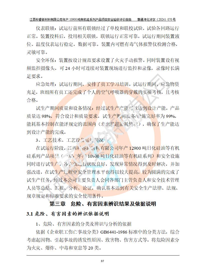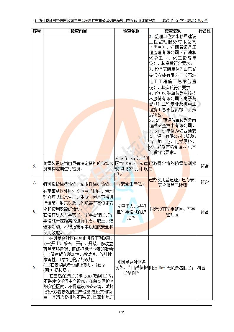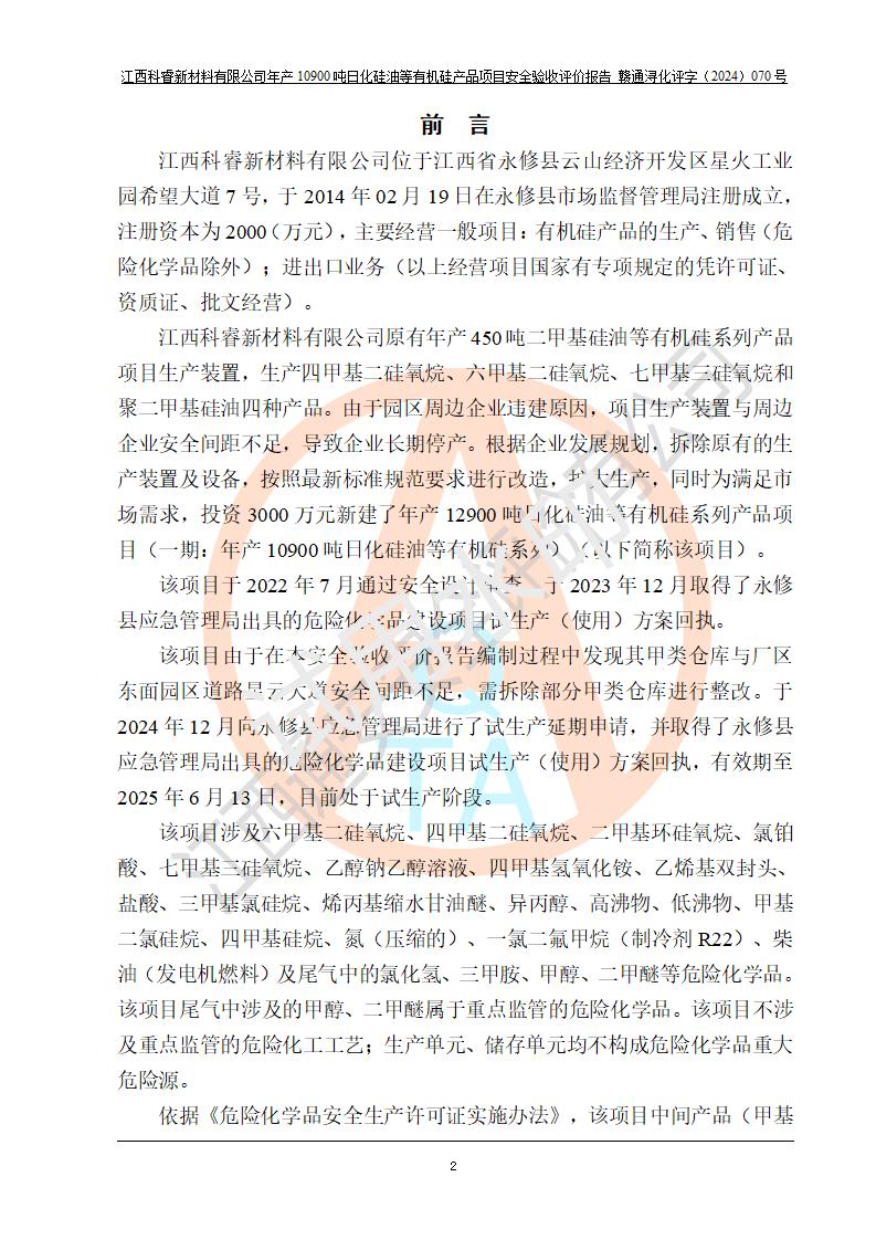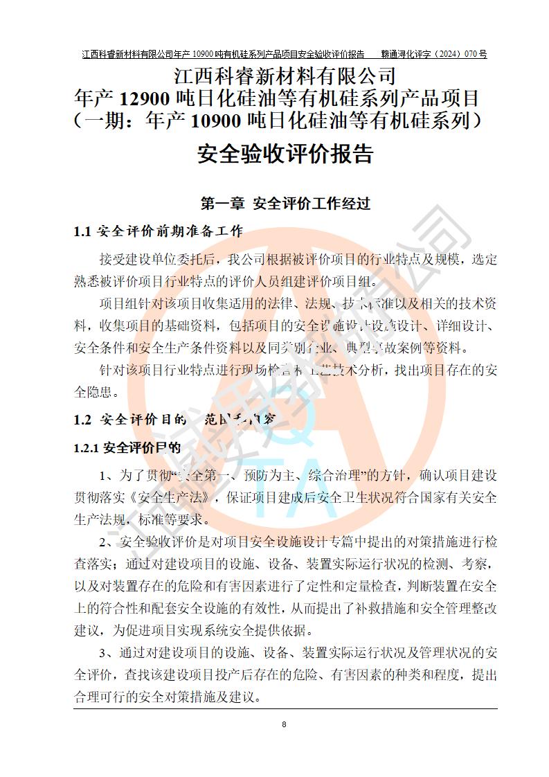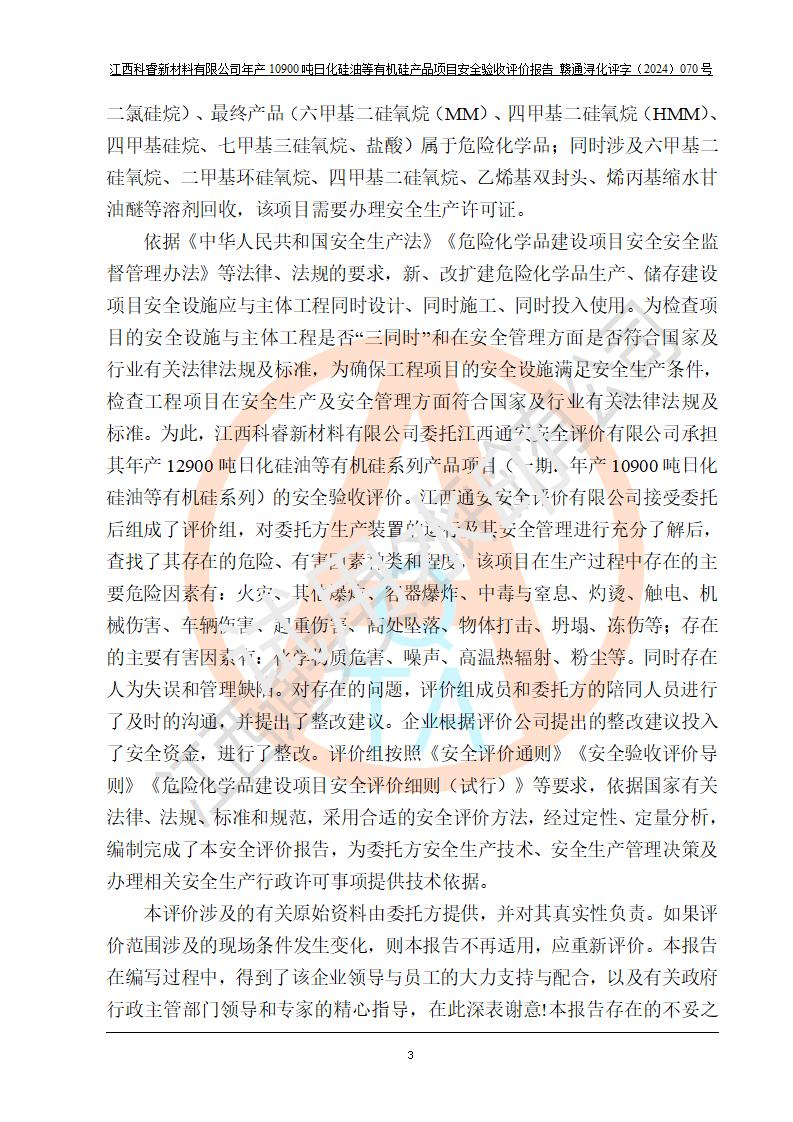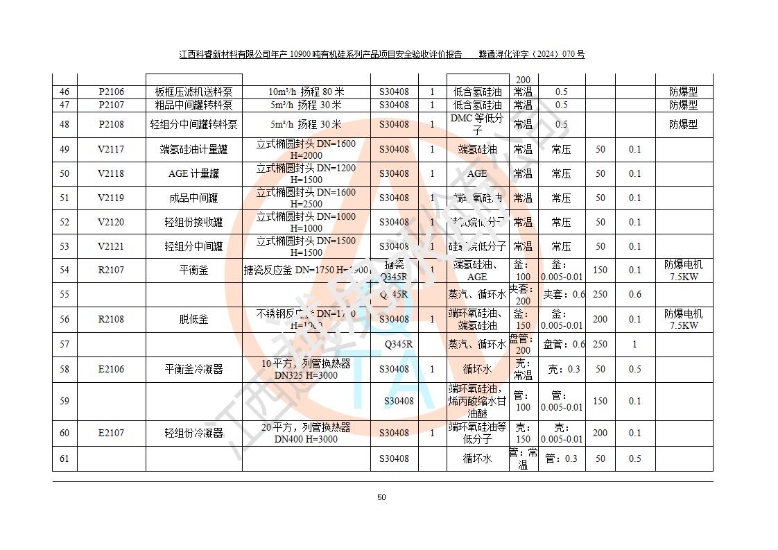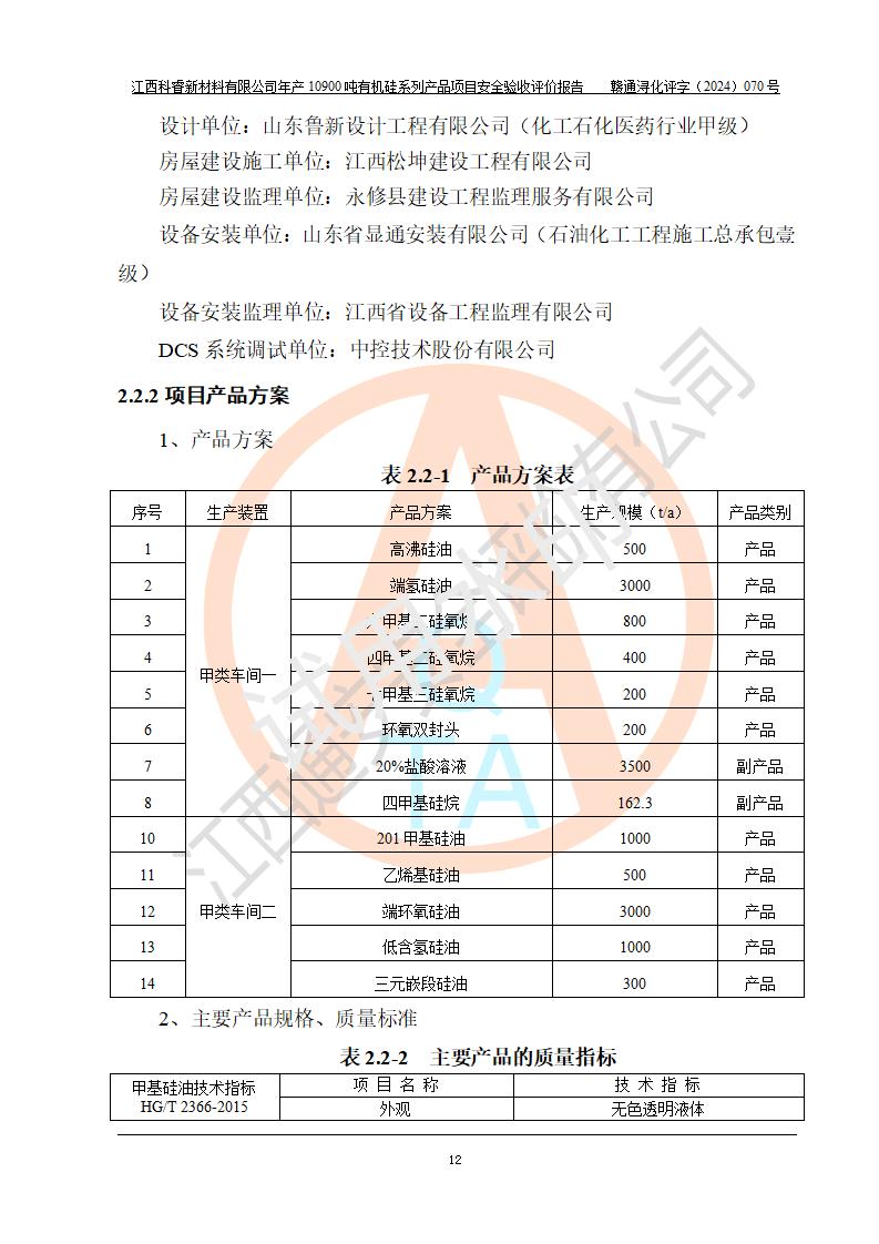 評(píng)價(jià)報(bào)告名稱 | 江西科睿新材料有限公司年產(chǎn)12900噸日化硅油等有機(jī)硅系列產(chǎn)品項(xiàng)目 (一期:年產(chǎn)10900噸日化硅油等有機(jī)硅系列)安全驗(yàn)收評(píng)價(jià) | |||||