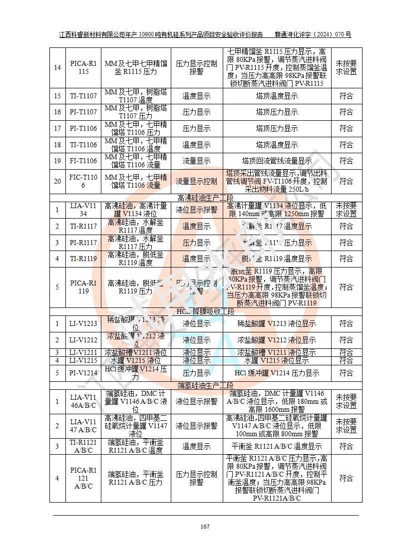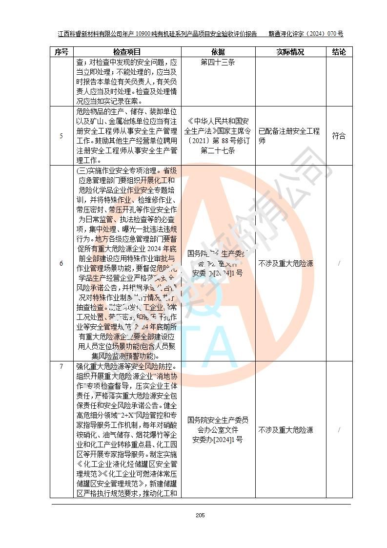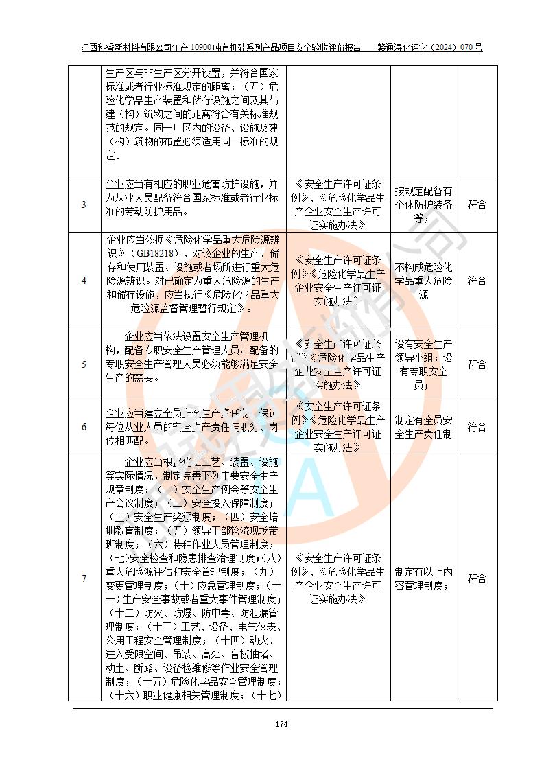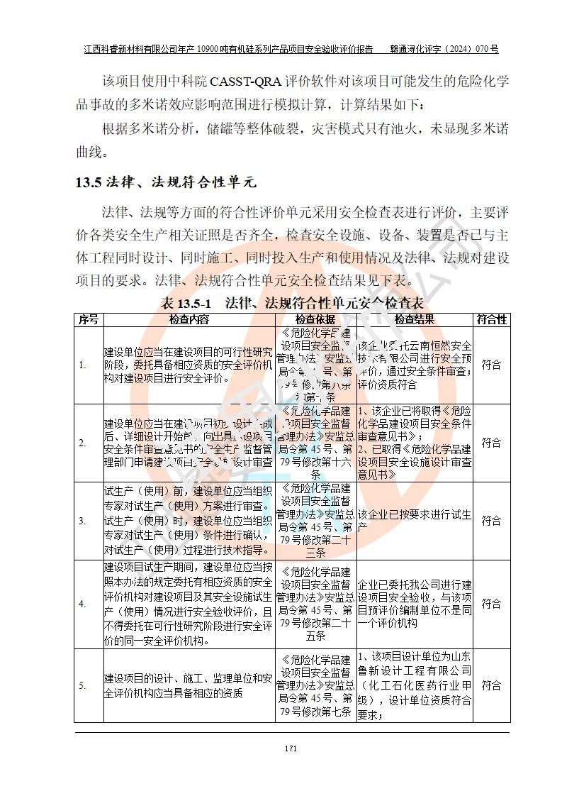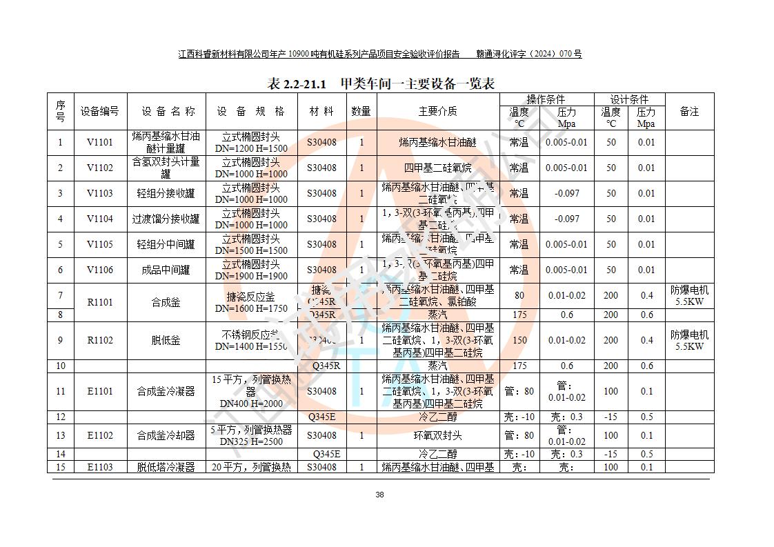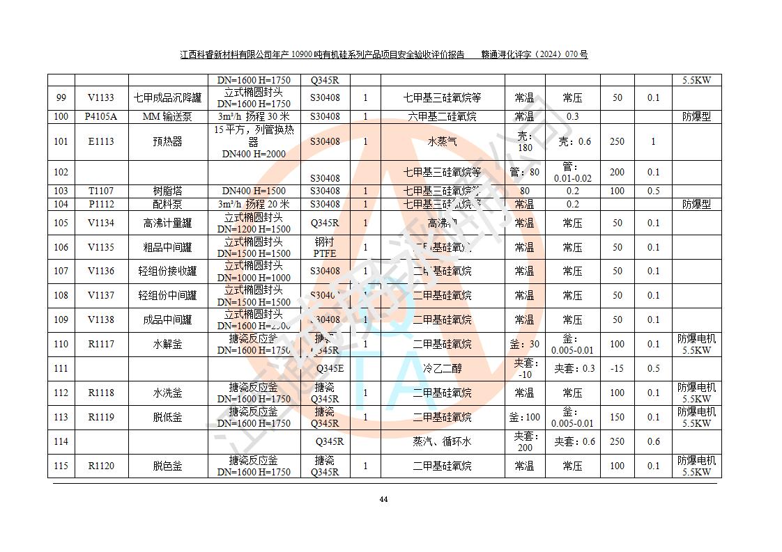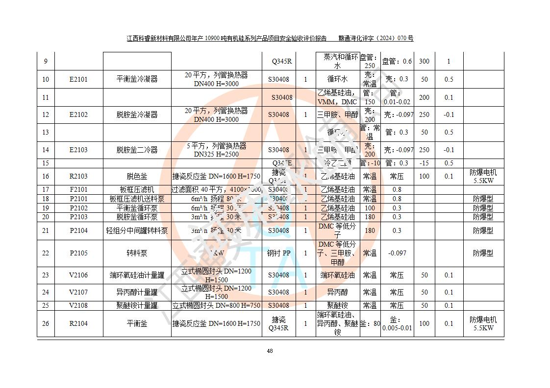 評(píng)價(jià)報(bào)告名稱 | 江西科睿新材料有限公司年產(chǎn)12900噸日化硅油等有機(jī)硅系列產(chǎn)品項(xiàng)目 (一期:年產(chǎn)10900噸日化硅油等有機(jī)硅系列)安全驗(yàn)收評(píng)價(jià) | |||||