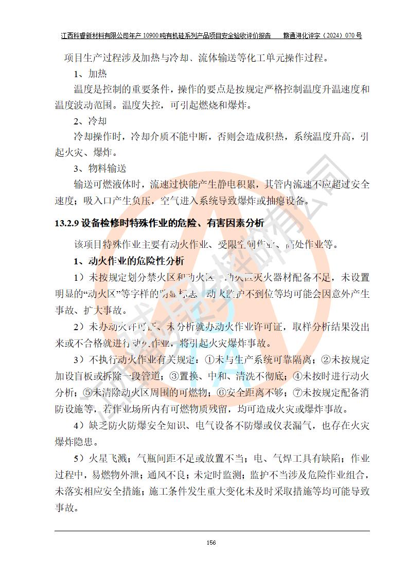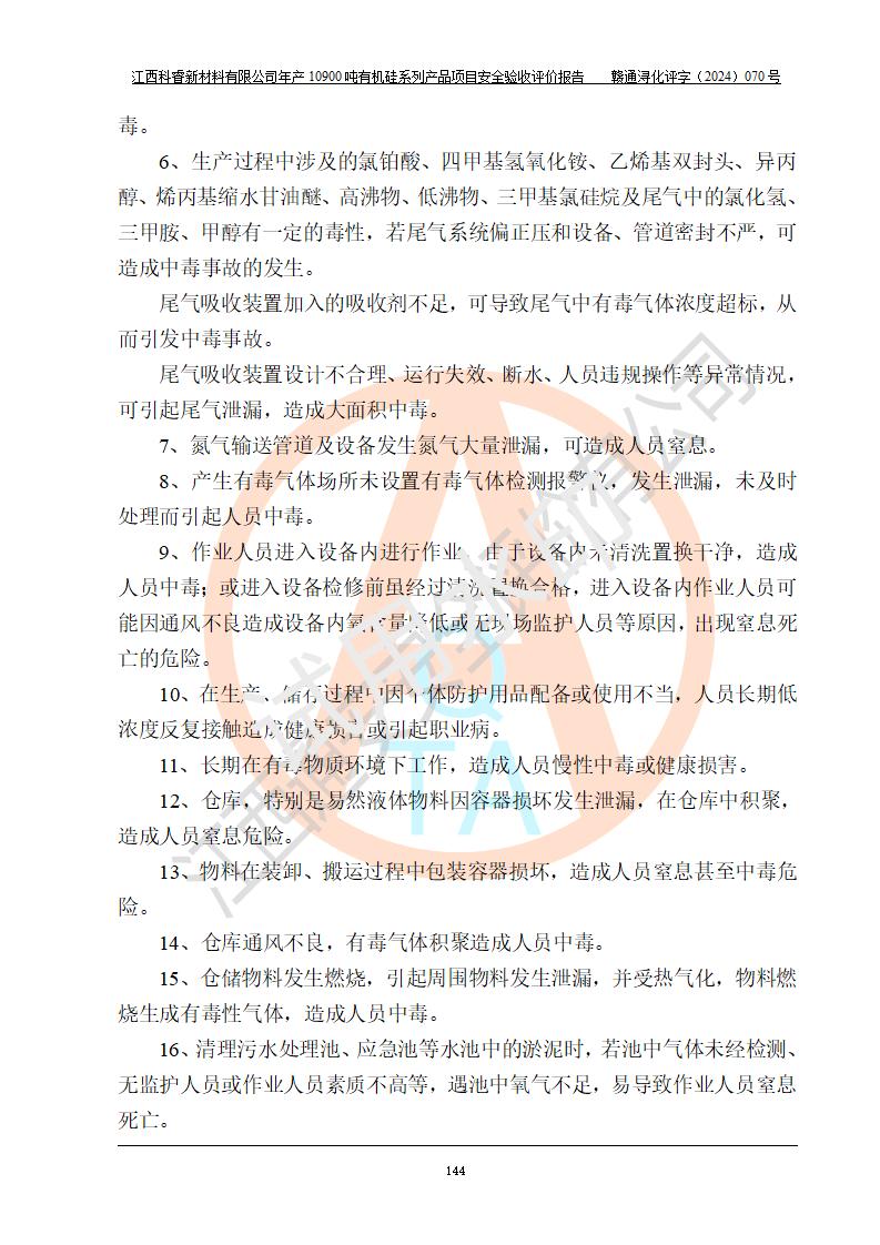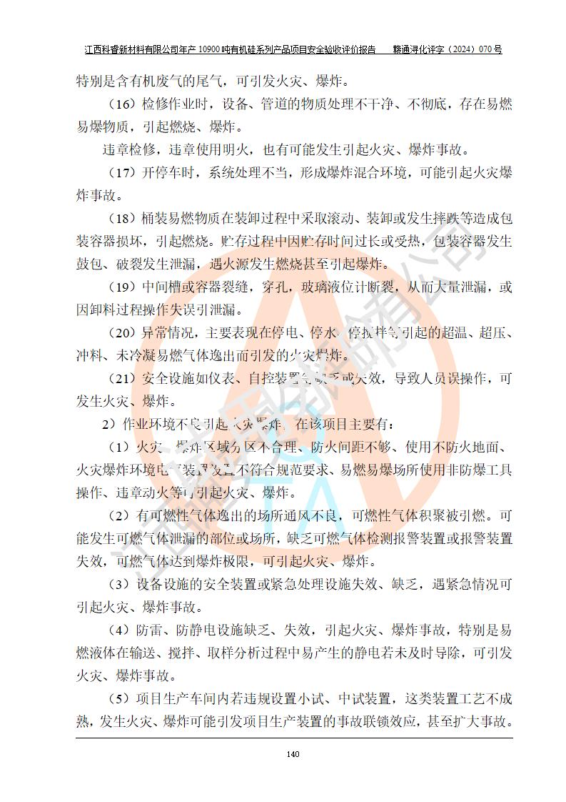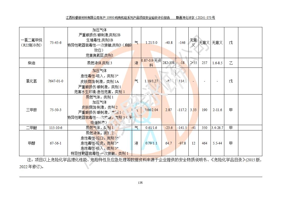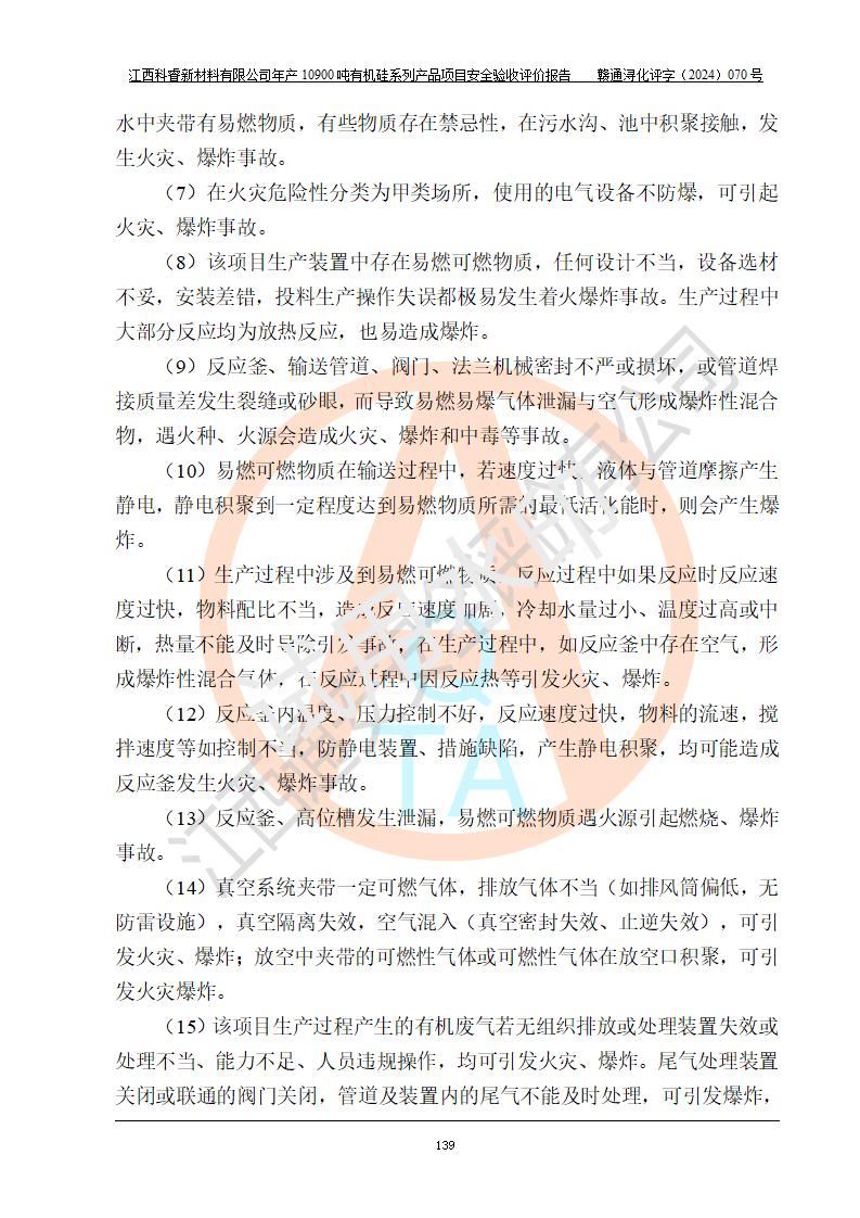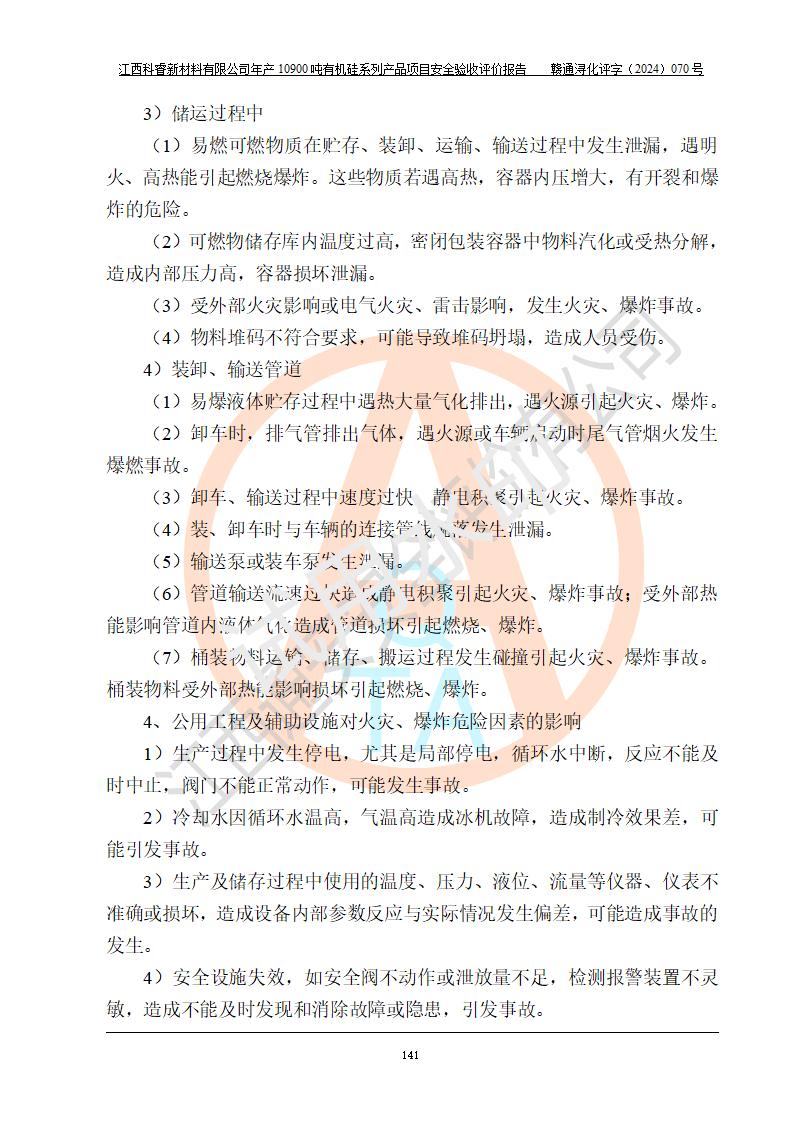 評(píng)價(jià)結(jié)論 | 經(jīng)評(píng)價(jià)組評(píng)價(jià),江西科睿新材料有限公司年產(chǎn)12900噸日化硅油等有機(jī)硅系列產(chǎn)品項(xiàng)目(一期:年產(chǎn)10900噸日化硅油等有機(jī)硅系列)總平面布置、選擇的工藝、現(xiàn)場(chǎng)設(shè)備布置情況與安全設(shè)施設(shè)計(jì)一致,該項(xiàng)目尾氣中的甲醇、二甲醚(不涉及儲(chǔ)存)屬于重點(diǎn)監(jiān)管的危險(xiǎn)化學(xué)品,不涉及重點(diǎn)監(jiān)管的危險(xiǎn)工藝、重大危險(xiǎn)源,已按設(shè)計(jì)要求設(shè)置有DCS系統(tǒng)、GDS系統(tǒng),符合《江西省應(yīng)急管理廳關(guān)于印發(fā)《江西省化工企業(yè)自動(dòng)化提升實(shí)施方案》(試行)的通知 》,符合《危險(xiǎn)化學(xué)品生產(chǎn)企業(yè)安全生產(chǎn)許可證實(shí)施辦法》、《危險(xiǎn)化學(xué)品生產(chǎn)建設(shè)項(xiàng)目安全風(fēng)險(xiǎn)防控指南(試行)》規(guī)定竣工驗(yàn)收的安全條件;企業(yè)主要負(fù)責(zé)人、安全管理部門(mén)負(fù)責(zé)人均為化學(xué)、化工相關(guān)專業(yè),且有3年以上化工行業(yè)從業(yè)經(jīng)歷,配備有化工類注冊(cè)安全工程師,企業(yè)主要負(fù)責(zé)人及安全管理人員已取得危險(xiǎn)化學(xué)品企業(yè)主要負(fù)責(zé)人及安全管理人員考核合格證。 項(xiàng)目運(yùn)行后存在的主要危險(xiǎn)、有害因素有:火災(zāi)、其他爆炸、中毒與窒息等;存在的主要有害因素有化學(xué)物質(zhì)危害、高溫等;針對(duì)存在的危險(xiǎn)、有害因素,企業(yè)采取了**的安全技術(shù)措施及安全管理措施,符合**有關(guān)法規(guī)、標(biāo)準(zhǔn)、規(guī)范要求;項(xiàng)目風(fēng)險(xiǎn)可控,其安全生產(chǎn)條件和安全管理方面具備竣工安全驗(yàn)收的條件。 | |||||