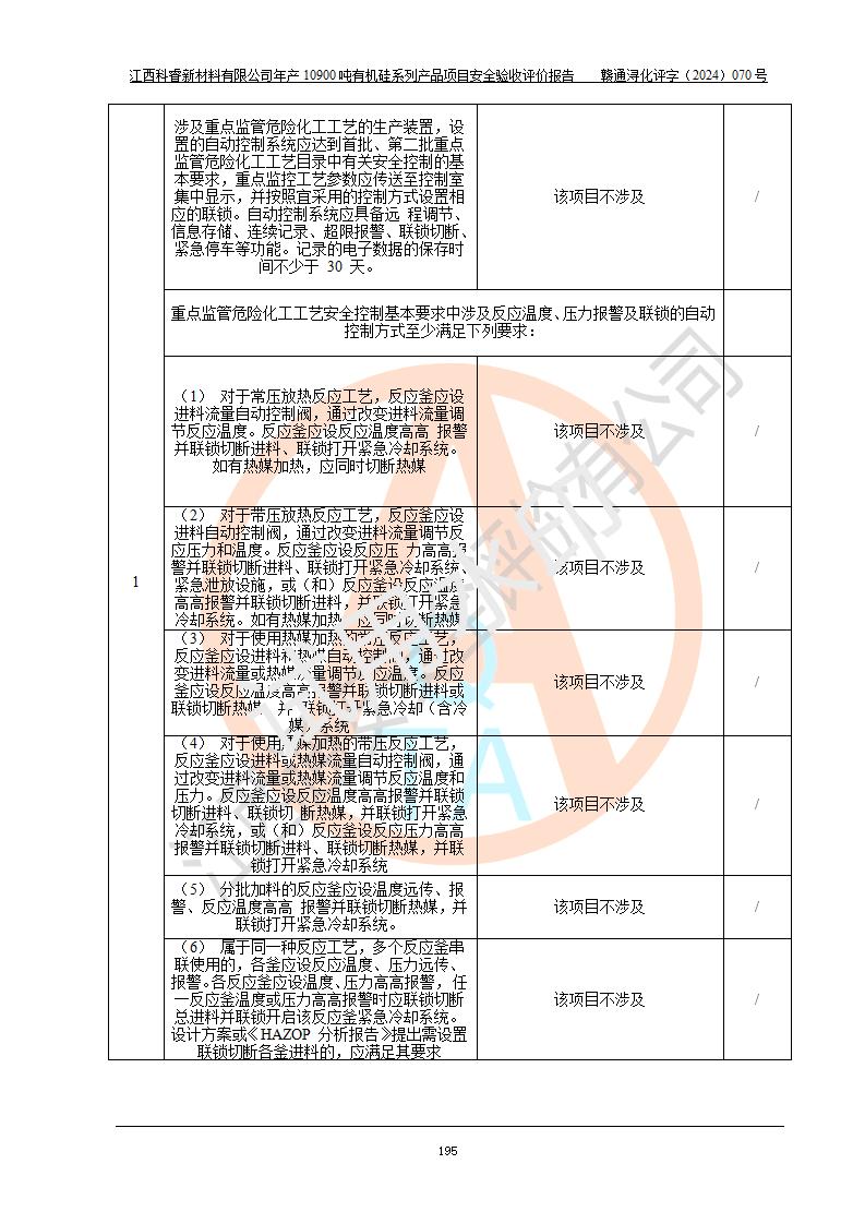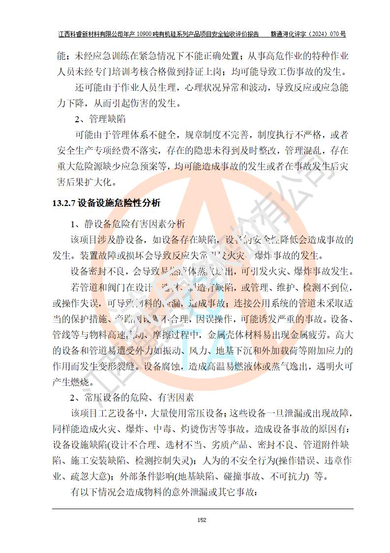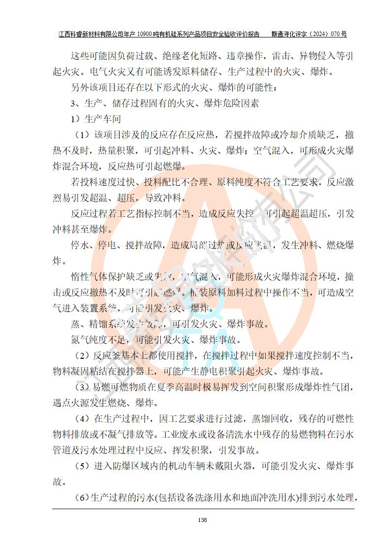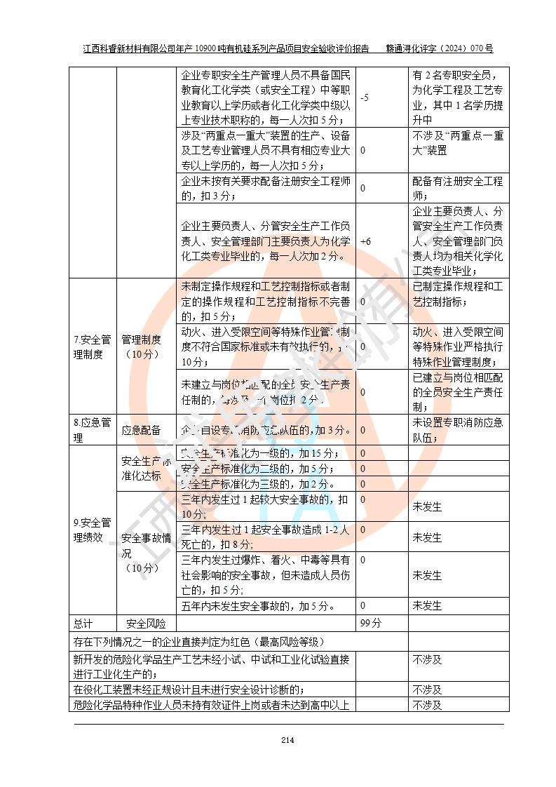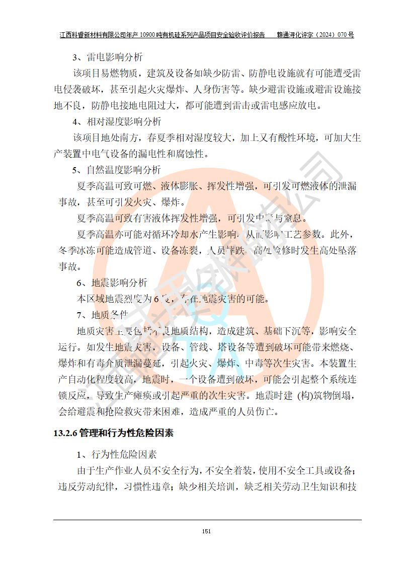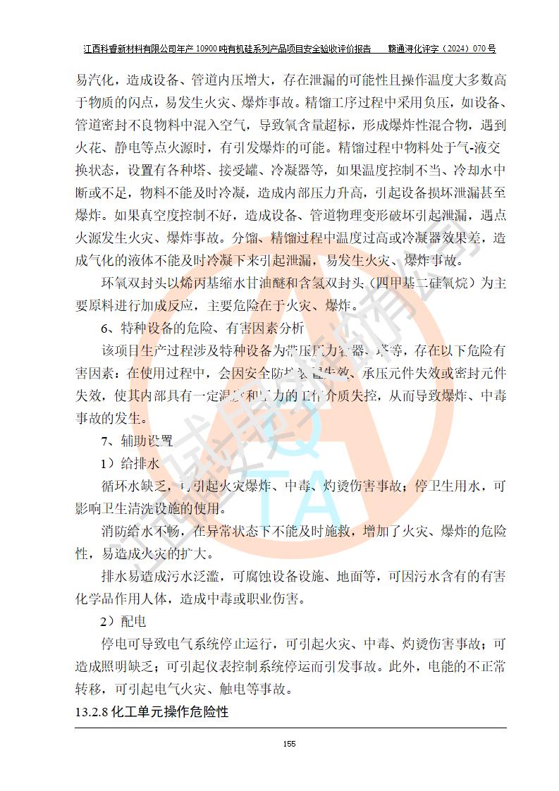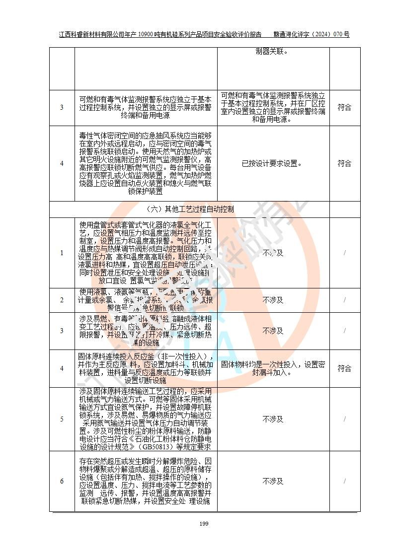 評(píng)價(jià)結(jié)論 | 經(jīng)評(píng)價(jià)組評(píng)價(jià),江西科睿新材料有限公司年產(chǎn)12900噸日化硅油等有機(jī)硅系列產(chǎn)品項(xiàng)目(一期:年產(chǎn)10900噸日化硅油等有機(jī)硅系列)總平面布置、選擇的工藝、現(xiàn)場(chǎng)設(shè)備布置情況與安全設(shè)施設(shè)計(jì)一致,該項(xiàng)目尾氣中的甲醇、二甲醚(不涉及儲(chǔ)存)屬于重點(diǎn)監(jiān)管的危險(xiǎn)化學(xué)品,不涉及重點(diǎn)監(jiān)管的危險(xiǎn)工藝、重大危險(xiǎn)源,已按設(shè)計(jì)要求設(shè)置有DCS系統(tǒng)、GDS系統(tǒng),符合《江西省應(yīng)急管理廳關(guān)于印發(fā)《江西省化工企業(yè)自動(dòng)化提升實(shí)施方案》(試行)的通知 》,符合《危險(xiǎn)化學(xué)品生產(chǎn)企業(yè)安全生產(chǎn)許可證實(shí)施辦法》、《危險(xiǎn)化學(xué)品生產(chǎn)建設(shè)項(xiàng)目安全風(fēng)險(xiǎn)防控指南(試行)》規(guī)定竣工驗(yàn)收的安全條件;企業(yè)主要負(fù)責(zé)人、安全管理部門(mén)負(fù)責(zé)人均為化學(xué)、化工相關(guān)專業(yè),且有3年以上化工行業(yè)從業(yè)經(jīng)歷,配備有化工類注冊(cè)安全工程師,企業(yè)主要負(fù)責(zé)人及安全管理人員已取得危險(xiǎn)化學(xué)品企業(yè)主要負(fù)責(zé)人及安全管理人員考核合格證。 項(xiàng)目運(yùn)行后存在的主要危險(xiǎn)、有害因素有:火災(zāi)、其他爆炸、中毒與窒息等;存在的主要有害因素有化學(xué)物質(zhì)危害、高溫等;針對(duì)存在的危險(xiǎn)、有害因素,企業(yè)采取了**的安全技術(shù)措施及安全管理措施,符合**有關(guān)法規(guī)、標(biāo)準(zhǔn)、規(guī)范要求;項(xiàng)目風(fēng)險(xiǎn)可控,其安全生產(chǎn)條件和安全管理方面具備竣工安全驗(yàn)收的條件。 | |||||