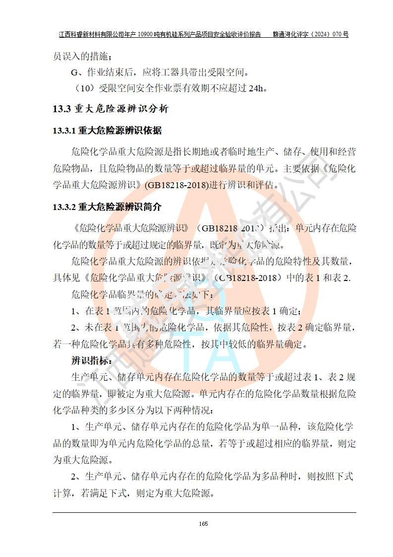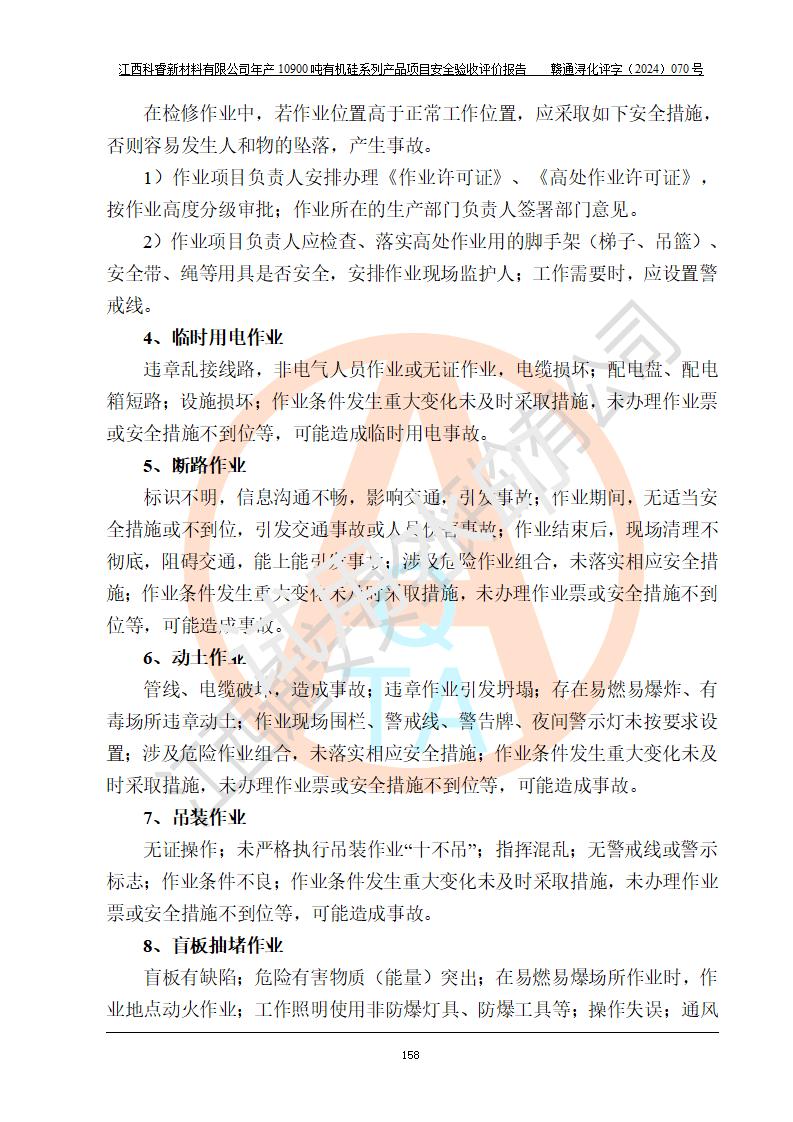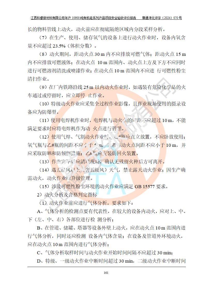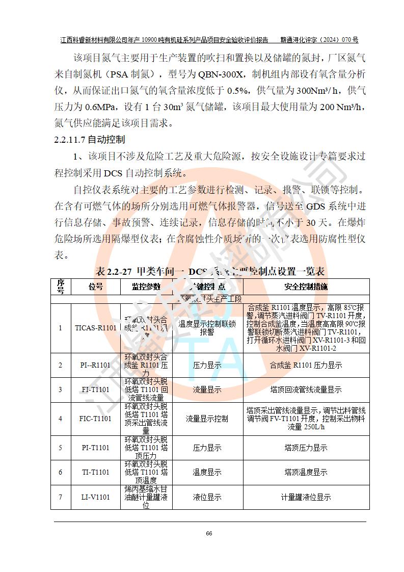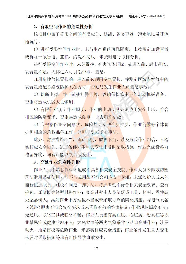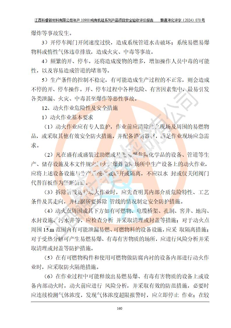 評(píng)價(jià)結(jié)論 | 經(jīng)評(píng)價(jià)組評(píng)價(jià),江西科睿新材料有限公司年產(chǎn)12900噸日化硅油等有機(jī)硅系列產(chǎn)品項(xiàng)目(一期:年產(chǎn)10900噸日化硅油等有機(jī)硅系列)總平面布置、選擇的工藝、現(xiàn)場(chǎng)設(shè)備布置情況與安全設(shè)施設(shè)計(jì)一致,該項(xiàng)目尾氣中的甲醇、二甲醚(不涉及儲(chǔ)存)屬于重點(diǎn)監(jiān)管的危險(xiǎn)化學(xué)品,不涉及重點(diǎn)監(jiān)管的危險(xiǎn)工藝、重大危險(xiǎn)源,已按設(shè)計(jì)要求設(shè)置有DCS系統(tǒng)、GDS系統(tǒng),符合《江西省應(yīng)急管理廳關(guān)于印發(fā)《江西省化工企業(yè)自動(dòng)化提升實(shí)施方案》(試行)的通知 》,符合《危險(xiǎn)化學(xué)品生產(chǎn)企業(yè)安全生產(chǎn)許可證實(shí)施辦法》、《危險(xiǎn)化學(xué)品生產(chǎn)建設(shè)項(xiàng)目安全風(fēng)險(xiǎn)防控指南(試行)》規(guī)定竣工驗(yàn)收的安全條件;企業(yè)主要負(fù)責(zé)人、安全管理部門(mén)負(fù)責(zé)人均為化學(xué)、化工相關(guān)專業(yè),且有3年以上化工行業(yè)從業(yè)經(jīng)歷,配備有化工類注冊(cè)安全工程師,企業(yè)主要負(fù)責(zé)人及安全管理人員已取得危險(xiǎn)化學(xué)品企業(yè)主要負(fù)責(zé)人及安全管理人員考核合格證。 項(xiàng)目運(yùn)行后存在的主要危險(xiǎn)、有害因素有:火災(zāi)、其他爆炸、中毒與窒息等;存在的主要有害因素有化學(xué)物質(zhì)危害、高溫等;針對(duì)存在的危險(xiǎn)、有害因素,企業(yè)采取了**的安全技術(shù)措施及安全管理措施,符合**有關(guān)法規(guī)、標(biāo)準(zhǔn)、規(guī)范要求;項(xiàng)目風(fēng)險(xiǎn)可控,其安全生產(chǎn)條件和安全管理方面具備竣工安全驗(yàn)收的條件。 | |||||