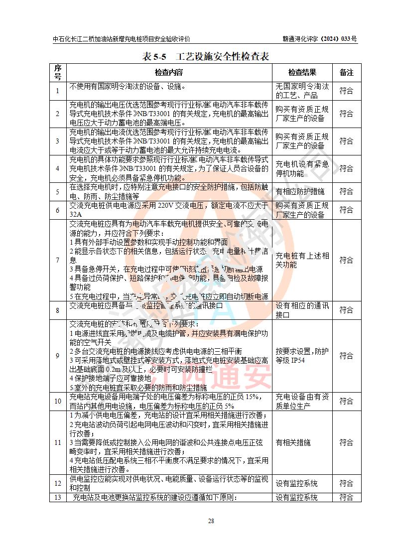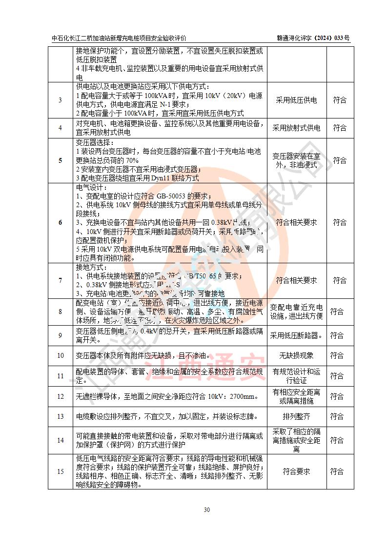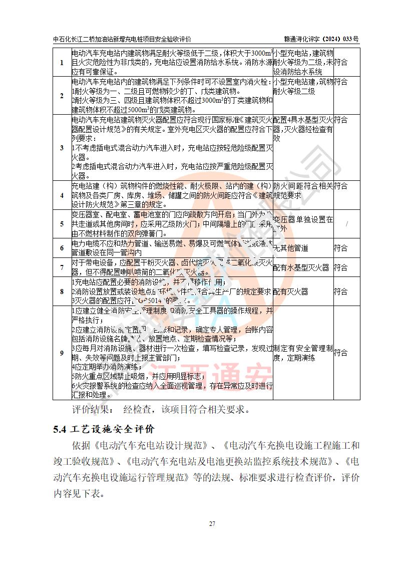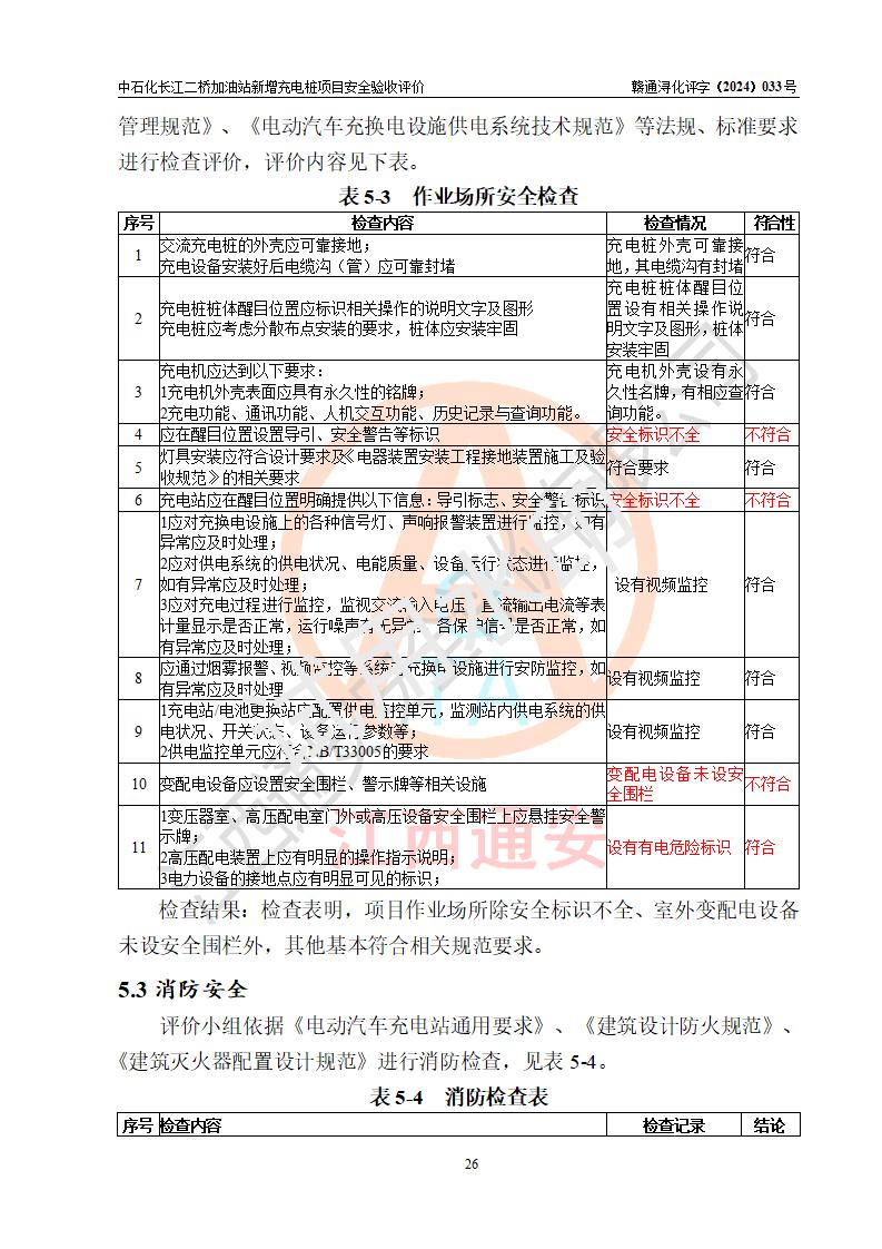 評(píng)價(jià)結(jié)論 | 中國(guó)石化銷售股份有限公司江西九江潯陽(yáng)石油分公司長(zhǎng)江二橋加油站新增充電樁項(xiàng)目涉及的安全條件、安全生產(chǎn)條件、安全生產(chǎn)管理符合《電動(dòng)汽車充電站設(shè)計(jì)規(guī)范》、《汽車加油加氣加氫站技術(shù)標(biāo)準(zhǔn)》等**有關(guān)法規(guī)、標(biāo)準(zhǔn)、規(guī)范要求,能滿足經(jīng)營(yíng)單位的安全條件,具備項(xiàng)目竣工驗(yàn)收的條件。 | |||