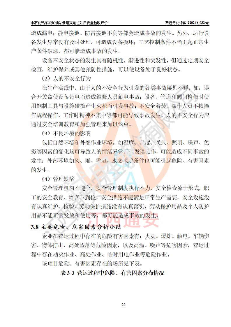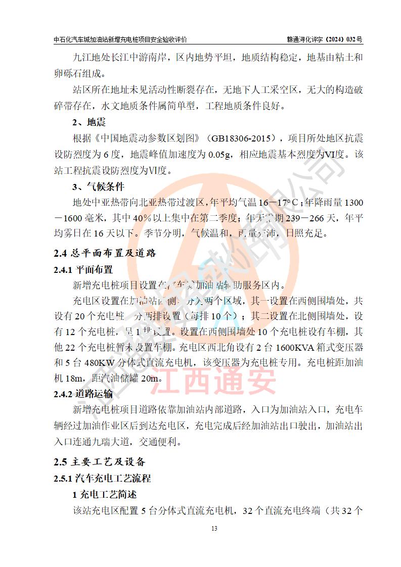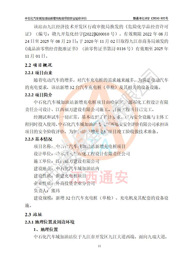 項(xiàng)目簡介 | 中國石化銷售股份有限公司江西九江潯陽石油分公司汽車城加油站是一家專門從事成品油零售經(jīng)營的有限公司分公司(外商投資企業(yè)分公司),經(jīng)營場所位于江西省九江市開發(fā)區(qū)九江大道西端?,F(xiàn)有從業(yè)人員7名,其中安全管理人員1人,加油站負(fù)責(zé)人熊瑋。 該站由九江經(jīng)濟(jì)技術(shù)開發(fā)區(qū)行政審批局換發(fā)的《危險(xiǎn)化學(xué)品經(jīng)營許可證》(編號:贛九開?;?/span>經(jīng)字[2022]K00010號),**期限2022年08月24日至2025年08月23日;于2020年11月02日取得九江市商務(wù)局頒發(fā)的《成品油零售經(jīng)營批準(zhǔn)證書》(油零售證書第潯0116號)**期至2025年11月01日。 隨著電動汽車的增多,對汽車充電樁的需求越來越多,為滿足電動汽車的充電要求,該站新增32臺汽車充電樁(單槍)及其相關(guān)的設(shè)備設(shè)施。 | |||