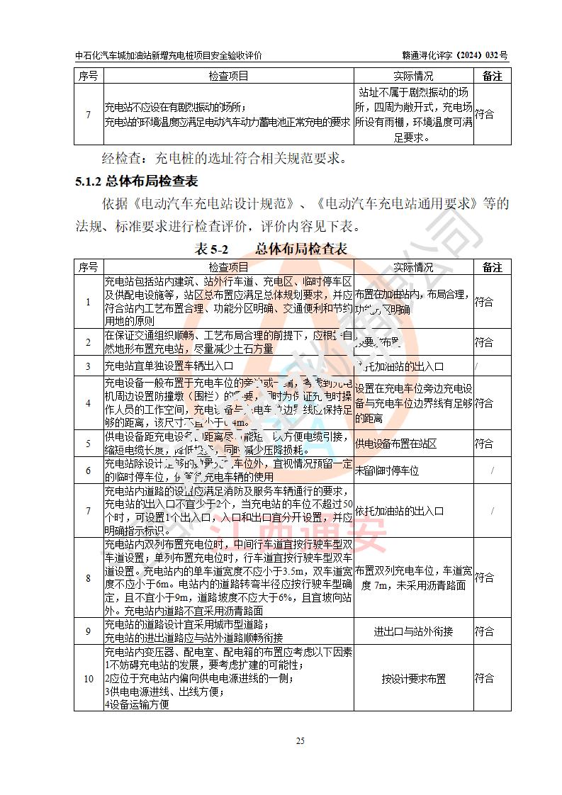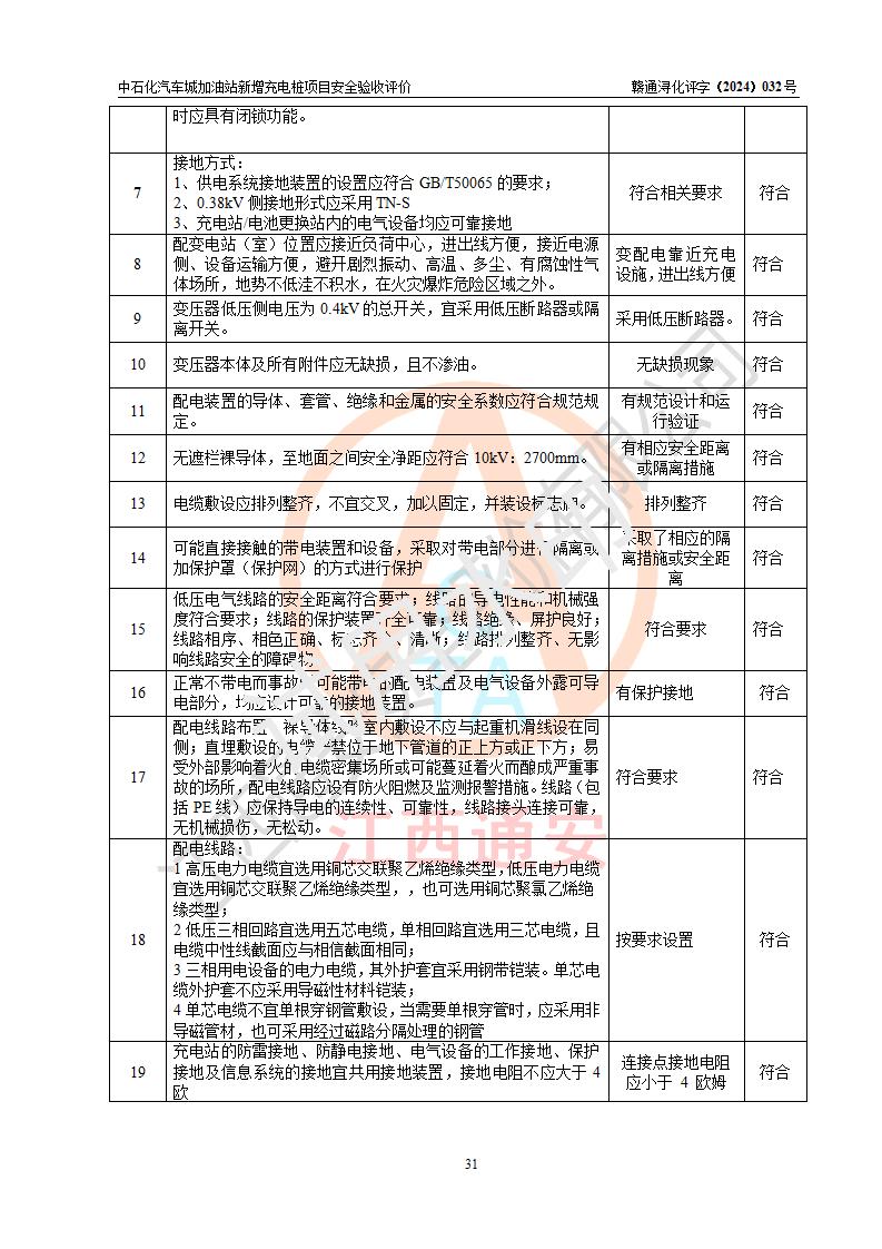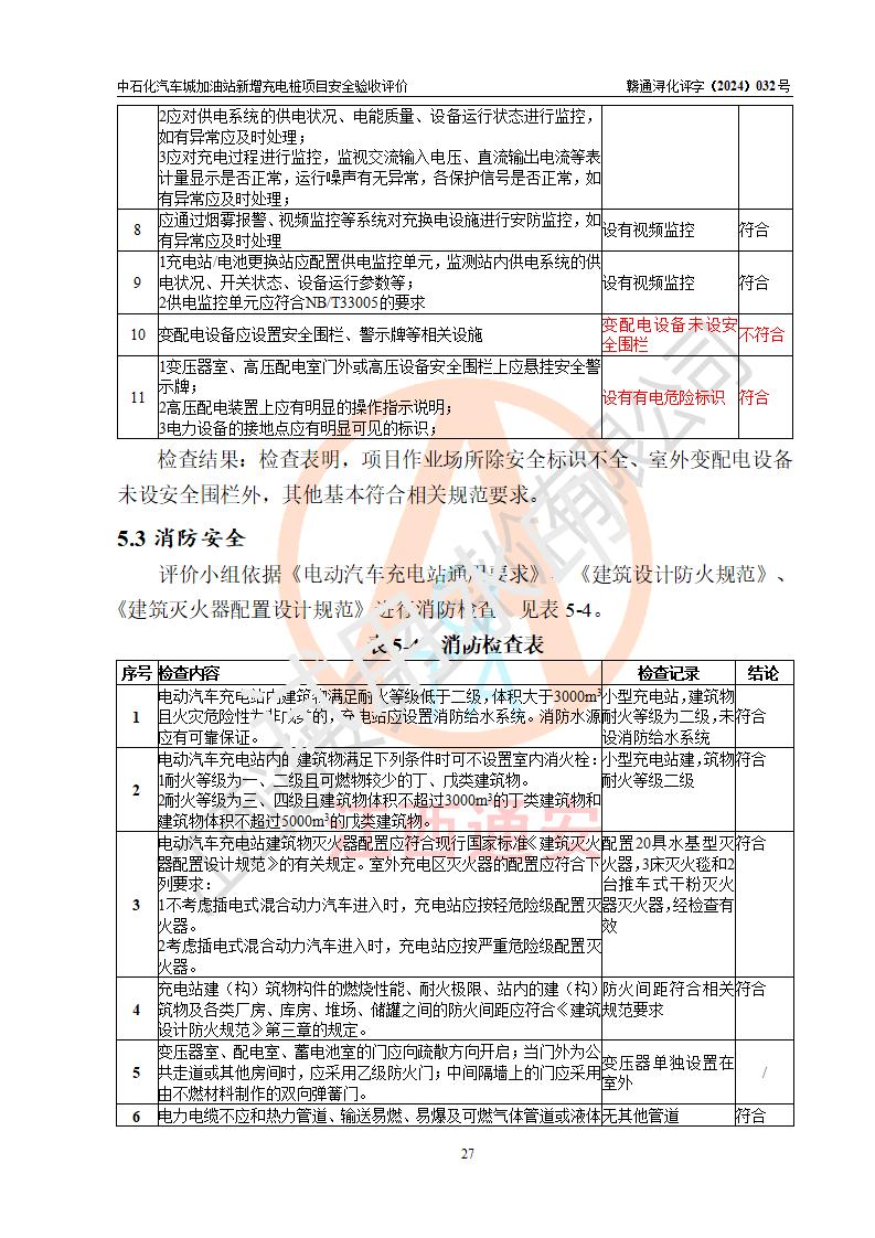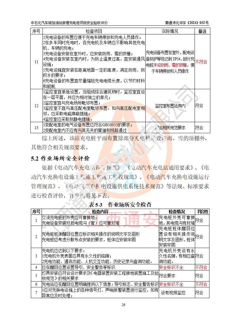 評價(jià)結(jié)論 | 中國石化銷售股份有限公司江西九江潯陽石油分公司汽車城加油站新增充電樁項(xiàng)目涉及的安全條件、安全生產(chǎn)條件、安全生產(chǎn)管理符合《電動汽車充電站設(shè)計(jì)規(guī)范》、《汽車加油加氣加氫站技術(shù)標(biāo)準(zhǔn)》等**有關(guān)法規(guī)、標(biāo)準(zhǔn)、規(guī)范要求,能滿足經(jīng)營單位的安全條件,具備項(xiàng)目竣工驗(yàn)收的條件。 | |||