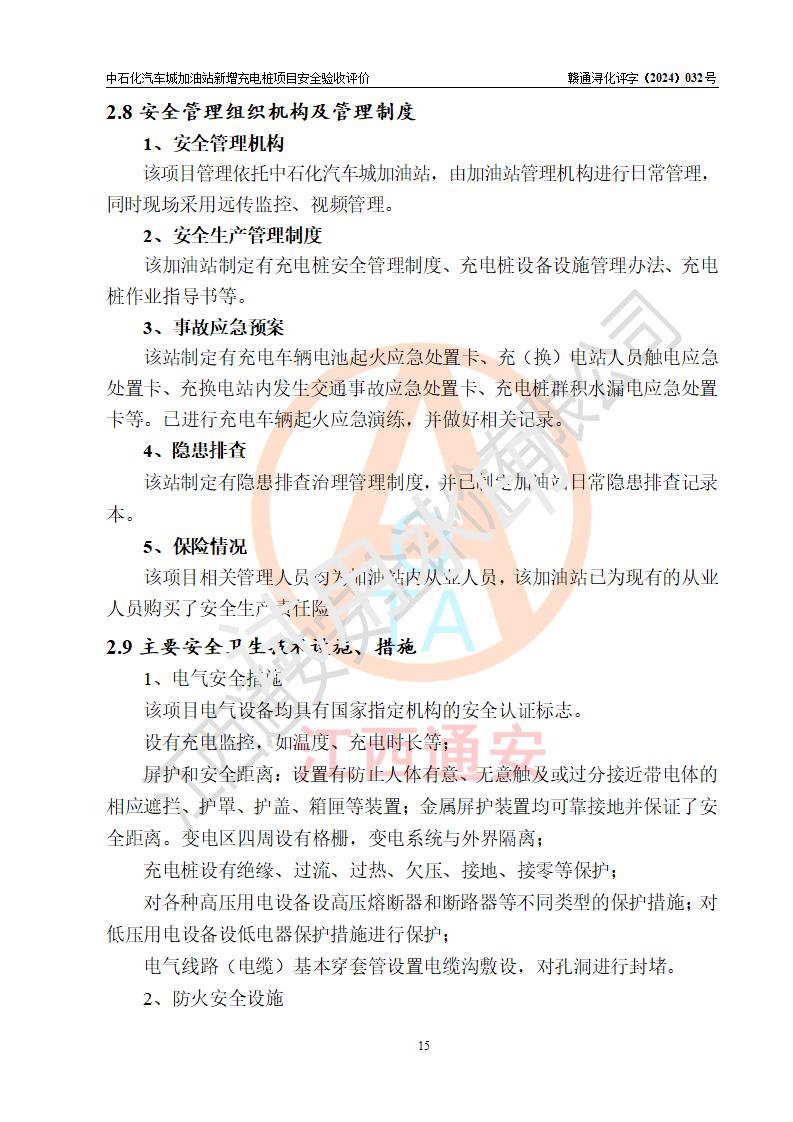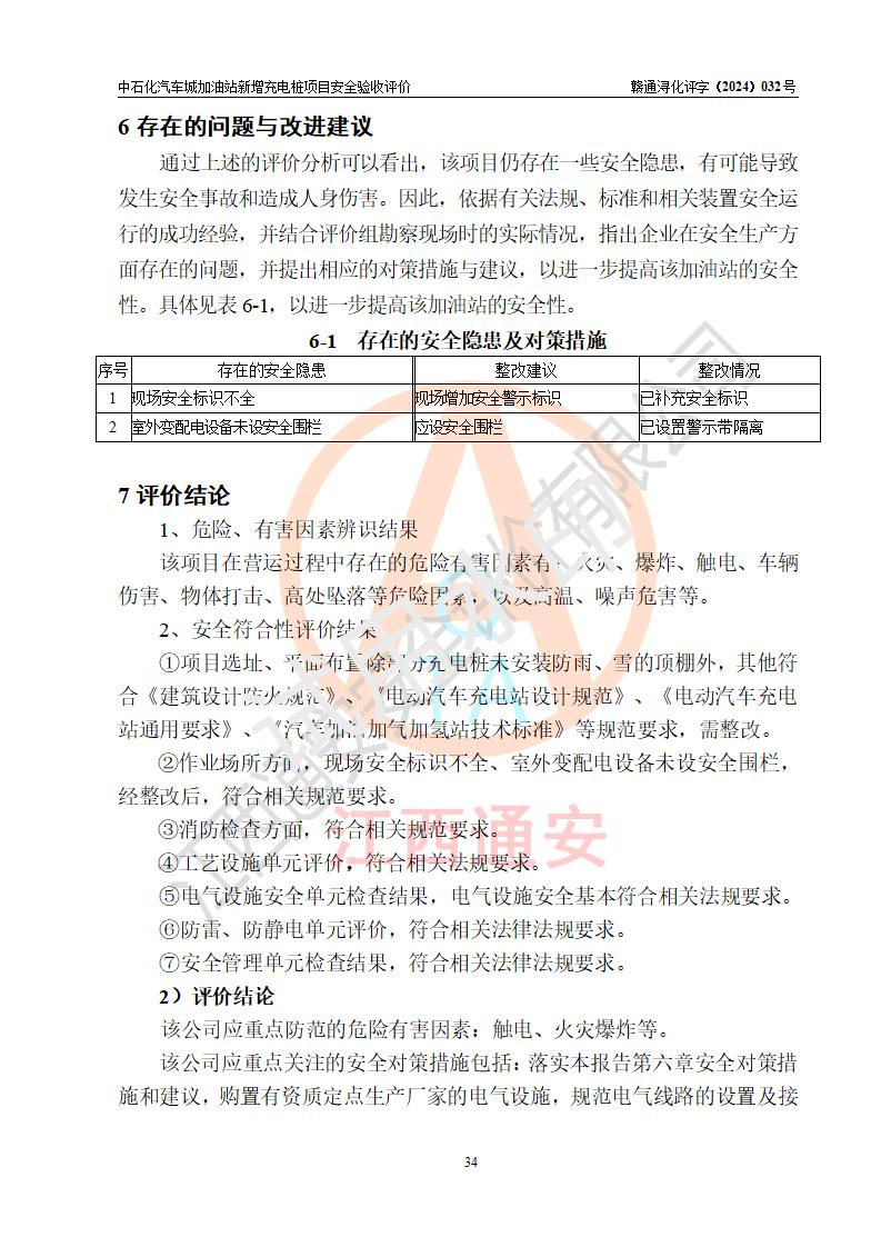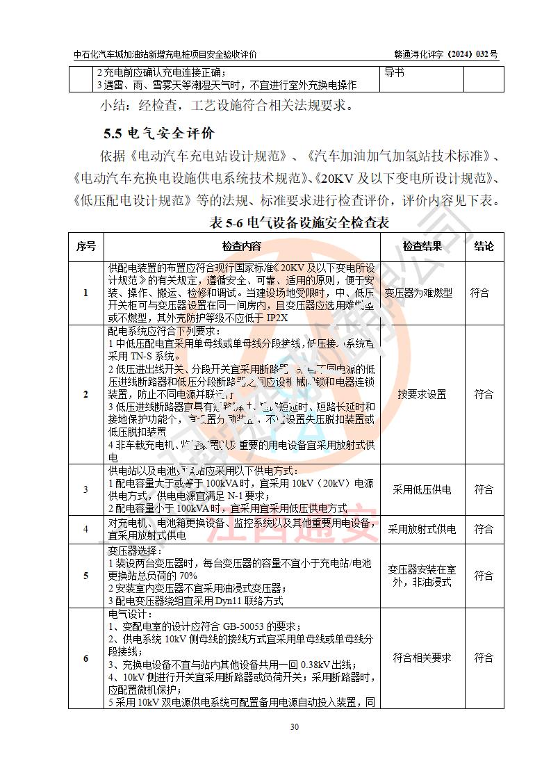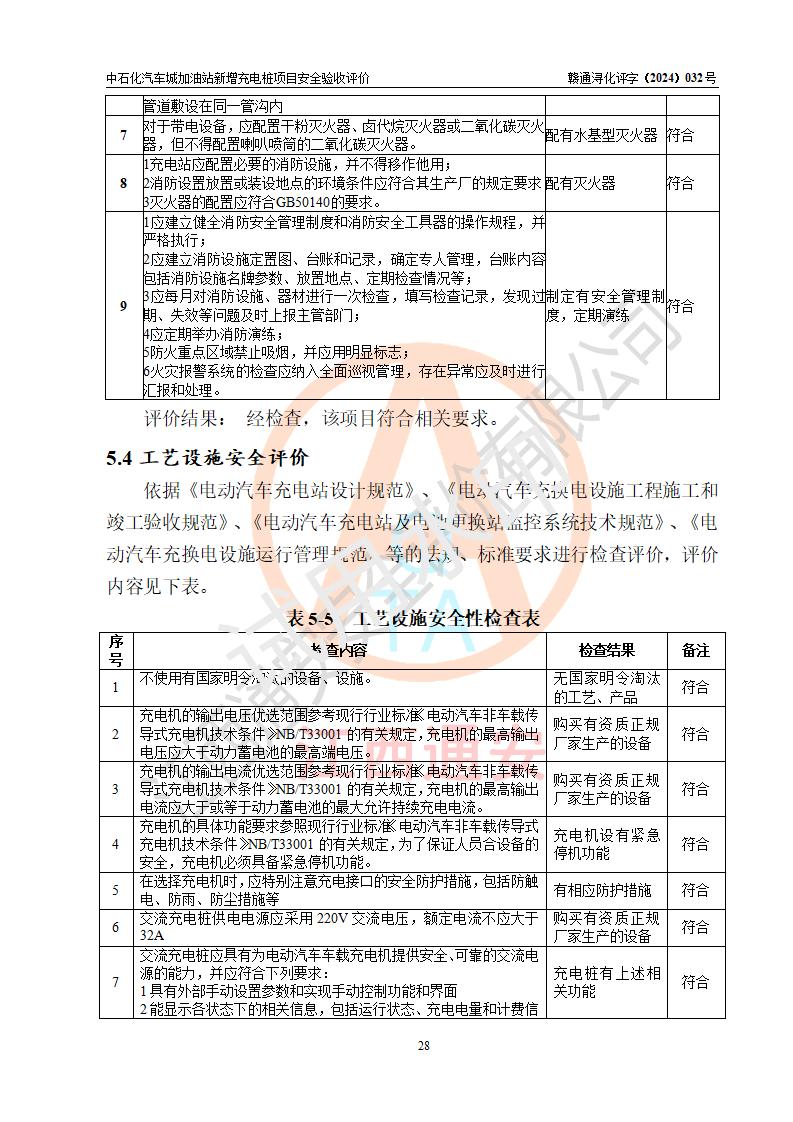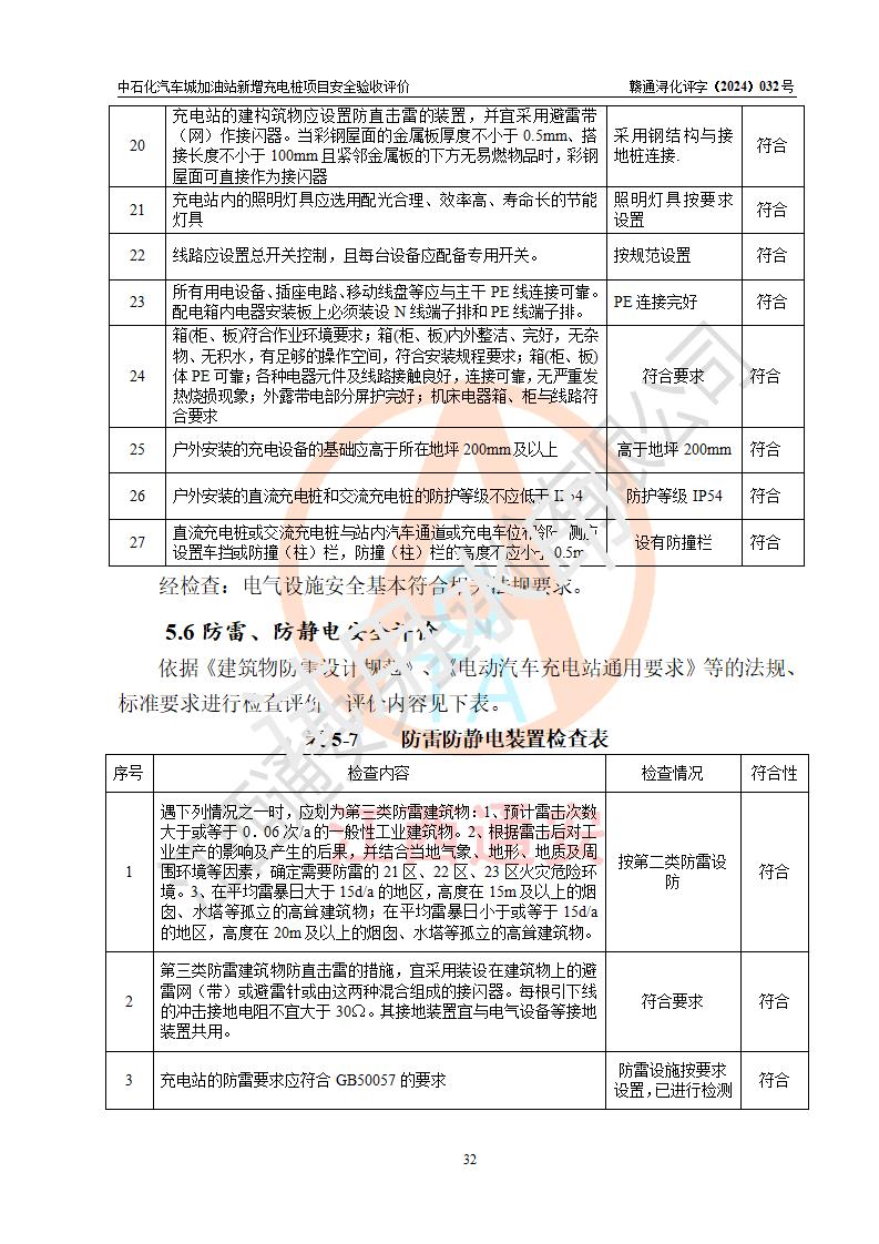 評價(jià)結(jié)論 | 中國石化銷售股份有限公司江西九江潯陽石油分公司汽車城加油站新增充電樁項(xiàng)目涉及的安全條件、安全生產(chǎn)條件、安全生產(chǎn)管理符合《電動汽車充電站設(shè)計(jì)規(guī)范》、《汽車加油加氣加氫站技術(shù)標(biāo)準(zhǔn)》等**有關(guān)法規(guī)、標(biāo)準(zhǔn)、規(guī)范要求,能滿足經(jīng)營單位的安全條件,具備項(xiàng)目竣工驗(yàn)收的條件。 | |||