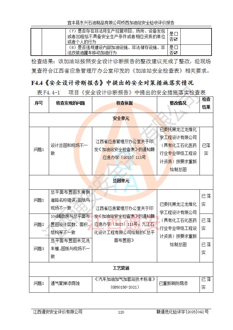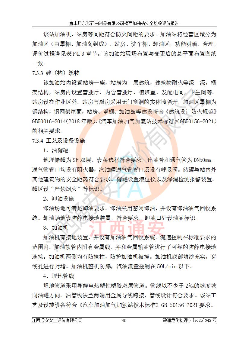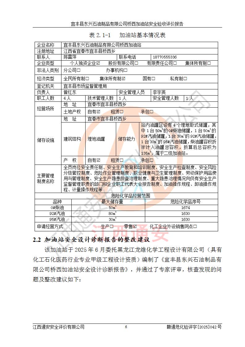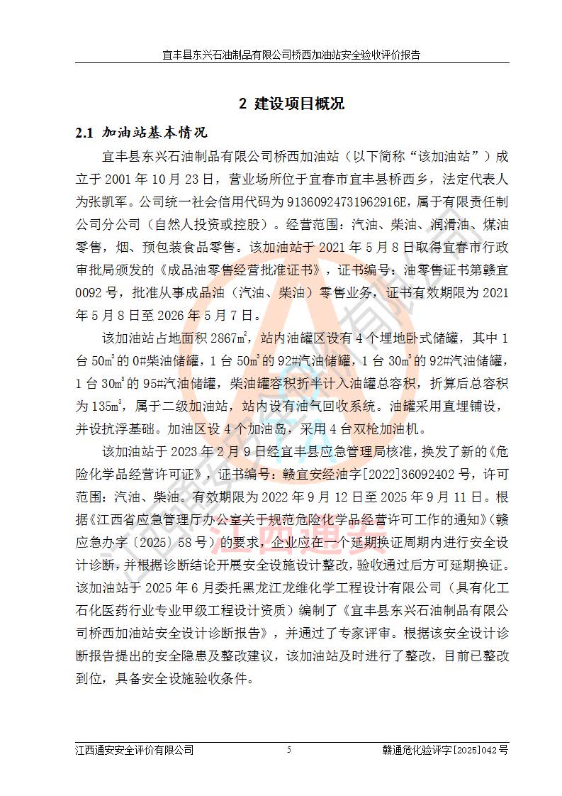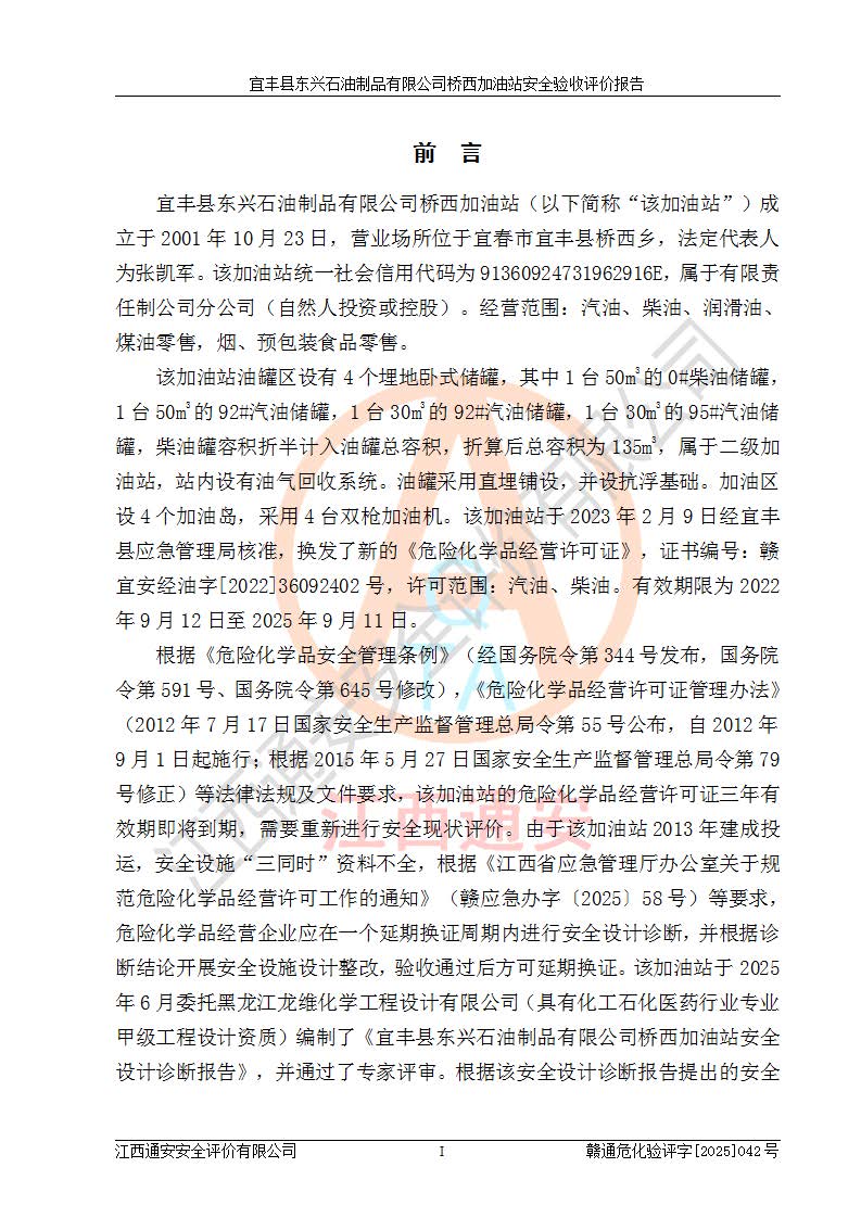 項目簡介 | 宜豐縣東興石油制品有限公司橋西加油站(以下簡稱“該加油站”)成立于2001年10月23日,營業(yè)場所位于宜春市宜豐縣橋西鄉(xiāng),法定**人為張凱軍。該加油站統(tǒng)一社會信用代碼為91360924731962916E,屬于有限責任制公司分公司(自然人投資或控股)。經(jīng)營范圍:汽油、柴油、潤滑油、煤油零售,煙、預包裝食品零售。 該加油站油罐區(qū)設(shè)有4個埋地臥式儲罐,其中1臺50m3的0#柴油儲罐,1臺50m3的92#汽油儲罐,1臺30m3的92#汽油儲罐,1臺30m3的95#汽油儲罐,柴油罐容積折半計入油罐總?cè)莘e,折算后總?cè)莘e為135m3,屬于二級加油站,站內(nèi)設(shè)有油氣回收系統(tǒng)。油罐采用直埋鋪設(shè),并設(shè)抗浮基礎(chǔ)。加油區(qū)設(shè)4個加油島,采用4臺雙槍加油機。該加油站于2023年2月9日經(jīng)宜豐縣應急管理局核準,換發(fā)了新的《危險化學品經(jīng)營許可證》,證書編號:贛宜安經(jīng)油字[2022]36092402號,許可范圍:汽油、柴油。**期限為2022年9月12日至2025年9月11日。 根據(jù)《危險化學品安全管理條例》(經(jīng)***令第344號發(fā)布,***令第591號、***令第645號修改),《危險化學品經(jīng)營許可證管理辦法》(2012年7月17日**安全生產(chǎn)監(jiān)督管理總局令第55號公布,自2012年9月1日起施行;根據(jù)2015年5月27日**安全生產(chǎn)監(jiān)督管理總局令第79號修正)等法律法規(guī)及文件要求,該加油站的危險化學品經(jīng)營許可證三年**期即將到期,需要重新進行安全現(xiàn)狀評價。由于該加油站2013年建成投運,安全設(shè)施“三同時”資料不全,根據(jù)《江西省應急管理廳辦公室關(guān)于規(guī)范危險化學品經(jīng)營許可工作的通知》(贛應急辦字〔2025〕58號)等要求,危險化學品經(jīng)營企業(yè)應在一個延期換證周期內(nèi)進行安全設(shè)計診斷,并根據(jù)診斷結(jié)論開展安全設(shè)施設(shè)計整改,驗收通過后方可延期換證。該加油站于2025年6月委托黑龍江龍維化學工程設(shè)計有限公司(具有化工石化醫(yī)藥行業(yè)專業(yè)**工程設(shè)計資質(zhì))編制了《宜豐縣東興石油制品有限公司橋西加油站安全設(shè)計診斷報告》,并通過了專家評審。根據(jù)該安全設(shè)計診斷報告提出的安全隱患及整改建議,該加油站及時進行了整改,目前已整改到位,具備安全設(shè)施驗收條件。