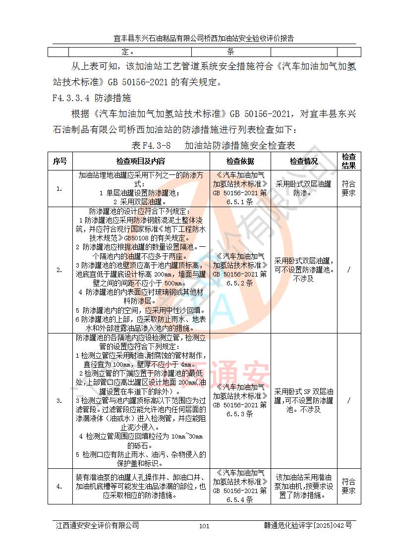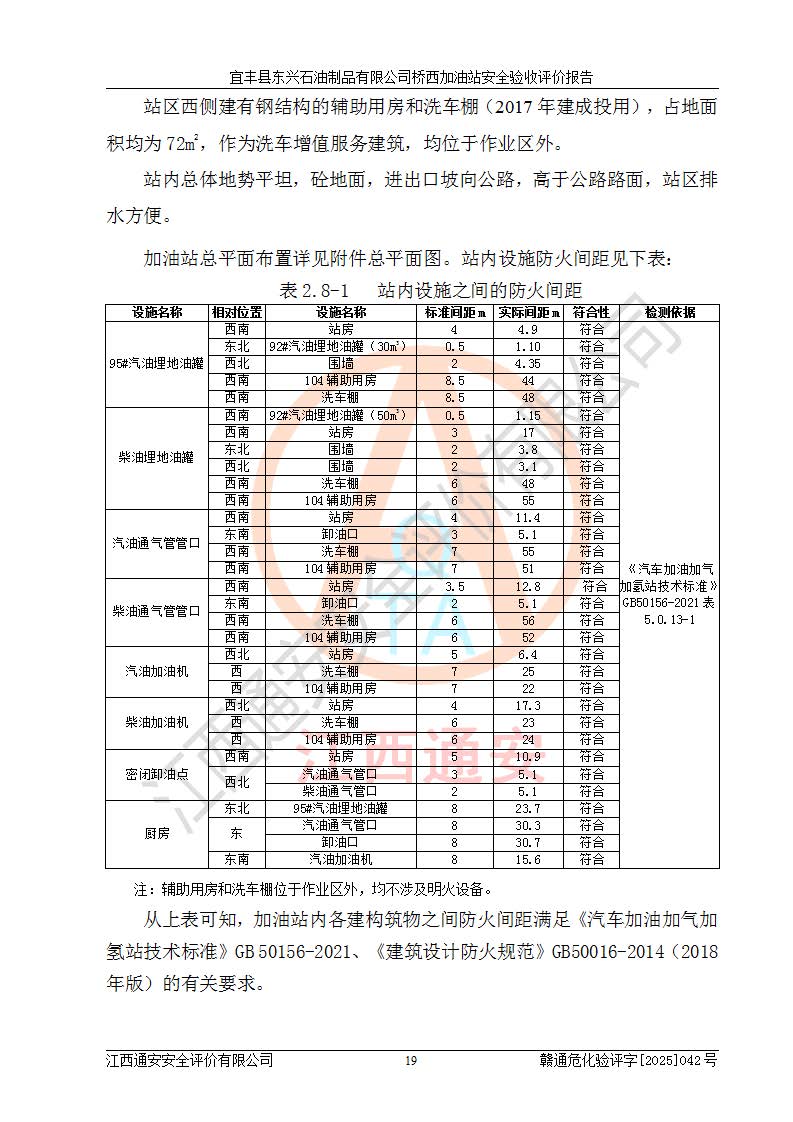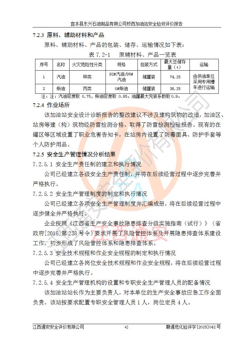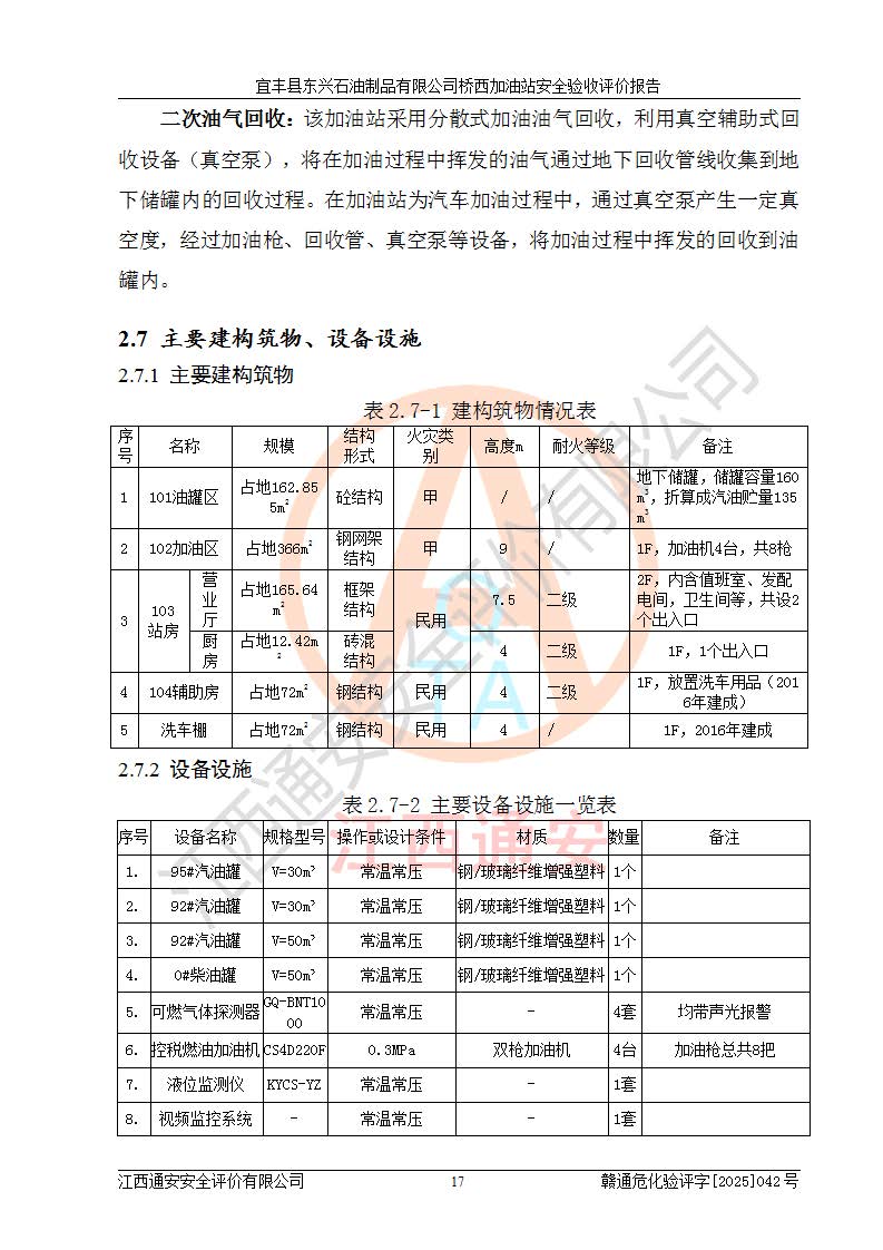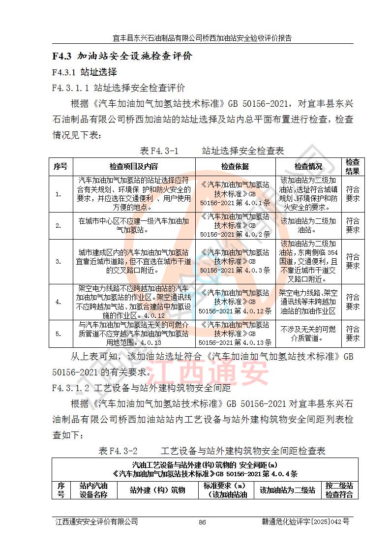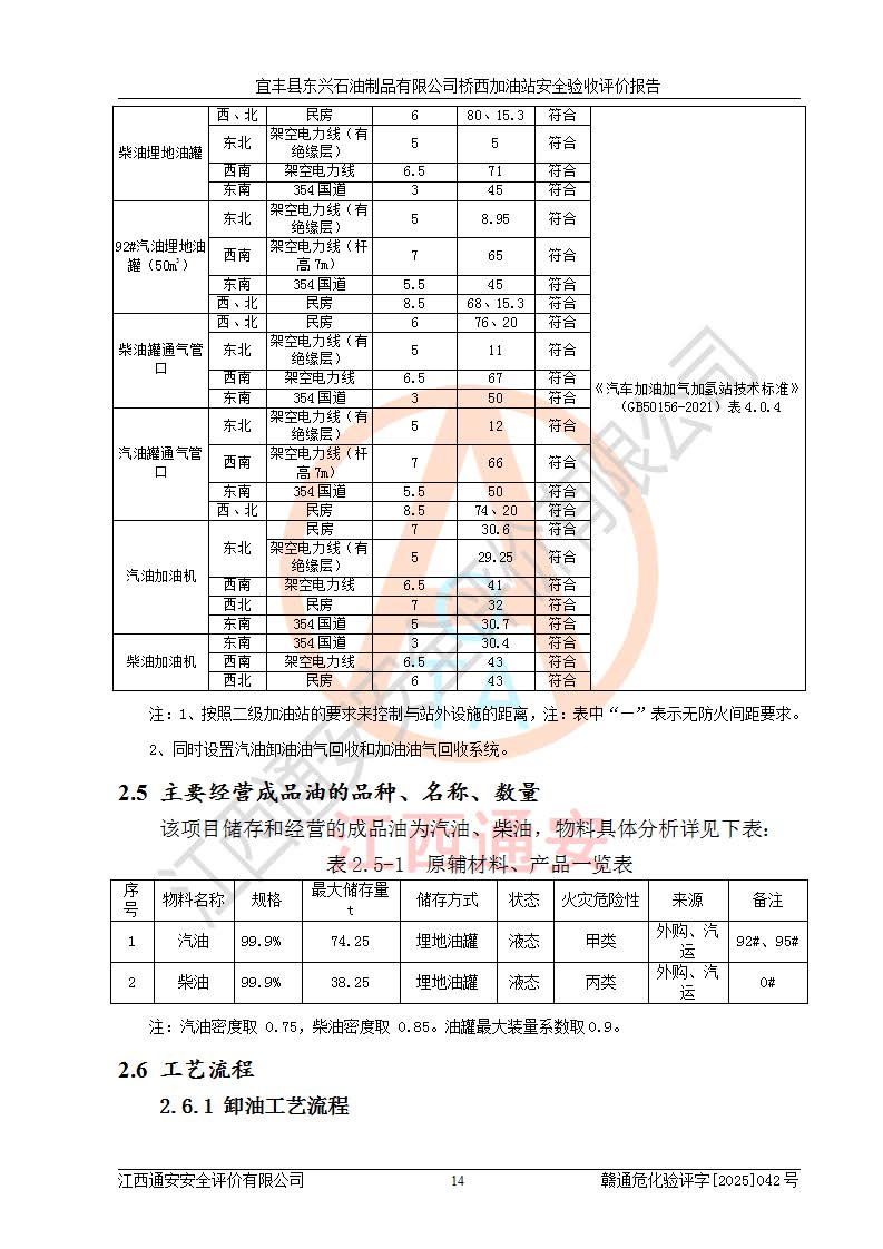 項目簡介 | 宜豐縣東興石油制品有限公司橋西加油站(以下簡稱“該加油站”)成立于2001年10月23日,營業(yè)場所位于宜春市宜豐縣橋西鄉(xiāng),法定**人為張凱軍。該加油站統(tǒng)一社會信用代碼為91360924731962916E,屬于有限責任制公司分公司(自然人投資或控股)。經(jīng)營范圍:汽油、柴油、潤滑油、煤油零售,煙、預包裝食品零售。 該加油站油罐區(qū)設(shè)有4個埋地臥式儲罐,其中1臺50m3的0#柴油儲罐,1臺50m3的92#汽油儲罐,1臺30m3的92#汽油儲罐,1臺30m3的95#汽油儲罐,柴油罐容積折半計入油罐總?cè)莘e,折算后總?cè)莘e為135m3,屬于二級加油站,站內(nèi)設(shè)有油氣回收系統(tǒng)。油罐采用直埋鋪設(shè),并設(shè)抗浮基礎(chǔ)。加油區(qū)設(shè)4個加油島,采用4臺雙槍加油機。該加油站于2023年2月9日經(jīng)宜豐縣應急管理局核準,換發(fā)了新的《危險化學品經(jīng)營許可證》,證書編號:贛宜安經(jīng)油字[2022]36092402號,許可范圍:汽油、柴油。**期限為2022年9月12日至2025年9月11日。 根據(jù)《危險化學品安全管理條例》(經(jīng)***令第344號發(fā)布,***令第591號、***令第645號修改),《危險化學品經(jīng)營許可證管理辦法》(2012年7月17日**安全生產(chǎn)監(jiān)督管理總局令第55號公布,自2012年9月1日起施行;根據(jù)2015年5月27日**安全生產(chǎn)監(jiān)督管理總局令第79號修正)等法律法規(guī)及文件要求,該加油站的危險化學品經(jīng)營許可證三年**期即將到期,需要重新進行安全現(xiàn)狀評價。由于該加油站2013年建成投運,安全設(shè)施“三同時”資料不全,根據(jù)《江西省應急管理廳辦公室關(guān)于規(guī)范危險化學品經(jīng)營許可工作的通知》(贛應急辦字〔2025〕58號)等要求,危險化學品經(jīng)營企業(yè)應在一個延期換證周期內(nèi)進行安全設(shè)計診斷,并根據(jù)診斷結(jié)論開展安全設(shè)施設(shè)計整改,驗收通過后方可延期換證。該加油站于2025年6月委托黑龍江龍維化學工程設(shè)計有限公司(具有化工石化醫(yī)藥行業(yè)專業(yè)**工程設(shè)計資質(zhì))編制了《宜豐縣東興石油制品有限公司橋西加油站安全設(shè)計診斷報告》,并通過了專家評審。根據(jù)該安全設(shè)計診斷報告提出的安全隱患及整改建議,該加油站及時進行了整改,目前已整改到位,具備安全設(shè)施驗收條件。