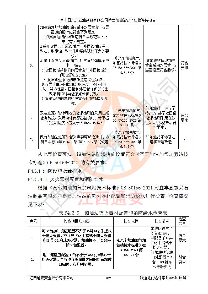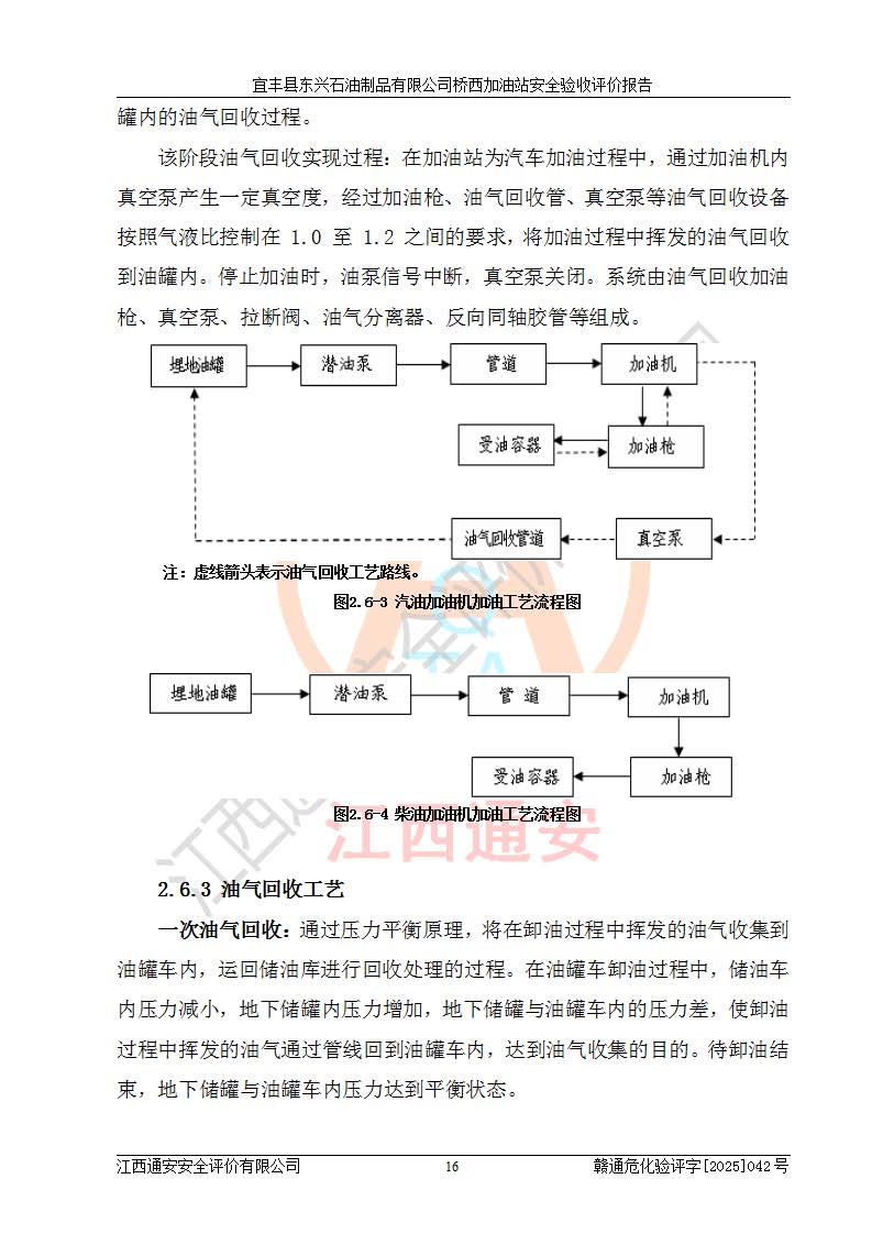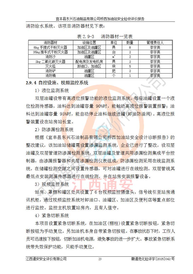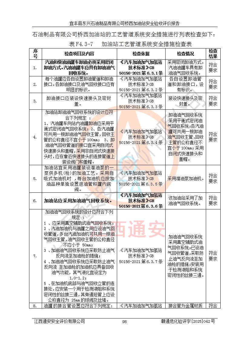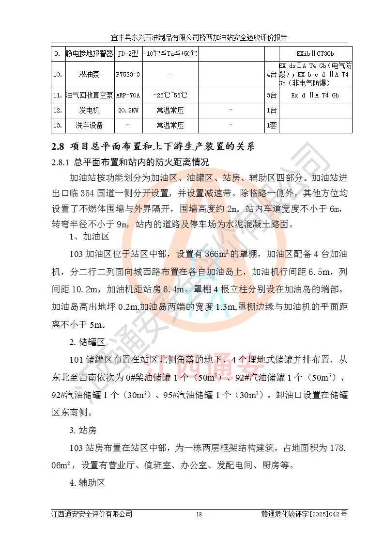 項目簡介 | 宜豐縣東興石油制品有限公司橋西加油站(以下簡稱“該加油站”)成立于2001年10月23日,營業(yè)場所位于宜春市宜豐縣橋西鄉(xiāng),法定**人為張凱軍。該加油站統(tǒng)一社會信用代碼為91360924731962916E,屬于有限責任制公司分公司(自然人投資或控股)。經(jīng)營范圍:汽油、柴油、潤滑油、煤油零售,煙、預包裝食品零售。 該加油站油罐區(qū)設(shè)有4個埋地臥式儲罐,其中1臺50m3的0#柴油儲罐,1臺50m3的92#汽油儲罐,1臺30m3的92#汽油儲罐,1臺30m3的95#汽油儲罐,柴油罐容積折半計入油罐總?cè)莘e,折算后總?cè)莘e為135m3,屬于二級加油站,站內(nèi)設(shè)有油氣回收系統(tǒng)。油罐采用直埋鋪設(shè),并設(shè)抗浮基礎(chǔ)。加油區(qū)設(shè)4個加油島,采用4臺雙槍加油機。該加油站于2023年2月9日經(jīng)宜豐縣應急管理局核準,換發(fā)了新的《危險化學品經(jīng)營許可證》,證書編號:贛宜安經(jīng)油字[2022]36092402號,許可范圍:汽油、柴油。**期限為2022年9月12日至2025年9月11日。 根據(jù)《危險化學品安全管理條例》(經(jīng)***令第344號發(fā)布,***令第591號、***令第645號修改),《危險化學品經(jīng)營許可證管理辦法》(2012年7月17日**安全生產(chǎn)監(jiān)督管理總局令第55號公布,自2012年9月1日起施行;根據(jù)2015年5月27日**安全生產(chǎn)監(jiān)督管理總局令第79號修正)等法律法規(guī)及文件要求,該加油站的危險化學品經(jīng)營許可證三年**期即將到期,需要重新進行安全現(xiàn)狀評價。由于該加油站2013年建成投運,安全設(shè)施“三同時”資料不全,根據(jù)《江西省應急管理廳辦公室關(guān)于規(guī)范危險化學品經(jīng)營許可工作的通知》(贛應急辦字〔2025〕58號)等要求,危險化學品經(jīng)營企業(yè)應在一個延期換證周期內(nèi)進行安全設(shè)計診斷,并根據(jù)診斷結(jié)論開展安全設(shè)施設(shè)計整改,驗收通過后方可延期換證。該加油站于2025年6月委托黑龍江龍維化學工程設(shè)計有限公司(具有化工石化醫(yī)藥行業(yè)專業(yè)**工程設(shè)計資質(zhì))編制了《宜豐縣東興石油制品有限公司橋西加油站安全設(shè)計診斷報告》,并通過了專家評審。根據(jù)該安全設(shè)計診斷報告提出的安全隱患及整改建議,該加油站及時進行了整改,目前已整改到位,具備安全設(shè)施驗收條件。