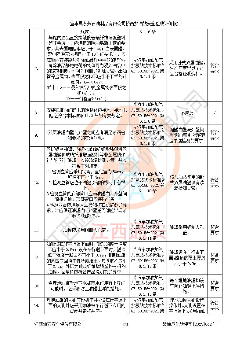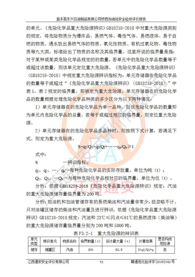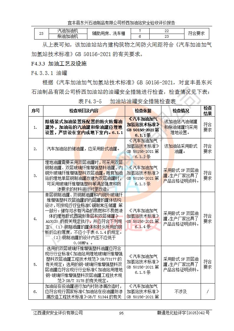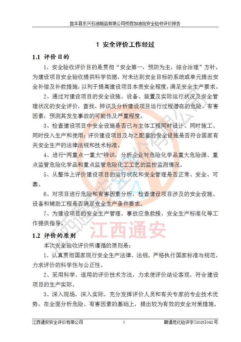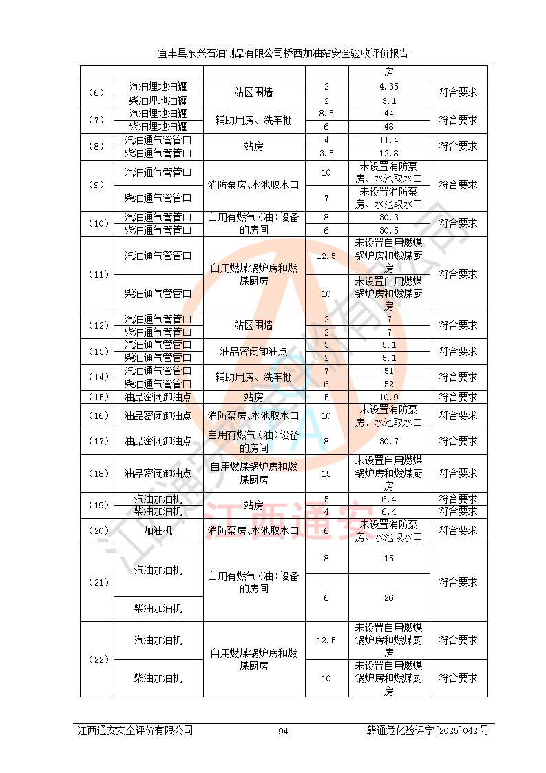 主要任務 | 本評價報告主要針對評價范圍內(nèi)汽油、柴油儲存經(jīng)營過程所涉及的危險、有害因素及重大危險源等進行辨識與分析,根據(jù)相應法律、法規(guī)、標準的要求檢查安全設(shè)施的配置及相關(guān)檢測檢驗情況及其符合性,檢查公用工程及輔助設(shè)施的配套性,審核安全生產(chǎn)管理機構(gòu)、制度、人員培訓、設(shè)備管理、操作規(guī)程、應急預案及勞動防護用品的配備等,對該項目安全設(shè)施及安全措施進行符合性評價,并在此基礎(chǔ)上提出相應的安全對策措施及建議。 | ||||