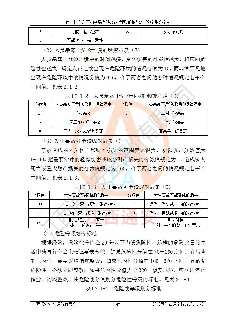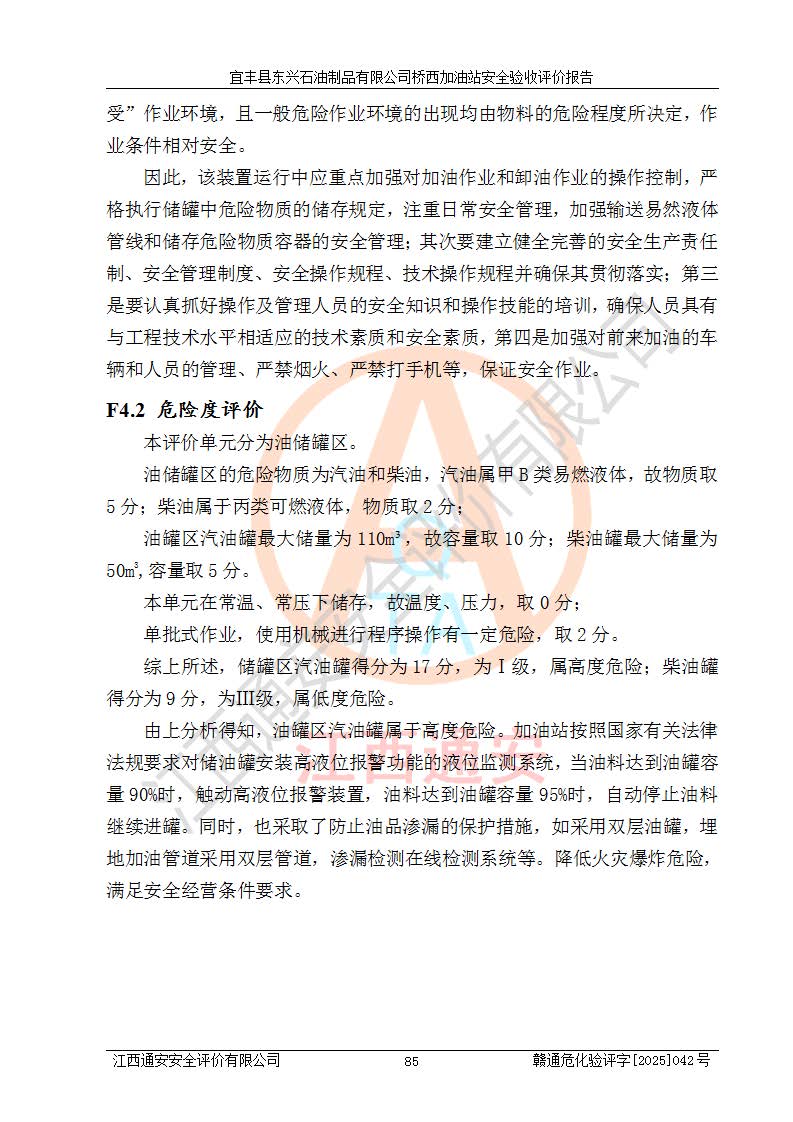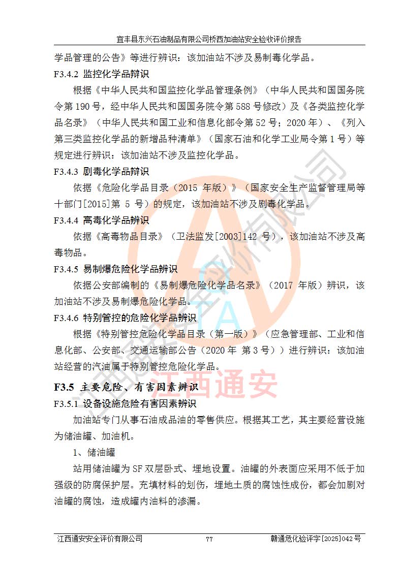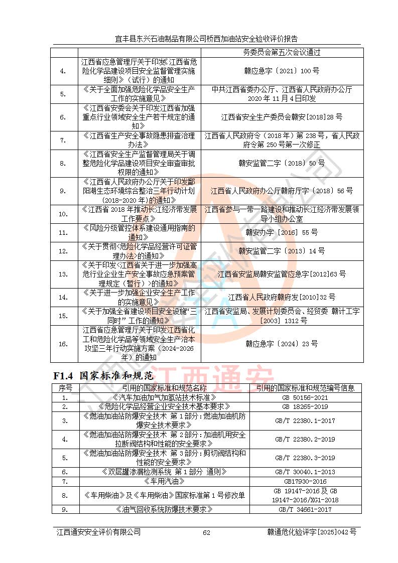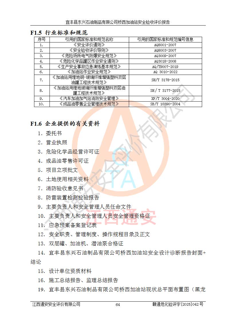 主要任務 | 本評價報告主要針對評價范圍內(nèi)汽油、柴油儲存經(jīng)營過程所涉及的危險、有害因素及重大危險源等進行辨識與分析,根據(jù)相應法律、法規(guī)、標準的要求檢查安全設(shè)施的配置及相關(guān)檢測檢驗情況及其符合性,檢查公用工程及輔助設(shè)施的配套性,審核安全生產(chǎn)管理機構(gòu)、制度、人員培訓、設(shè)備管理、操作規(guī)程、應急預案及勞動防護用品的配備等,對該項目安全設(shè)施及安全措施進行符合性評價,并在此基礎(chǔ)上提出相應的安全對策措施及建議。 | ||||