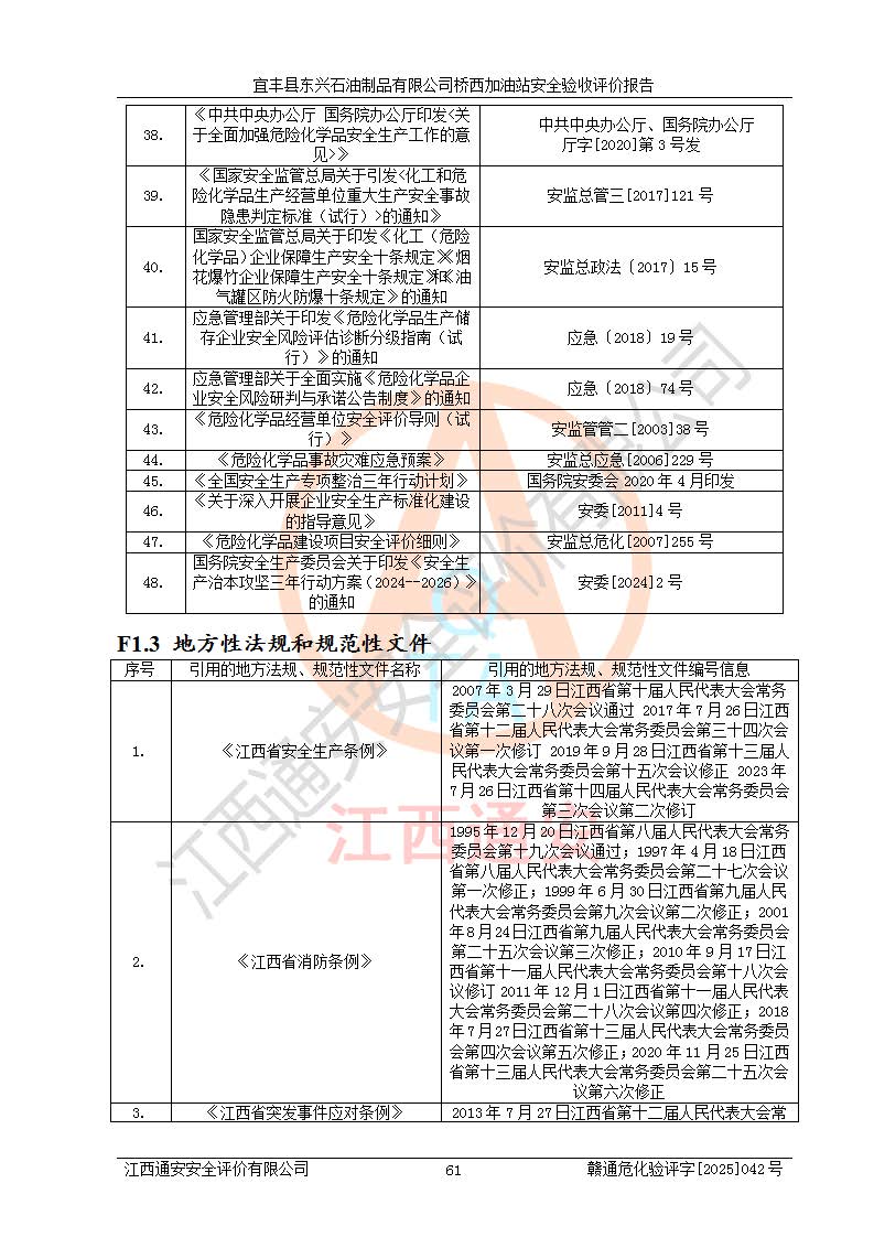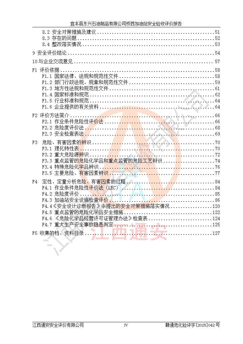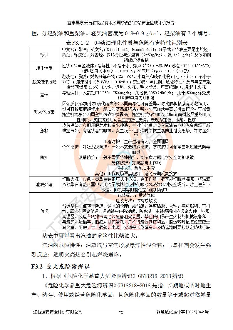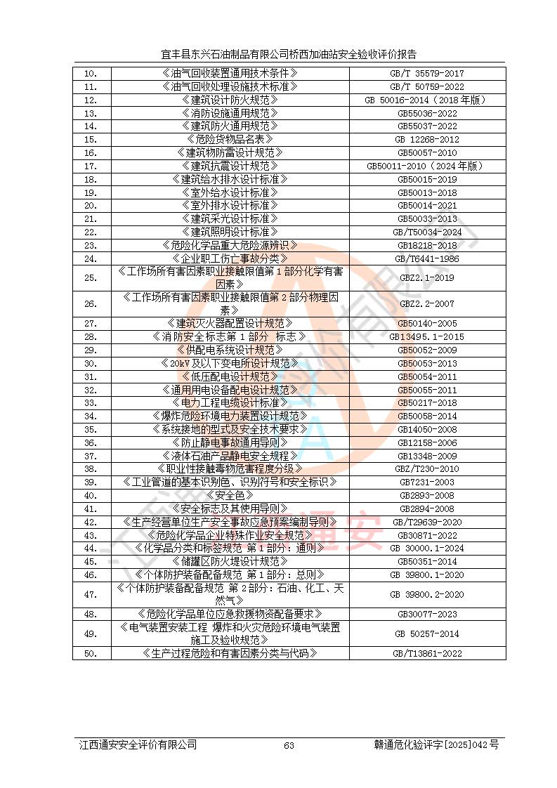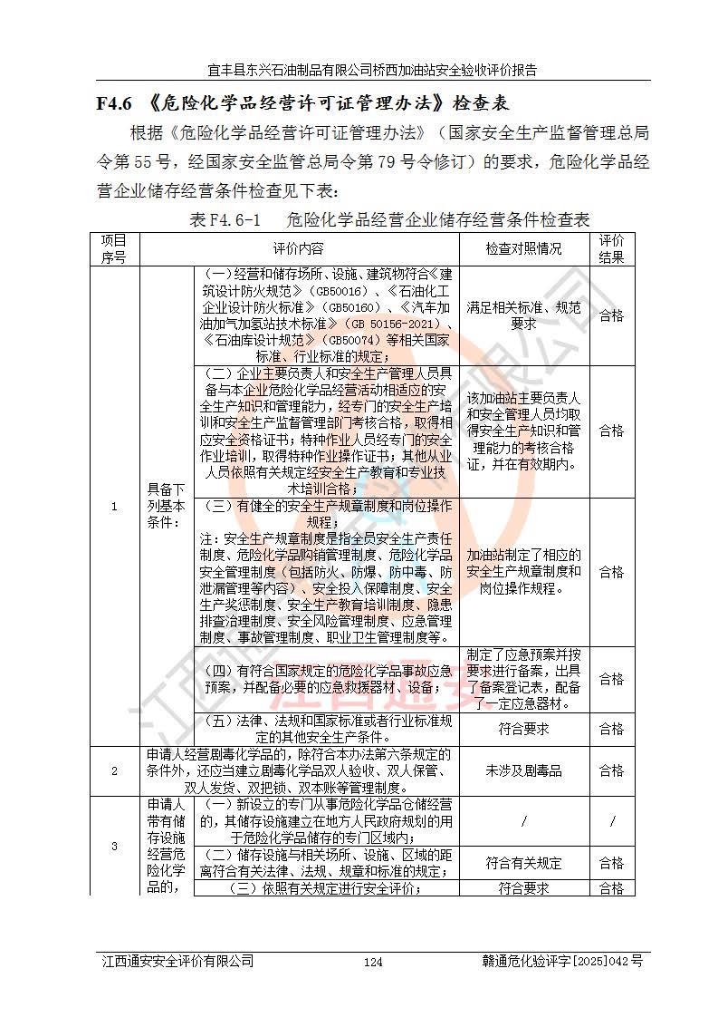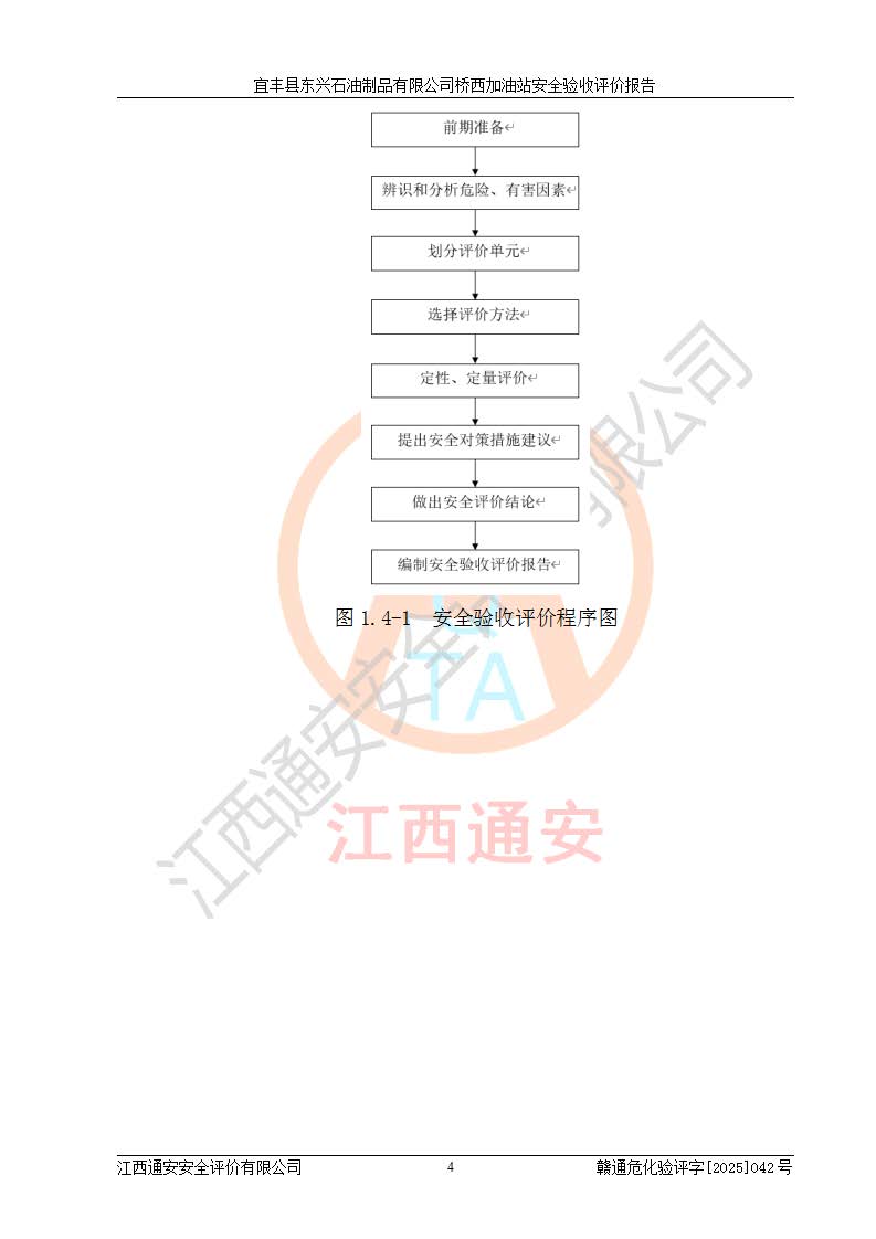 主要任務 | 本評價報告主要針對評價范圍內(nèi)汽油、柴油儲存經(jīng)營過程所涉及的危險、有害因素及重大危險源等進行辨識與分析,根據(jù)相應法律、法規(guī)、標準的要求檢查安全設(shè)施的配置及相關(guān)檢測檢驗情況及其符合性,檢查公用工程及輔助設(shè)施的配套性,審核安全生產(chǎn)管理機構(gòu)、制度、人員培訓、設(shè)備管理、操作規(guī)程、應急預案及勞動防護用品的配備等,對該項目安全設(shè)施及安全措施進行符合性評價,并在此基礎(chǔ)上提出相應的安全對策措施及建議。 | ||||