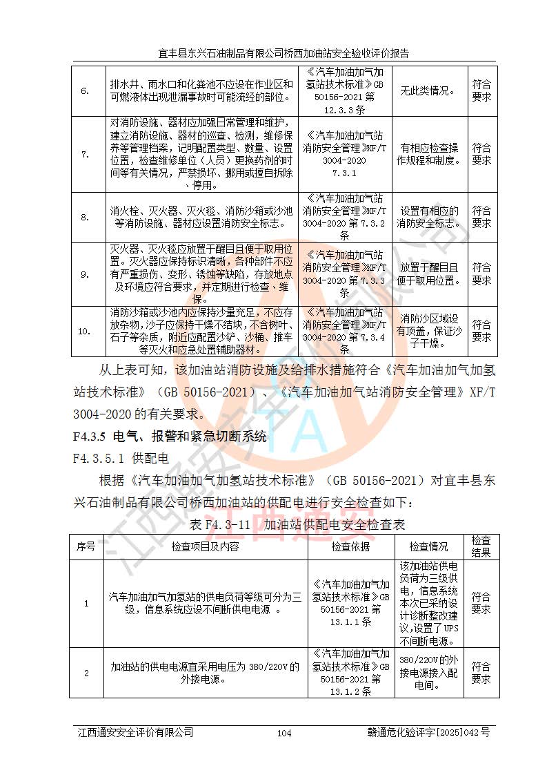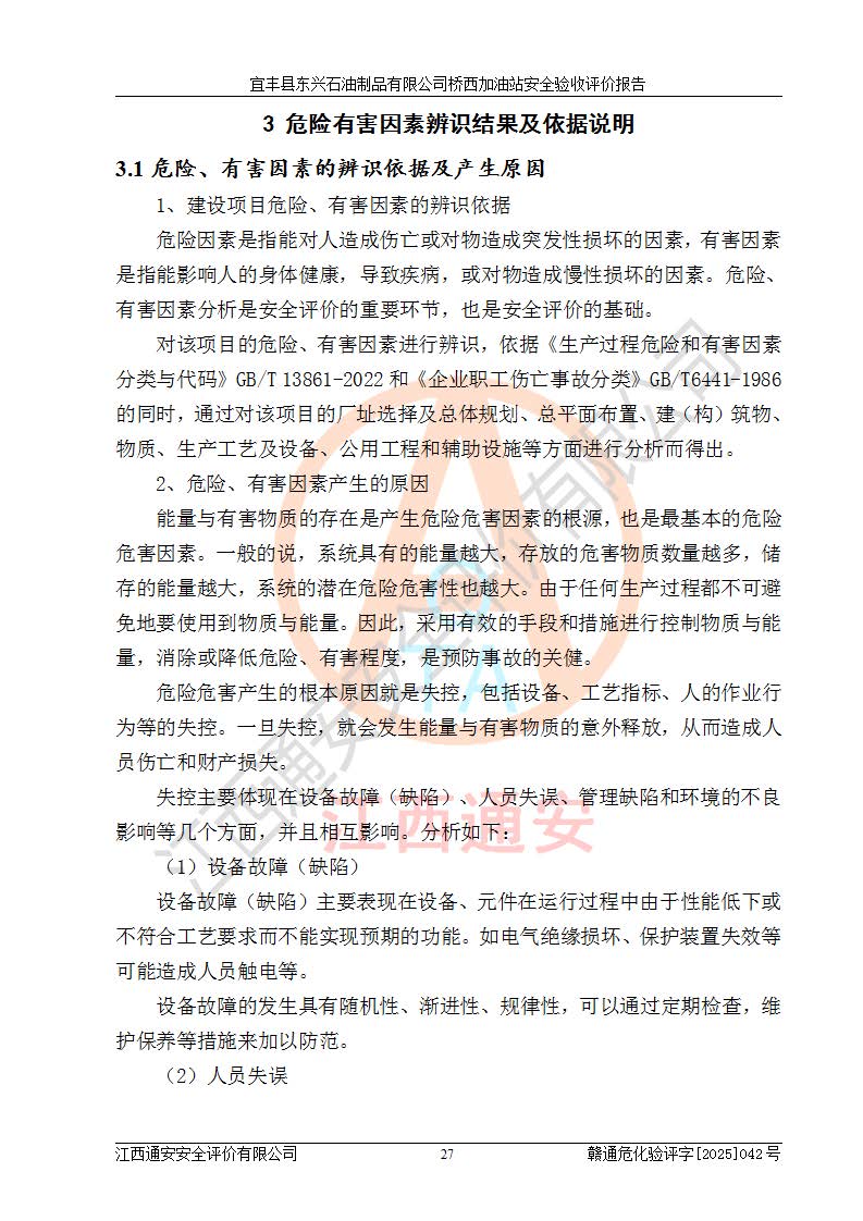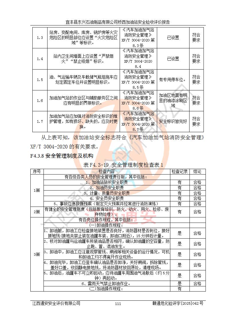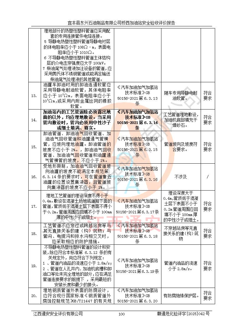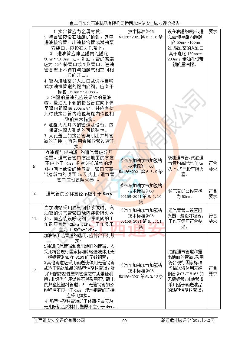 主要任務 | 本評價報告主要針對評價范圍內(nèi)汽油、柴油儲存經(jīng)營過程所涉及的危險、有害因素及重大危險源等進行辨識與分析,根據(jù)相應法律、法規(guī)、標準的要求檢查安全設(shè)施的配置及相關(guān)檢測檢驗情況及其符合性,檢查公用工程及輔助設(shè)施的配套性,審核安全生產(chǎn)管理機構(gòu)、制度、人員培訓、設(shè)備管理、操作規(guī)程、應急預案及勞動防護用品的配備等,對該項目安全設(shè)施及安全措施進行符合性評價,并在此基礎(chǔ)上提出相應的安全對策措施及建議。 | ||||