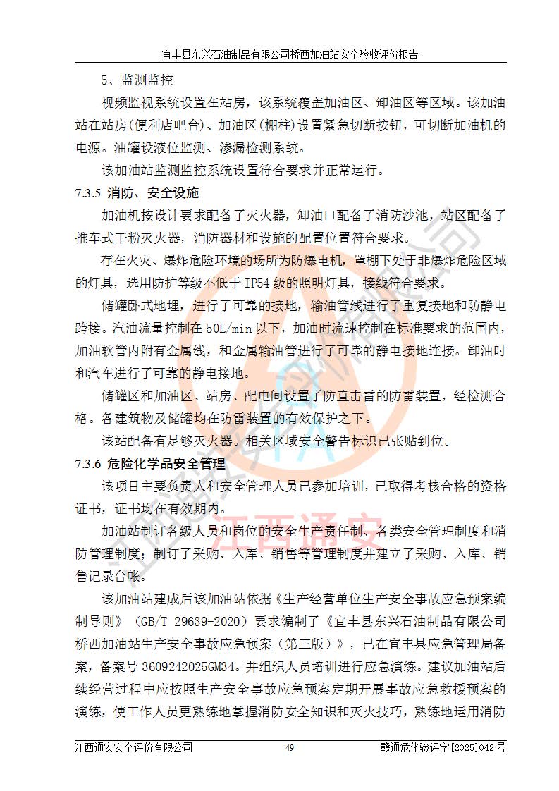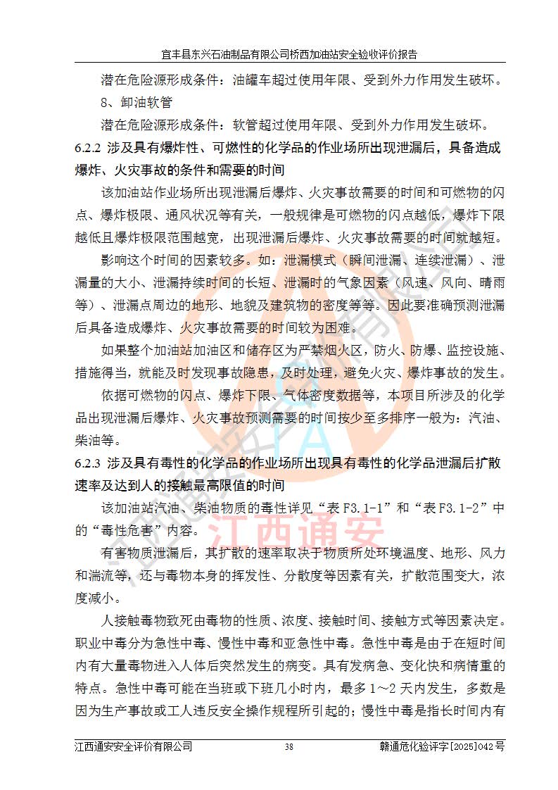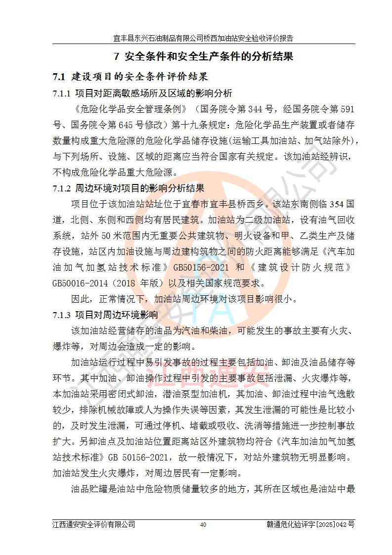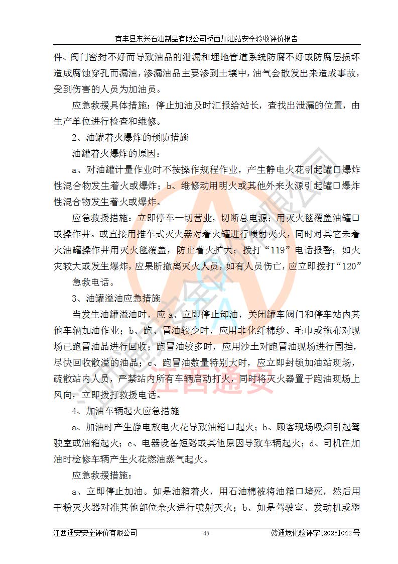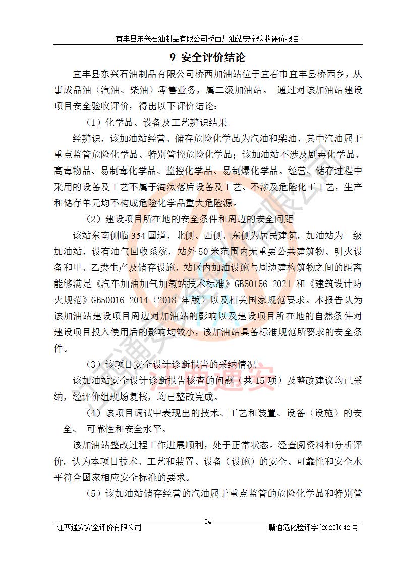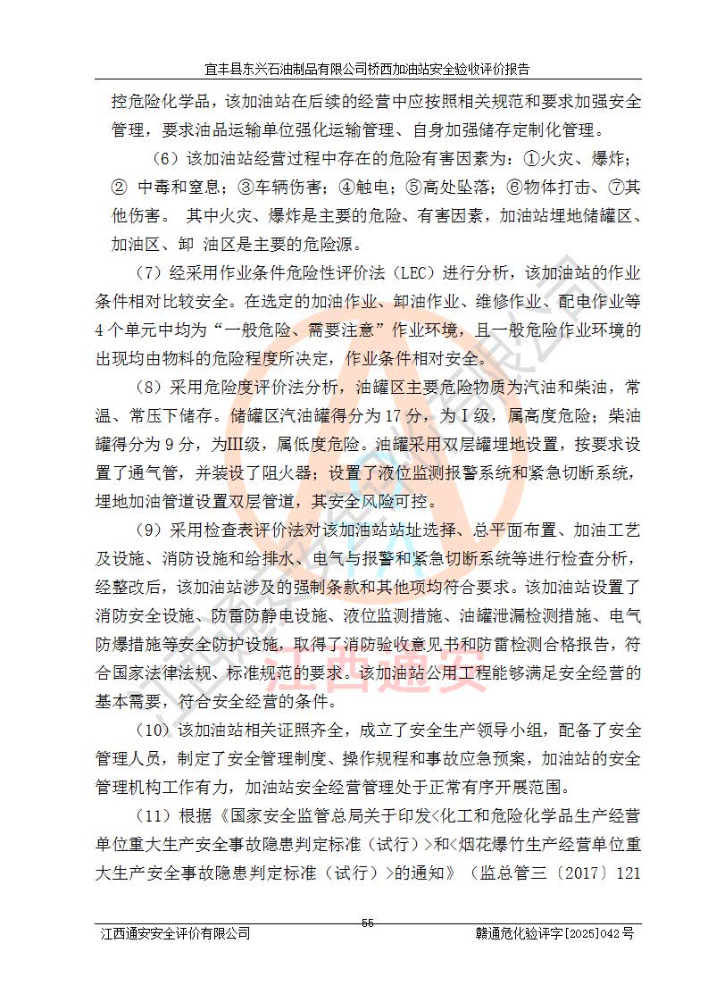 其它 | 一、安全狀況綜合評述 宜豐縣東興石油制品有限公司橋西加油站位于宜春市宜豐縣橋西鄉(xiāng),從事成品油(汽油、柴油)零售業(yè)務,屬二級加油站。 通過對該加油站建設(shè)項目安全驗收評價,得出以下評價結(jié)論: 化學品、設(shè)備及工藝辨識結(jié)果 經(jīng)辨識,該加油站經(jīng)營、儲存危險化學品為汽油和柴油,其中汽油屬于重點監(jiān)管危險化學品、特別管控危險化學品;該加油站不涉及劇毒化學品、高毒物品、易制毒化學品、監(jiān)控化學品、易制爆化學品。經(jīng)營、儲存過程中采用的設(shè)備及工藝不屬于淘汰落后設(shè)備及工藝、不涉及危險化工工藝,生產(chǎn)和儲存單元均不構(gòu)成危險化學品重大危險源。 建設(shè)項目所在地的安全條件和周邊的安全間距 該站東南側(cè)臨354國道,北側(cè)、西側(cè)、東側(cè)為居民建筑,加油站為二級加油站,設(shè)有油氣回收系統(tǒng),站外50米范圍內(nèi)無重要公共建筑物、明火設(shè)備和甲、乙類生產(chǎn)及儲存設(shè)施,站區(qū)內(nèi)加油設(shè)施與周邊建構(gòu)筑物之間的距離能夠滿足《汽車加油加氣加氫站技術(shù)標準》GB50156-2021 和《建筑設(shè)計防火規(guī)范》GB50016-2014(2018 年版)以及相關(guān)**規(guī)范要求。本報告認為該加油站建設(shè)項目周邊對加油站的影響以及建設(shè)項目所在地的自然條件對建設(shè)項目投入使用后的影響均較小,該加油站具備標準規(guī)范所要求的安全條件。 該項目安全設(shè)計診斷報告的采納情況 該加油站安全設(shè)計診斷報告核查的問題(共15項)及整改建議均已采納,經(jīng)評價組現(xiàn)場復核,均已整改完成。 該項目調(diào)試中表現(xiàn)出的技術(shù)、工藝和裝置、設(shè)備(設(shè)施)的安全、 可靠性和安全水平。 該加油站整改過程工作進展順利,處于正常狀態(tài)。經(jīng)查閱資料和分析評價,認為本項目技術(shù)、工藝和裝置、設(shè)備(設(shè)施)的安全、可靠性和安全水平符合**相應安全標準的要求。 該加油站儲存經(jīng)營的汽油屬于重點監(jiān)管的危險化學品和特別管控危險化學品,該加油站在后續(xù)的經(jīng)營中應按照相關(guān)規(guī)范和要求加強安全管理,要求油品運輸單位強化運輸管理、自身加強儲存定制化管理。 該加油站經(jīng)營過程中存在的危險有害因素為:①火災、爆炸;② 中毒和窒息;③**傷害;④觸電;⑤高處墜落;⑥物體打擊、⑦其他傷害。 其中火災、爆炸是主要的危險、有害因素,加油站埋地儲罐區(qū)、加油區(qū)、卸 油區(qū)是主要的危險源。 (7)經(jīng)采用作業(yè)條件危險性評價法(LEC)進行分析,該加油站的作業(yè)條件相對比較安全。在選定的加油作業(yè)、卸油作業(yè)、維修作業(yè)、配電作業(yè)等4個單元中均為“一般危險、需要注意”作業(yè)環(huán)境,且一般危險作業(yè)環(huán)境的出現(xiàn)均由物料的危險程度所決定,作業(yè)條件相對安全。 (8)采用危險度評價法分析,油罐區(qū)主要危險物質(zhì)為汽油和柴油,常溫、常壓下儲存。儲罐區(qū)汽油罐為Ⅰ級,屬**危險;柴油罐得分為為Ⅲ級,屬低度危險。油罐采用雙層罐埋地設(shè)置,按要求設(shè)置了通氣管,并裝設(shè)了阻火器;設(shè)置了液位監(jiān)測報警系統(tǒng)和緊急切斷系統(tǒng),埋地加油管道設(shè)置雙層管道,其安全風險可控。 (9)采用檢查表評價法對該加油站站址選擇、總平面布置、加油工藝及設(shè)施、消防設(shè)施和給排水、電氣與報警和緊急切斷系統(tǒng)等進行檢查分析,經(jīng)整改后,該加油站涉及的強制條款和其他項均符合要求。該加油站設(shè)置了消防安全設(shè)施、防雷防靜電設(shè)施、液位監(jiān)測措施、油罐泄漏檢測措施、電氣防爆措施等安全防護設(shè)施,取得了消防驗收意見書和防雷檢測合格報告,符合**法律法規(guī)、標準規(guī)范的要求。該加油站公用工程能夠滿足安全經(jīng)營的基本需要,符合安全經(jīng)營的條件。 (10)該加油站相關(guān)證照齊全,成立了安全生產(chǎn)**小組,配備了安全管理人員,制定了安全管理制度、操作規(guī)程和事故應急預案,加油站的安全管理機構(gòu)工作有力,加油站安全經(jīng)營管理處于正常有序開展范圍。 (11)對宜豐縣東興石油制品有限公司橋西加油站存在重大生產(chǎn)安全事故隱患進行判定,檢查結(jié)果為該加油站不存在重大生產(chǎn)安全事故隱患。 總體評價結(jié)論:宜豐縣東興石油制品有限公司橋西加油站認真落實并合理采納安全設(shè)計診斷報告中的安全對策、措施及建議,現(xiàn)場與安全設(shè)施設(shè)計單位重新繪制的現(xiàn)狀總平面布置圖一致,安全設(shè)計診斷報告提出的安全對策措施已落實到位。對潛在的危險、 有害因素采取了安全對策措施,工程潛在的危險、有害因素可得到**控制, 風險在**控制和可接受范圍內(nèi)。