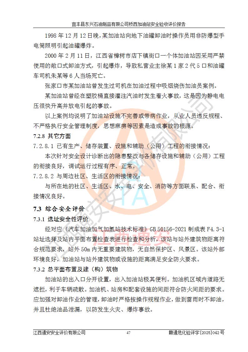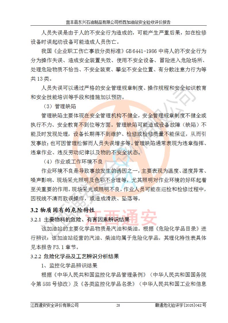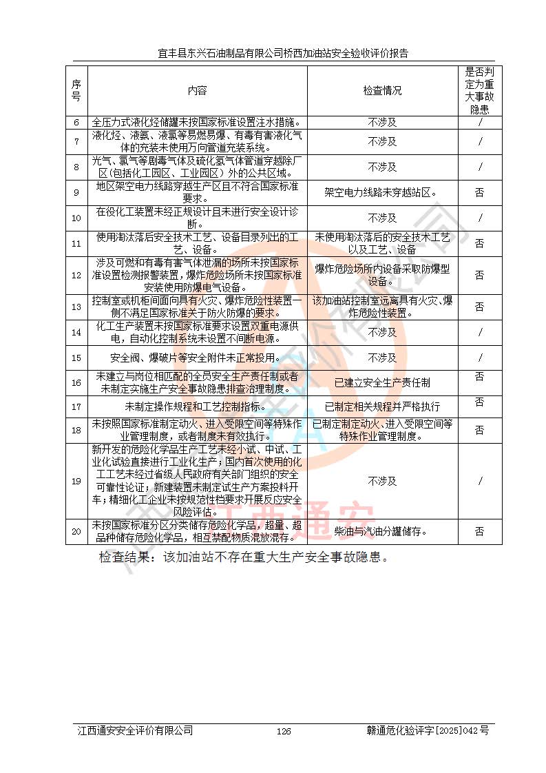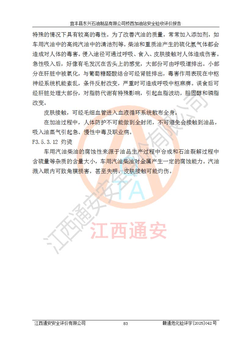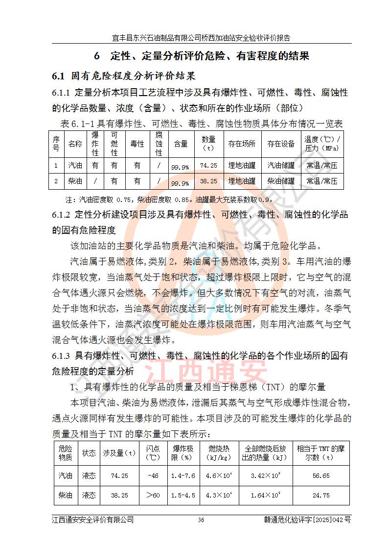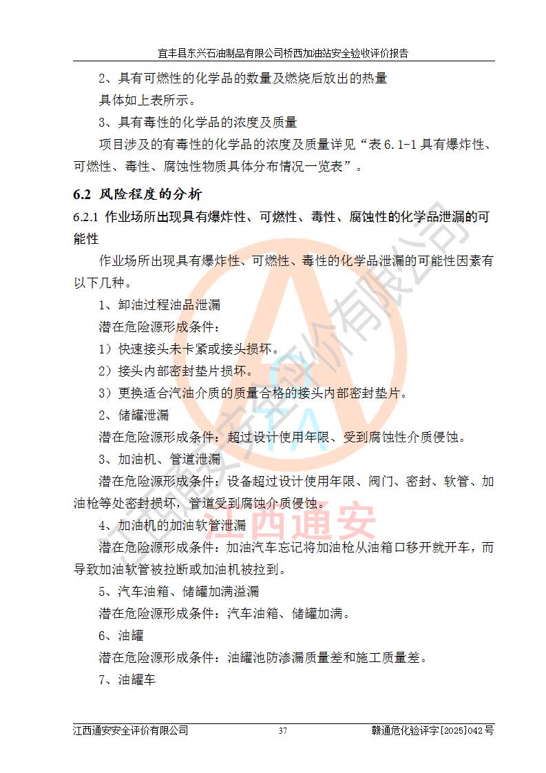 其它 | 一、安全狀況綜合評述 宜豐縣東興石油制品有限公司橋西加油站位于宜春市宜豐縣橋西鄉(xiāng),從事成品油(汽油、柴油)零售業(yè)務,屬二級加油站。 通過對該加油站建設(shè)項目安全驗收評價,得出以下評價結(jié)論: 化學品、設(shè)備及工藝辨識結(jié)果 經(jīng)辨識,該加油站經(jīng)營、儲存危險化學品為汽油和柴油,其中汽油屬于重點監(jiān)管危險化學品、特別管控危險化學品;該加油站不涉及劇毒化學品、高毒物品、易制毒化學品、監(jiān)控化學品、易制爆化學品。經(jīng)營、儲存過程中采用的設(shè)備及工藝不屬于淘汰落后設(shè)備及工藝、不涉及危險化工工藝,生產(chǎn)和儲存單元均不構(gòu)成危險化學品重大危險源。 建設(shè)項目所在地的安全條件和周邊的安全間距 該站東南側(cè)臨354國道,北側(cè)、西側(cè)、東側(cè)為居民建筑,加油站為二級加油站,設(shè)有油氣回收系統(tǒng),站外50米范圍內(nèi)無重要公共建筑物、明火設(shè)備和甲、乙類生產(chǎn)及儲存設(shè)施,站區(qū)內(nèi)加油設(shè)施與周邊建構(gòu)筑物之間的距離能夠滿足《汽車加油加氣加氫站技術(shù)標準》GB50156-2021 和《建筑設(shè)計防火規(guī)范》GB50016-2014(2018 年版)以及相關(guān)**規(guī)范要求。本報告認為該加油站建設(shè)項目周邊對加油站的影響以及建設(shè)項目所在地的自然條件對建設(shè)項目投入使用后的影響均較小,該加油站具備標準規(guī)范所要求的安全條件。 該項目安全設(shè)計診斷報告的采納情況 該加油站安全設(shè)計診斷報告核查的問題(共15項)及整改建議均已采納,經(jīng)評價組現(xiàn)場復核,均已整改完成。 該項目調(diào)試中表現(xiàn)出的技術(shù)、工藝和裝置、設(shè)備(設(shè)施)的安全、 可靠性和安全水平。 該加油站整改過程工作進展順利,處于正常狀態(tài)。經(jīng)查閱資料和分析評價,認為本項目技術(shù)、工藝和裝置、設(shè)備(設(shè)施)的安全、可靠性和安全水平符合**相應安全標準的要求。 該加油站儲存經(jīng)營的汽油屬于重點監(jiān)管的危險化學品和特別管控危險化學品,該加油站在后續(xù)的經(jīng)營中應按照相關(guān)規(guī)范和要求加強安全管理,要求油品運輸單位強化運輸管理、自身加強儲存定制化管理。 該加油站經(jīng)營過程中存在的危險有害因素為:①火災、爆炸;② 中毒和窒息;③**傷害;④觸電;⑤高處墜落;⑥物體打擊、⑦其他傷害。 其中火災、爆炸是主要的危險、有害因素,加油站埋地儲罐區(qū)、加油區(qū)、卸 油區(qū)是主要的危險源。 (7)經(jīng)采用作業(yè)條件危險性評價法(LEC)進行分析,該加油站的作業(yè)條件相對比較安全。在選定的加油作業(yè)、卸油作業(yè)、維修作業(yè)、配電作業(yè)等4個單元中均為“一般危險、需要注意”作業(yè)環(huán)境,且一般危險作業(yè)環(huán)境的出現(xiàn)均由物料的危險程度所決定,作業(yè)條件相對安全。 (8)采用危險度評價法分析,油罐區(qū)主要危險物質(zhì)為汽油和柴油,常溫、常壓下儲存。儲罐區(qū)汽油罐為Ⅰ級,屬**危險;柴油罐得分為為Ⅲ級,屬低度危險。油罐采用雙層罐埋地設(shè)置,按要求設(shè)置了通氣管,并裝設(shè)了阻火器;設(shè)置了液位監(jiān)測報警系統(tǒng)和緊急切斷系統(tǒng),埋地加油管道設(shè)置雙層管道,其安全風險可控。 (9)采用檢查表評價法對該加油站站址選擇、總平面布置、加油工藝及設(shè)施、消防設(shè)施和給排水、電氣與報警和緊急切斷系統(tǒng)等進行檢查分析,經(jīng)整改后,該加油站涉及的強制條款和其他項均符合要求。該加油站設(shè)置了消防安全設(shè)施、防雷防靜電設(shè)施、液位監(jiān)測措施、油罐泄漏檢測措施、電氣防爆措施等安全防護設(shè)施,取得了消防驗收意見書和防雷檢測合格報告,符合**法律法規(guī)、標準規(guī)范的要求。該加油站公用工程能夠滿足安全經(jīng)營的基本需要,符合安全經(jīng)營的條件。 (10)該加油站相關(guān)證照齊全,成立了安全生產(chǎn)**小組,配備了安全管理人員,制定了安全管理制度、操作規(guī)程和事故應急預案,加油站的安全管理機構(gòu)工作有力,加油站安全經(jīng)營管理處于正常有序開展范圍。 (11)對宜豐縣東興石油制品有限公司橋西加油站存在重大生產(chǎn)安全事故隱患進行判定,檢查結(jié)果為該加油站不存在重大生產(chǎn)安全事故隱患。 總體評價結(jié)論:宜豐縣東興石油制品有限公司橋西加油站認真落實并合理采納安全設(shè)計診斷報告中的安全對策、措施及建議,現(xiàn)場與安全設(shè)施設(shè)計單位重新繪制的現(xiàn)狀總平面布置圖一致,安全設(shè)計診斷報告提出的安全對策措施已落實到位。對潛在的危險、 有害因素采取了安全對策措施,工程潛在的危險、有害因素可得到**控制, 風險在**控制和可接受范圍內(nèi)。