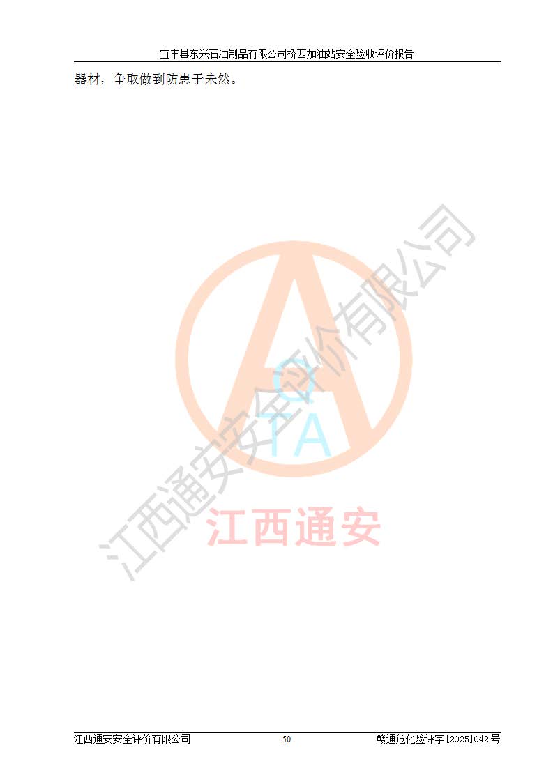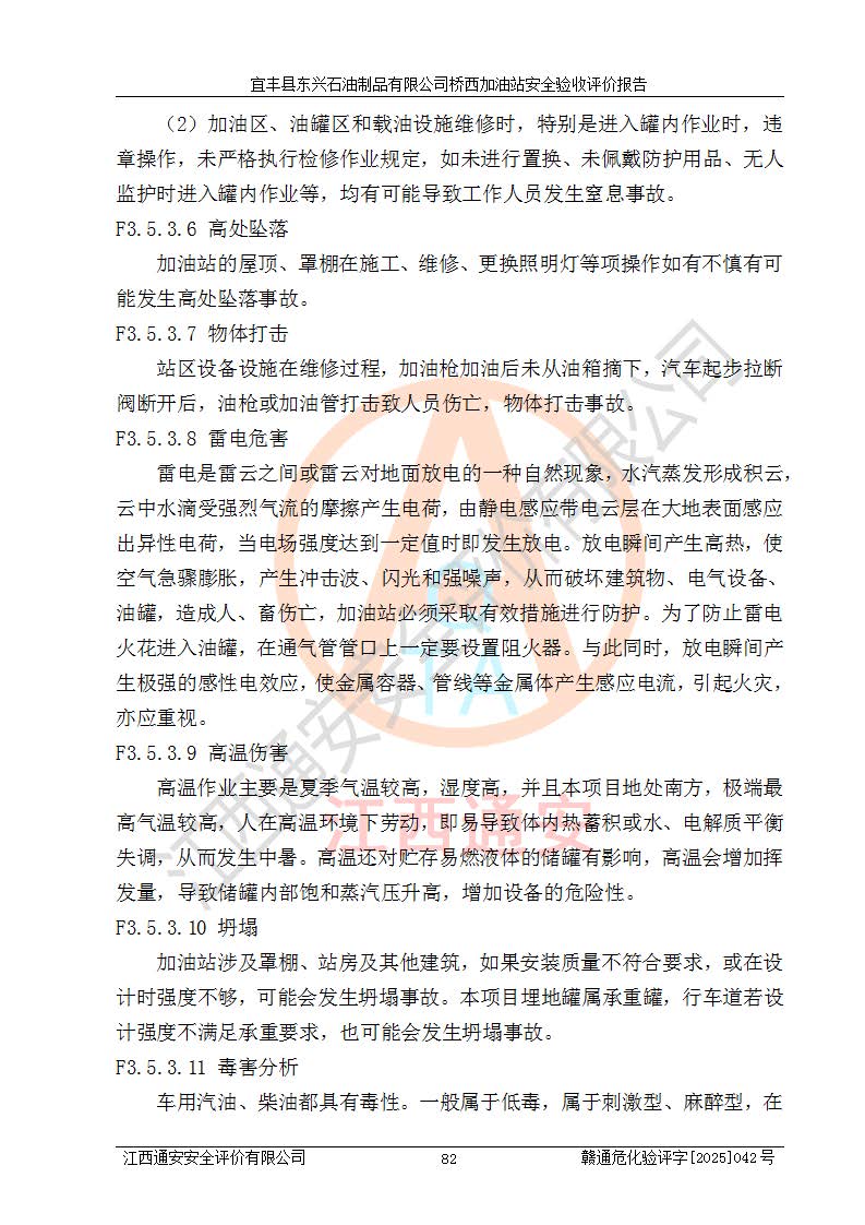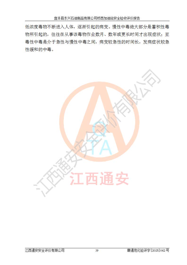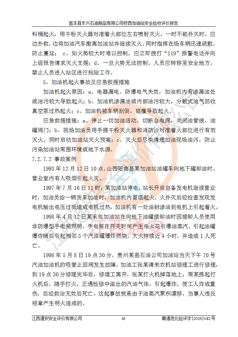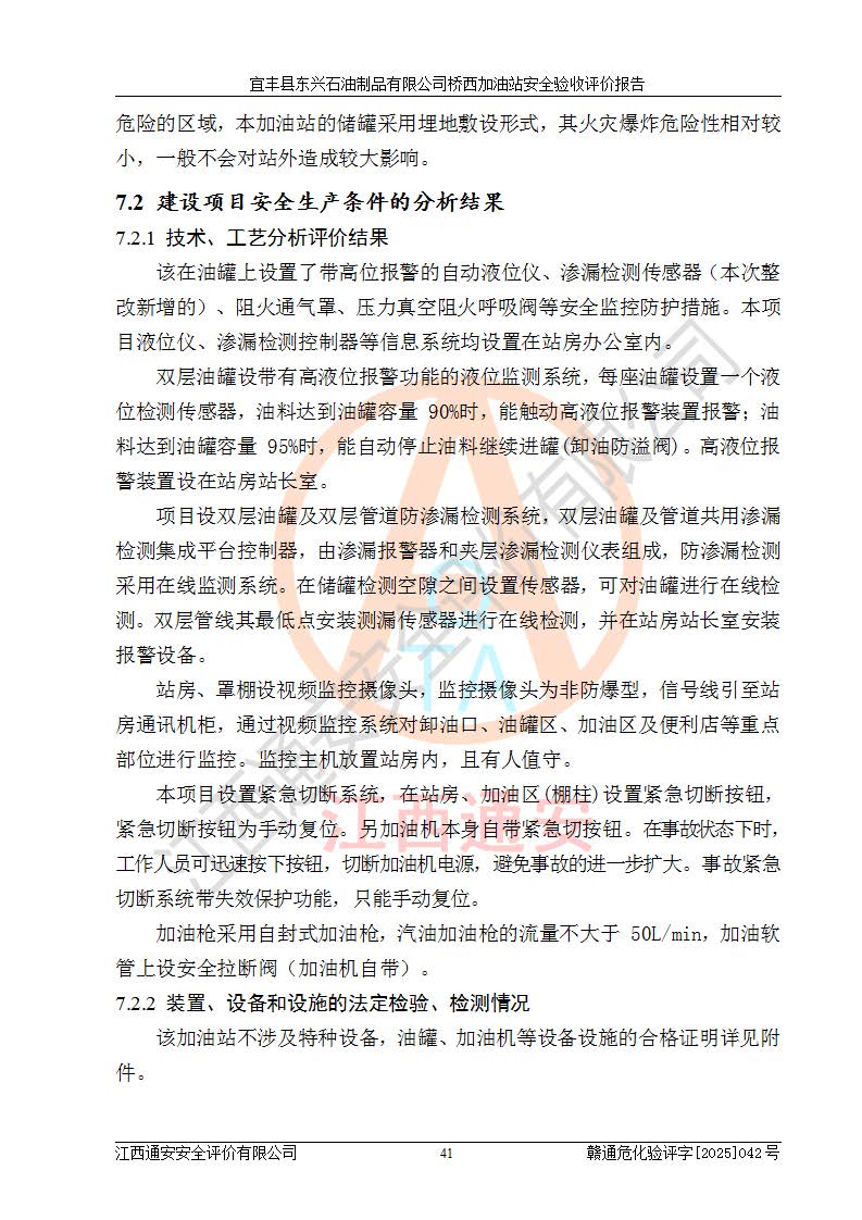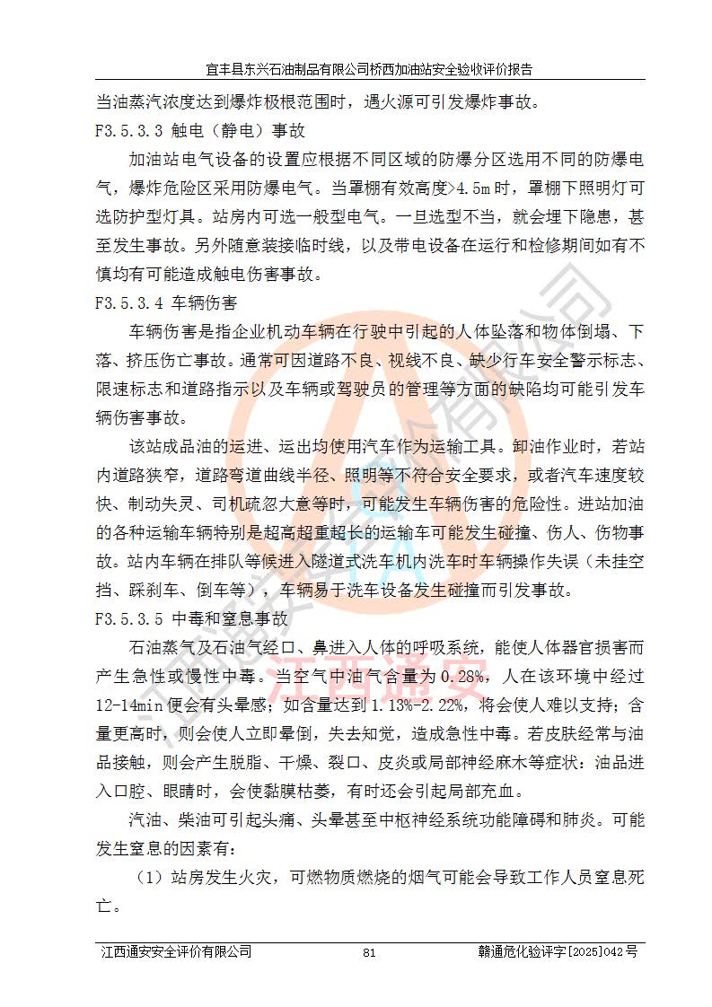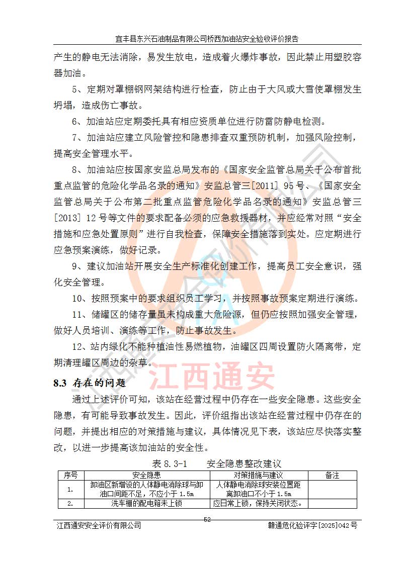 其它 | 一、安全狀況綜合評述 宜豐縣東興石油制品有限公司橋西加油站位于宜春市宜豐縣橋西鄉(xiāng),從事成品油(汽油、柴油)零售業(yè)務,屬二級加油站。 通過對該加油站建設(shè)項目安全驗收評價,得出以下評價結(jié)論: 化學品、設(shè)備及工藝辨識結(jié)果 經(jīng)辨識,該加油站經(jīng)營、儲存危險化學品為汽油和柴油,其中汽油屬于重點監(jiān)管危險化學品、特別管控危險化學品;該加油站不涉及劇毒化學品、高毒物品、易制毒化學品、監(jiān)控化學品、易制爆化學品。經(jīng)營、儲存過程中采用的設(shè)備及工藝不屬于淘汰落后設(shè)備及工藝、不涉及危險化工工藝,生產(chǎn)和儲存單元均不構(gòu)成危險化學品重大危險源。 建設(shè)項目所在地的安全條件和周邊的安全間距 該站東南側(cè)臨354國道,北側(cè)、西側(cè)、東側(cè)為居民建筑,加油站為二級加油站,設(shè)有油氣回收系統(tǒng),站外50米范圍內(nèi)無重要公共建筑物、明火設(shè)備和甲、乙類生產(chǎn)及儲存設(shè)施,站區(qū)內(nèi)加油設(shè)施與周邊建構(gòu)筑物之間的距離能夠滿足《汽車加油加氣加氫站技術(shù)標準》GB50156-2021 和《建筑設(shè)計防火規(guī)范》GB50016-2014(2018 年版)以及相關(guān)**規(guī)范要求。本報告認為該加油站建設(shè)項目周邊對加油站的影響以及建設(shè)項目所在地的自然條件對建設(shè)項目投入使用后的影響均較小,該加油站具備標準規(guī)范所要求的安全條件。 該項目安全設(shè)計診斷報告的采納情況 該加油站安全設(shè)計診斷報告核查的問題(共15項)及整改建議均已采納,經(jīng)評價組現(xiàn)場復核,均已整改完成。 該項目調(diào)試中表現(xiàn)出的技術(shù)、工藝和裝置、設(shè)備(設(shè)施)的安全、 可靠性和安全水平。 該加油站整改過程工作進展順利,處于正常狀態(tài)。經(jīng)查閱資料和分析評價,認為本項目技術(shù)、工藝和裝置、設(shè)備(設(shè)施)的安全、可靠性和安全水平符合**相應安全標準的要求。 該加油站儲存經(jīng)營的汽油屬于重點監(jiān)管的危險化學品和特別管控危險化學品,該加油站在后續(xù)的經(jīng)營中應按照相關(guān)規(guī)范和要求加強安全管理,要求油品運輸單位強化運輸管理、自身加強儲存定制化管理。 該加油站經(jīng)營過程中存在的危險有害因素為:①火災、爆炸;② 中毒和窒息;③**傷害;④觸電;⑤高處墜落;⑥物體打擊、⑦其他傷害。 其中火災、爆炸是主要的危險、有害因素,加油站埋地儲罐區(qū)、加油區(qū)、卸 油區(qū)是主要的危險源。 (7)經(jīng)采用作業(yè)條件危險性評價法(LEC)進行分析,該加油站的作業(yè)條件相對比較安全。在選定的加油作業(yè)、卸油作業(yè)、維修作業(yè)、配電作業(yè)等4個單元中均為“一般危險、需要注意”作業(yè)環(huán)境,且一般危險作業(yè)環(huán)境的出現(xiàn)均由物料的危險程度所決定,作業(yè)條件相對安全。 (8)采用危險度評價法分析,油罐區(qū)主要危險物質(zhì)為汽油和柴油,常溫、常壓下儲存。儲罐區(qū)汽油罐為Ⅰ級,屬**危險;柴油罐得分為為Ⅲ級,屬低度危險。油罐采用雙層罐埋地設(shè)置,按要求設(shè)置了通氣管,并裝設(shè)了阻火器;設(shè)置了液位監(jiān)測報警系統(tǒng)和緊急切斷系統(tǒng),埋地加油管道設(shè)置雙層管道,其安全風險可控。 (9)采用檢查表評價法對該加油站站址選擇、總平面布置、加油工藝及設(shè)施、消防設(shè)施和給排水、電氣與報警和緊急切斷系統(tǒng)等進行檢查分析,經(jīng)整改后,該加油站涉及的強制條款和其他項均符合要求。該加油站設(shè)置了消防安全設(shè)施、防雷防靜電設(shè)施、液位監(jiān)測措施、油罐泄漏檢測措施、電氣防爆措施等安全防護設(shè)施,取得了消防驗收意見書和防雷檢測合格報告,符合**法律法規(guī)、標準規(guī)范的要求。該加油站公用工程能夠滿足安全經(jīng)營的基本需要,符合安全經(jīng)營的條件。 (10)該加油站相關(guān)證照齊全,成立了安全生產(chǎn)**小組,配備了安全管理人員,制定了安全管理制度、操作規(guī)程和事故應急預案,加油站的安全管理機構(gòu)工作有力,加油站安全經(jīng)營管理處于正常有序開展范圍。 (11)對宜豐縣東興石油制品有限公司橋西加油站存在重大生產(chǎn)安全事故隱患進行判定,檢查結(jié)果為該加油站不存在重大生產(chǎn)安全事故隱患。 總體評價結(jié)論:宜豐縣東興石油制品有限公司橋西加油站認真落實并合理采納安全設(shè)計診斷報告中的安全對策、措施及建議,現(xiàn)場與安全設(shè)施設(shè)計單位重新繪制的現(xiàn)狀總平面布置圖一致,安全設(shè)計診斷報告提出的安全對策措施已落實到位。對潛在的危險、 有害因素采取了安全對策措施,工程潛在的危險、有害因素可得到**控制, 風險在**控制和可接受范圍內(nèi)。