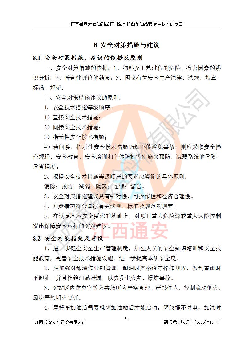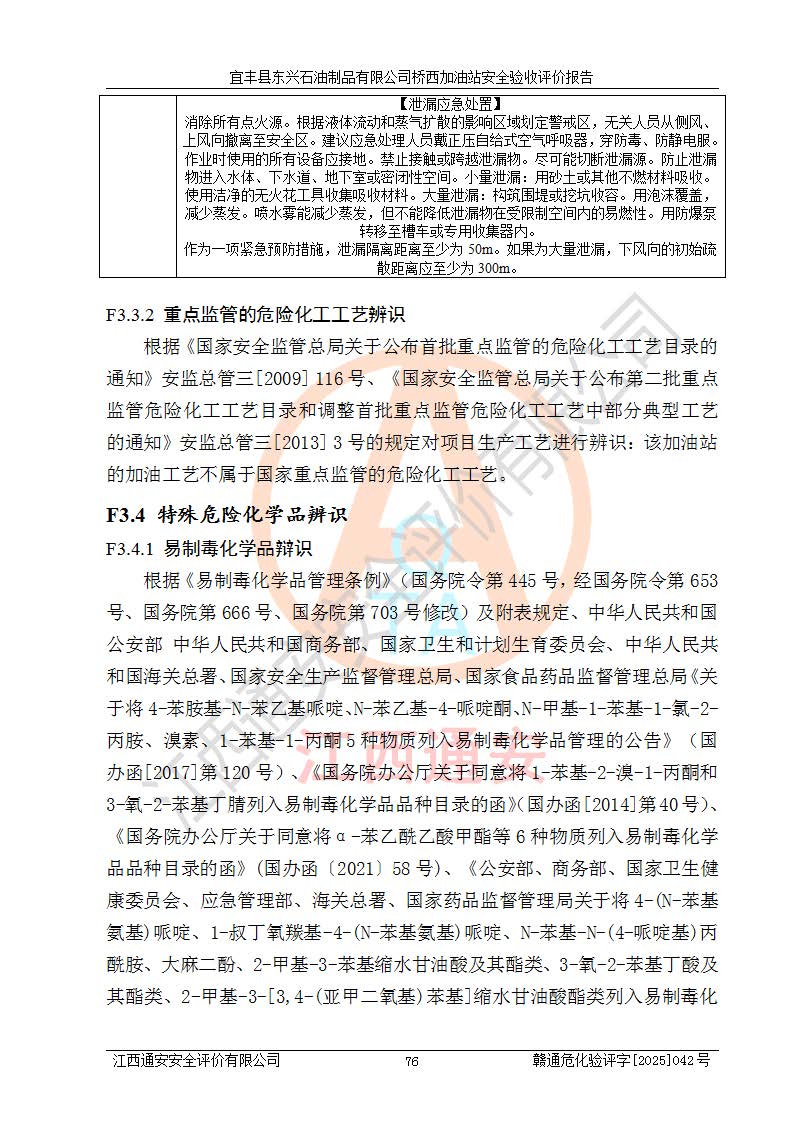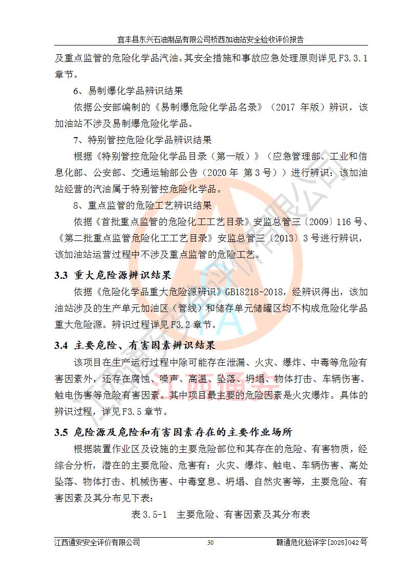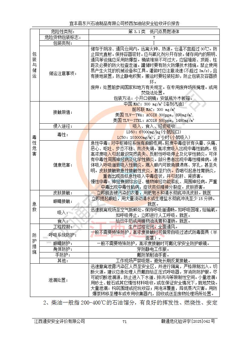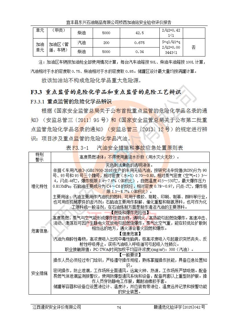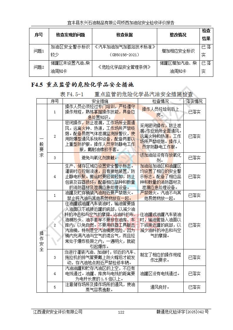 其它 | 一、安全狀況綜合評述 宜豐縣東興石油制品有限公司橋西加油站位于宜春市宜豐縣橋西鄉(xiāng),從事成品油(汽油、柴油)零售業(yè)務,屬二級加油站。 通過對該加油站建設(shè)項目安全驗收評價,得出以下評價結(jié)論: 化學品、設(shè)備及工藝辨識結(jié)果 經(jīng)辨識,該加油站經(jīng)營、儲存危險化學品為汽油和柴油,其中汽油屬于重點監(jiān)管危險化學品、特別管控危險化學品;該加油站不涉及劇毒化學品、高毒物品、易制毒化學品、監(jiān)控化學品、易制爆化學品。經(jīng)營、儲存過程中采用的設(shè)備及工藝不屬于淘汰落后設(shè)備及工藝、不涉及危險化工工藝,生產(chǎn)和儲存單元均不構(gòu)成危險化學品重大危險源。 建設(shè)項目所在地的安全條件和周邊的安全間距 該站東南側(cè)臨354國道,北側(cè)、西側(cè)、東側(cè)為居民建筑,加油站為二級加油站,設(shè)有油氣回收系統(tǒng),站外50米范圍內(nèi)無重要公共建筑物、明火設(shè)備和甲、乙類生產(chǎn)及儲存設(shè)施,站區(qū)內(nèi)加油設(shè)施與周邊建構(gòu)筑物之間的距離能夠滿足《汽車加油加氣加氫站技術(shù)標準》GB50156-2021 和《建筑設(shè)計防火規(guī)范》GB50016-2014(2018 年版)以及相關(guān)**規(guī)范要求。本報告認為該加油站建設(shè)項目周邊對加油站的影響以及建設(shè)項目所在地的自然條件對建設(shè)項目投入使用后的影響均較小,該加油站具備標準規(guī)范所要求的安全條件。 該項目安全設(shè)計診斷報告的采納情況 該加油站安全設(shè)計診斷報告核查的問題(共15項)及整改建議均已采納,經(jīng)評價組現(xiàn)場復核,均已整改完成。 該項目調(diào)試中表現(xiàn)出的技術(shù)、工藝和裝置、設(shè)備(設(shè)施)的安全、 可靠性和安全水平。 該加油站整改過程工作進展順利,處于正常狀態(tài)。經(jīng)查閱資料和分析評價,認為本項目技術(shù)、工藝和裝置、設(shè)備(設(shè)施)的安全、可靠性和安全水平符合**相應安全標準的要求。 該加油站儲存經(jīng)營的汽油屬于重點監(jiān)管的危險化學品和特別管控危險化學品,該加油站在后續(xù)的經(jīng)營中應按照相關(guān)規(guī)范和要求加強安全管理,要求油品運輸單位強化運輸管理、自身加強儲存定制化管理。 該加油站經(jīng)營過程中存在的危險有害因素為:①火災、爆炸;② 中毒和窒息;③**傷害;④觸電;⑤高處墜落;⑥物體打擊、⑦其他傷害。 其中火災、爆炸是主要的危險、有害因素,加油站埋地儲罐區(qū)、加油區(qū)、卸 油區(qū)是主要的危險源。 (7)經(jīng)采用作業(yè)條件危險性評價法(LEC)進行分析,該加油站的作業(yè)條件相對比較安全。在選定的加油作業(yè)、卸油作業(yè)、維修作業(yè)、配電作業(yè)等4個單元中均為“一般危險、需要注意”作業(yè)環(huán)境,且一般危險作業(yè)環(huán)境的出現(xiàn)均由物料的危險程度所決定,作業(yè)條件相對安全。 (8)采用危險度評價法分析,油罐區(qū)主要危險物質(zhì)為汽油和柴油,常溫、常壓下儲存。儲罐區(qū)汽油罐為Ⅰ級,屬**危險;柴油罐得分為為Ⅲ級,屬低度危險。油罐采用雙層罐埋地設(shè)置,按要求設(shè)置了通氣管,并裝設(shè)了阻火器;設(shè)置了液位監(jiān)測報警系統(tǒng)和緊急切斷系統(tǒng),埋地加油管道設(shè)置雙層管道,其安全風險可控。 (9)采用檢查表評價法對該加油站站址選擇、總平面布置、加油工藝及設(shè)施、消防設(shè)施和給排水、電氣與報警和緊急切斷系統(tǒng)等進行檢查分析,經(jīng)整改后,該加油站涉及的強制條款和其他項均符合要求。該加油站設(shè)置了消防安全設(shè)施、防雷防靜電設(shè)施、液位監(jiān)測措施、油罐泄漏檢測措施、電氣防爆措施等安全防護設(shè)施,取得了消防驗收意見書和防雷檢測合格報告,符合**法律法規(guī)、標準規(guī)范的要求。該加油站公用工程能夠滿足安全經(jīng)營的基本需要,符合安全經(jīng)營的條件。 (10)該加油站相關(guān)證照齊全,成立了安全生產(chǎn)**小組,配備了安全管理人員,制定了安全管理制度、操作規(guī)程和事故應急預案,加油站的安全管理機構(gòu)工作有力,加油站安全經(jīng)營管理處于正常有序開展范圍。 (11)對宜豐縣東興石油制品有限公司橋西加油站存在重大生產(chǎn)安全事故隱患進行判定,檢查結(jié)果為該加油站不存在重大生產(chǎn)安全事故隱患。 總體評價結(jié)論:宜豐縣東興石油制品有限公司橋西加油站認真落實并合理采納安全設(shè)計診斷報告中的安全對策、措施及建議,現(xiàn)場與安全設(shè)施設(shè)計單位重新繪制的現(xiàn)狀總平面布置圖一致,安全設(shè)計診斷報告提出的安全對策措施已落實到位。對潛在的危險、 有害因素采取了安全對策措施,工程潛在的危險、有害因素可得到**控制, 風險在**控制和可接受范圍內(nèi)。