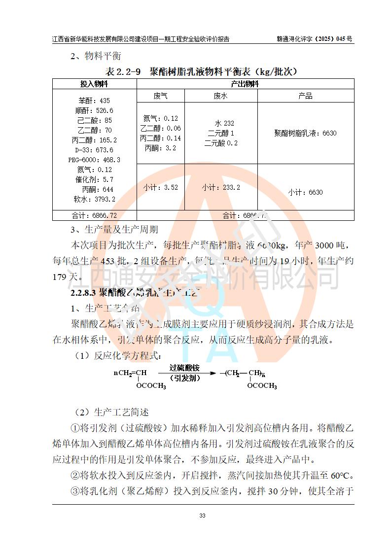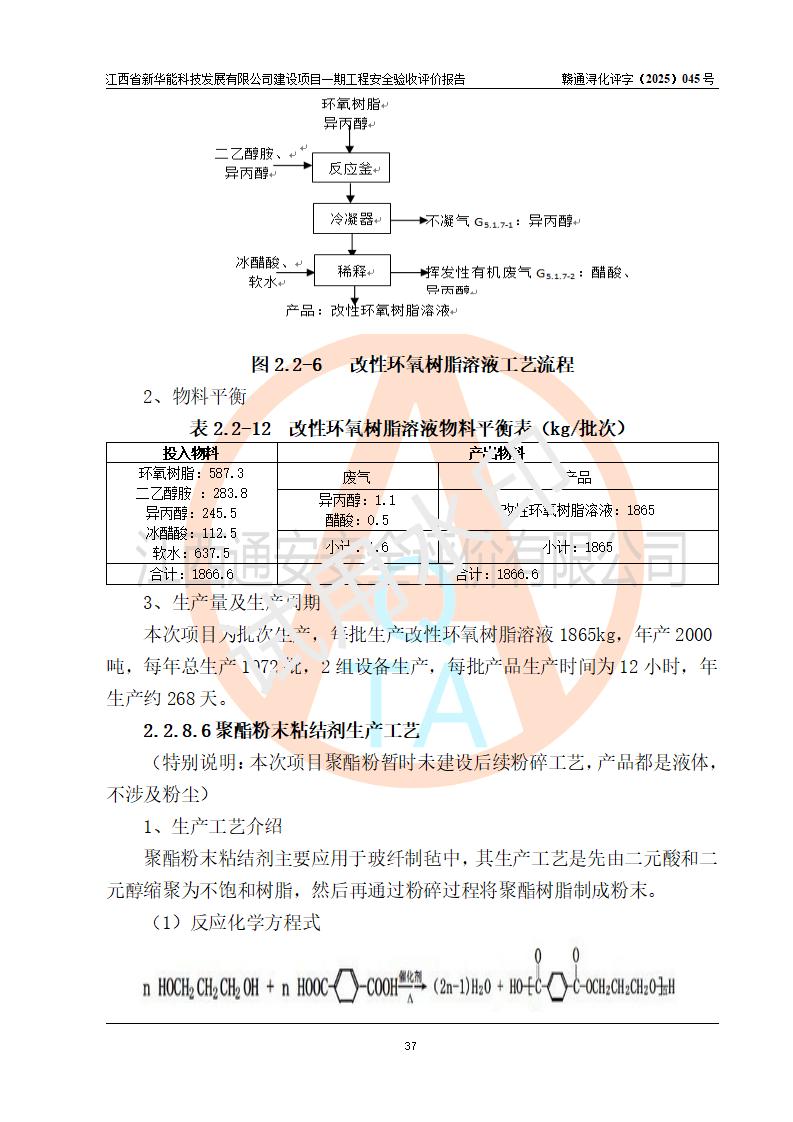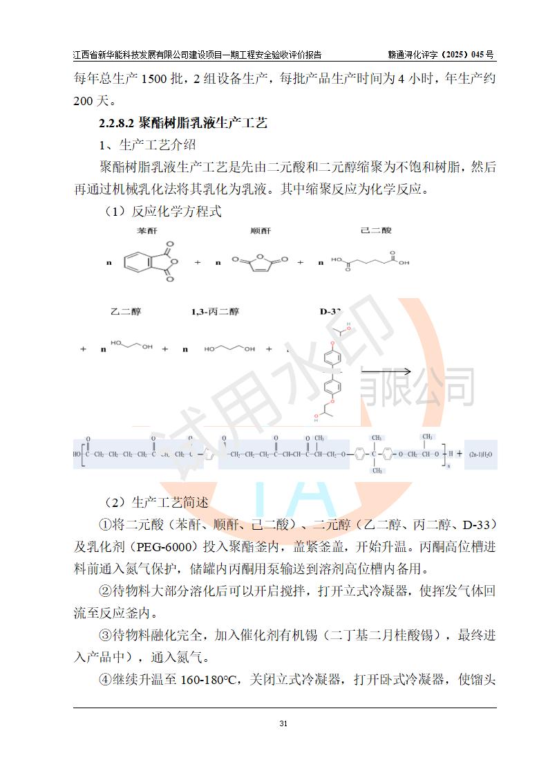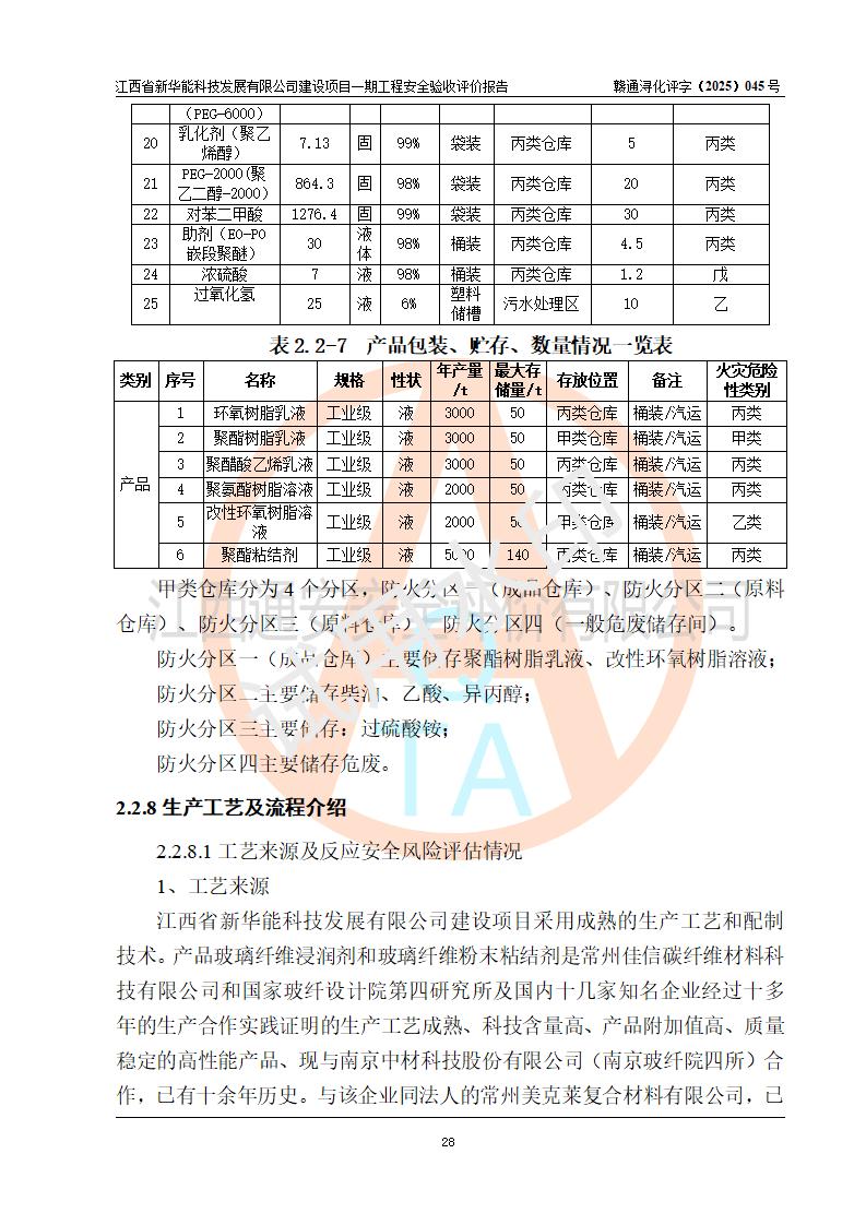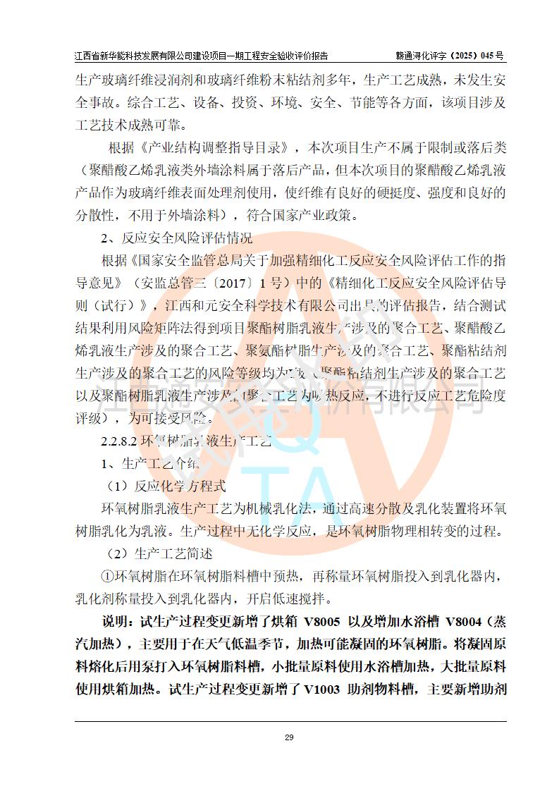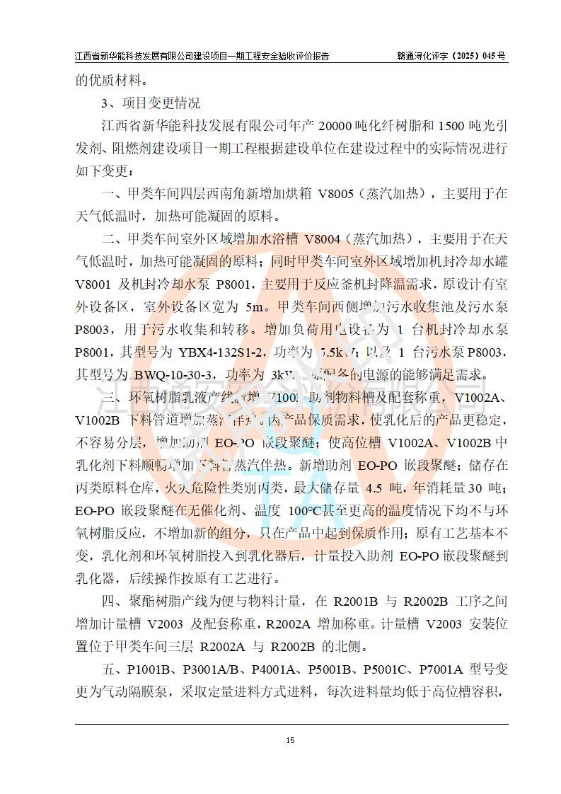 項(xiàng)目簡(jiǎn)介 | 項(xiàng)目名稱:年產(chǎn)20000噸化纖樹脂和1500噸光引發(fā)劑、阻燃劑建設(shè)項(xiàng)目一期工程(年產(chǎn)16000化纖樹脂項(xiàng)目) 年產(chǎn)16000噸化纖樹脂項(xiàng)目,包括:年產(chǎn)3000噸環(huán)氧樹脂乳液、年產(chǎn)3000噸聚酯樹脂乳液、年產(chǎn)3000噸聚醋酸乙烯乳液、年產(chǎn)1000噸聚氨酯樹脂溶液、年產(chǎn)1000噸改性環(huán)氧樹脂溶液、年產(chǎn)5000噸聚酯粉末粘結(jié)劑(一期為液體),而年產(chǎn)20000噸化纖樹脂和1500噸光引發(fā)劑、阻燃劑建設(shè)項(xiàng)目中年產(chǎn)2000噸環(huán)氧樹脂和年產(chǎn)1500噸光引發(fā)劑、阻燃劑生產(chǎn)裝置以及年產(chǎn)2000噸聚氨酯樹脂溶液兩條生產(chǎn)線中的一條生產(chǎn)線(年產(chǎn)1000噸聚氨酯樹脂溶液)、年產(chǎn)2000噸改性環(huán)氧樹脂溶液兩條生產(chǎn)線中的一條生產(chǎn)線(年產(chǎn)1000噸改性環(huán)氧樹脂溶液)生產(chǎn)裝置因市場(chǎng)等原因目前沒有建設(shè) 建設(shè)單位:江西省新華能科技發(fā)展有限公司 建設(shè)地點(diǎn):江西彭澤工業(yè)園區(qū)磯山化工園 項(xiàng)目性質(zhì):新建 總投資:4000萬(wàn)元 占地面積:21.9畝 設(shè)計(jì)單位:揚(yáng)州惠通科技股份有限公司[化工石化醫(yī)藥行業(yè)(化工工程)專業(yè)**] 房屋建設(shè)施工單位:江西裕正禾建設(shè)有限公司 房屋建設(shè)監(jiān)理單位:河南海納建設(shè)管理有限公司(工程監(jiān)理綜合資質(zhì)) 設(shè)備安裝單位:江蘇漢皇安裝集團(tuán)有限公司(資質(zhì)等級(jí):石油化工工程施工總承包貳級(jí)) 設(shè)備安裝監(jiān)理單位:同致誠(chéng)工程咨詢有限公司(工程監(jiān)理綜合資質(zhì)) 儀電安裝單位、調(diào)試單位:上海南服控制工程有限公司 | |||||