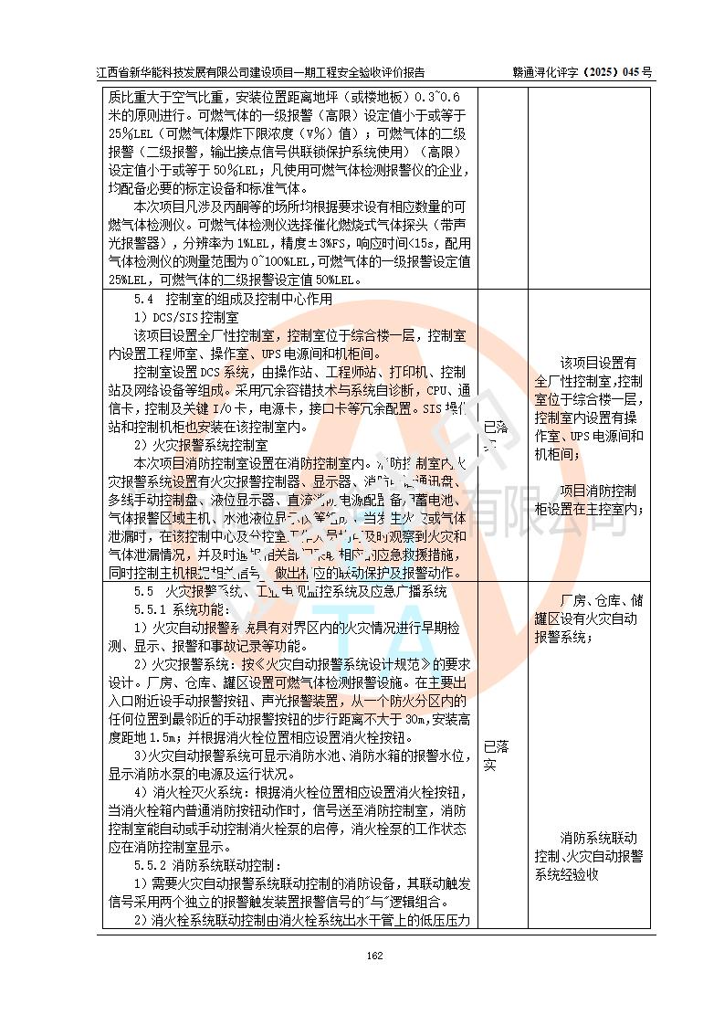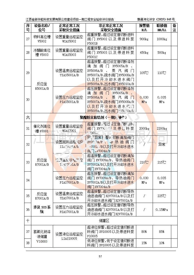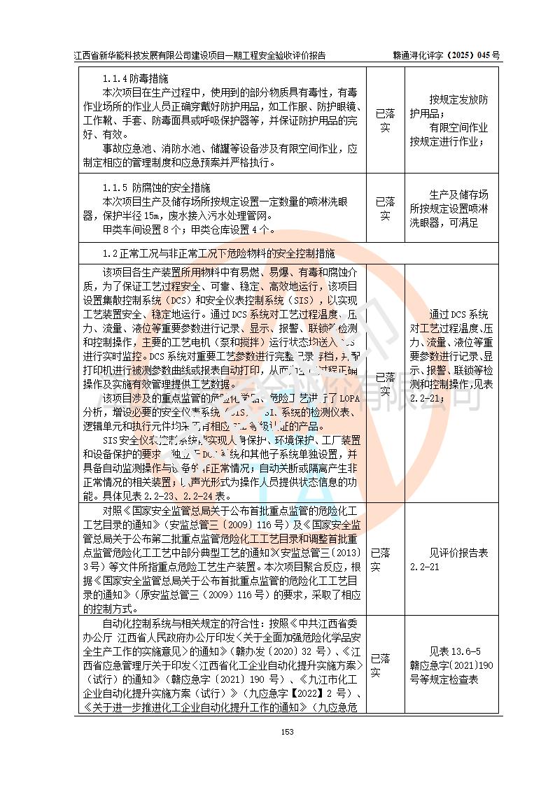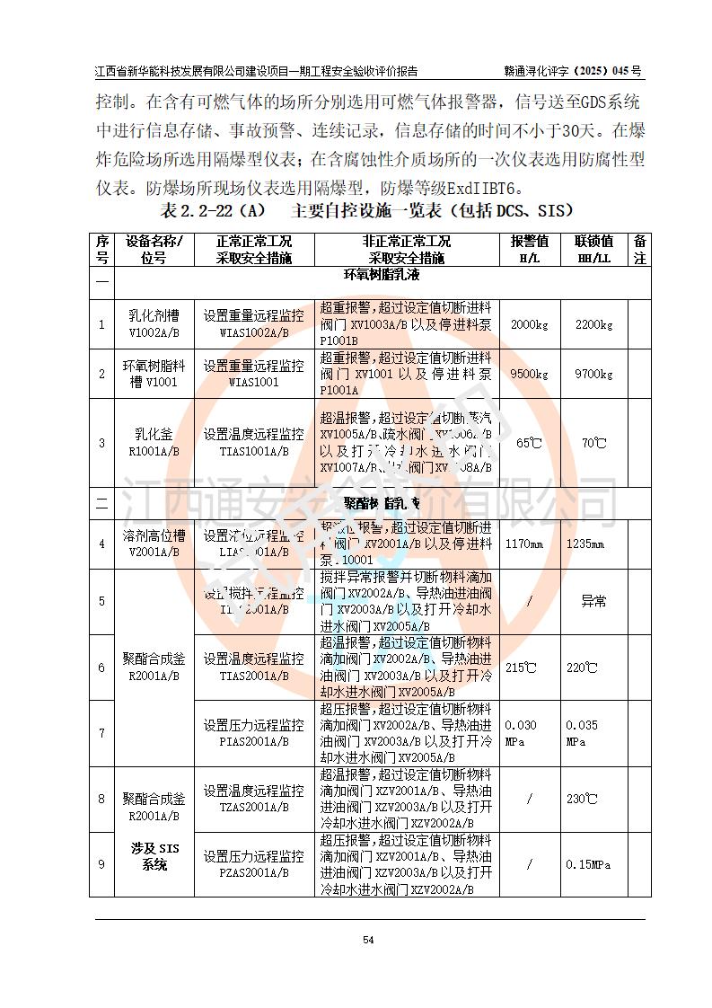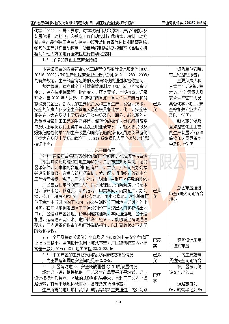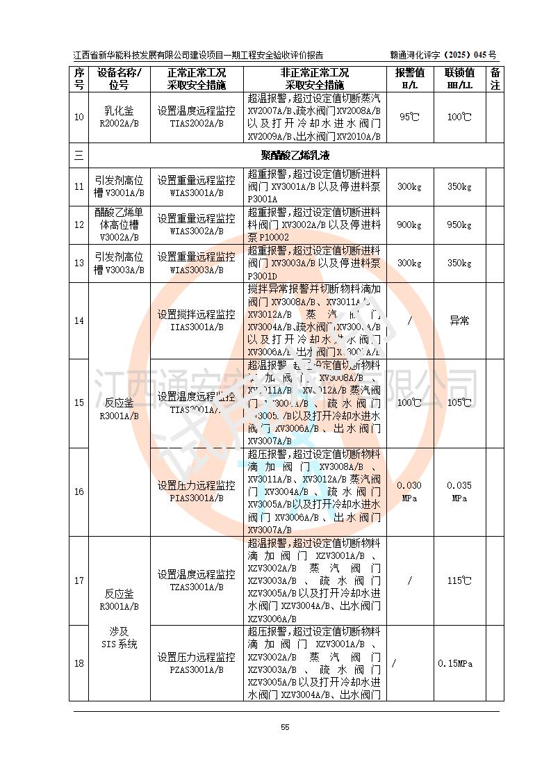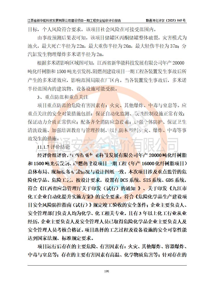 評(píng)價(jià)結(jié)論 | 經(jīng)評(píng)價(jià)組評(píng)價(jià),江西省新華能科技發(fā)展有限公司年產(chǎn)20000噸化纖樹脂和1500噸光引發(fā)劑、阻燃劑建設(shè)項(xiàng)目一期工程(年產(chǎn)16000化纖樹脂項(xiàng)目)總體布局、現(xiàn)場(chǎng)設(shè)備布置情況與設(shè)計(jì)圖紙一致,本次項(xiàng)目涉及重點(diǎn)監(jiān)管的危險(xiǎn)化學(xué)品、危險(xiǎn)工藝,按設(shè)計(jì)要求,設(shè)置有DCS系統(tǒng)、SIS系統(tǒng)、GDS系統(tǒng),符合《江西省應(yīng)急管理廳關(guān)于印發(fā)(試行)的通知 》、關(guān)于印發(fā)《九江市化工企業(yè)自動(dòng)化提升實(shí)施方案》的安全要求,符合《危險(xiǎn)化學(xué)品生產(chǎn)建設(shè)項(xiàng)目安全風(fēng)險(xiǎn)防控指南(試行)》規(guī)定竣工驗(yàn)收的安全條件;企業(yè)主要負(fù)責(zé)人、安全管理部門負(fù)責(zé)人均為化學(xué)、化工相關(guān)專業(yè),且有3年以上化工行業(yè)從業(yè)經(jīng)歷,企業(yè)主要負(fù)責(zé)人及安全管理人員已取得危險(xiǎn)化學(xué)品企業(yè)主要負(fù)責(zé)人及安全管理人員考核合格證。項(xiàng)目選擇的工藝過(guò)程及設(shè)備設(shè)施的安全可靠性能 達(dá)到**法規(guī)、標(biāo)準(zhǔn)規(guī)定要求。 項(xiàng)目運(yùn)行后存在的主要危險(xiǎn)、有害因素有:火災(zāi)、其他爆炸、容器爆炸、中毒與窒息等;存在的主要有害因素有高溫、化學(xué)物質(zhì)危害等;針對(duì)存在的危險(xiǎn)、有害因素,企業(yè)采取了**的安全技術(shù)措施及安全管理措施,符合**有關(guān)法規(guī)、標(biāo)準(zhǔn)、規(guī)范要求;項(xiàng)目風(fēng)險(xiǎn)可控,其安全生產(chǎn)條件和安全管理 方面具備竣工安全驗(yàn)收的條件。 | |||||
