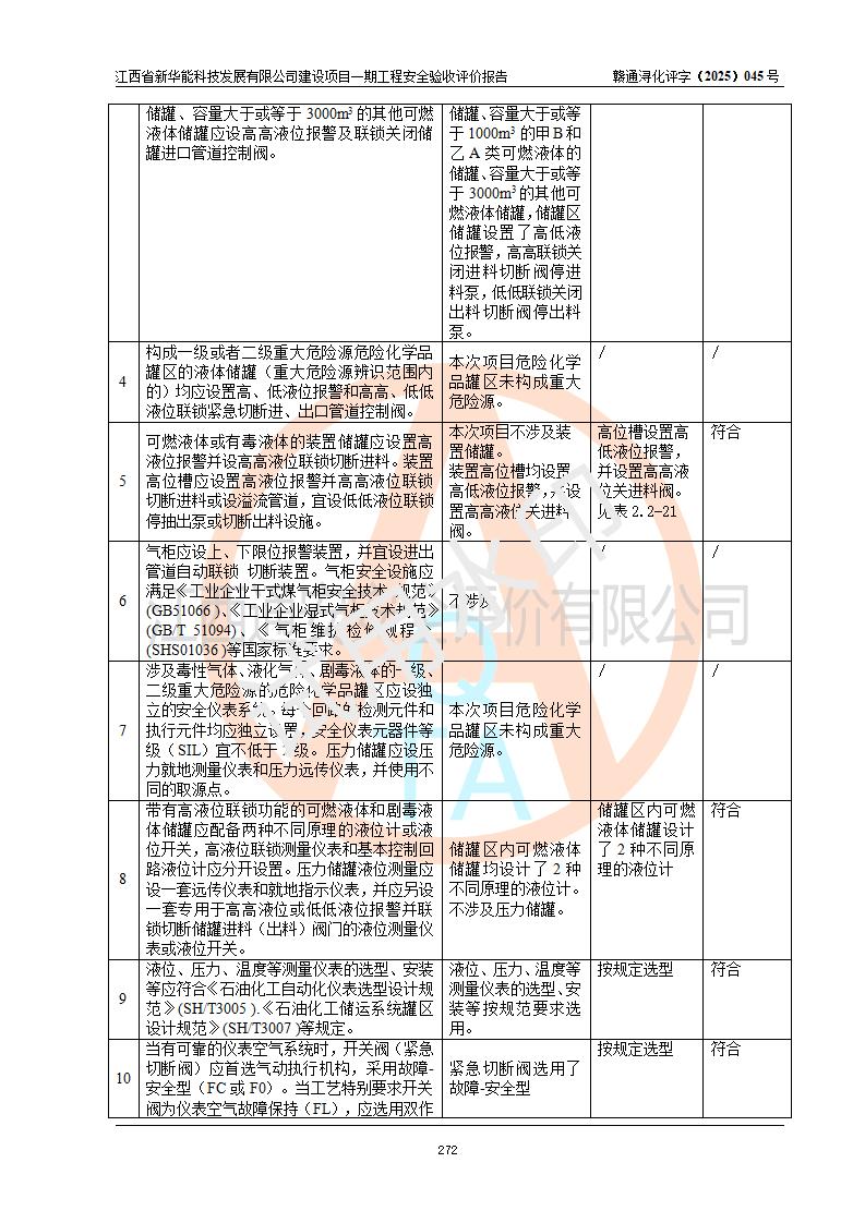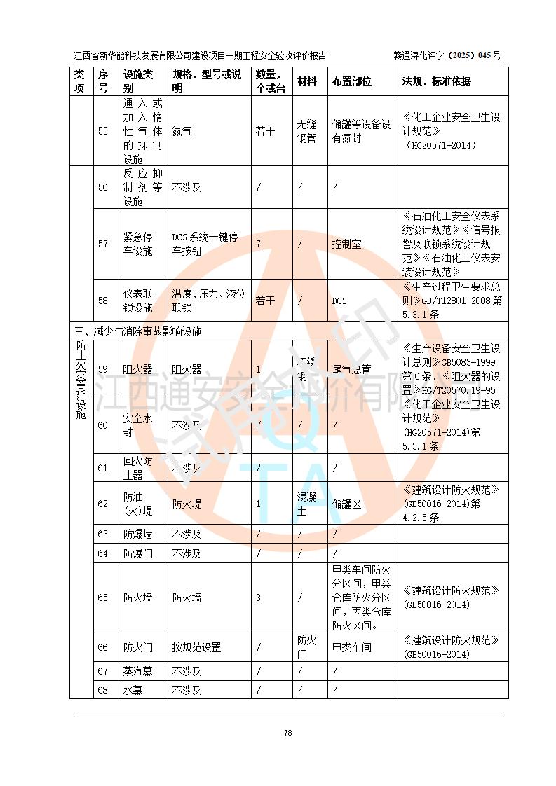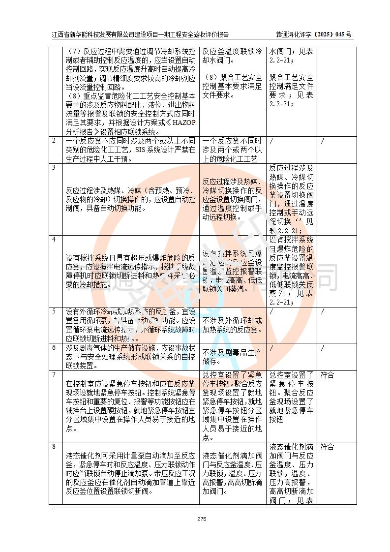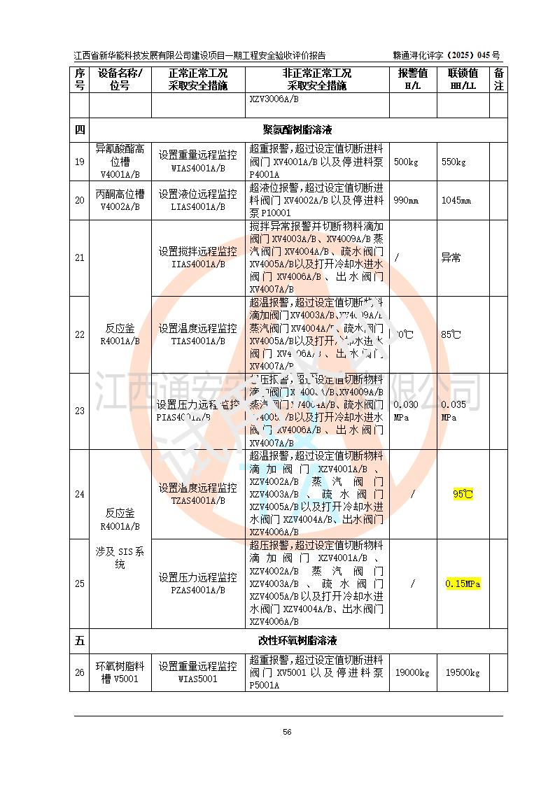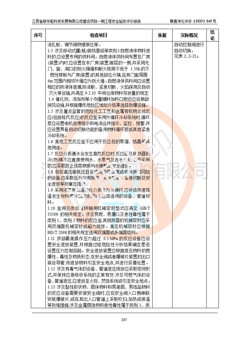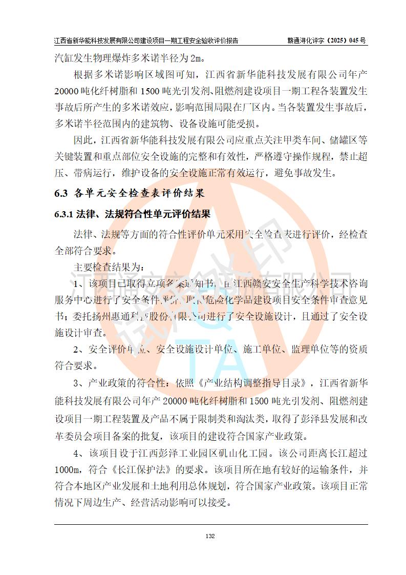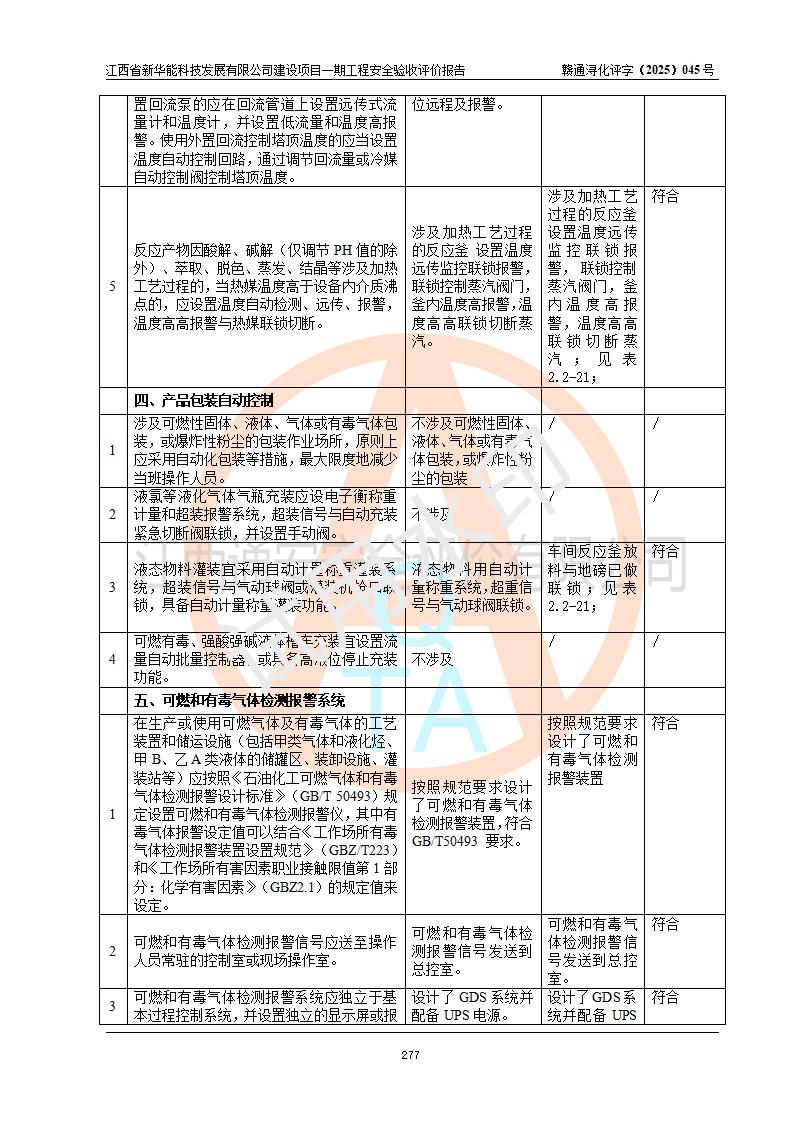 評(píng)價(jià)結(jié)論 | 經(jīng)評(píng)價(jià)組評(píng)價(jià),江西省新華能科技發(fā)展有限公司年產(chǎn)20000噸化纖樹脂和1500噸光引發(fā)劑、阻燃劑建設(shè)項(xiàng)目一期工程(年產(chǎn)16000化纖樹脂項(xiàng)目)總體布局、現(xiàn)場(chǎng)設(shè)備布置情況與設(shè)計(jì)圖紙一致,本次項(xiàng)目涉及重點(diǎn)監(jiān)管的危險(xiǎn)化學(xué)品、危險(xiǎn)工藝,按設(shè)計(jì)要求,設(shè)置有DCS系統(tǒng)、SIS系統(tǒng)、GDS系統(tǒng),符合《江西省應(yīng)急管理廳關(guān)于印發(fā)(試行)的通知 》、關(guān)于印發(fā)《九江市化工企業(yè)自動(dòng)化提升實(shí)施方案》的安全要求,符合《危險(xiǎn)化學(xué)品生產(chǎn)建設(shè)項(xiàng)目安全風(fēng)險(xiǎn)防控指南(試行)》規(guī)定竣工驗(yàn)收的安全條件;企業(yè)主要負(fù)責(zé)人、安全管理部門負(fù)責(zé)人均為化學(xué)、化工相關(guān)專業(yè),且有3年以上化工行業(yè)從業(yè)經(jīng)歷,企業(yè)主要負(fù)責(zé)人及安全管理人員已取得危險(xiǎn)化學(xué)品企業(yè)主要負(fù)責(zé)人及安全管理人員考核合格證。項(xiàng)目選擇的工藝過(guò)程及設(shè)備設(shè)施的安全可靠性能 達(dá)到**法規(guī)、標(biāo)準(zhǔn)規(guī)定要求。 項(xiàng)目運(yùn)行后存在的主要危險(xiǎn)、有害因素有:火災(zāi)、其他爆炸、容器爆炸、中毒與窒息等;存在的主要有害因素有高溫、化學(xué)物質(zhì)危害等;針對(duì)存在的危險(xiǎn)、有害因素,企業(yè)采取了**的安全技術(shù)措施及安全管理措施,符合**有關(guān)法規(guī)、標(biāo)準(zhǔn)、規(guī)范要求;項(xiàng)目風(fēng)險(xiǎn)可控,其安全生產(chǎn)條件和安全管理 方面具備竣工安全驗(yàn)收的條件。 | |||||