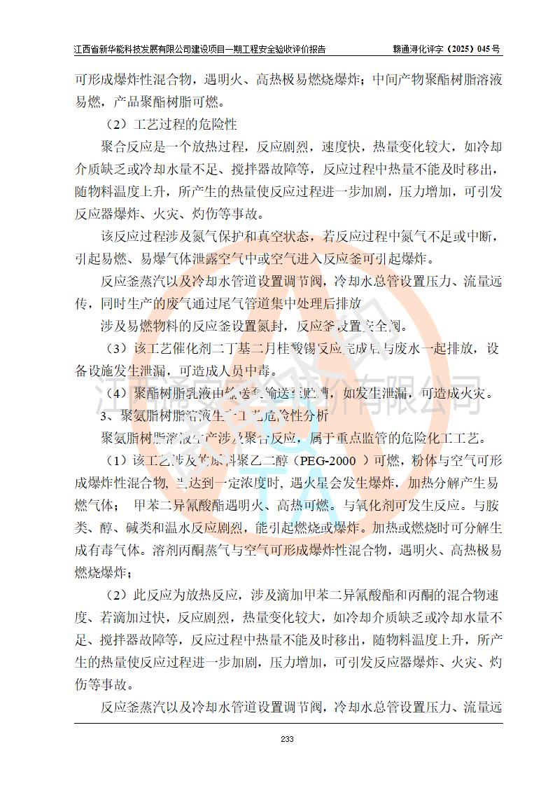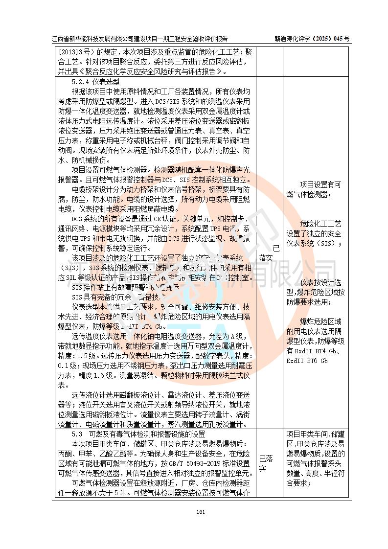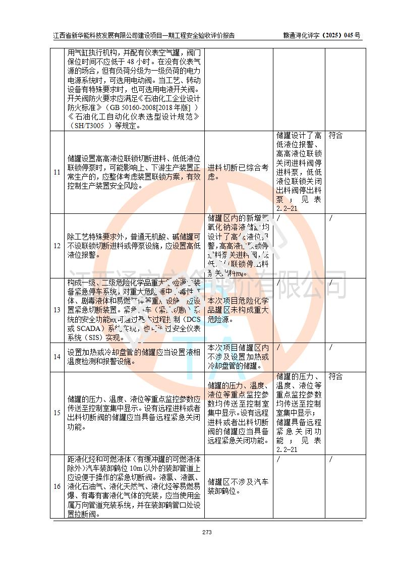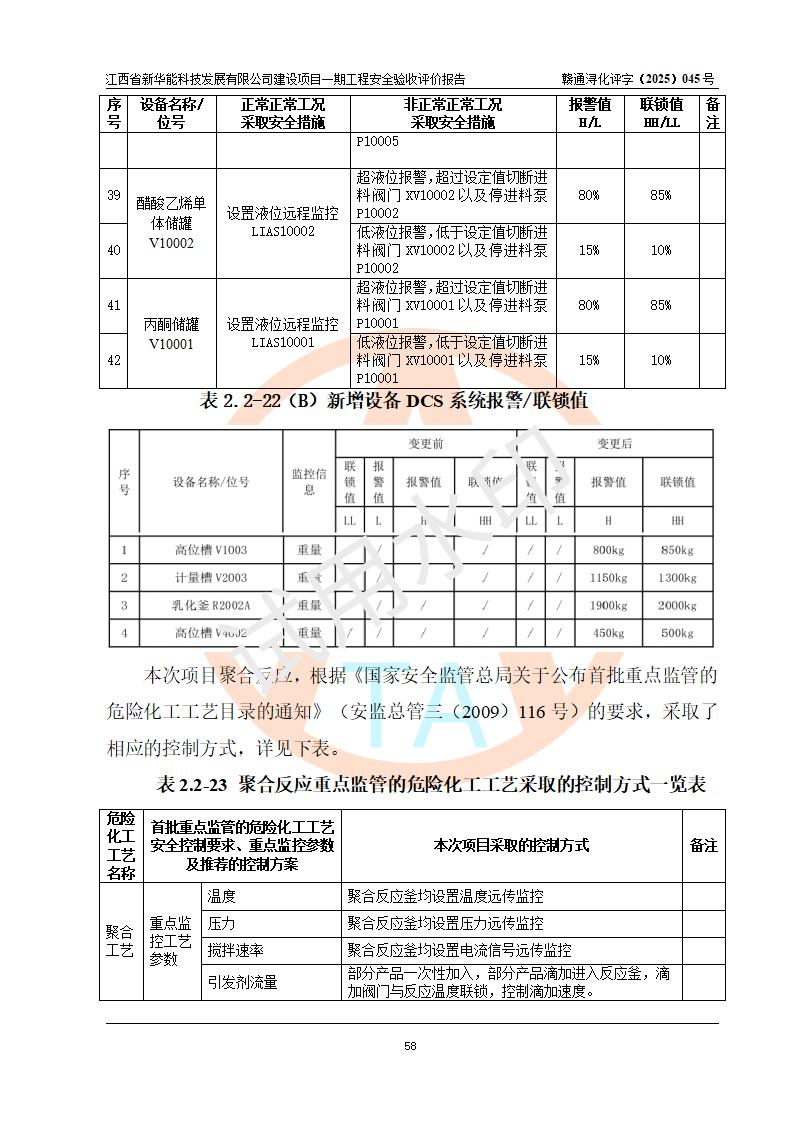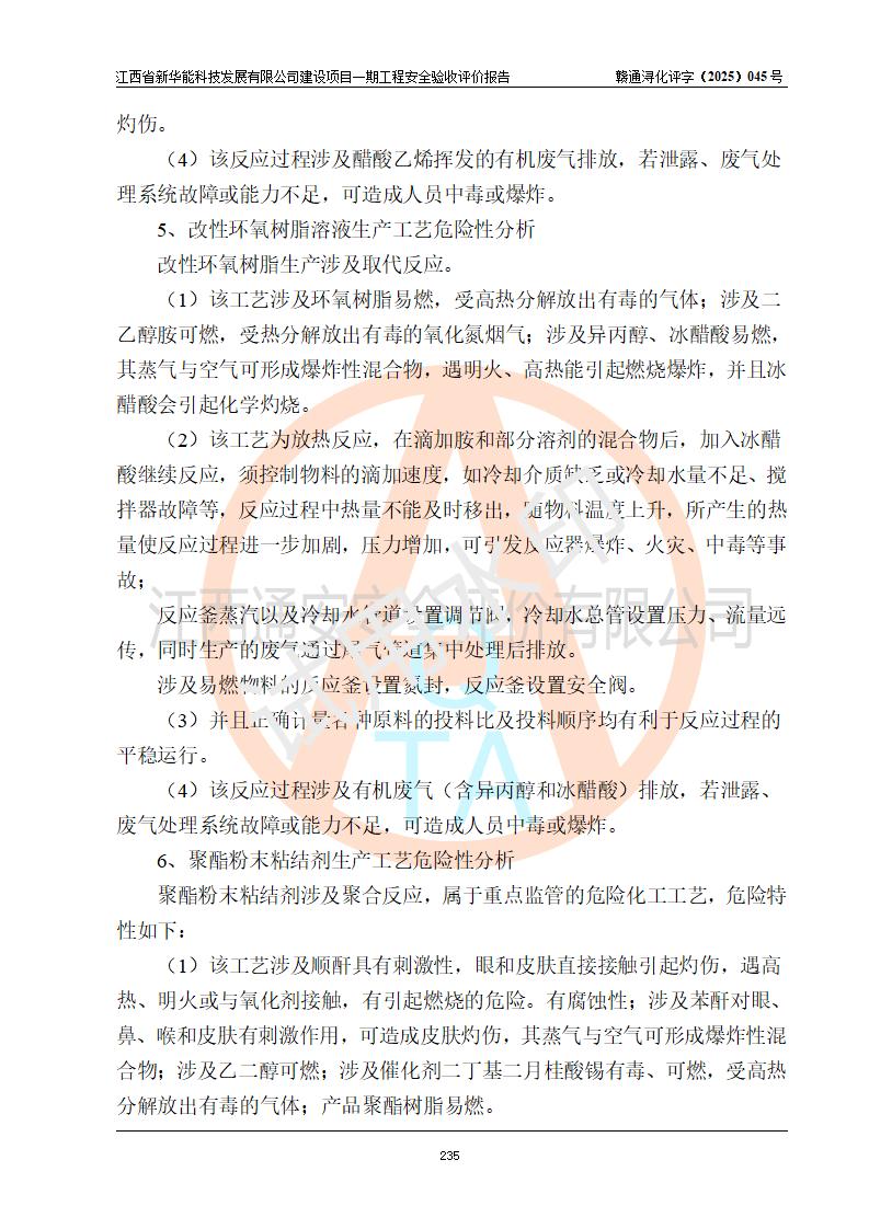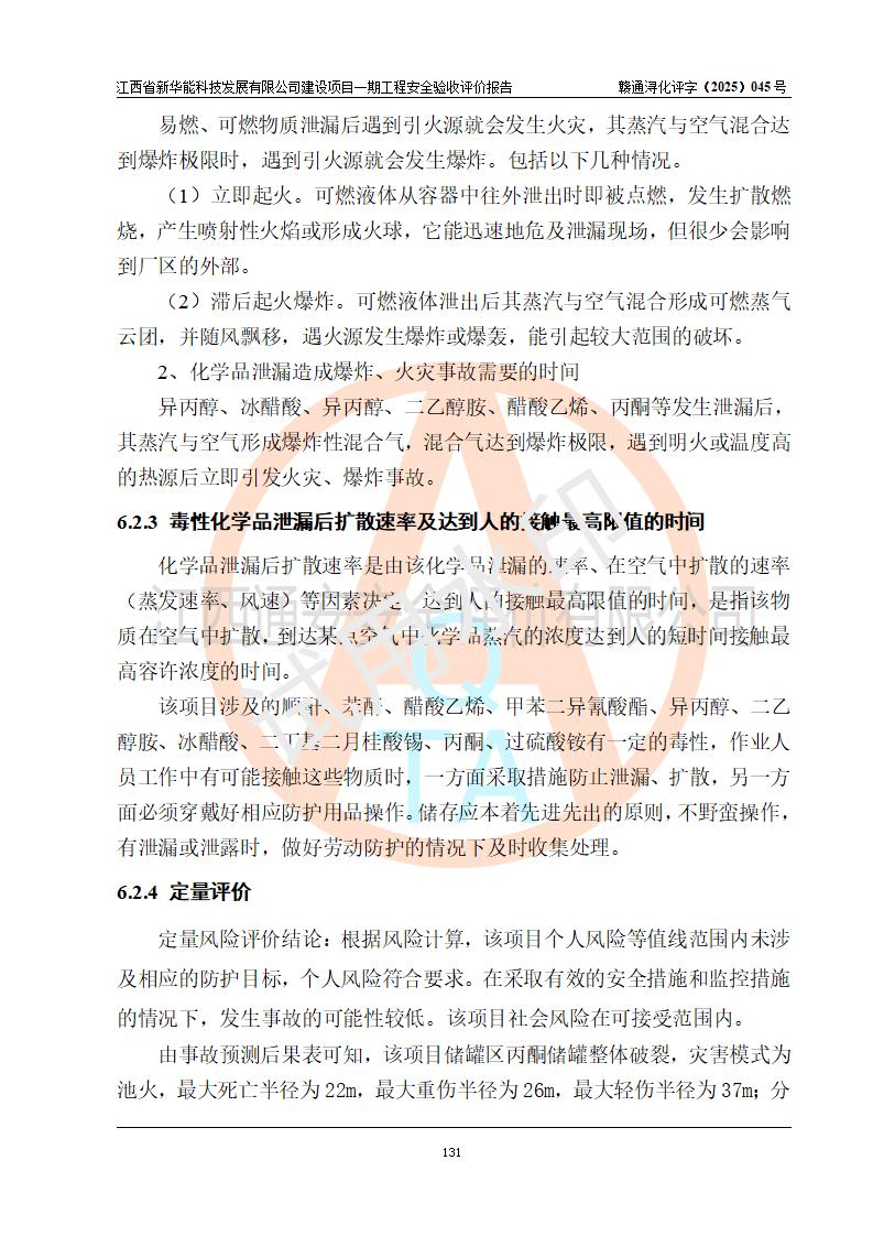 評(píng)價(jià)結(jié)論 | 經(jīng)評(píng)價(jià)組評(píng)價(jià),江西省新華能科技發(fā)展有限公司年產(chǎn)20000噸化纖樹脂和1500噸光引發(fā)劑、阻燃劑建設(shè)項(xiàng)目一期工程(年產(chǎn)16000化纖樹脂項(xiàng)目)總體布局、現(xiàn)場(chǎng)設(shè)備布置情況與設(shè)計(jì)圖紙一致,本次項(xiàng)目涉及重點(diǎn)監(jiān)管的危險(xiǎn)化學(xué)品、危險(xiǎn)工藝,按設(shè)計(jì)要求,設(shè)置有DCS系統(tǒng)、SIS系統(tǒng)、GDS系統(tǒng),符合《江西省應(yīng)急管理廳關(guān)于印發(fā)(試行)的通知 》、關(guān)于印發(fā)《九江市化工企業(yè)自動(dòng)化提升實(shí)施方案》的安全要求,符合《危險(xiǎn)化學(xué)品生產(chǎn)建設(shè)項(xiàng)目安全風(fēng)險(xiǎn)防控指南(試行)》規(guī)定竣工驗(yàn)收的安全條件;企業(yè)主要負(fù)責(zé)人、安全管理部門負(fù)責(zé)人均為化學(xué)、化工相關(guān)專業(yè),且有3年以上化工行業(yè)從業(yè)經(jīng)歷,企業(yè)主要負(fù)責(zé)人及安全管理人員已取得危險(xiǎn)化學(xué)品企業(yè)主要負(fù)責(zé)人及安全管理人員考核合格證。項(xiàng)目選擇的工藝過(guò)程及設(shè)備設(shè)施的安全可靠性能 達(dá)到**法規(guī)、標(biāo)準(zhǔn)規(guī)定要求。 項(xiàng)目運(yùn)行后存在的主要危險(xiǎn)、有害因素有:火災(zāi)、其他爆炸、容器爆炸、中毒與窒息等;存在的主要有害因素有高溫、化學(xué)物質(zhì)危害等;針對(duì)存在的危險(xiǎn)、有害因素,企業(yè)采取了**的安全技術(shù)措施及安全管理措施,符合**有關(guān)法規(guī)、標(biāo)準(zhǔn)、規(guī)范要求;項(xiàng)目風(fēng)險(xiǎn)可控,其安全生產(chǎn)條件和安全管理 方面具備竣工安全驗(yàn)收的條件。 | |||||