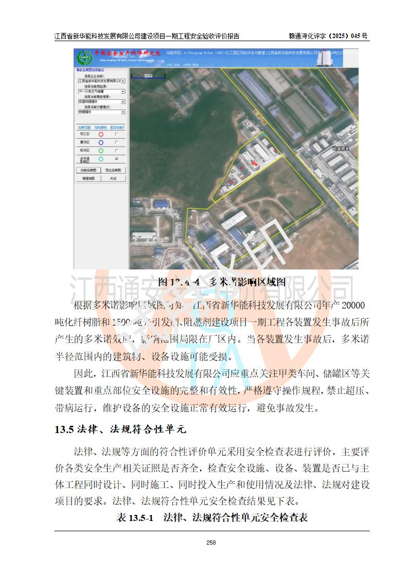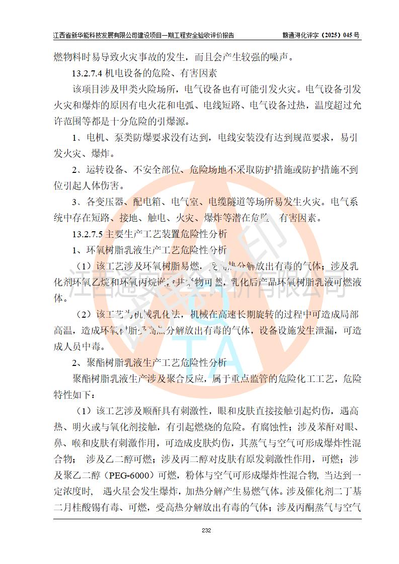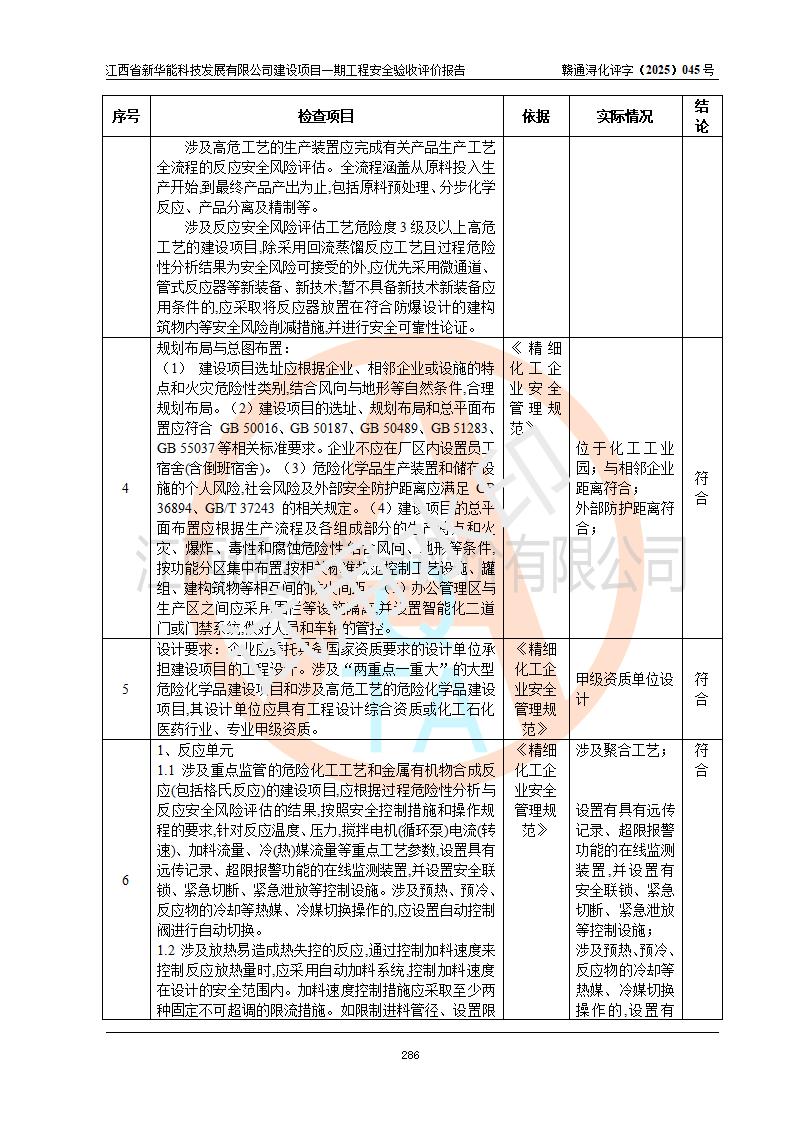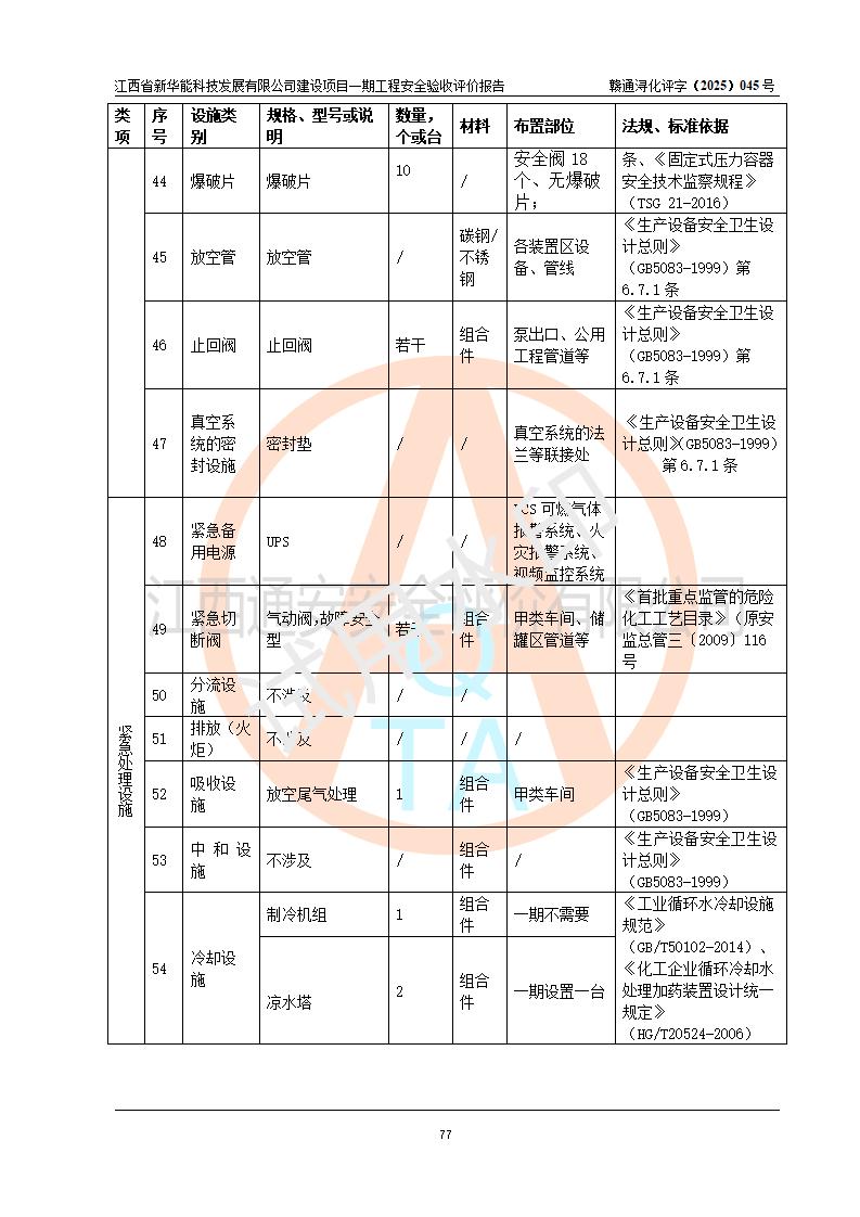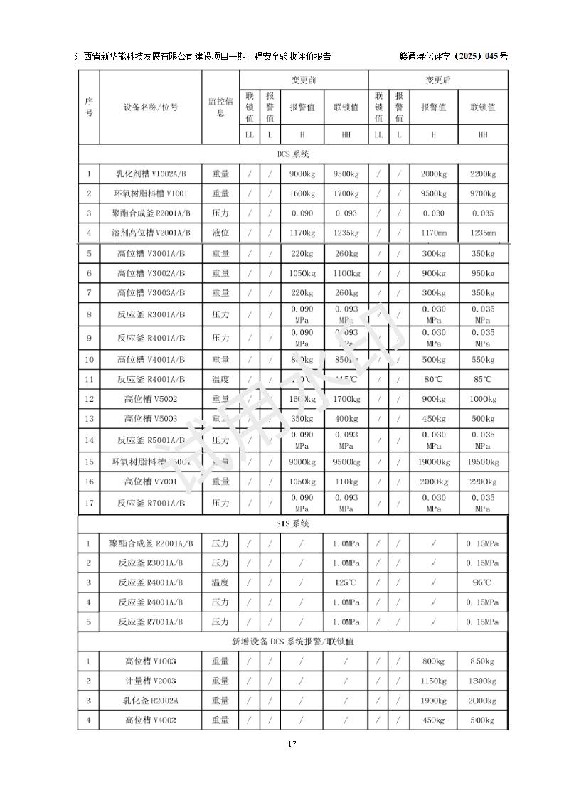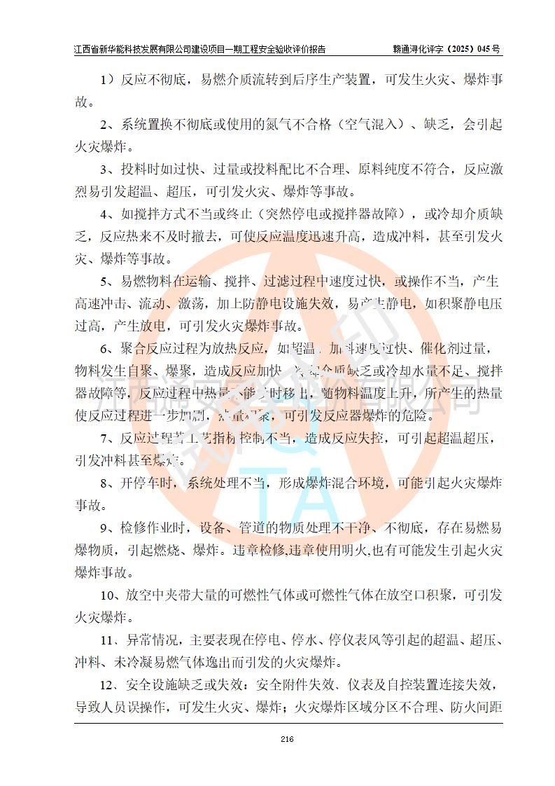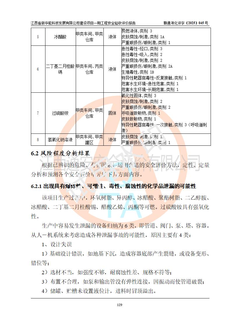 評(píng)價(jià)結(jié)論 | 經(jīng)評(píng)價(jià)組評(píng)價(jià),江西省新華能科技發(fā)展有限公司年產(chǎn)20000噸化纖樹脂和1500噸光引發(fā)劑、阻燃劑建設(shè)項(xiàng)目一期工程(年產(chǎn)16000化纖樹脂項(xiàng)目)總體布局、現(xiàn)場(chǎng)設(shè)備布置情況與設(shè)計(jì)圖紙一致,本次項(xiàng)目涉及重點(diǎn)監(jiān)管的危險(xiǎn)化學(xué)品、危險(xiǎn)工藝,按設(shè)計(jì)要求,設(shè)置有DCS系統(tǒng)、SIS系統(tǒng)、GDS系統(tǒng),符合《江西省應(yīng)急管理廳關(guān)于印發(fā)(試行)的通知 》、關(guān)于印發(fā)《九江市化工企業(yè)自動(dòng)化提升實(shí)施方案》的安全要求,符合《危險(xiǎn)化學(xué)品生產(chǎn)建設(shè)項(xiàng)目安全風(fēng)險(xiǎn)防控指南(試行)》規(guī)定竣工驗(yàn)收的安全條件;企業(yè)主要負(fù)責(zé)人、安全管理部門負(fù)責(zé)人均為化學(xué)、化工相關(guān)專業(yè),且有3年以上化工行業(yè)從業(yè)經(jīng)歷,企業(yè)主要負(fù)責(zé)人及安全管理人員已取得危險(xiǎn)化學(xué)品企業(yè)主要負(fù)責(zé)人及安全管理人員考核合格證。項(xiàng)目選擇的工藝過(guò)程及設(shè)備設(shè)施的安全可靠性能 達(dá)到**法規(guī)、標(biāo)準(zhǔn)規(guī)定要求。 項(xiàng)目運(yùn)行后存在的主要危險(xiǎn)、有害因素有:火災(zāi)、其他爆炸、容器爆炸、中毒與窒息等;存在的主要有害因素有高溫、化學(xué)物質(zhì)危害等;針對(duì)存在的危險(xiǎn)、有害因素,企業(yè)采取了**的安全技術(shù)措施及安全管理措施,符合**有關(guān)法規(guī)、標(biāo)準(zhǔn)、規(guī)范要求;項(xiàng)目風(fēng)險(xiǎn)可控,其安全生產(chǎn)條件和安全管理 方面具備竣工安全驗(yàn)收的條件。 | |||||