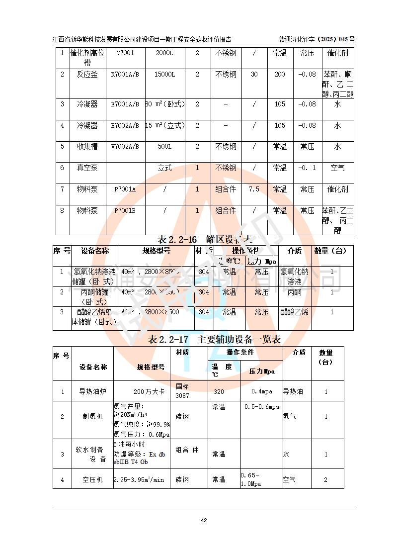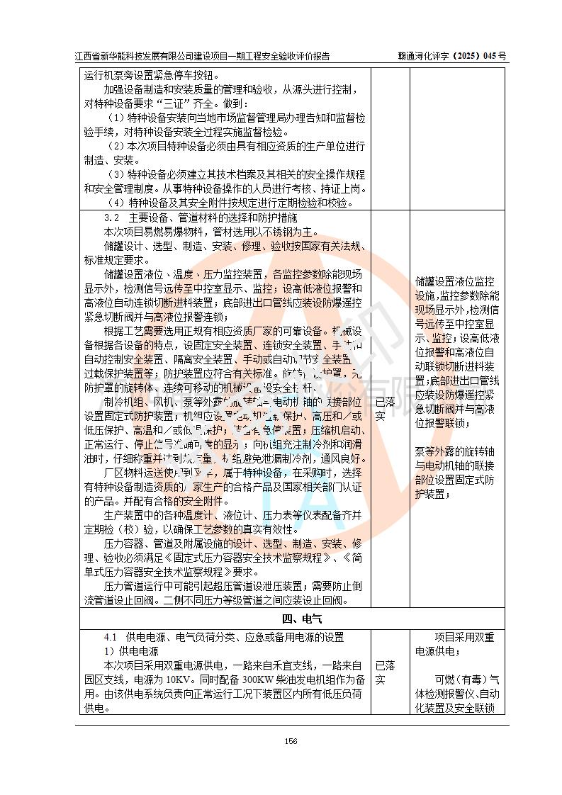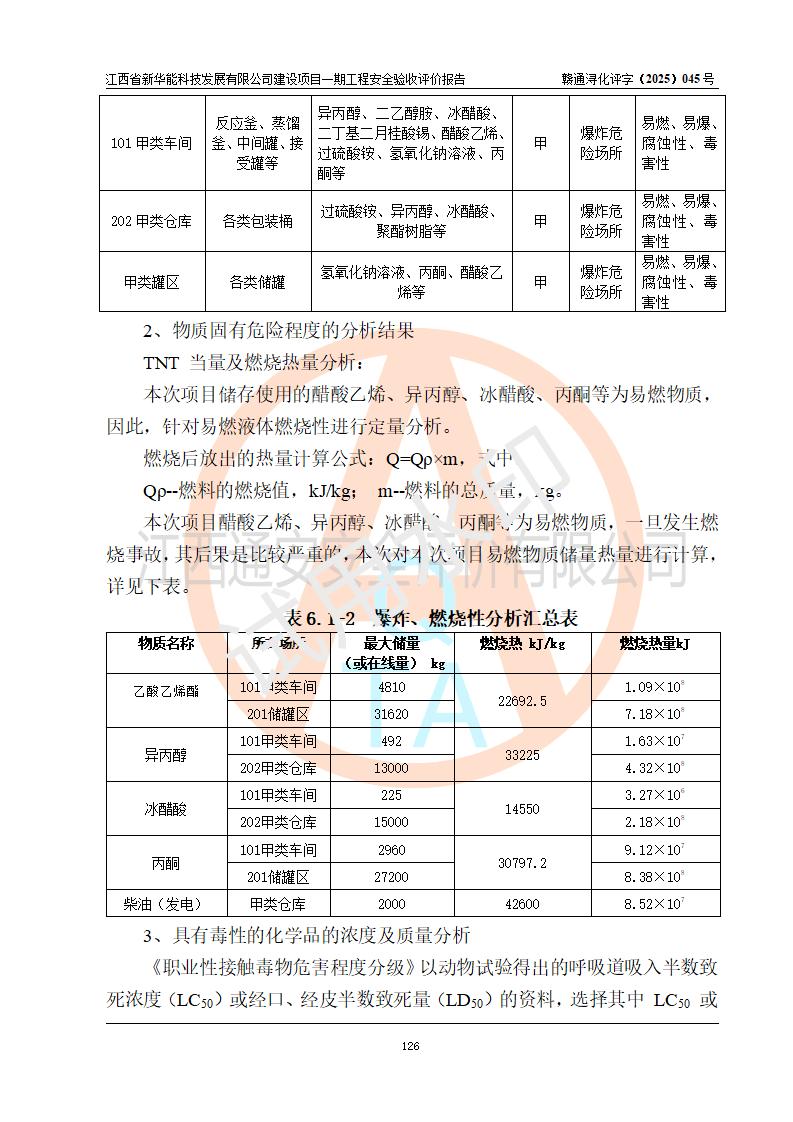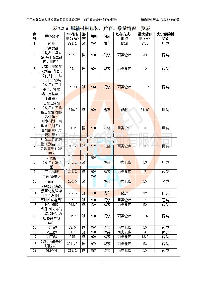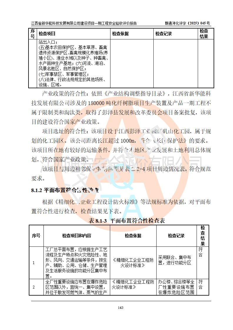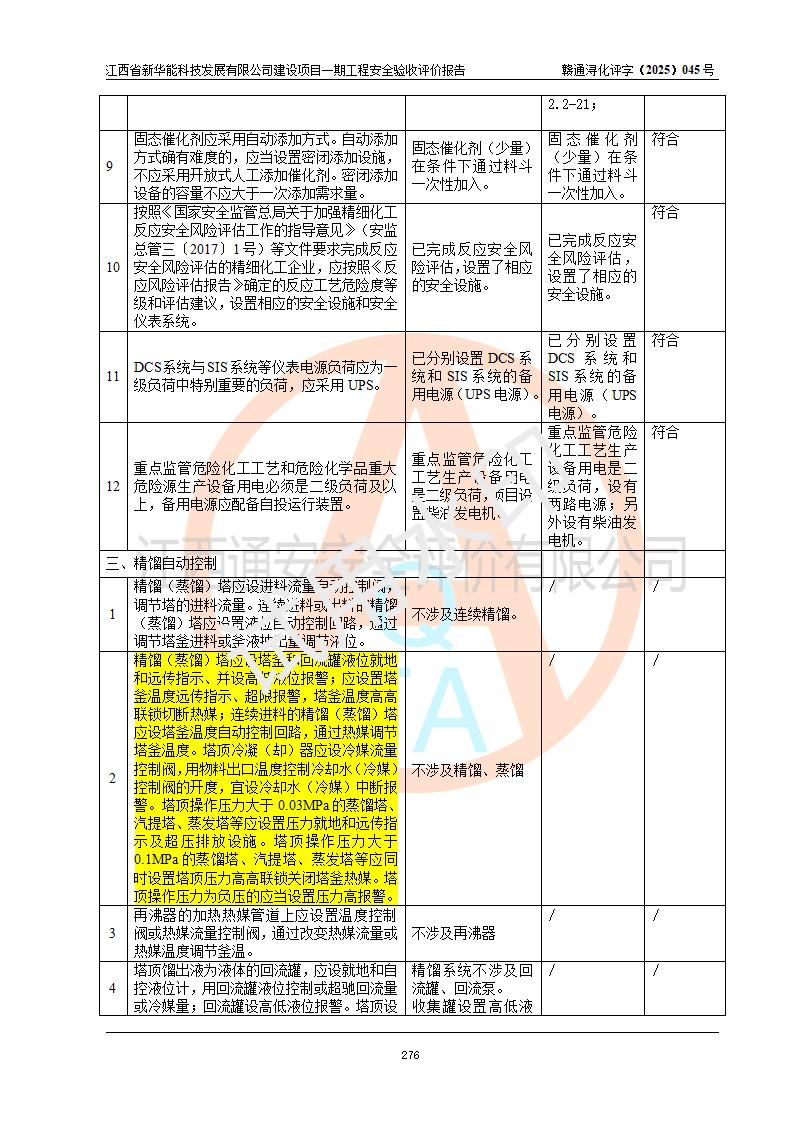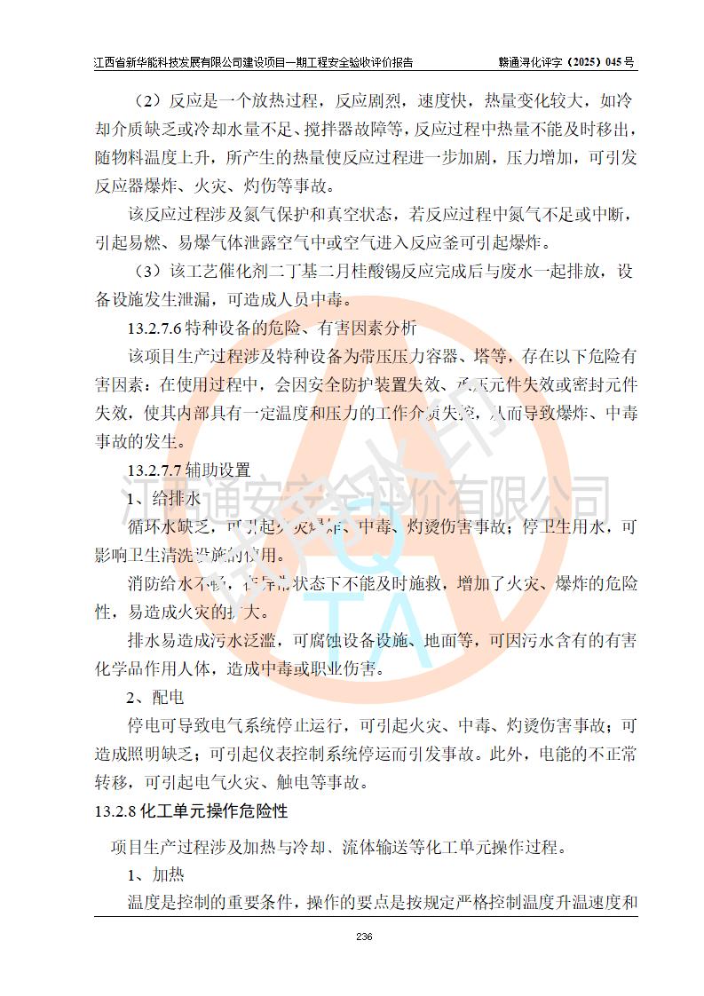 評(píng)價(jià)結(jié)論 | 經(jīng)評(píng)價(jià)組評(píng)價(jià),江西省新華能科技發(fā)展有限公司年產(chǎn)20000噸化纖樹脂和1500噸光引發(fā)劑、阻燃劑建設(shè)項(xiàng)目一期工程(年產(chǎn)16000化纖樹脂項(xiàng)目)總體布局、現(xiàn)場(chǎng)設(shè)備布置情況與設(shè)計(jì)圖紙一致,本次項(xiàng)目涉及重點(diǎn)監(jiān)管的危險(xiǎn)化學(xué)品、危險(xiǎn)工藝,按設(shè)計(jì)要求,設(shè)置有DCS系統(tǒng)、SIS系統(tǒng)、GDS系統(tǒng),符合《江西省應(yīng)急管理廳關(guān)于印發(fā)(試行)的通知 》、關(guān)于印發(fā)《九江市化工企業(yè)自動(dòng)化提升實(shí)施方案》的安全要求,符合《危險(xiǎn)化學(xué)品生產(chǎn)建設(shè)項(xiàng)目安全風(fēng)險(xiǎn)防控指南(試行)》規(guī)定竣工驗(yàn)收的安全條件;企業(yè)主要負(fù)責(zé)人、安全管理部門負(fù)責(zé)人均為化學(xué)、化工相關(guān)專業(yè),且有3年以上化工行業(yè)從業(yè)經(jīng)歷,企業(yè)主要負(fù)責(zé)人及安全管理人員已取得危險(xiǎn)化學(xué)品企業(yè)主要負(fù)責(zé)人及安全管理人員考核合格證。項(xiàng)目選擇的工藝過(guò)程及設(shè)備設(shè)施的安全可靠性能 達(dá)到**法規(guī)、標(biāo)準(zhǔn)規(guī)定要求。 項(xiàng)目運(yùn)行后存在的主要危險(xiǎn)、有害因素有:火災(zāi)、其他爆炸、容器爆炸、中毒與窒息等;存在的主要有害因素有高溫、化學(xué)物質(zhì)危害等;針對(duì)存在的危險(xiǎn)、有害因素,企業(yè)采取了**的安全技術(shù)措施及安全管理措施,符合**有關(guān)法規(guī)、標(biāo)準(zhǔn)、規(guī)范要求;項(xiàng)目風(fēng)險(xiǎn)可控,其安全生產(chǎn)條件和安全管理 方面具備竣工安全驗(yàn)收的條件。 | |||||