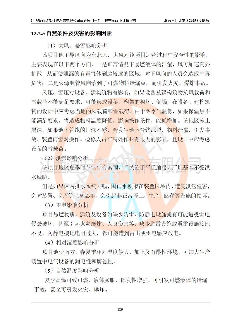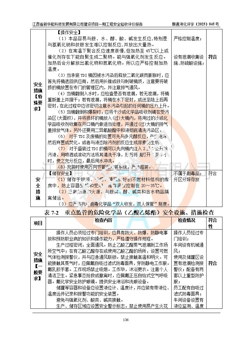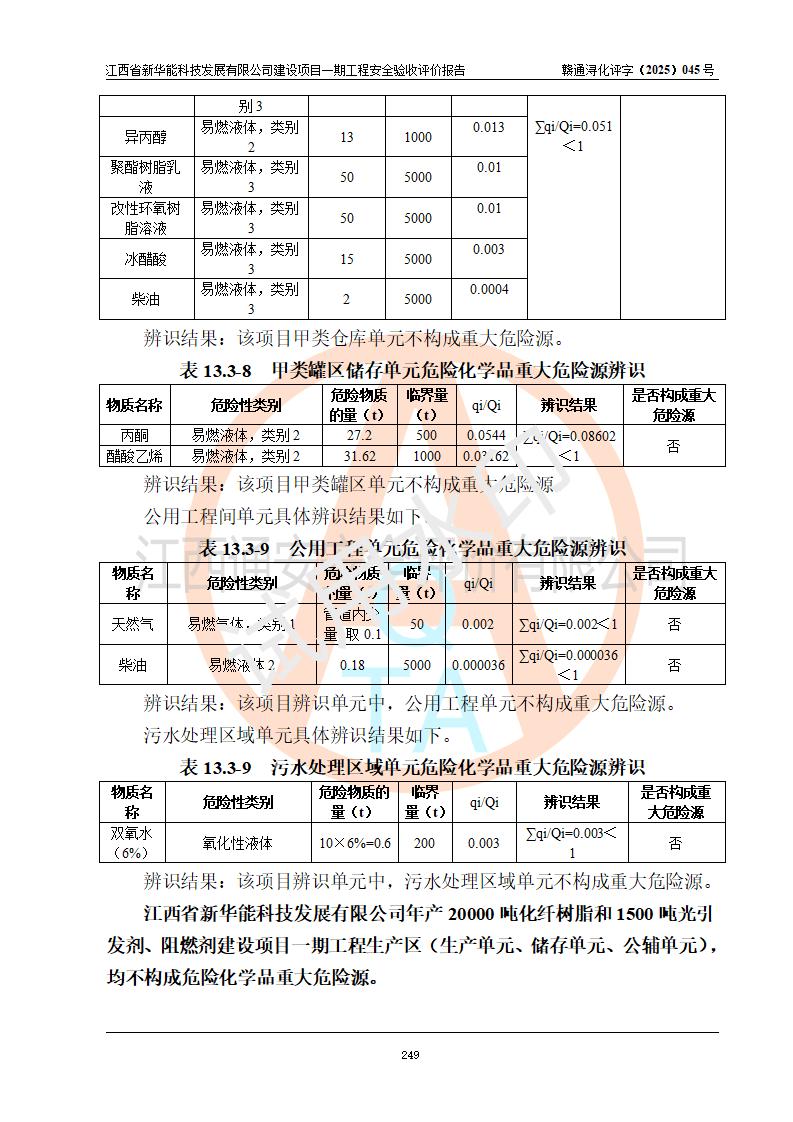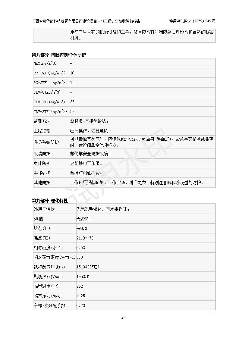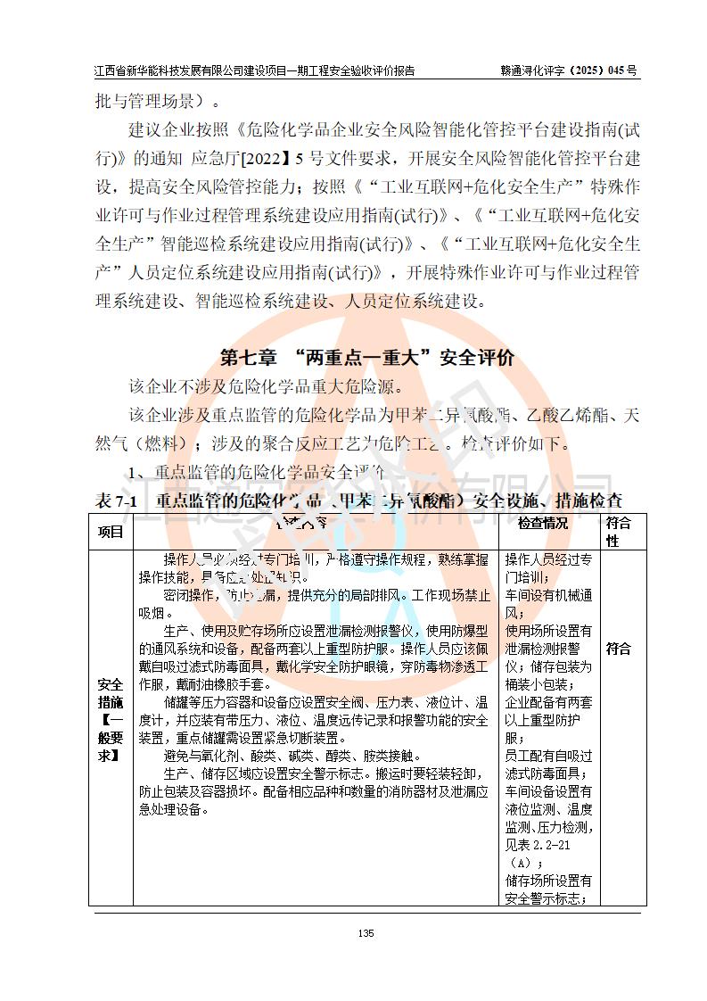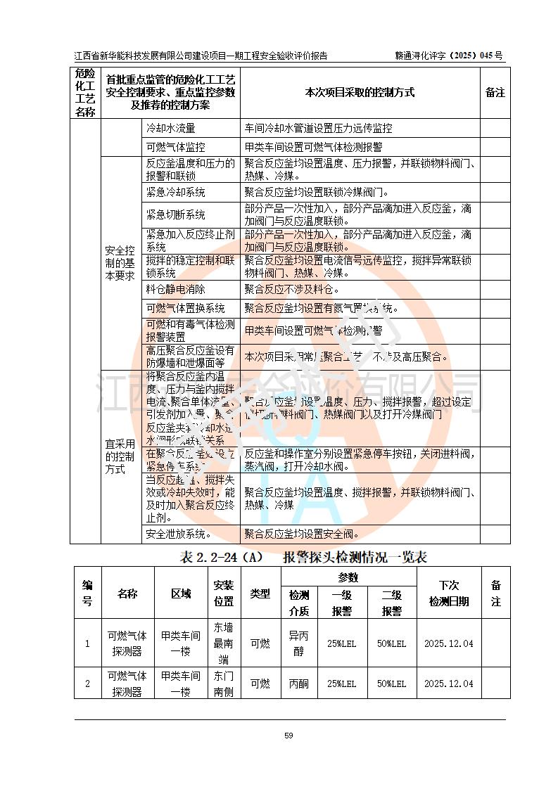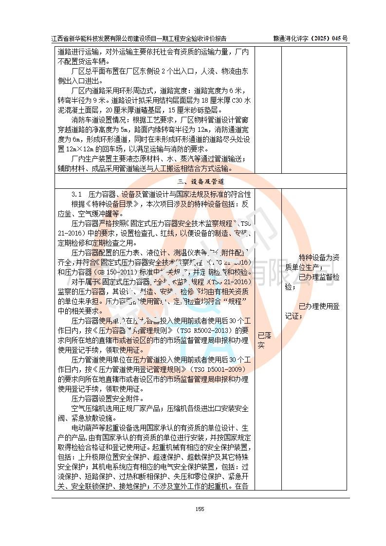 評(píng)價(jià)結(jié)論 | 經(jīng)評(píng)價(jià)組評(píng)價(jià),江西省新華能科技發(fā)展有限公司年產(chǎn)20000噸化纖樹脂和1500噸光引發(fā)劑、阻燃劑建設(shè)項(xiàng)目一期工程(年產(chǎn)16000化纖樹脂項(xiàng)目)總體布局、現(xiàn)場(chǎng)設(shè)備布置情況與設(shè)計(jì)圖紙一致,本次項(xiàng)目涉及重點(diǎn)監(jiān)管的危險(xiǎn)化學(xué)品、危險(xiǎn)工藝,按設(shè)計(jì)要求,設(shè)置有DCS系統(tǒng)、SIS系統(tǒng)、GDS系統(tǒng),符合《江西省應(yīng)急管理廳關(guān)于印發(fā)(試行)的通知 》、關(guān)于印發(fā)《九江市化工企業(yè)自動(dòng)化提升實(shí)施方案》的安全要求,符合《危險(xiǎn)化學(xué)品生產(chǎn)建設(shè)項(xiàng)目安全風(fēng)險(xiǎn)防控指南(試行)》規(guī)定竣工驗(yàn)收的安全條件;企業(yè)主要負(fù)責(zé)人、安全管理部門負(fù)責(zé)人均為化學(xué)、化工相關(guān)專業(yè),且有3年以上化工行業(yè)從業(yè)經(jīng)歷,企業(yè)主要負(fù)責(zé)人及安全管理人員已取得危險(xiǎn)化學(xué)品企業(yè)主要負(fù)責(zé)人及安全管理人員考核合格證。項(xiàng)目選擇的工藝過(guò)程及設(shè)備設(shè)施的安全可靠性能 達(dá)到**法規(guī)、標(biāo)準(zhǔn)規(guī)定要求。 項(xiàng)目運(yùn)行后存在的主要危險(xiǎn)、有害因素有:火災(zāi)、其他爆炸、容器爆炸、中毒與窒息等;存在的主要有害因素有高溫、化學(xué)物質(zhì)危害等;針對(duì)存在的危險(xiǎn)、有害因素,企業(yè)采取了**的安全技術(shù)措施及安全管理措施,符合**有關(guān)法規(guī)、標(biāo)準(zhǔn)、規(guī)范要求;項(xiàng)目風(fēng)險(xiǎn)可控,其安全生產(chǎn)條件和安全管理 方面具備竣工安全驗(yàn)收的條件。 | |||||