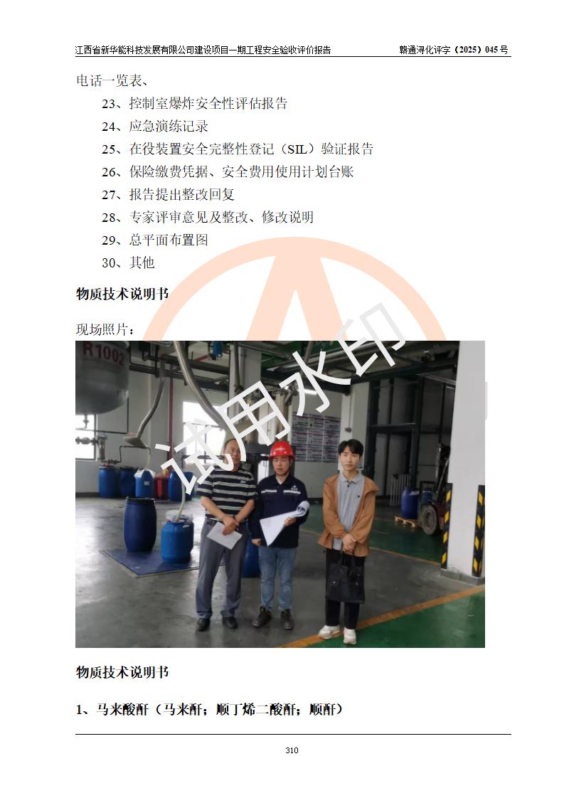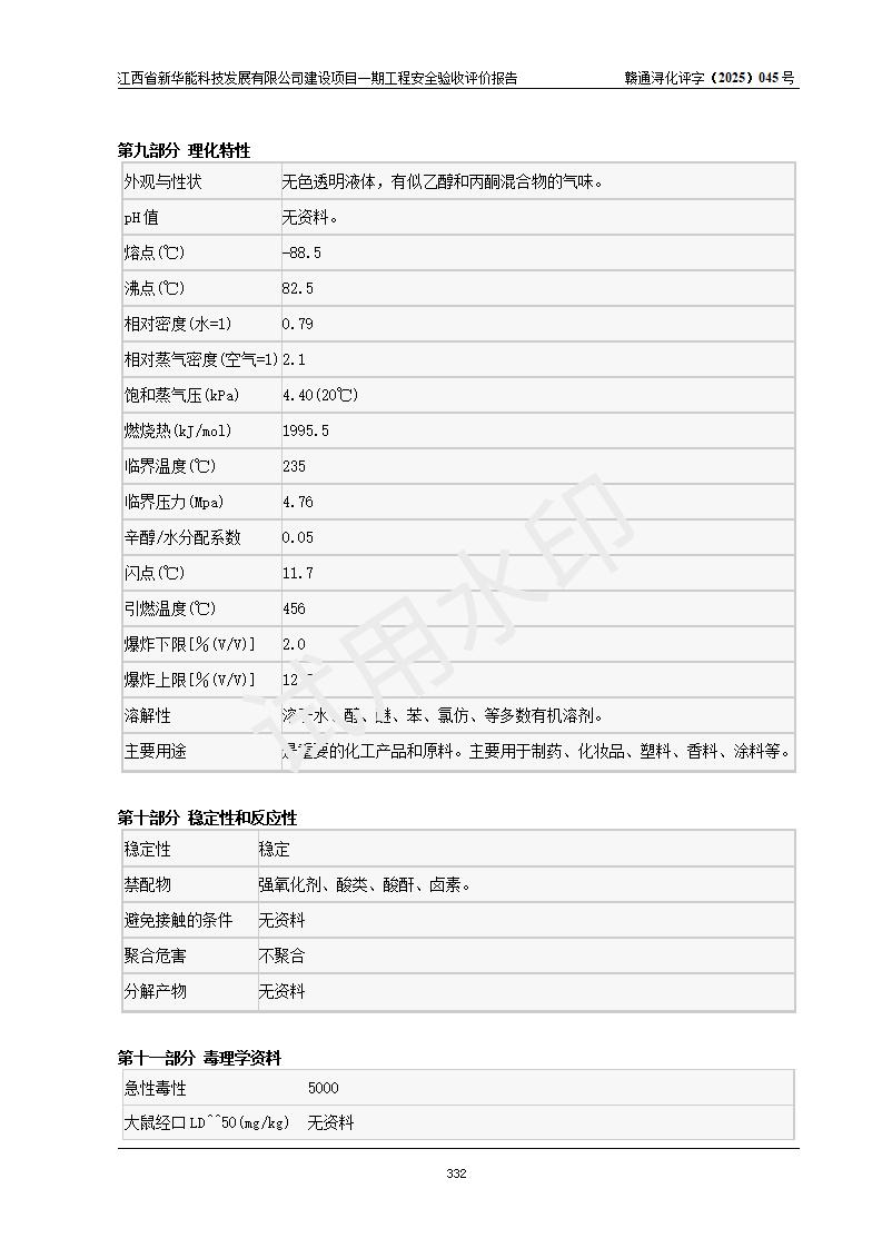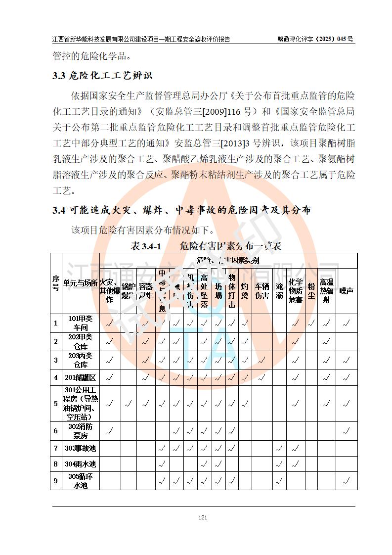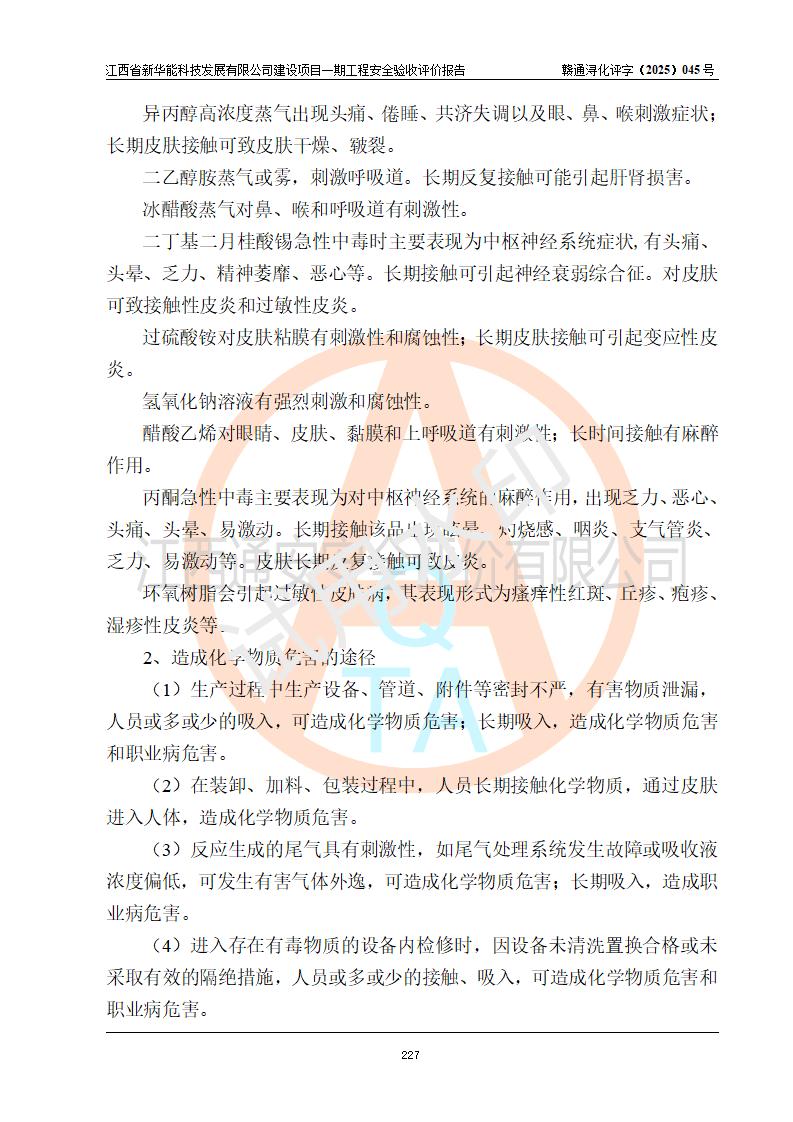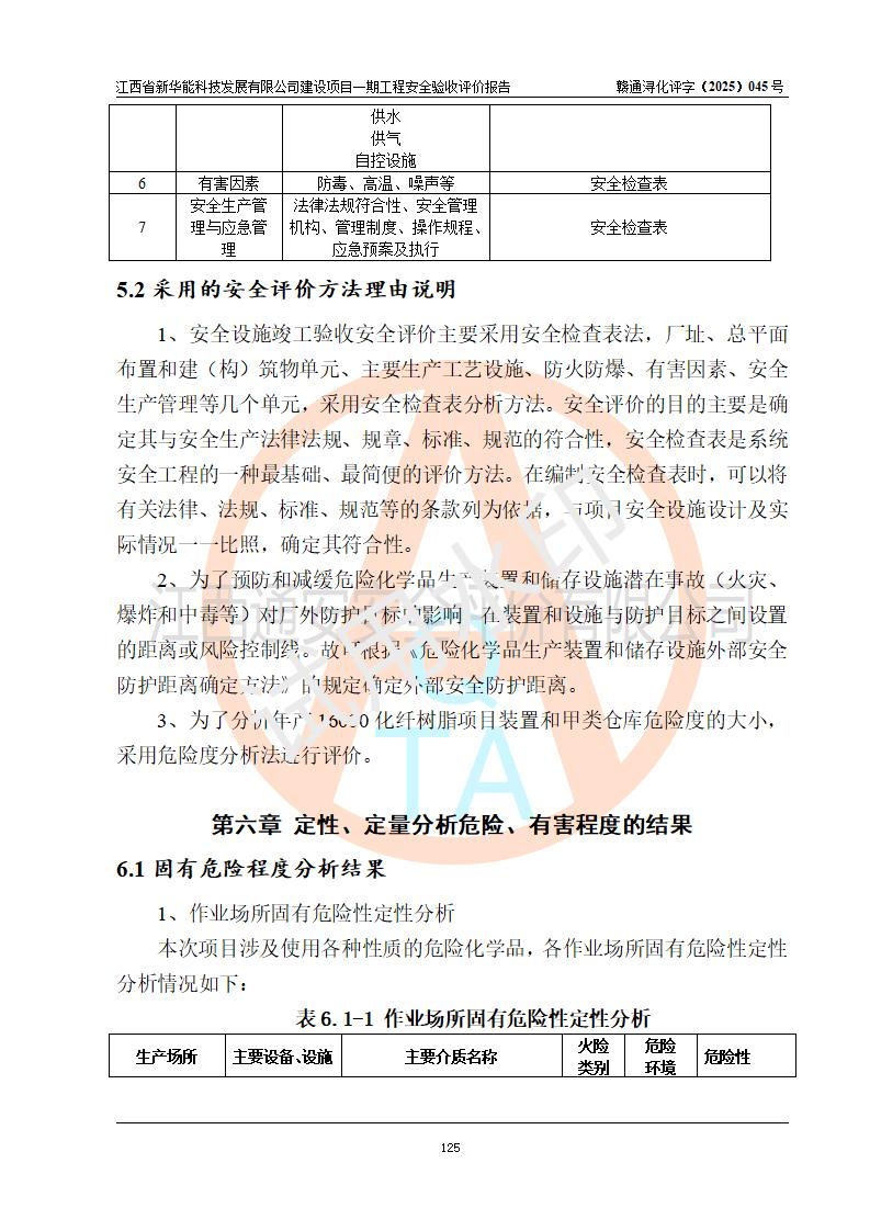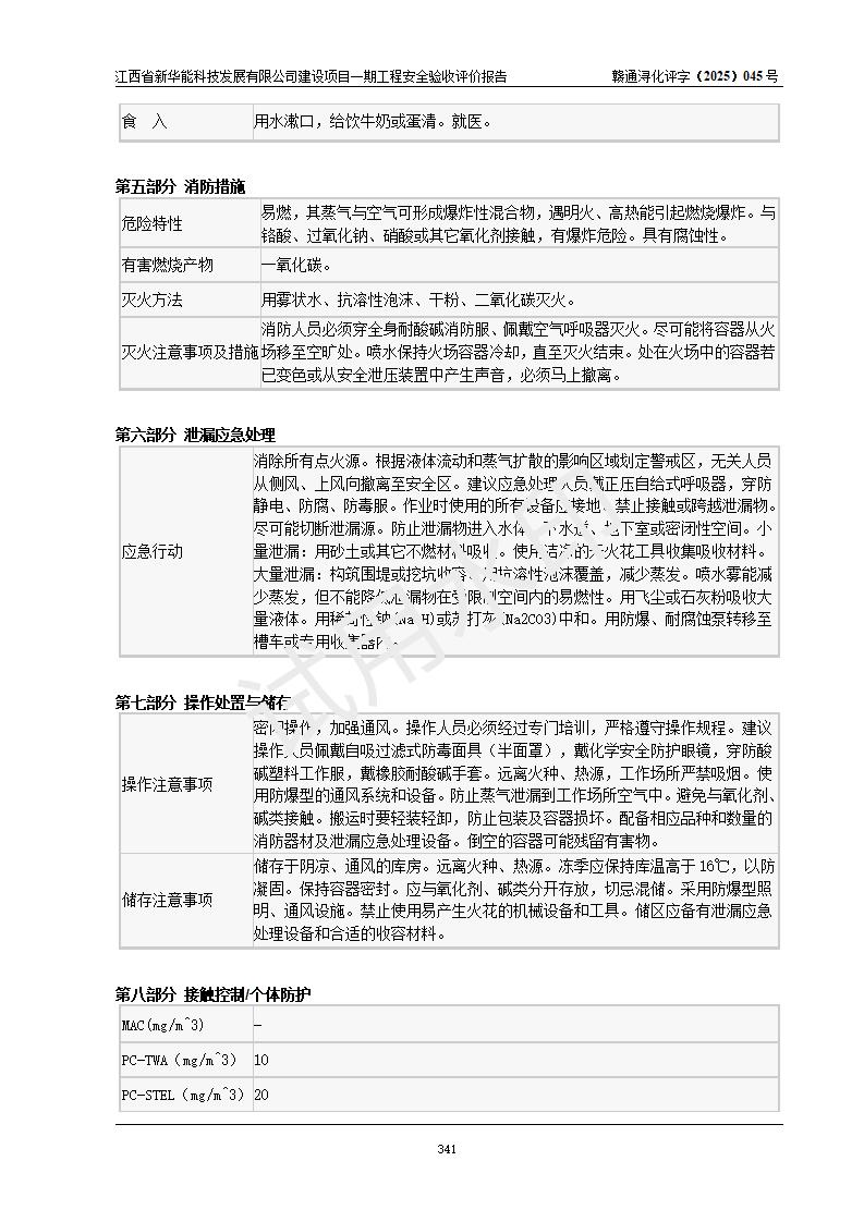 評(píng)價(jià)結(jié)論 | 經(jīng)評(píng)價(jià)組評(píng)價(jià),江西省新華能科技發(fā)展有限公司年產(chǎn)20000噸化纖樹脂和1500噸光引發(fā)劑、阻燃劑建設(shè)項(xiàng)目一期工程(年產(chǎn)16000化纖樹脂項(xiàng)目)總體布局、現(xiàn)場(chǎng)設(shè)備布置情況與設(shè)計(jì)圖紙一致,本次項(xiàng)目涉及重點(diǎn)監(jiān)管的危險(xiǎn)化學(xué)品、危險(xiǎn)工藝,按設(shè)計(jì)要求,設(shè)置有DCS系統(tǒng)、SIS系統(tǒng)、GDS系統(tǒng),符合《江西省應(yīng)急管理廳關(guān)于印發(fā)(試行)的通知 》、關(guān)于印發(fā)《九江市化工企業(yè)自動(dòng)化提升實(shí)施方案》的安全要求,符合《危險(xiǎn)化學(xué)品生產(chǎn)建設(shè)項(xiàng)目安全風(fēng)險(xiǎn)防控指南(試行)》規(guī)定竣工驗(yàn)收的安全條件;企業(yè)主要負(fù)責(zé)人、安全管理部門負(fù)責(zé)人均為化學(xué)、化工相關(guān)專業(yè),且有3年以上化工行業(yè)從業(yè)經(jīng)歷,企業(yè)主要負(fù)責(zé)人及安全管理人員已取得危險(xiǎn)化學(xué)品企業(yè)主要負(fù)責(zé)人及安全管理人員考核合格證。項(xiàng)目選擇的工藝過(guò)程及設(shè)備設(shè)施的安全可靠性能 達(dá)到**法規(guī)、標(biāo)準(zhǔn)規(guī)定要求。 項(xiàng)目運(yùn)行后存在的主要危險(xiǎn)、有害因素有:火災(zāi)、其他爆炸、容器爆炸、中毒與窒息等;存在的主要有害因素有高溫、化學(xué)物質(zhì)危害等;針對(duì)存在的危險(xiǎn)、有害因素,企業(yè)采取了**的安全技術(shù)措施及安全管理措施,符合**有關(guān)法規(guī)、標(biāo)準(zhǔn)、規(guī)范要求;項(xiàng)目風(fēng)險(xiǎn)可控,其安全生產(chǎn)條件和安全管理 方面具備竣工安全驗(yàn)收的條件。 | |||||