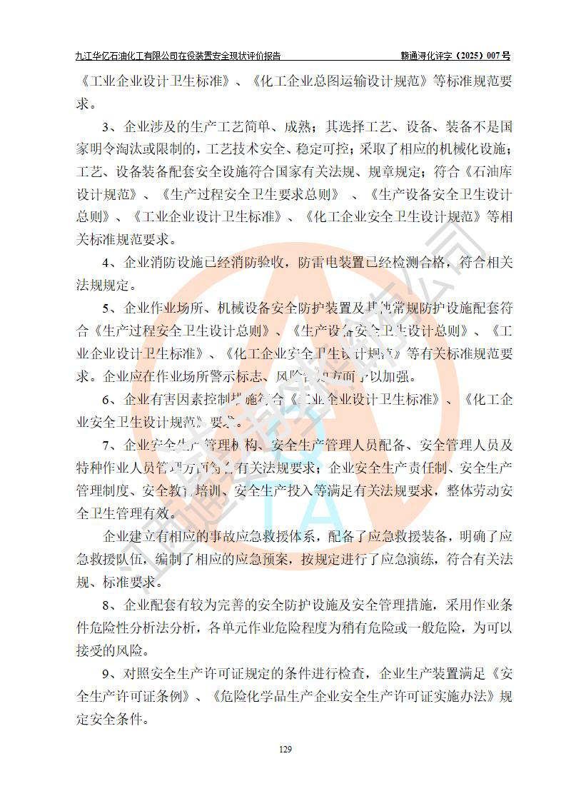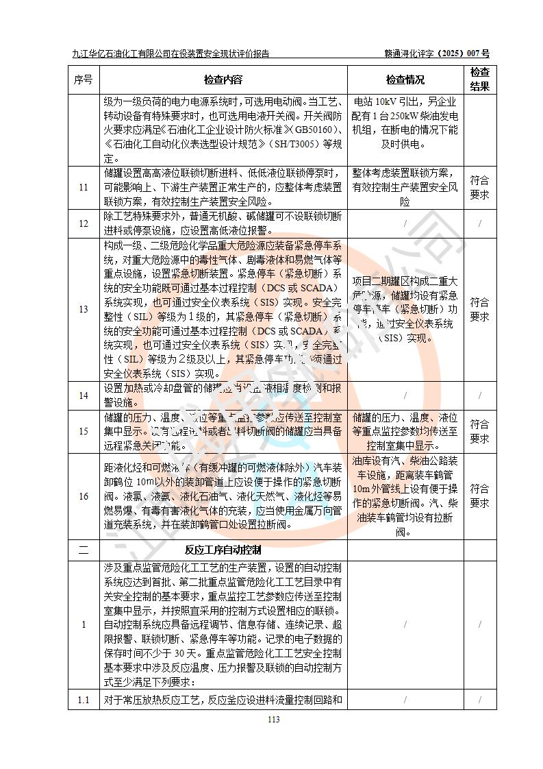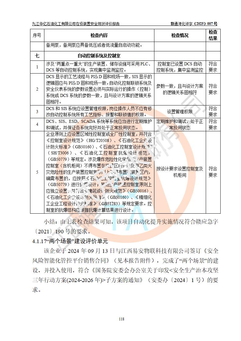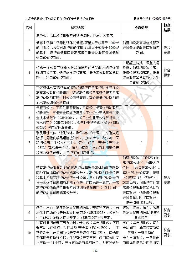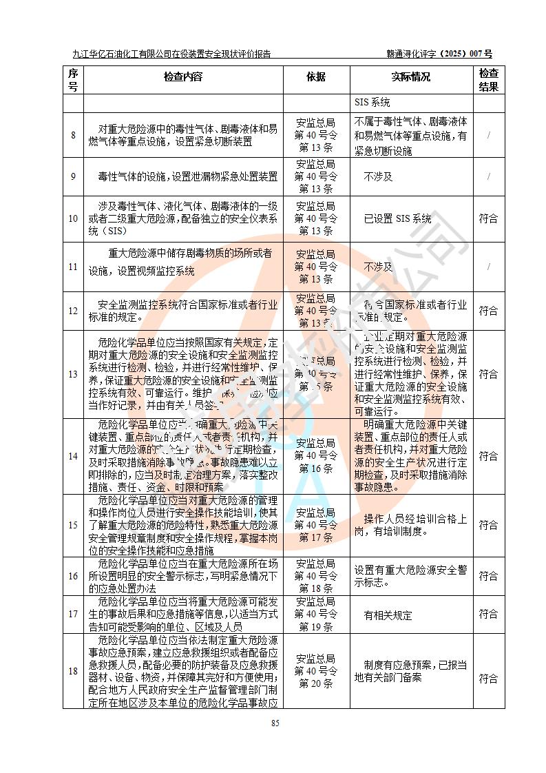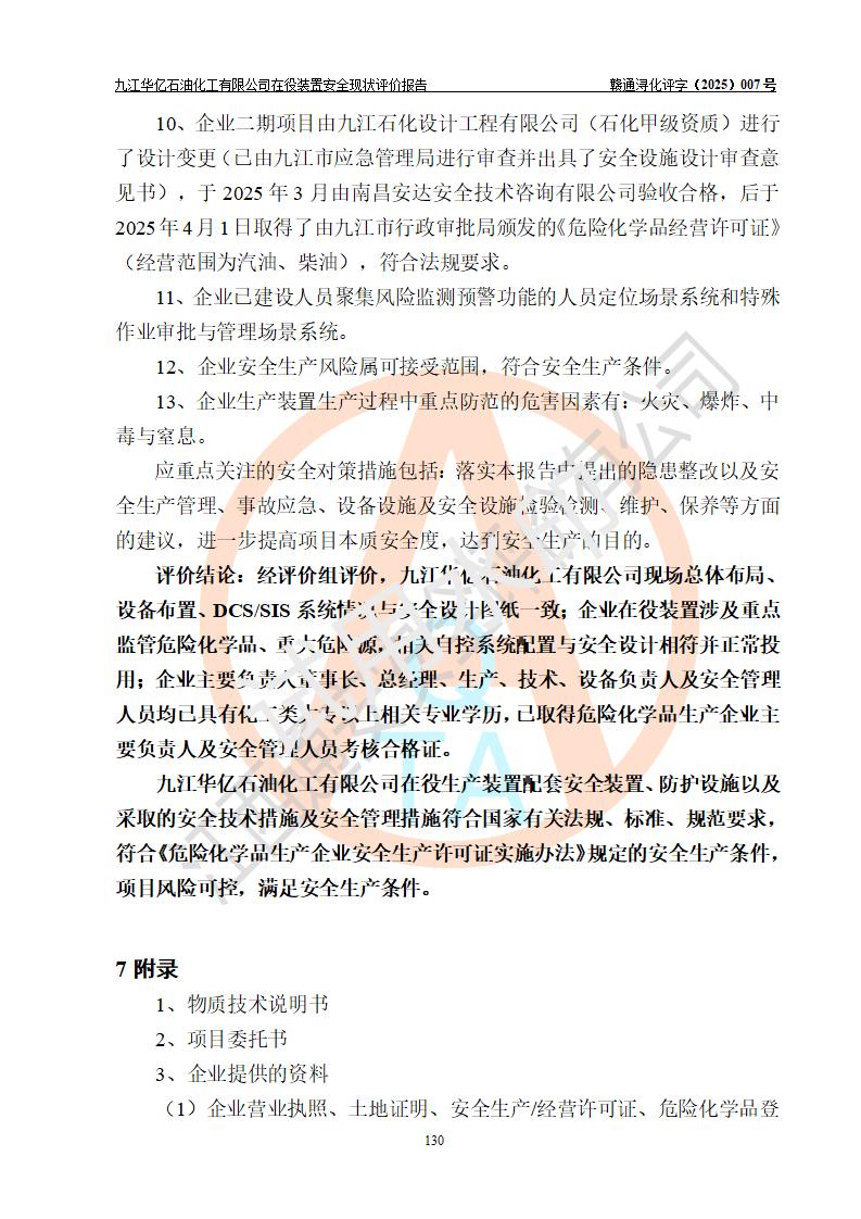 評價結(jié)論 | 經(jīng)評價組評價,九江華億石油化工有限公司現(xiàn)場總體布局、設(shè)備布置、DCS/SIS系統(tǒng)情況與安全設(shè)計圖紙一致;企業(yè)在役裝置涉及重點監(jiān)管危險化學品、重大危險源,相關(guān)自控系統(tǒng)配置與安全設(shè)計相符并正常投用;企業(yè)主要負責人董事長、總經(jīng)理、生產(chǎn)、技術(shù)、設(shè)備負責人及安全管理人員均已具有化工類大專以上相關(guān)專業(yè)學歷,已取得危險化學品生產(chǎn)企業(yè)主要負責人及安全管理人員考核合格證。 九江華億石油化工有限公司在役生產(chǎn)裝置配套安全裝置、防護設(shè)施以及采取的安全技術(shù)措施及安全管理措施符合**有關(guān)法規(guī)、標準、規(guī)范要求,符合《危險化學品生產(chǎn)企業(yè)安全生產(chǎn)許可證實施辦法》規(guī)定的安全生產(chǎn)條件,項目風險可控,滿足安全生產(chǎn)條件。