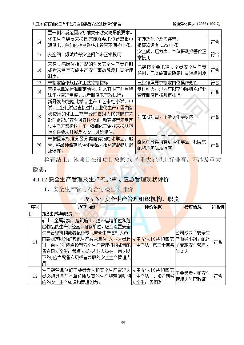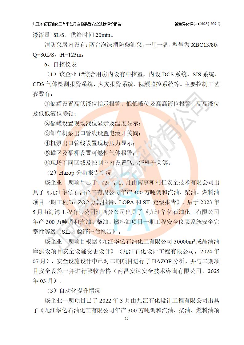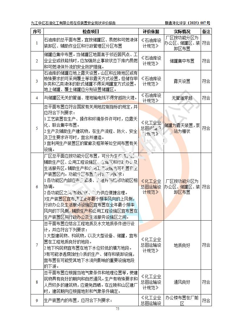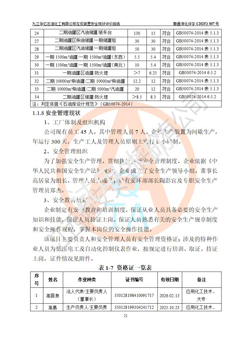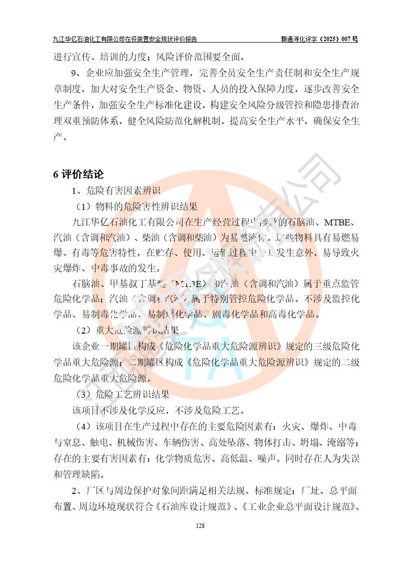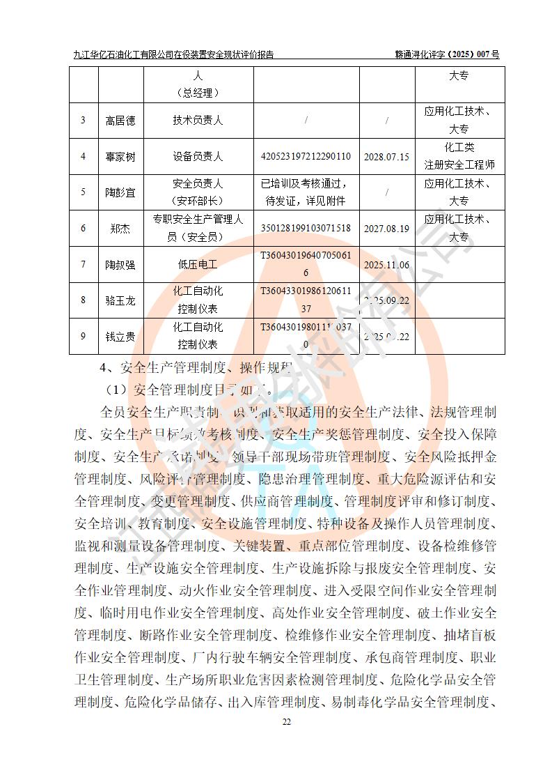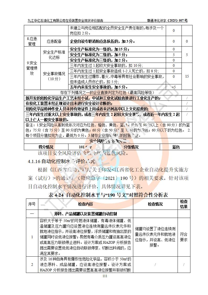 評價結(jié)論 | 經(jīng)評價組評價,九江華億石油化工有限公司現(xiàn)場總體布局、設(shè)備布置、DCS/SIS系統(tǒng)情況與安全設(shè)計圖紙一致;企業(yè)在役裝置涉及重點監(jiān)管危險化學品、重大危險源,相關(guān)自控系統(tǒng)配置與安全設(shè)計相符并正常投用;企業(yè)主要負責人董事長、總經(jīng)理、生產(chǎn)、技術(shù)、設(shè)備負責人及安全管理人員均已具有化工類大專以上相關(guān)專業(yè)學歷,已取得危險化學品生產(chǎn)企業(yè)主要負責人及安全管理人員考核合格證。 九江華億石油化工有限公司在役生產(chǎn)裝置配套安全裝置、防護設(shè)施以及采取的安全技術(shù)措施及安全管理措施符合**有關(guān)法規(guī)、標準、規(guī)范要求,符合《危險化學品生產(chǎn)企業(yè)安全生產(chǎn)許可證實施辦法》規(guī)定的安全生產(chǎn)條件,項目風險可控,滿足安全生產(chǎn)條件。