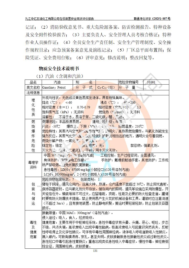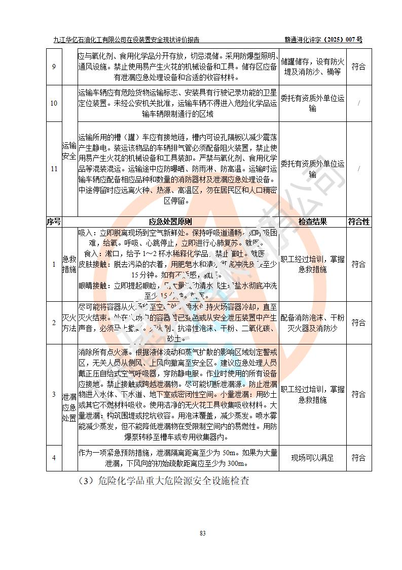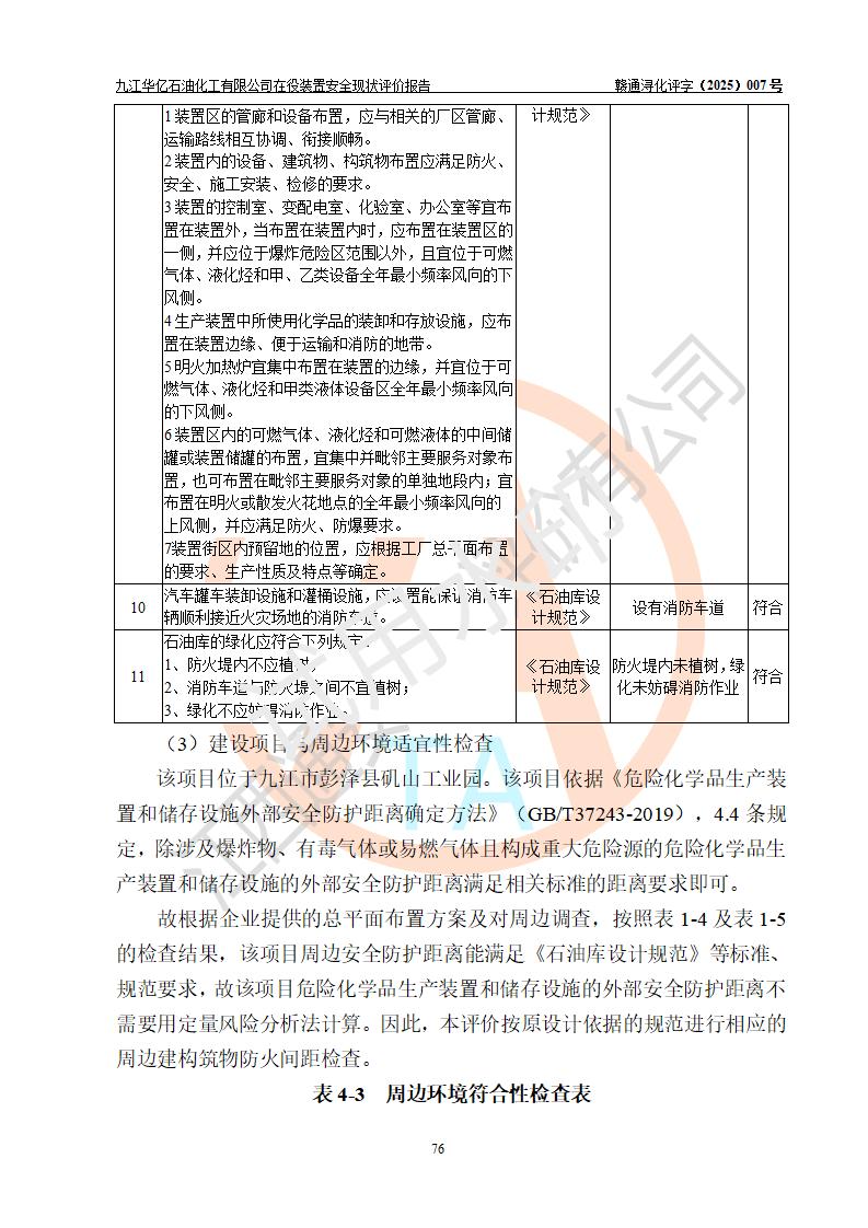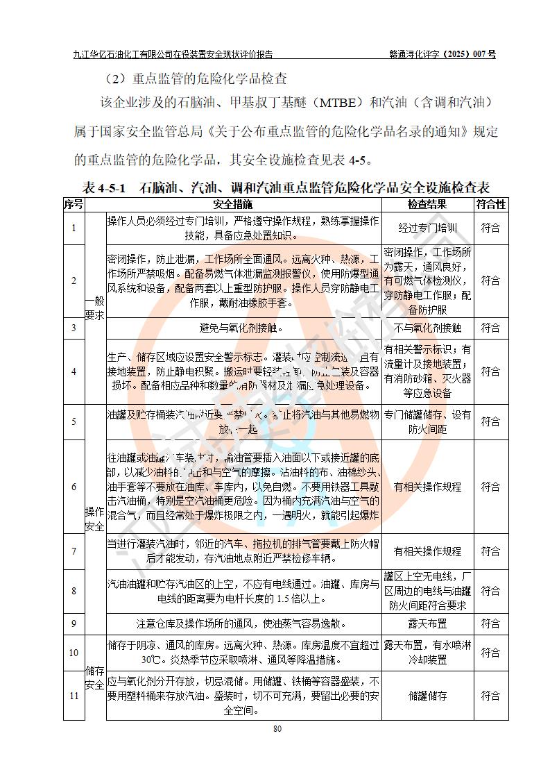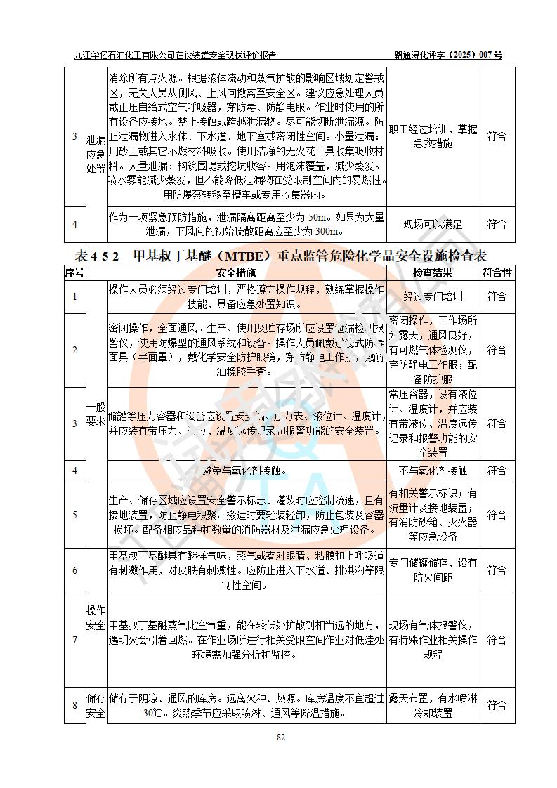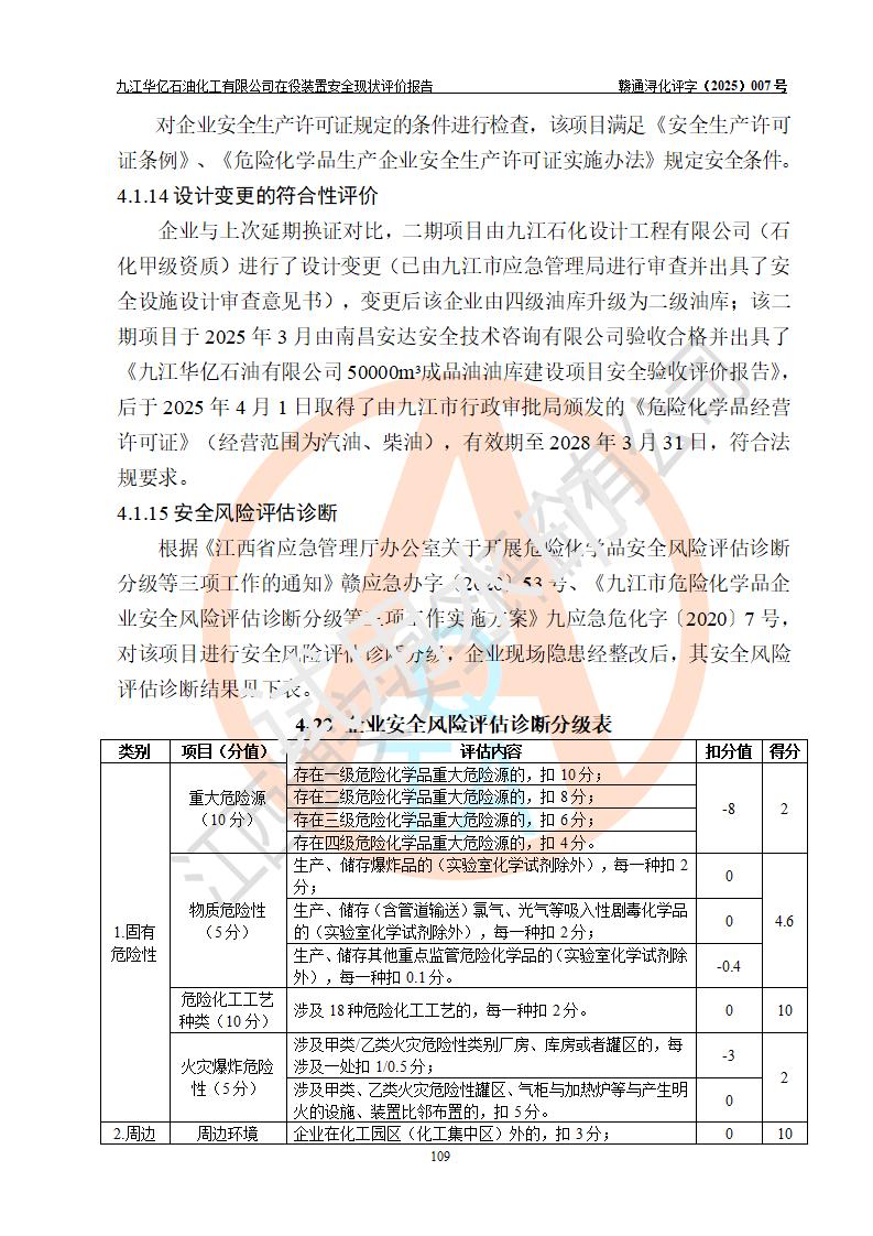評價結(jié)論 | 經(jīng)評價組評價,九江華億石油化工有限公司現(xiàn)場總體布局、設(shè)備布置、DCS/SIS系統(tǒng)情況與安全設(shè)計圖紙一致;企業(yè)在役裝置涉及重點監(jiān)管危險化學品、重大危險源,相關(guān)自控系統(tǒng)配置與安全設(shè)計相符并正常投用;企業(yè)主要負責人董事長、總經(jīng)理、生產(chǎn)、技術(shù)、設(shè)備負責人及安全管理人員均已具有化工類大專以上相關(guān)專業(yè)學歷,已取得危險化學品生產(chǎn)企業(yè)主要負責人及安全管理人員考核合格證。 九江華億石油化工有限公司在役生產(chǎn)裝置配套安全裝置、防護設(shè)施以及采取的安全技術(shù)措施及安全管理措施符合**有關(guān)法規(guī)、標準、規(guī)范要求,符合《危險化學品生產(chǎn)企業(yè)安全生產(chǎn)許可證實施辦法》規(guī)定的安全生產(chǎn)條件,項目風險可控,滿足安全生產(chǎn)條件。