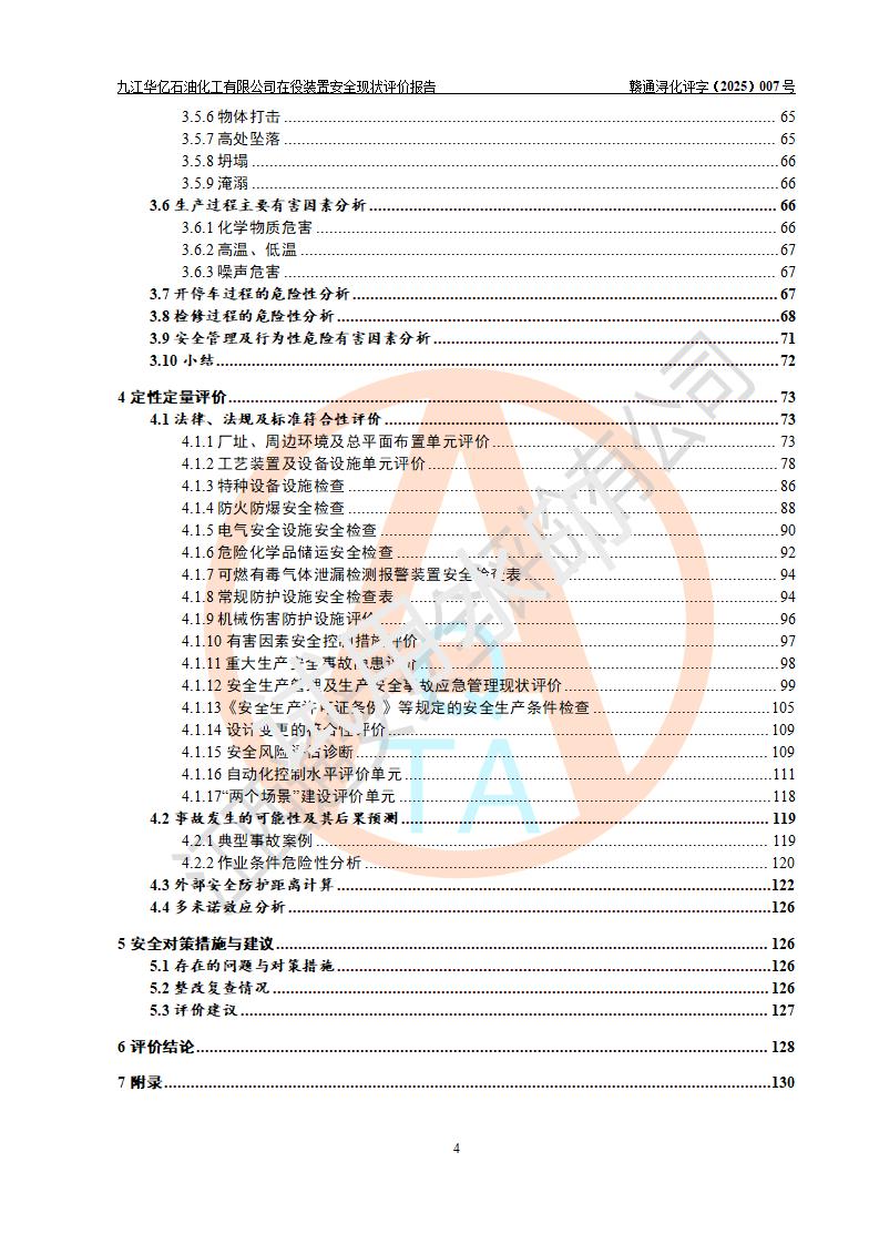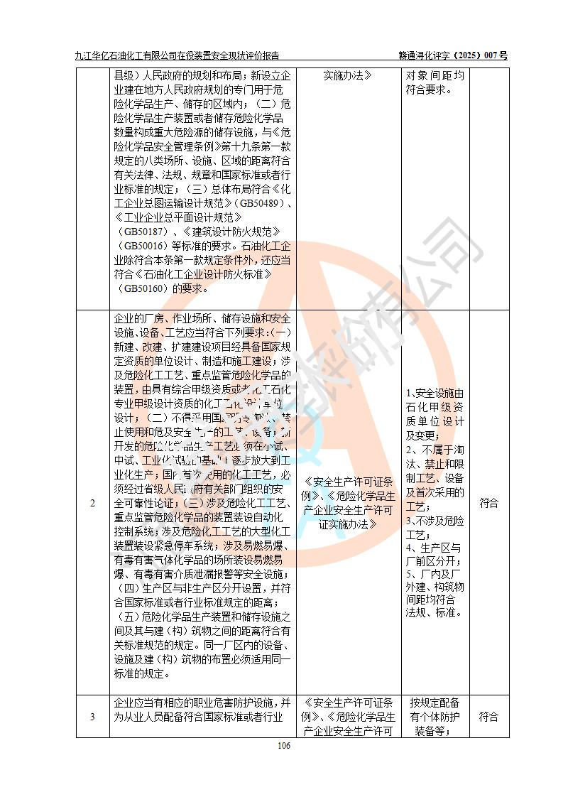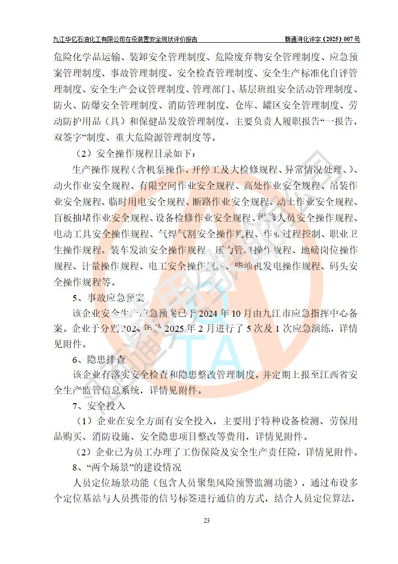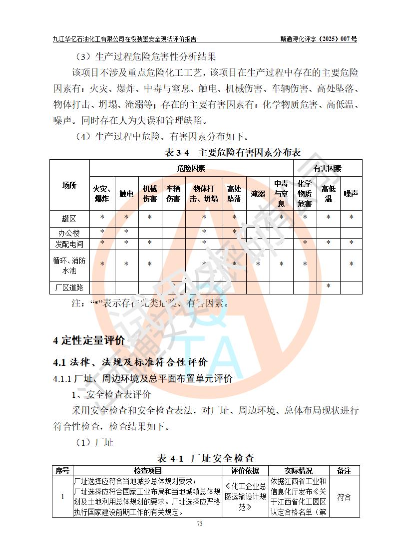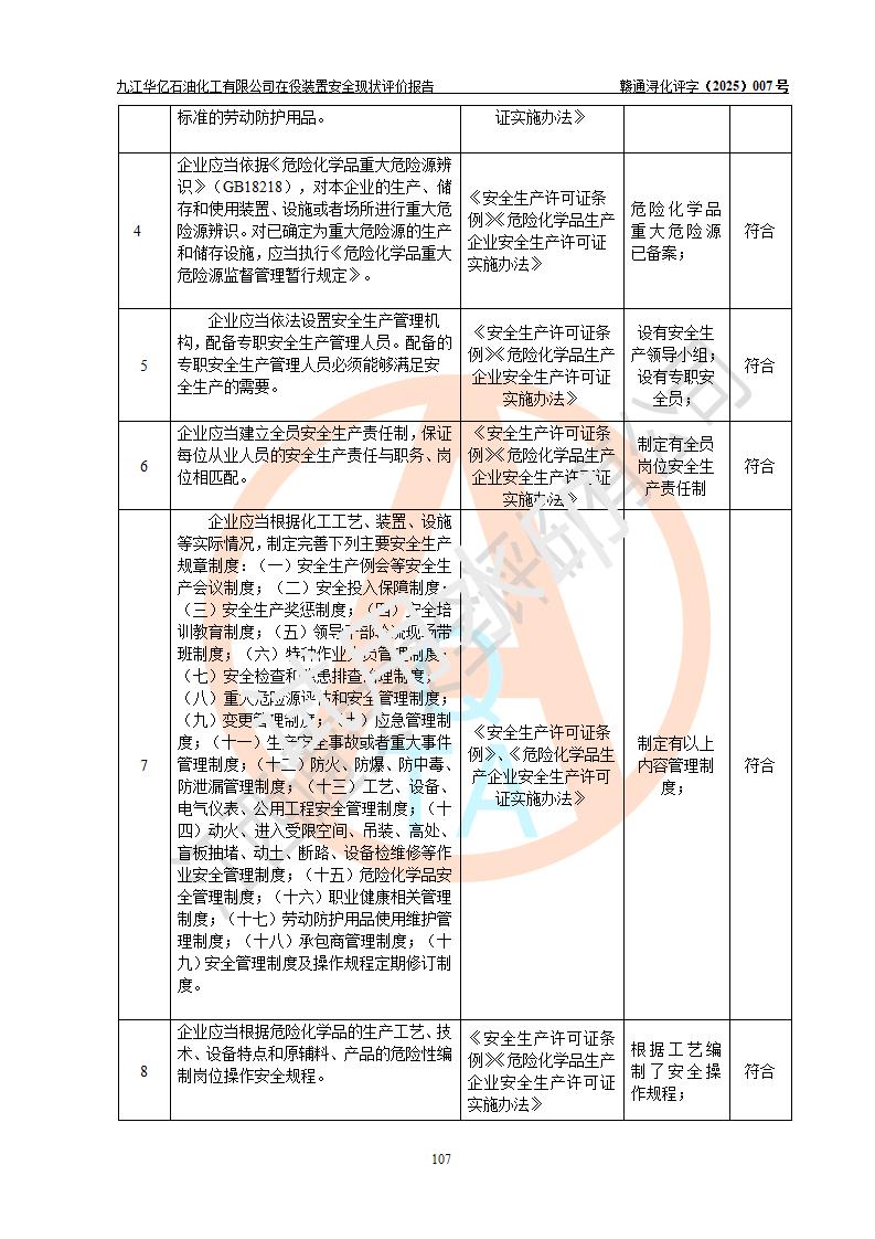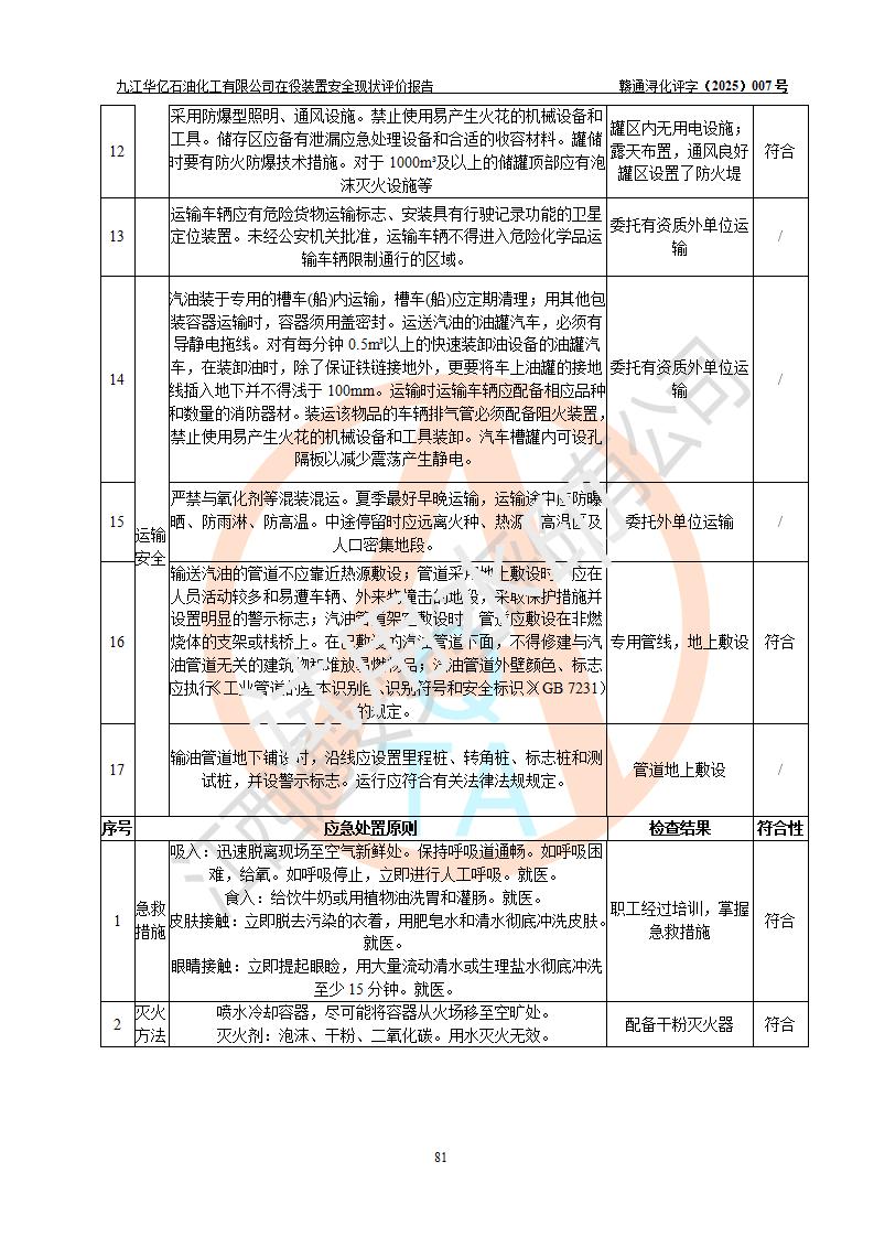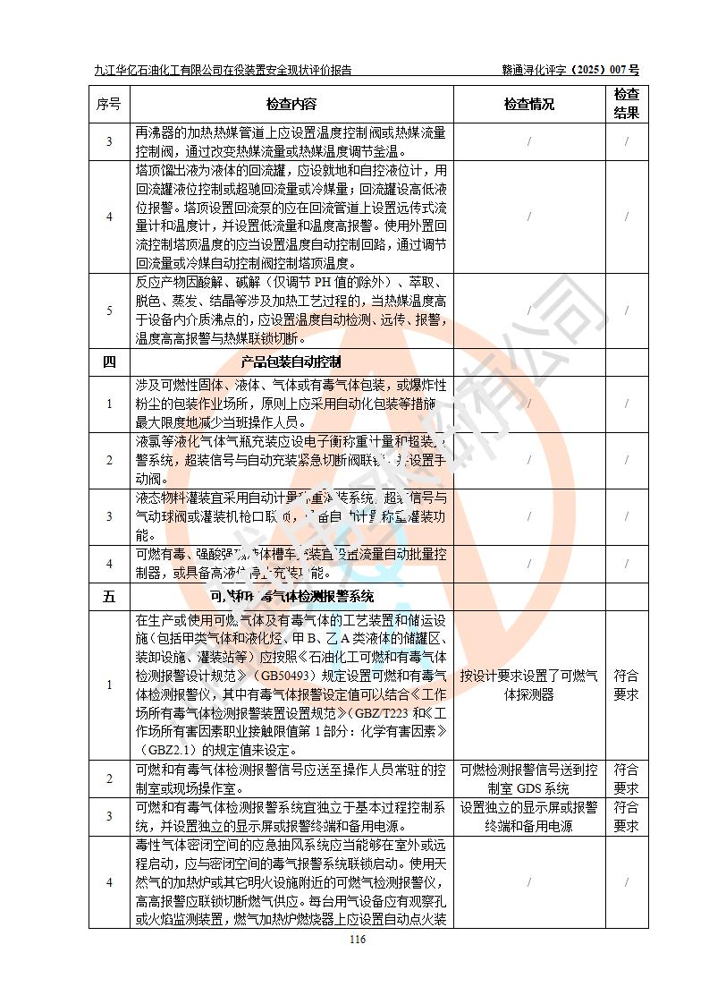 評價結(jié)論 | 經(jīng)評價組評價,九江華億石油化工有限公司現(xiàn)場總體布局、設(shè)備布置、DCS/SIS系統(tǒng)情況與安全設(shè)計圖紙一致;企業(yè)在役裝置涉及重點監(jiān)管危險化學品、重大危險源,相關(guān)自控系統(tǒng)配置與安全設(shè)計相符并正常投用;企業(yè)主要負責人董事長、總經(jīng)理、生產(chǎn)、技術(shù)、設(shè)備負責人及安全管理人員均已具有化工類大專以上相關(guān)專業(yè)學歷,已取得危險化學品生產(chǎn)企業(yè)主要負責人及安全管理人員考核合格證。 九江華億石油化工有限公司在役生產(chǎn)裝置配套安全裝置、防護設(shè)施以及采取的安全技術(shù)措施及安全管理措施符合**有關(guān)法規(guī)、標準、規(guī)范要求,符合《危險化學品生產(chǎn)企業(yè)安全生產(chǎn)許可證實施辦法》規(guī)定的安全生產(chǎn)條件,項目風險可控,滿足安全生產(chǎn)條件。