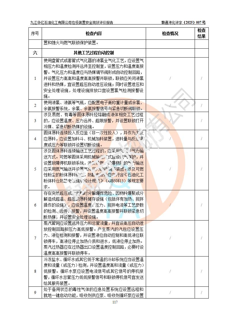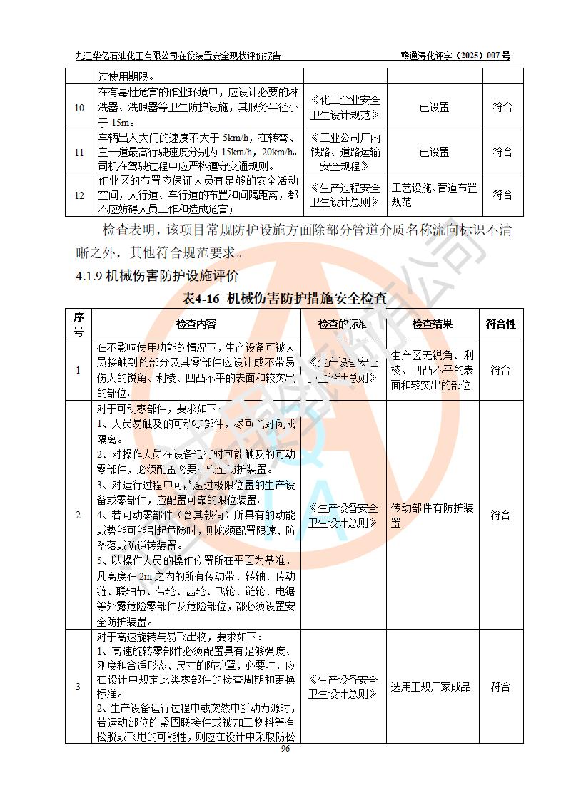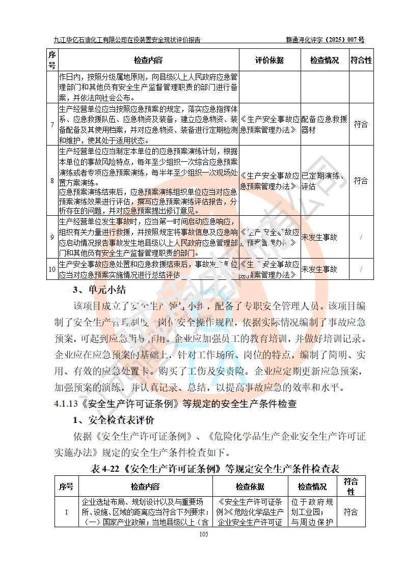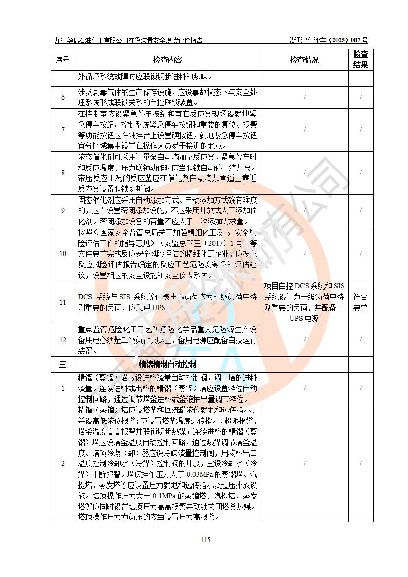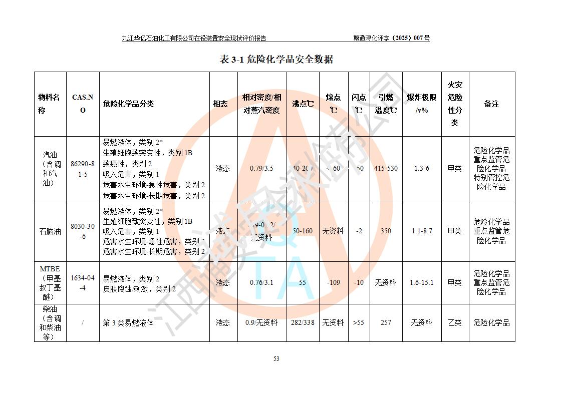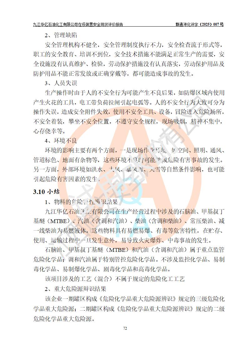 評價結(jié)論 | 經(jīng)評價組評價,九江華億石油化工有限公司現(xiàn)場總體布局、設(shè)備布置、DCS/SIS系統(tǒng)情況與安全設(shè)計圖紙一致;企業(yè)在役裝置涉及重點監(jiān)管危險化學品、重大危險源,相關(guān)自控系統(tǒng)配置與安全設(shè)計相符并正常投用;企業(yè)主要負責人董事長、總經(jīng)理、生產(chǎn)、技術(shù)、設(shè)備負責人及安全管理人員均已具有化工類大專以上相關(guān)專業(yè)學歷,已取得危險化學品生產(chǎn)企業(yè)主要負責人及安全管理人員考核合格證。 九江華億石油化工有限公司在役生產(chǎn)裝置配套安全裝置、防護設(shè)施以及采取的安全技術(shù)措施及安全管理措施符合**有關(guān)法規(guī)、標準、規(guī)范要求,符合《危險化學品生產(chǎn)企業(yè)安全生產(chǎn)許可證實施辦法》規(guī)定的安全生產(chǎn)條件,項目風險可控,滿足安全生產(chǎn)條件。