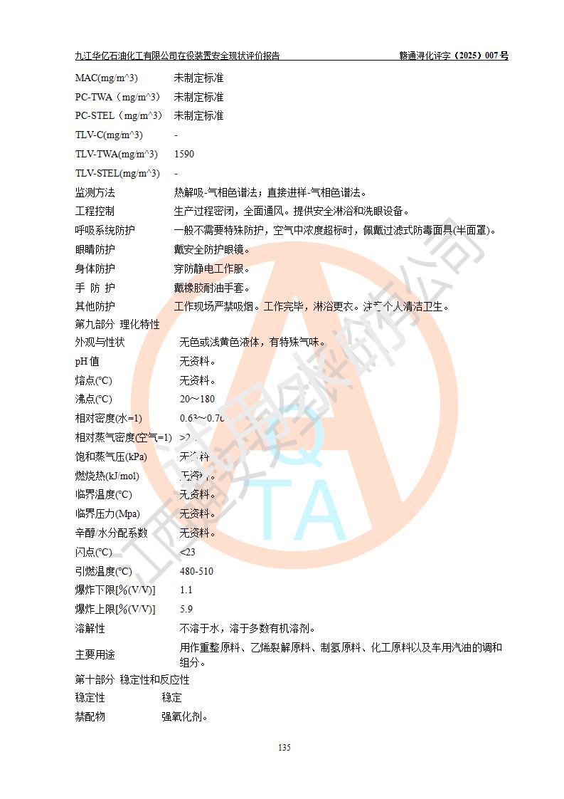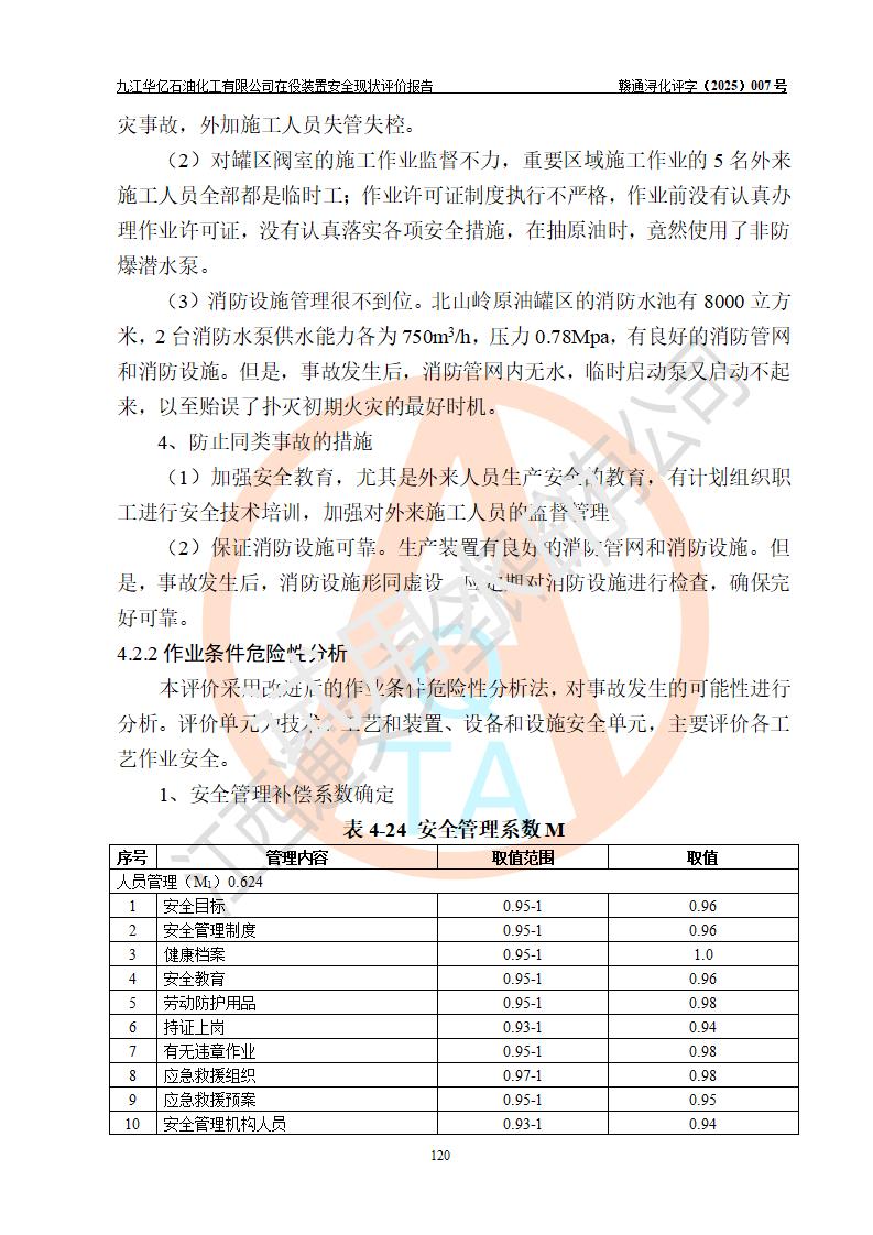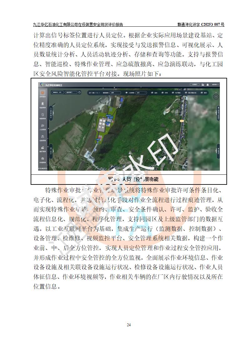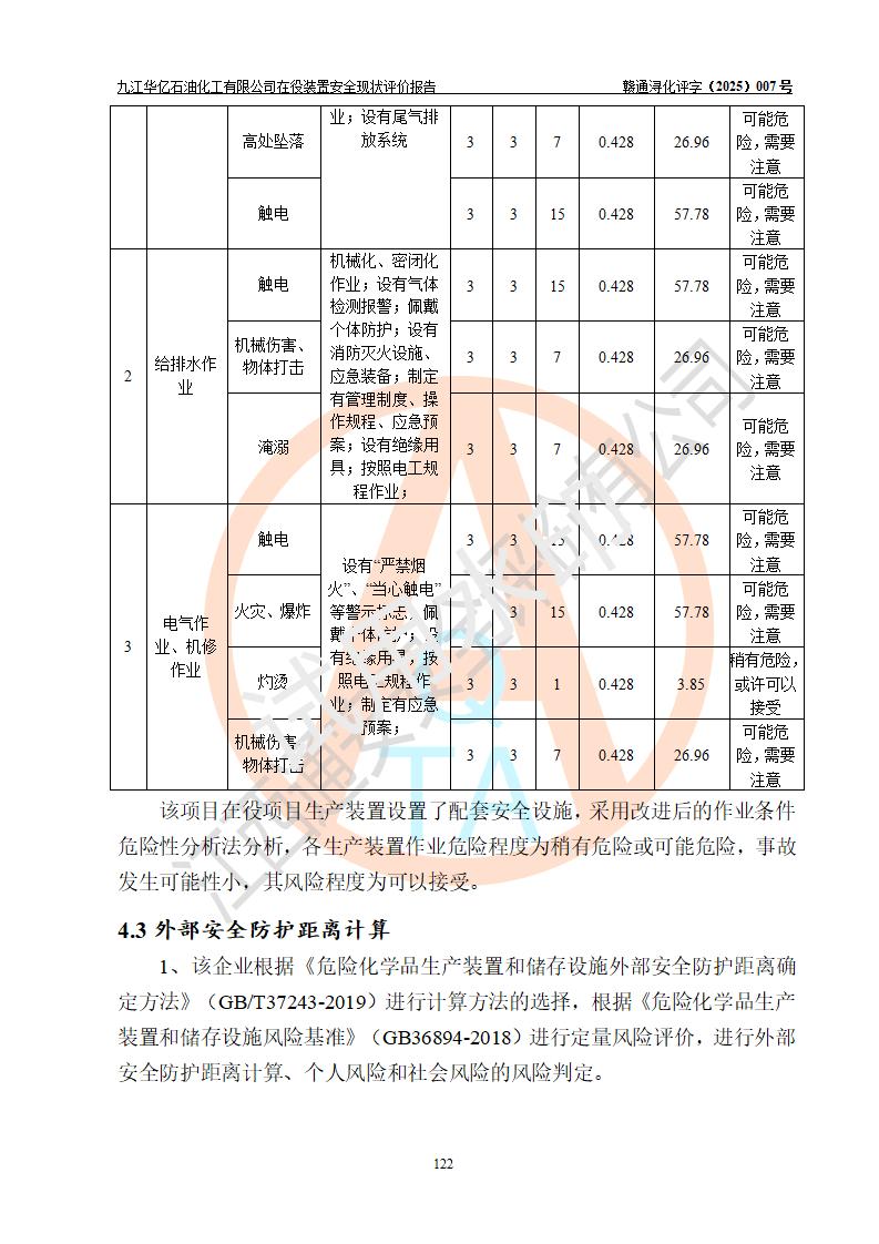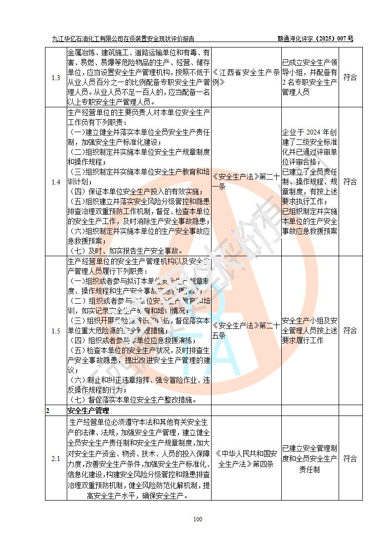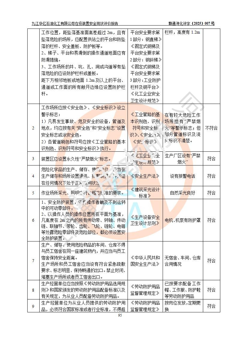 評價結(jié)論 | 經(jīng)評價組評價,九江華億石油化工有限公司現(xiàn)場總體布局、設(shè)備布置、DCS/SIS系統(tǒng)情況與安全設(shè)計圖紙一致;企業(yè)在役裝置涉及重點監(jiān)管危險化學品、重大危險源,相關(guān)自控系統(tǒng)配置與安全設(shè)計相符并正常投用;企業(yè)主要負責人董事長、總經(jīng)理、生產(chǎn)、技術(shù)、設(shè)備負責人及安全管理人員均已具有化工類大專以上相關(guān)專業(yè)學歷,已取得危險化學品生產(chǎn)企業(yè)主要負責人及安全管理人員考核合格證。 九江華億石油化工有限公司在役生產(chǎn)裝置配套安全裝置、防護設(shè)施以及采取的安全技術(shù)措施及安全管理措施符合**有關(guān)法規(guī)、標準、規(guī)范要求,符合《危險化學品生產(chǎn)企業(yè)安全生產(chǎn)許可證實施辦法》規(guī)定的安全生產(chǎn)條件,項目風險可控,滿足安全生產(chǎn)條件。