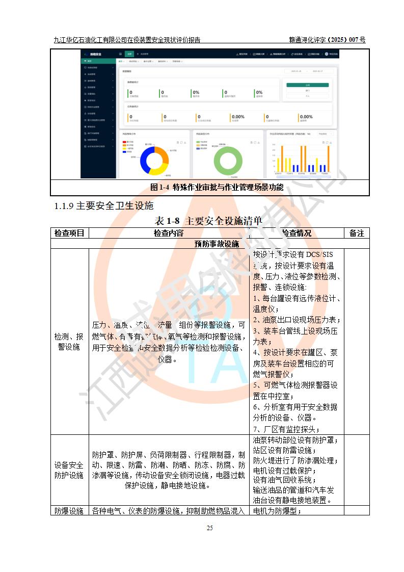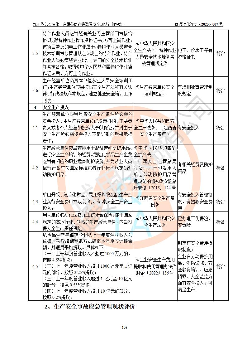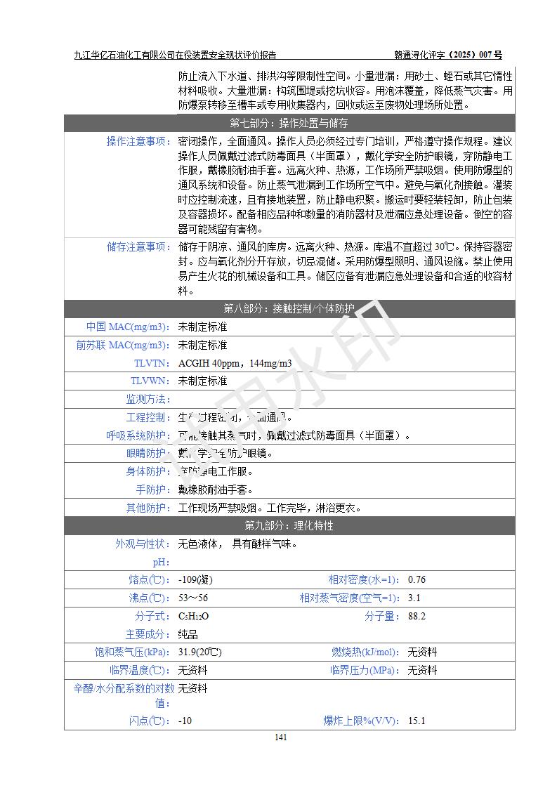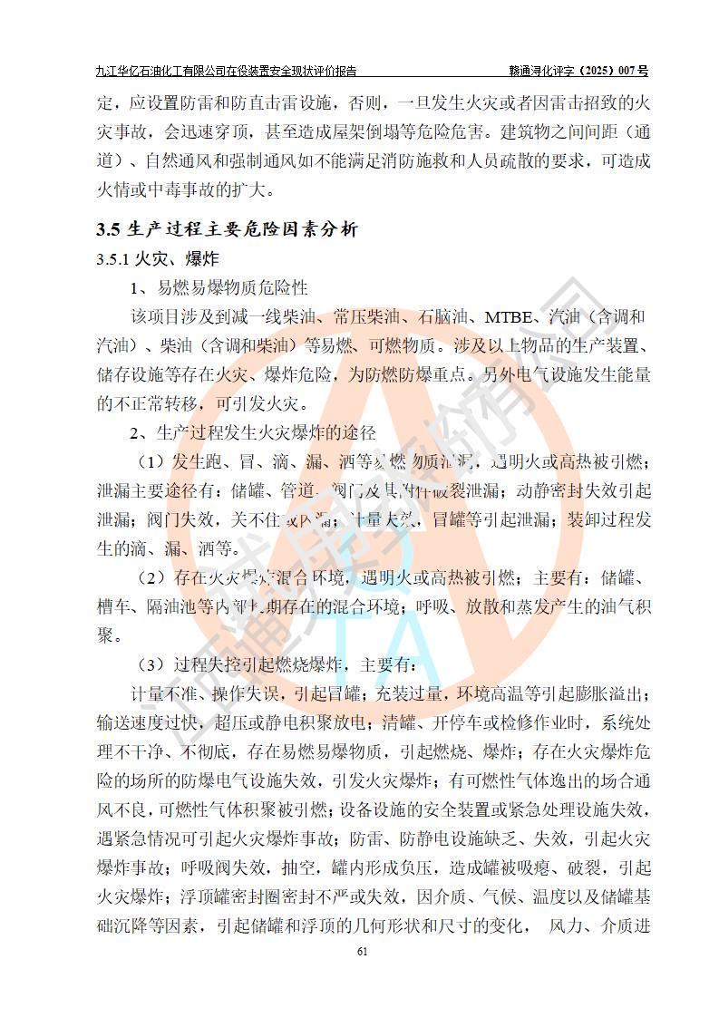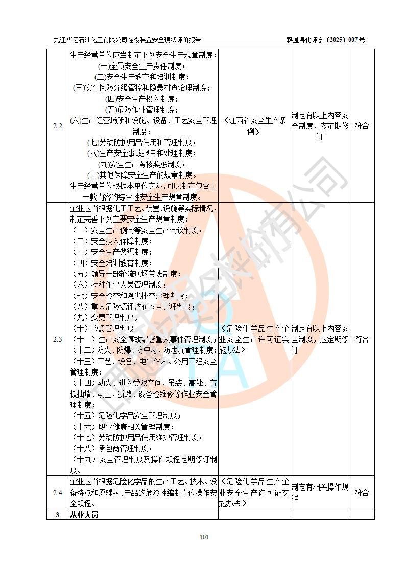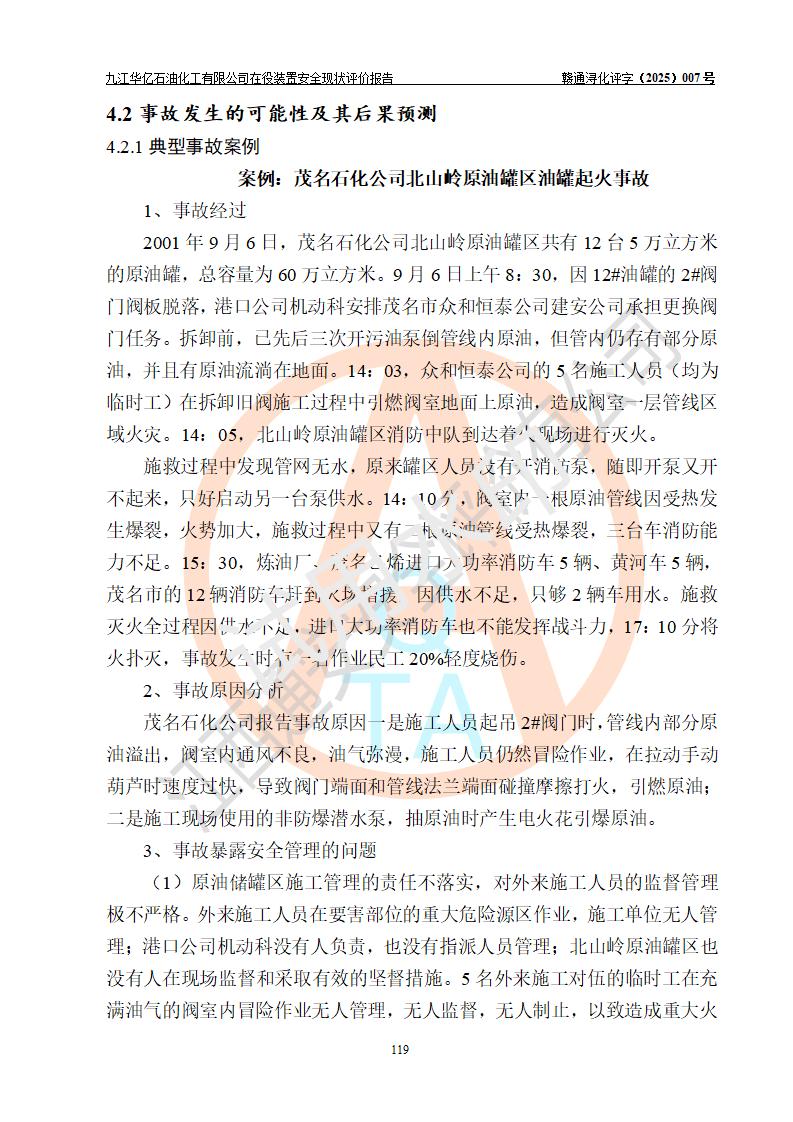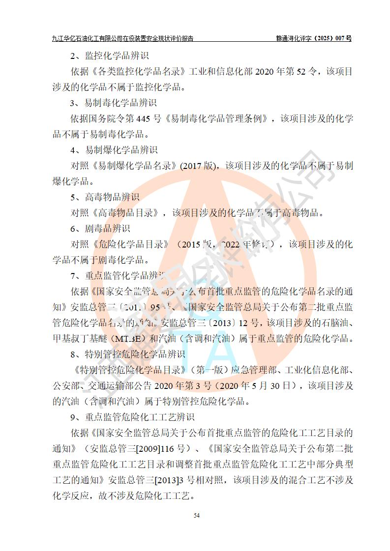 評價結(jié)論 | 經(jīng)評價組評價,九江華億石油化工有限公司現(xiàn)場總體布局、設(shè)備布置、DCS/SIS系統(tǒng)情況與安全設(shè)計圖紙一致;企業(yè)在役裝置涉及重點監(jiān)管危險化學品、重大危險源,相關(guān)自控系統(tǒng)配置與安全設(shè)計相符并正常投用;企業(yè)主要負責人董事長、總經(jīng)理、生產(chǎn)、技術(shù)、設(shè)備負責人及安全管理人員均已具有化工類大專以上相關(guān)專業(yè)學歷,已取得危險化學品生產(chǎn)企業(yè)主要負責人及安全管理人員考核合格證。 九江華億石油化工有限公司在役生產(chǎn)裝置配套安全裝置、防護設(shè)施以及采取的安全技術(shù)措施及安全管理措施符合**有關(guān)法規(guī)、標準、規(guī)范要求,符合《危險化學品生產(chǎn)企業(yè)安全生產(chǎn)許可證實施辦法》規(guī)定的安全生產(chǎn)條件,項目風險可控,滿足安全生產(chǎn)條件。
