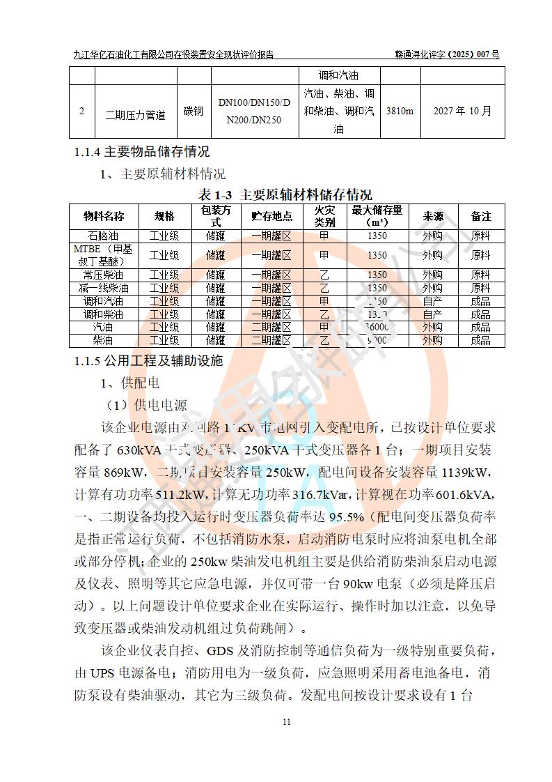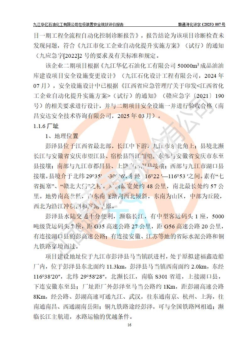 項目簡介 | 九江華億石油化工有限公司成立于2013年6月,注冊資本200萬元,經(jīng)營范圍主要為成品油、燃料油、潤滑油、石油及石油制品、化工原料及產(chǎn)品的生產(chǎn)、倉儲、批發(fā)、銷售、配送;各種常規(guī)能源和新能源的開發(fā)、儲運、銷售;經(jīng)營各類商品、常規(guī)能源和新能源**貿(mào)易及代理服務(wù);提供碼頭裝卸、轉(zhuǎn)運、多式聯(lián)運服務(wù)等業(yè)務(wù)。 九江華億石油化工有限公司位于九江市彭澤縣磯山工業(yè)園馬當鎮(zhèn)工業(yè)區(qū);該企業(yè)調(diào)和汽油(200kt/a)、調(diào)和柴油(200kt/a)生產(chǎn)裝置(一期項目)于2022年06月經(jīng)延期取得危險化學品生產(chǎn)許可證,許可范圍為調(diào)和汽油(200kt/a)、調(diào)和柴油(200kt/a),**期至2025年6月26日;該企業(yè)50000m3成品油油庫(二期項目)于2025年4月1日取得了由九江市行政審批局頒發(fā)的《危險化學品經(jīng)營許可證》(經(jīng)營范圍為汽油、柴油),**期至2028年3月31日。 | |||||