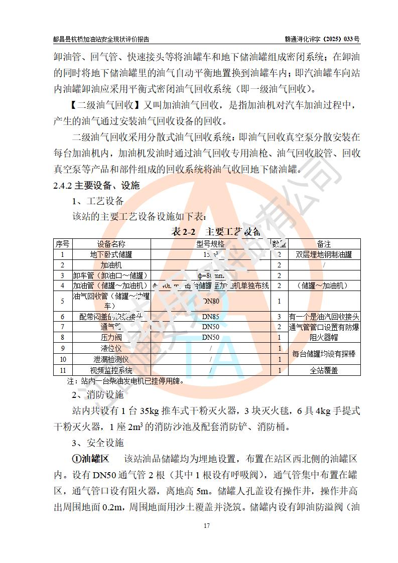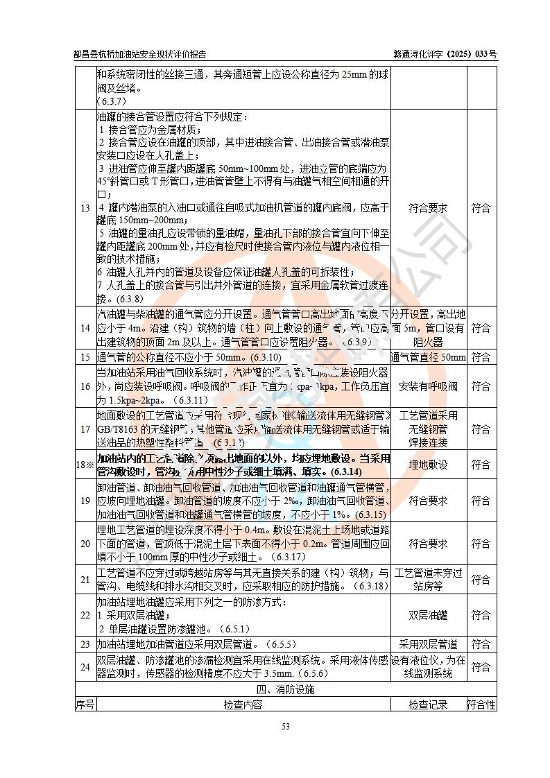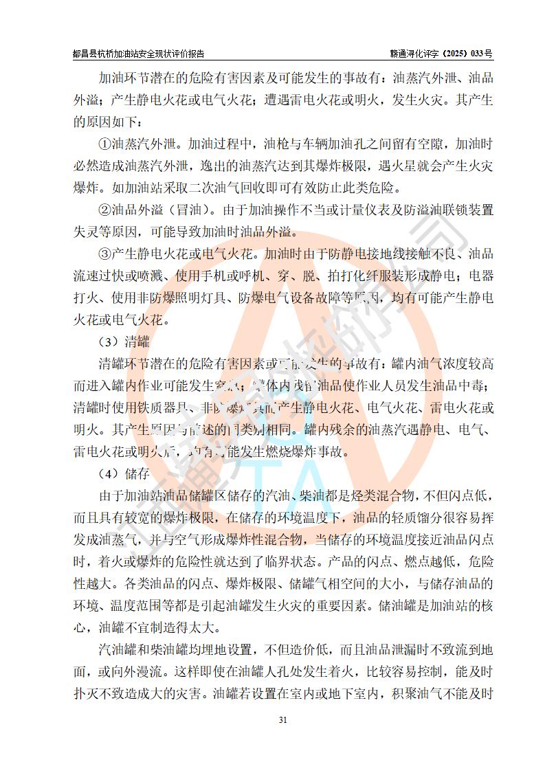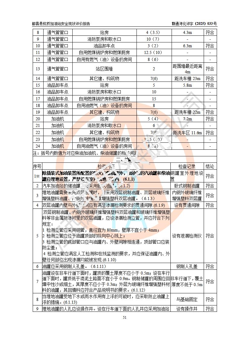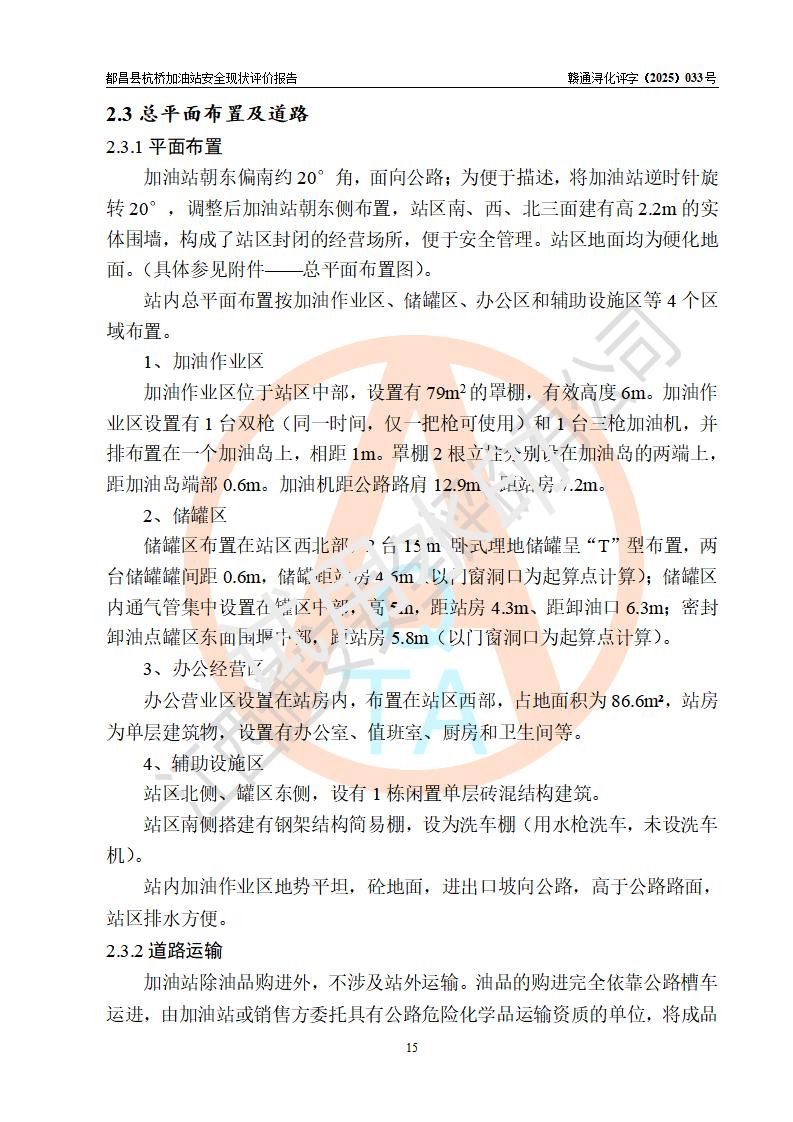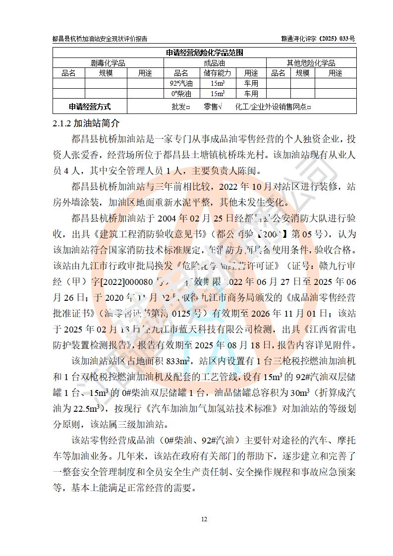 都昌縣杭橋加油站是一家專門從事成品油零售經(jīng)營的個人獨資企業(yè),投資人張愛香,經(jīng)營場所位于都昌縣土塘鎮(zhèn)杭橋珠光村。該加油站現(xiàn)有從業(yè)人員4人,其中安全管理人員1人,主要負(fù)責(zé)人陳閩。 該加油站站區(qū)占地面積833m2,站區(qū)內(nèi)設(shè)置有1臺三槍稅控燃油加油機和1臺雙槍稅控燃油加油機及配套的工藝管線,設(shè)有15m3的92#汽油雙層儲罐1臺、15m3的0#柴油雙層儲罐1臺,油品儲罐總?cè)莘e為30m3(折算成汽油為22.5m3)。按現(xiàn)行《汽車加油加氣加氫站技術(shù)標(biāo)準(zhǔn)》對加油站的等級劃分原則,該站屬于三級加油站。 該站由九江市行政審批局換發(fā)《危險化學(xué)品經(jīng)營許可證》(證號:贛九行審經(jīng)(甲)字[2022]000080號),**期限2022年06月27日至2025年06月26日。 |
