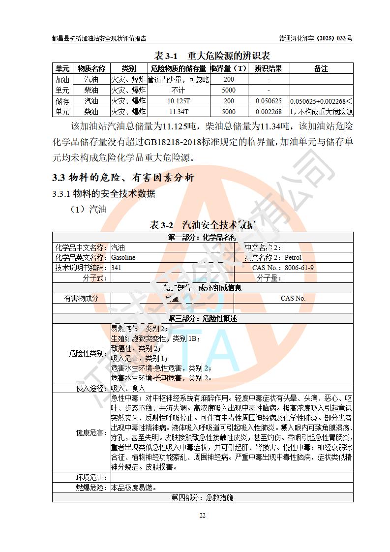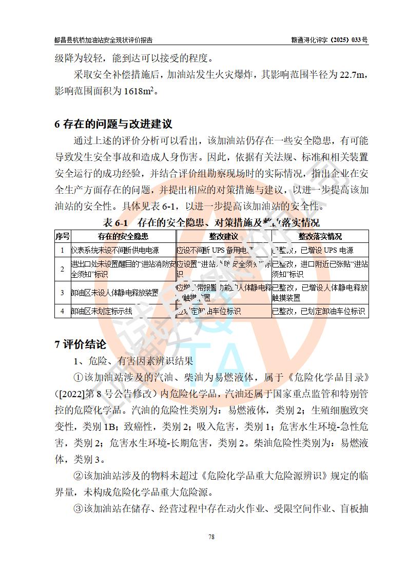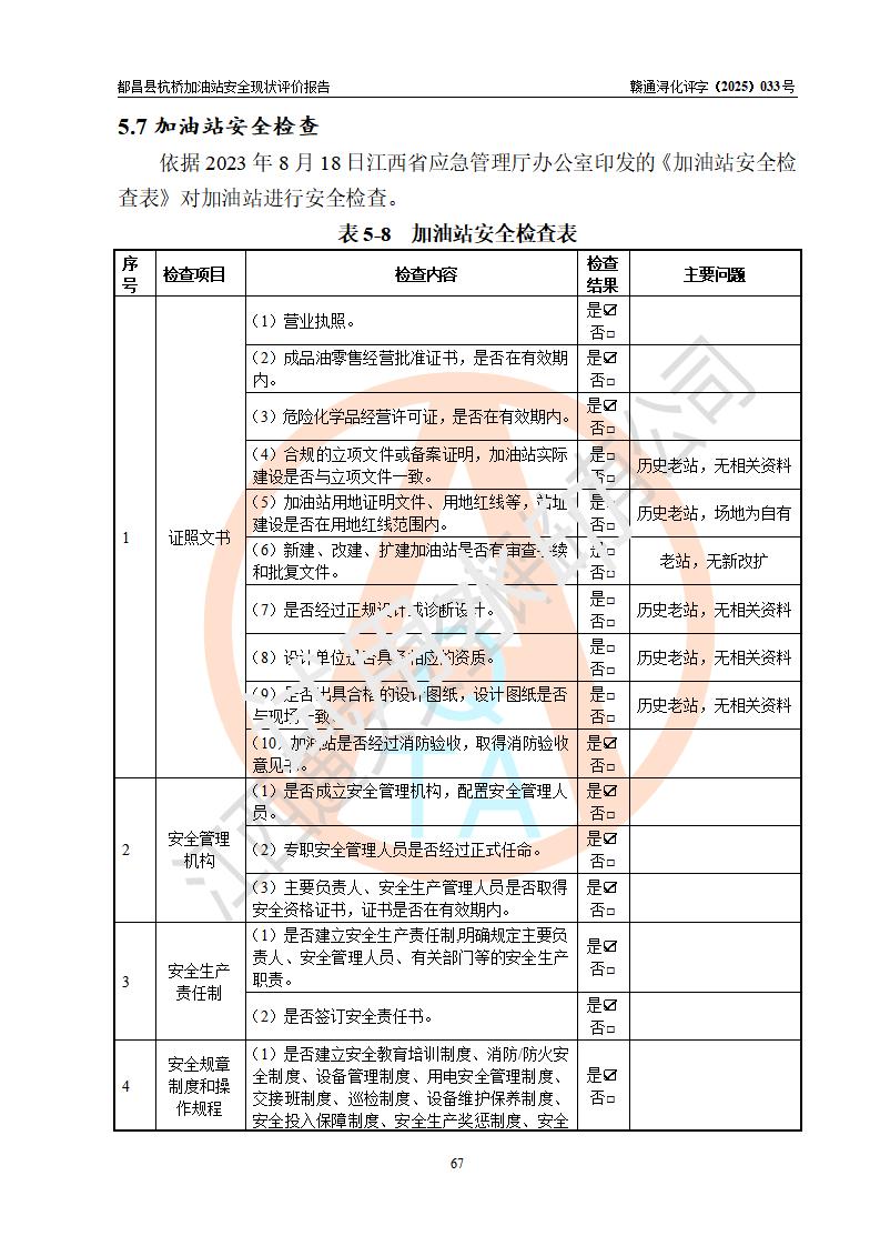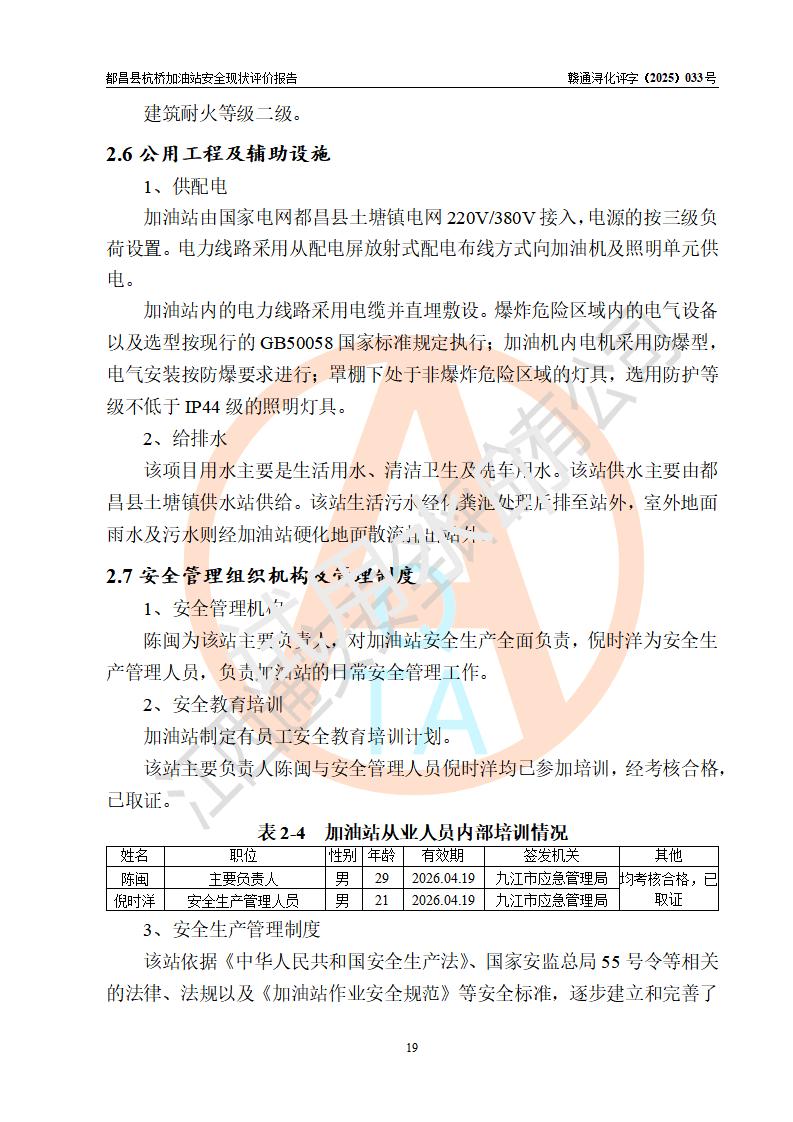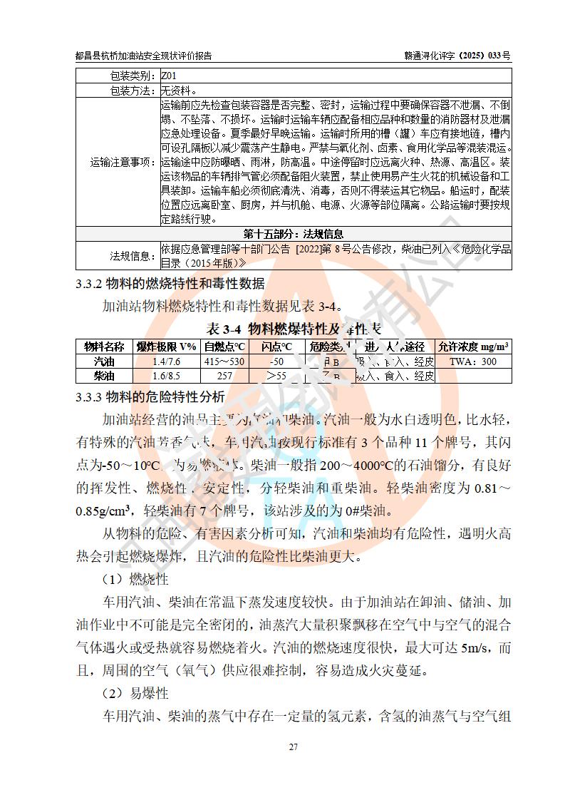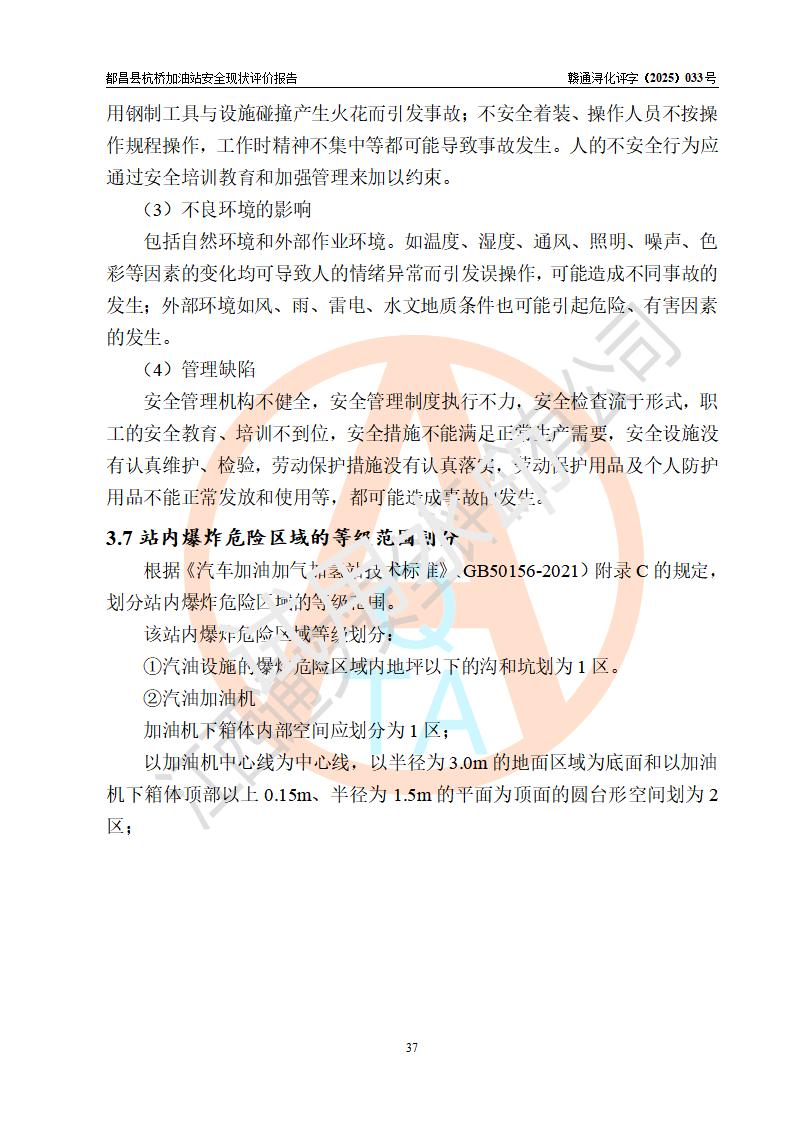 都昌縣杭橋加油站是一家專門從事成品油零售經(jīng)營的個人獨資企業(yè),投資人張愛香,經(jīng)營場所位于都昌縣土塘鎮(zhèn)杭橋珠光村。該加油站現(xiàn)有從業(yè)人員4人,其中安全管理人員1人,主要負(fù)責(zé)人陳閩。 該加油站站區(qū)占地面積833m2,站區(qū)內(nèi)設(shè)置有1臺三槍稅控燃油加油機和1臺雙槍稅控燃油加油機及配套的工藝管線,設(shè)有15m3的92#汽油雙層儲罐1臺、15m3的0#柴油雙層儲罐1臺,油品儲罐總?cè)莘e為30m3(折算成汽油為22.5m3)。按現(xiàn)行《汽車加油加氣加氫站技術(shù)標(biāo)準(zhǔn)》對加油站的等級劃分原則,該站屬于三級加油站。 該站由九江市行政審批局換發(fā)《危險化學(xué)品經(jīng)營許可證》(證號:贛九行審經(jīng)(甲)字[2022]000080號),**期限2022年06月27日至2025年06月26日。 |