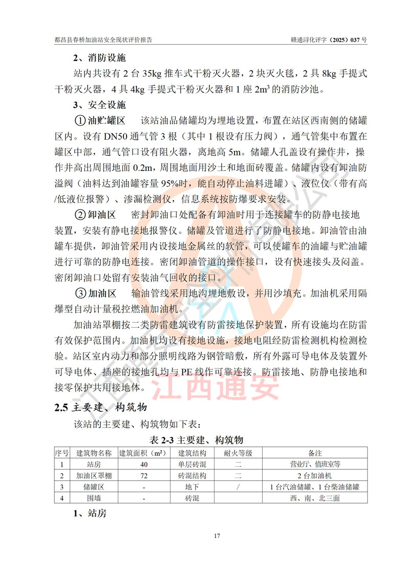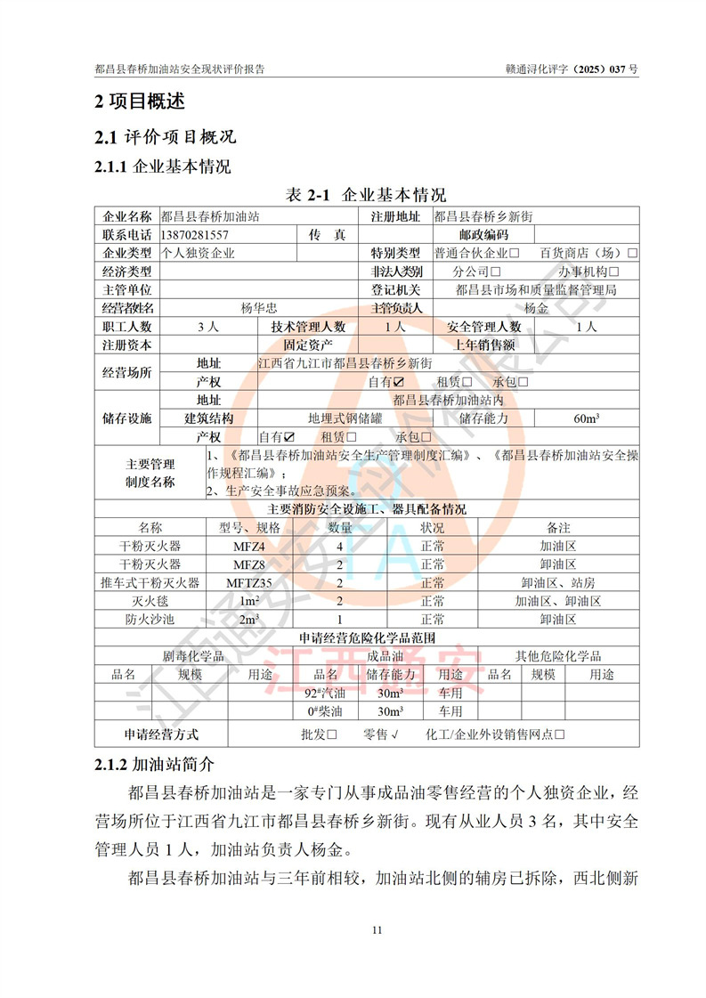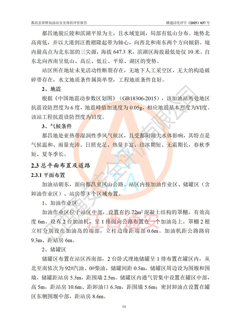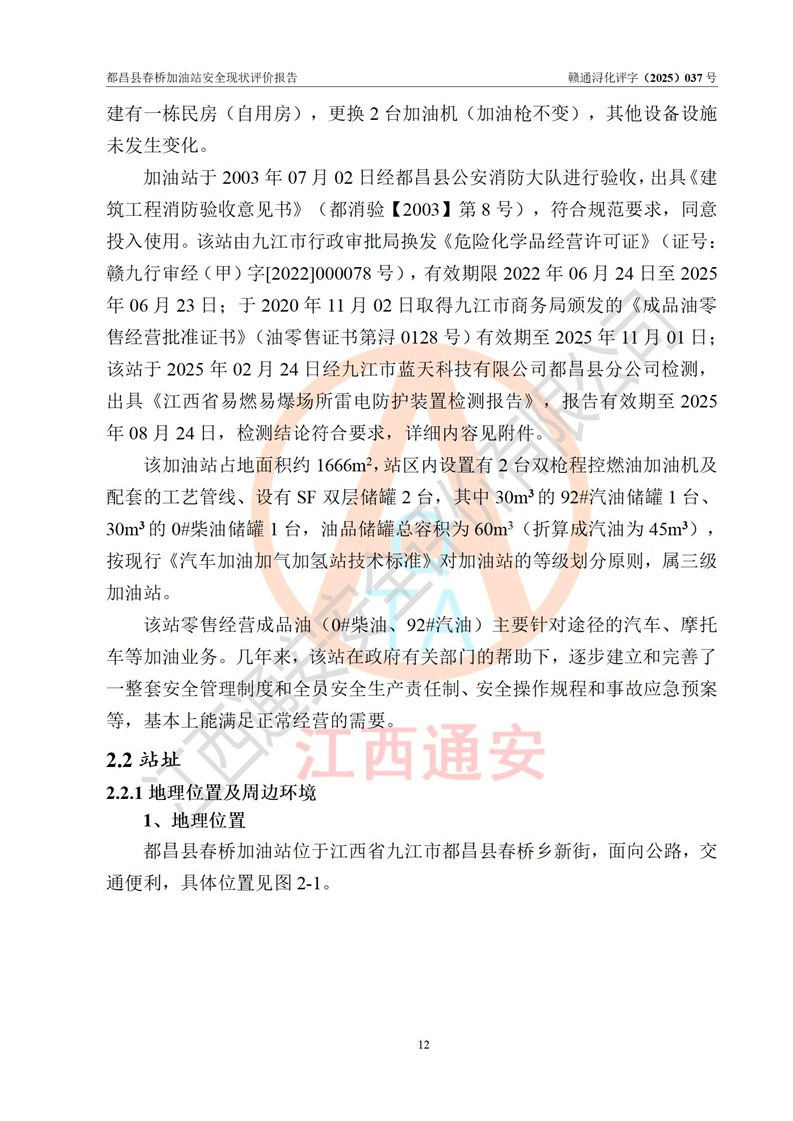 項(xiàng)目簡(jiǎn)介 | 都昌縣春橋加油站是一家專門從事成品油零售經(jīng)營(yíng)的個(gè)人獨(dú)資企業(yè),經(jīng)營(yíng)場(chǎng)所位于江西省九江市都昌縣春橋鄉(xiāng)新街。現(xiàn)有從業(yè)人員3名,其中安全管理人員1人,加油站負(fù)責(zé)人楊金。 該加油站占地面積約1666m2,站區(qū)內(nèi)設(shè)置有2臺(tái)雙槍程控燃油加油機(jī)及配套的工藝管線、設(shè)有SF雙層儲(chǔ)罐2臺(tái),其中30m3的92#汽油儲(chǔ)罐1臺(tái)、30m3的0#柴油儲(chǔ)罐1臺(tái),油品儲(chǔ)罐總?cè)莘e為60m3(折算成汽油為45m3),按現(xiàn)行《汽車加油加氣加氫站技術(shù)標(biāo)準(zhǔn)》對(duì)加油站的等級(jí)劃分原則,屬三級(jí)加油站。 該站由九江市行政審批局換發(fā)《危險(xiǎn)化學(xué)品經(jīng)營(yíng)許可證》(證號(hào):贛九行審經(jīng)(甲)字[2022]000078號(hào)),**期限2022年06月24日至2025年06月23日。 | |||