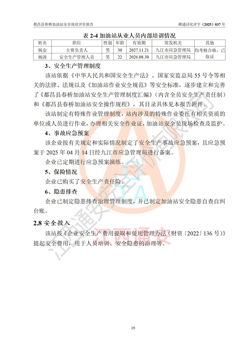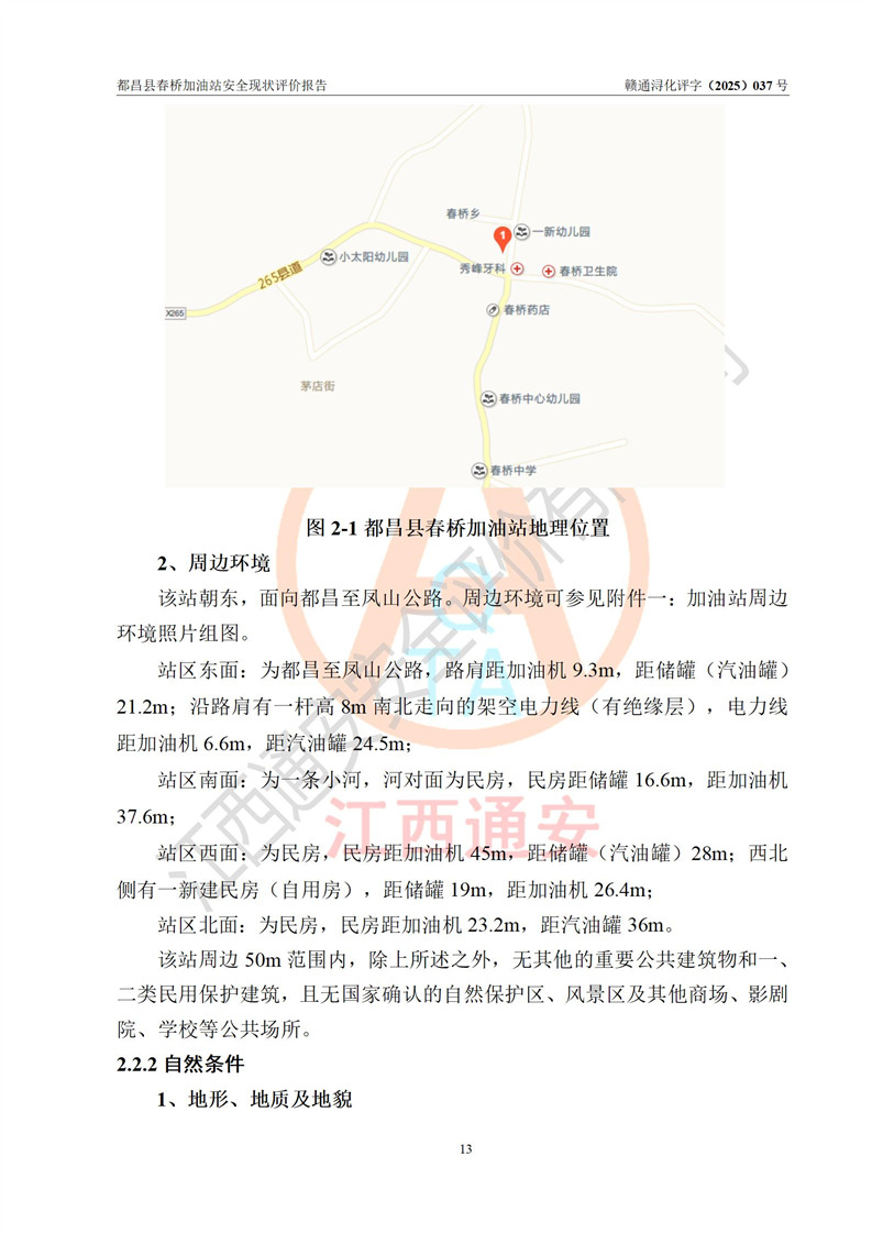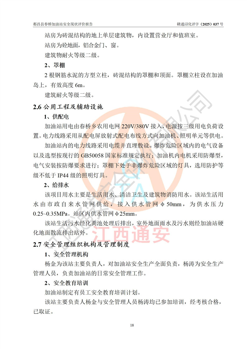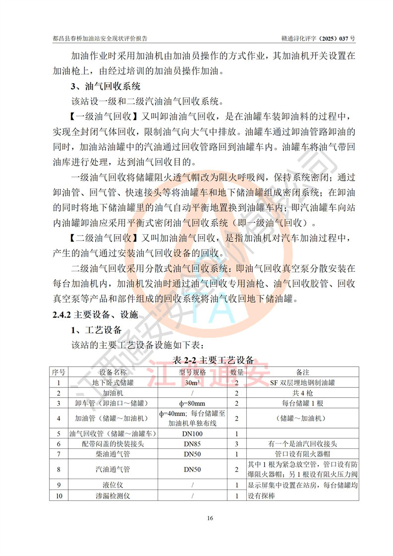 項(xiàng)目簡(jiǎn)介 | 都昌縣春橋加油站是一家專門從事成品油零售經(jīng)營(yíng)的個(gè)人獨(dú)資企業(yè),經(jīng)營(yíng)場(chǎng)所位于江西省九江市都昌縣春橋鄉(xiāng)新街。現(xiàn)有從業(yè)人員3名,其中安全管理人員1人,加油站負(fù)責(zé)人楊金。 該加油站占地面積約1666m2,站區(qū)內(nèi)設(shè)置有2臺(tái)雙槍程控燃油加油機(jī)及配套的工藝管線、設(shè)有SF雙層儲(chǔ)罐2臺(tái),其中30m3的92#汽油儲(chǔ)罐1臺(tái)、30m3的0#柴油儲(chǔ)罐1臺(tái),油品儲(chǔ)罐總?cè)莘e為60m3(折算成汽油為45m3),按現(xiàn)行《汽車加油加氣加氫站技術(shù)標(biāo)準(zhǔn)》對(duì)加油站的等級(jí)劃分原則,屬三級(jí)加油站。 該站由九江市行政審批局換發(fā)《危險(xiǎn)化學(xué)品經(jīng)營(yíng)許可證》(證號(hào):贛九行審經(jīng)(甲)字[2022]000078號(hào)),**期限2022年06月24日至2025年06月23日。 | |||