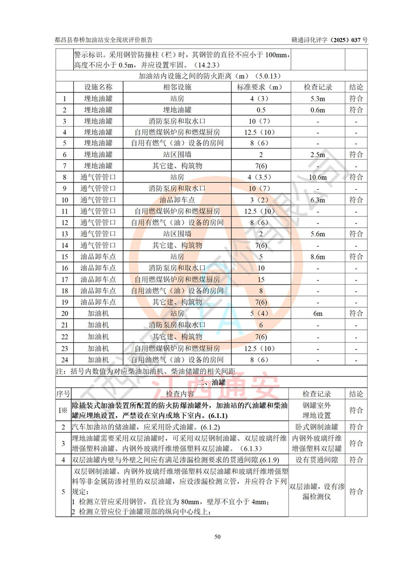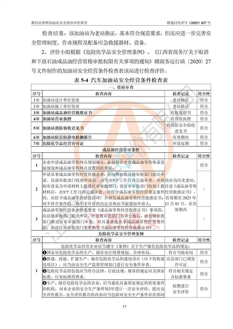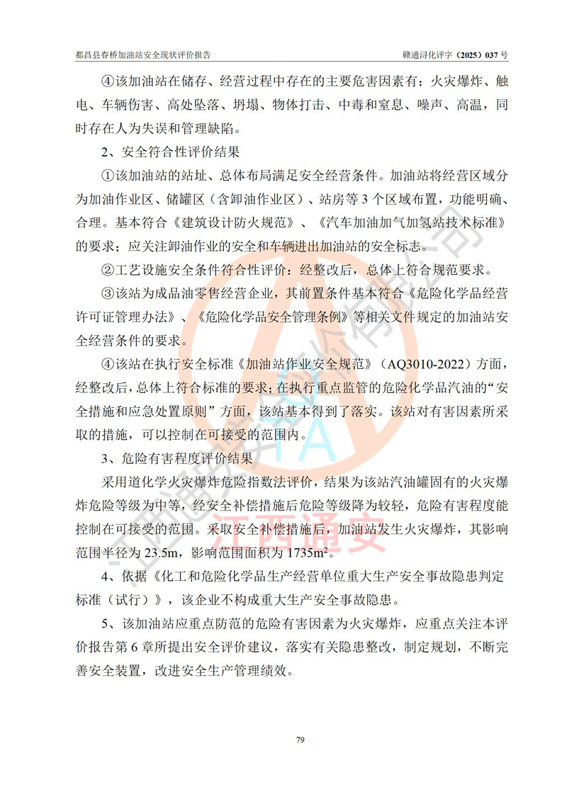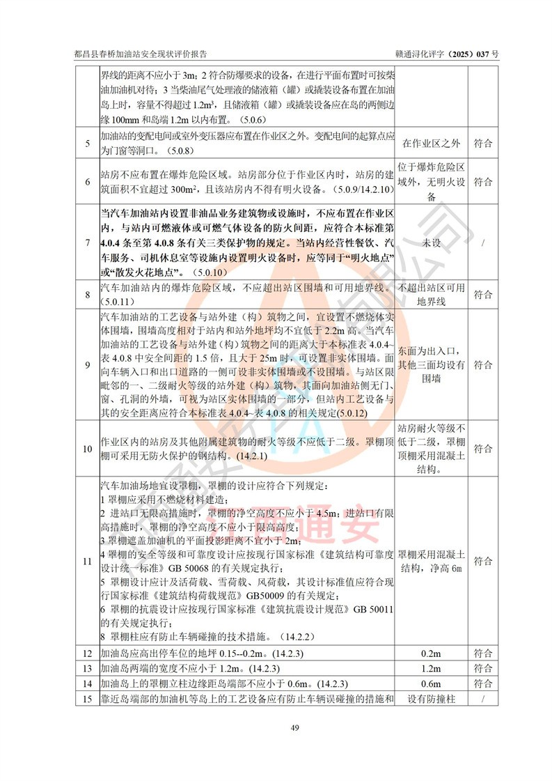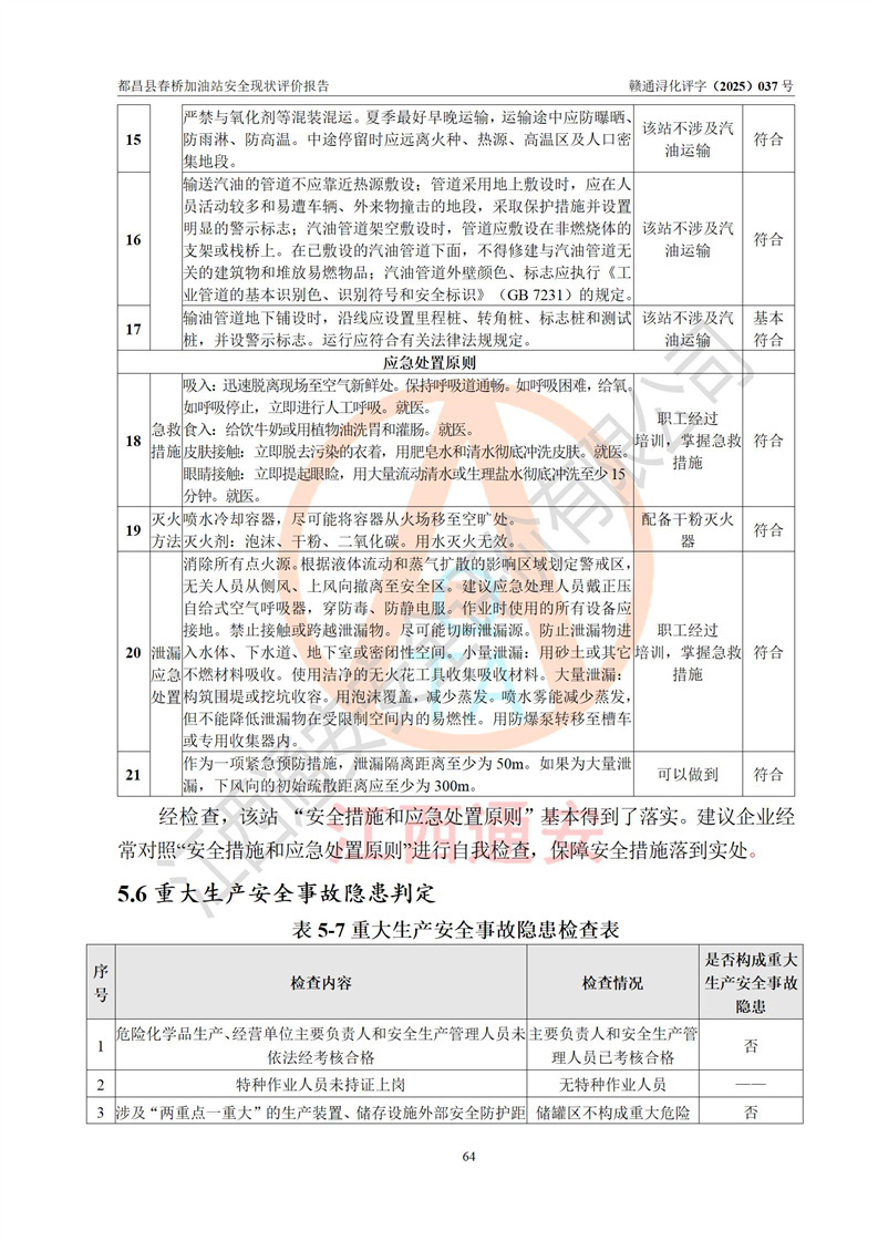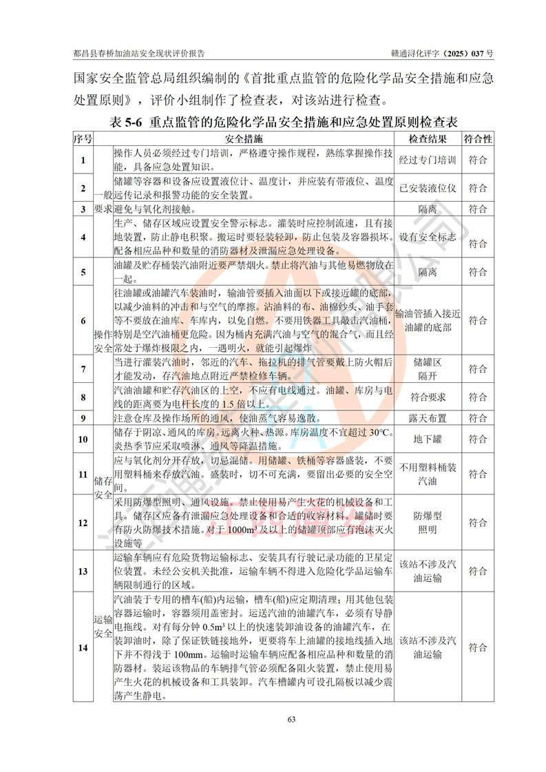 評(píng)價(jià)結(jié)論 | 都昌縣春橋加油站涉及的安全條件、安全經(jīng)營(yíng)條件、安全生產(chǎn)管理符合《危險(xiǎn)化學(xué)品經(jīng)營(yíng)許可證管理辦法》、《汽車加油加氣加氫站技術(shù)標(biāo)準(zhǔn)》等**有關(guān)法規(guī)、標(biāo)準(zhǔn)、規(guī)范要求,能滿足危險(xiǎn)化學(xué)品經(jīng)營(yíng)安全條件。 | |||