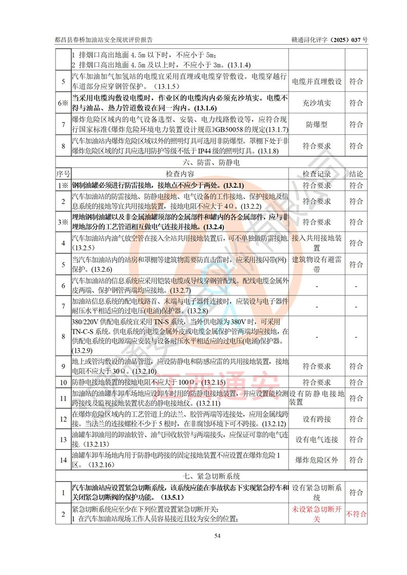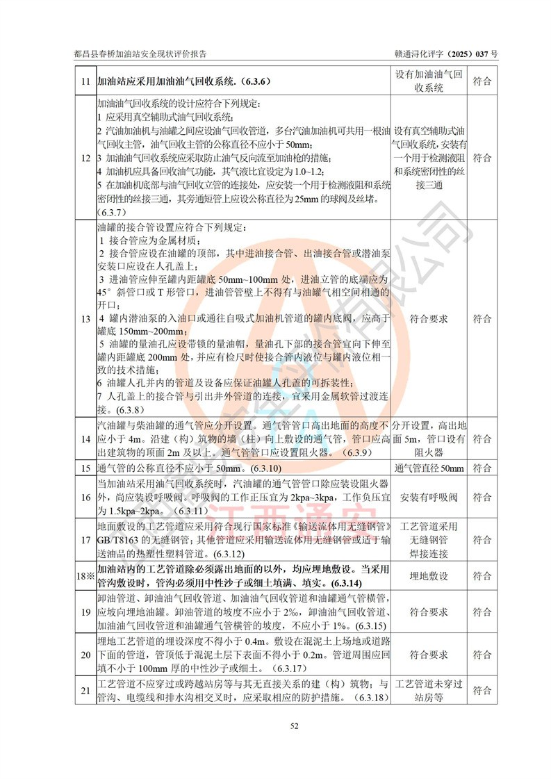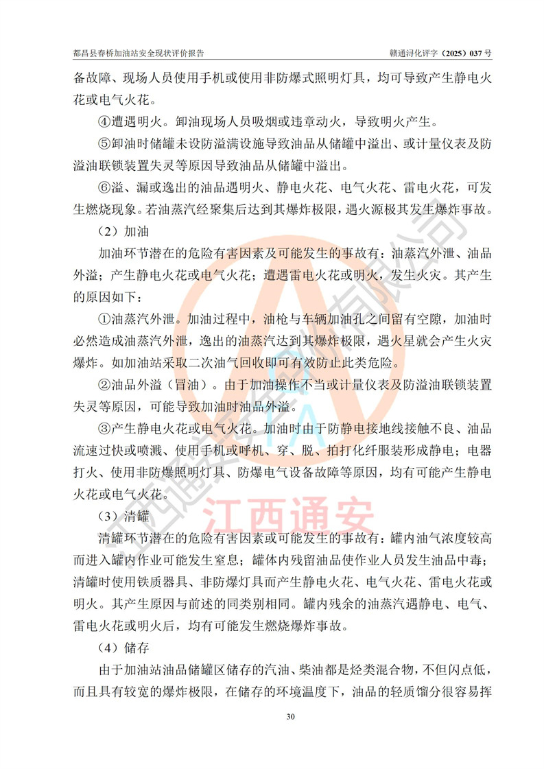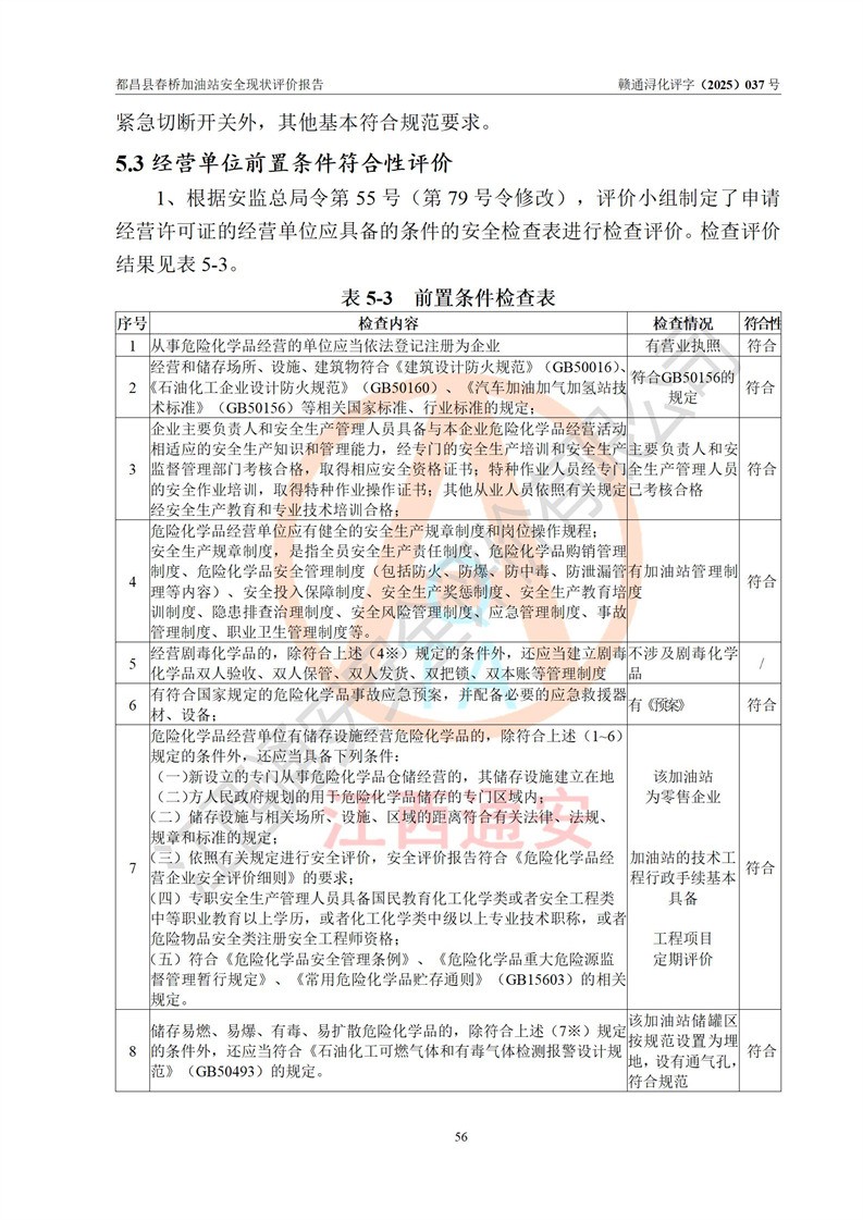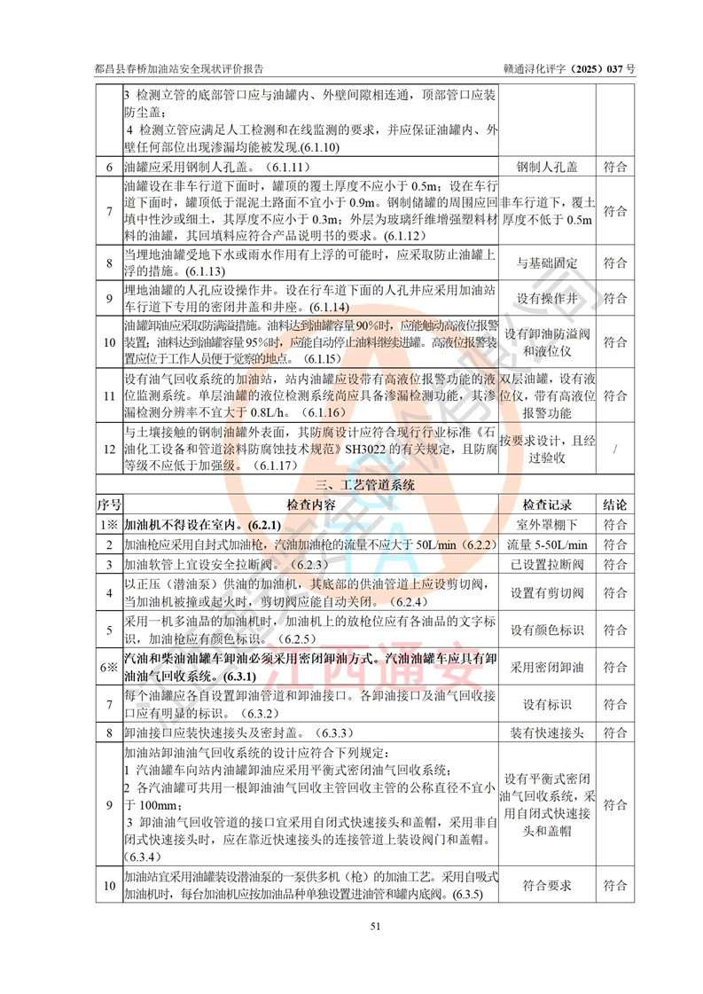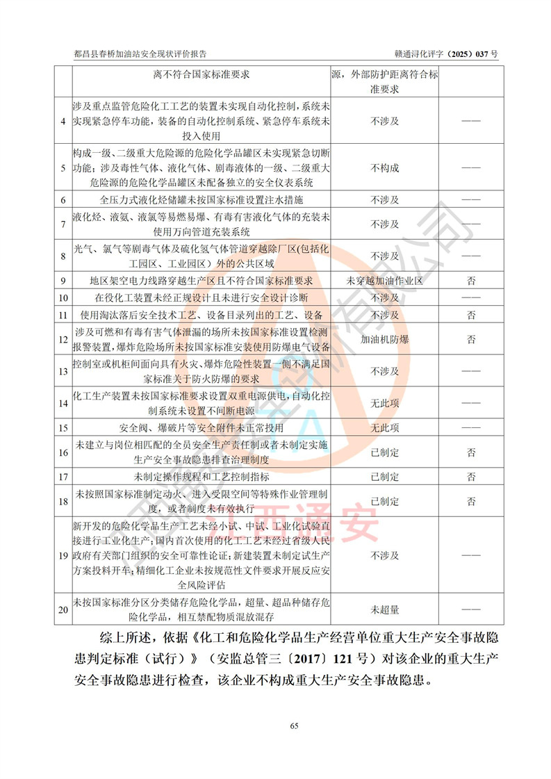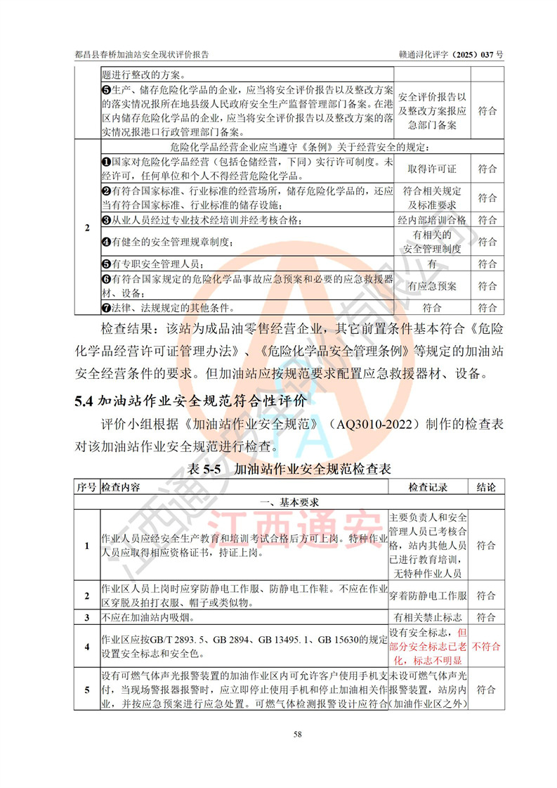 評(píng)價(jià)結(jié)論 | 都昌縣春橋加油站涉及的安全條件、安全經(jīng)營(yíng)條件、安全生產(chǎn)管理符合《危險(xiǎn)化學(xué)品經(jīng)營(yíng)許可證管理辦法》、《汽車加油加氣加氫站技術(shù)標(biāo)準(zhǔn)》等**有關(guān)法規(guī)、標(biāo)準(zhǔn)、規(guī)范要求,能滿足危險(xiǎn)化學(xué)品經(jīng)營(yíng)安全條件。 | |||