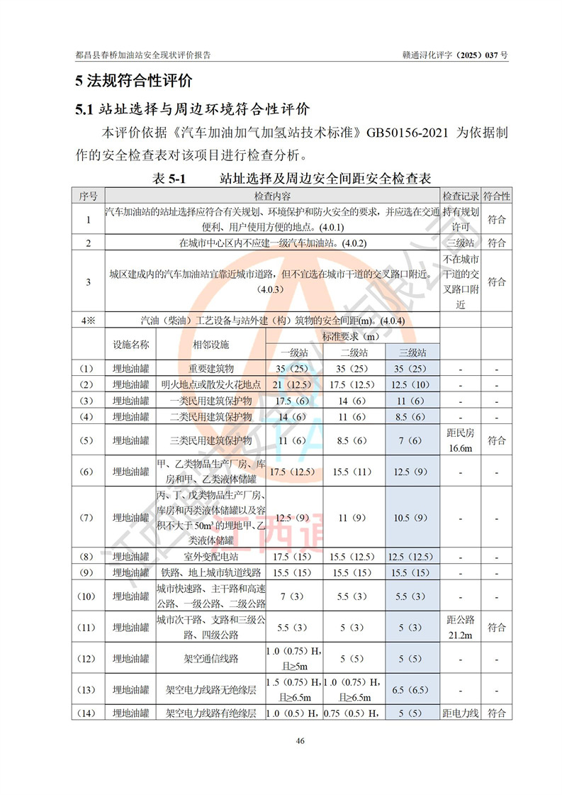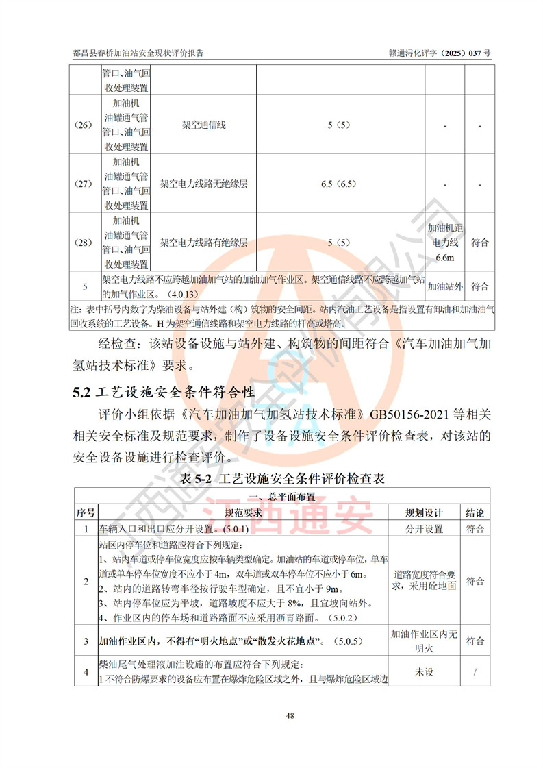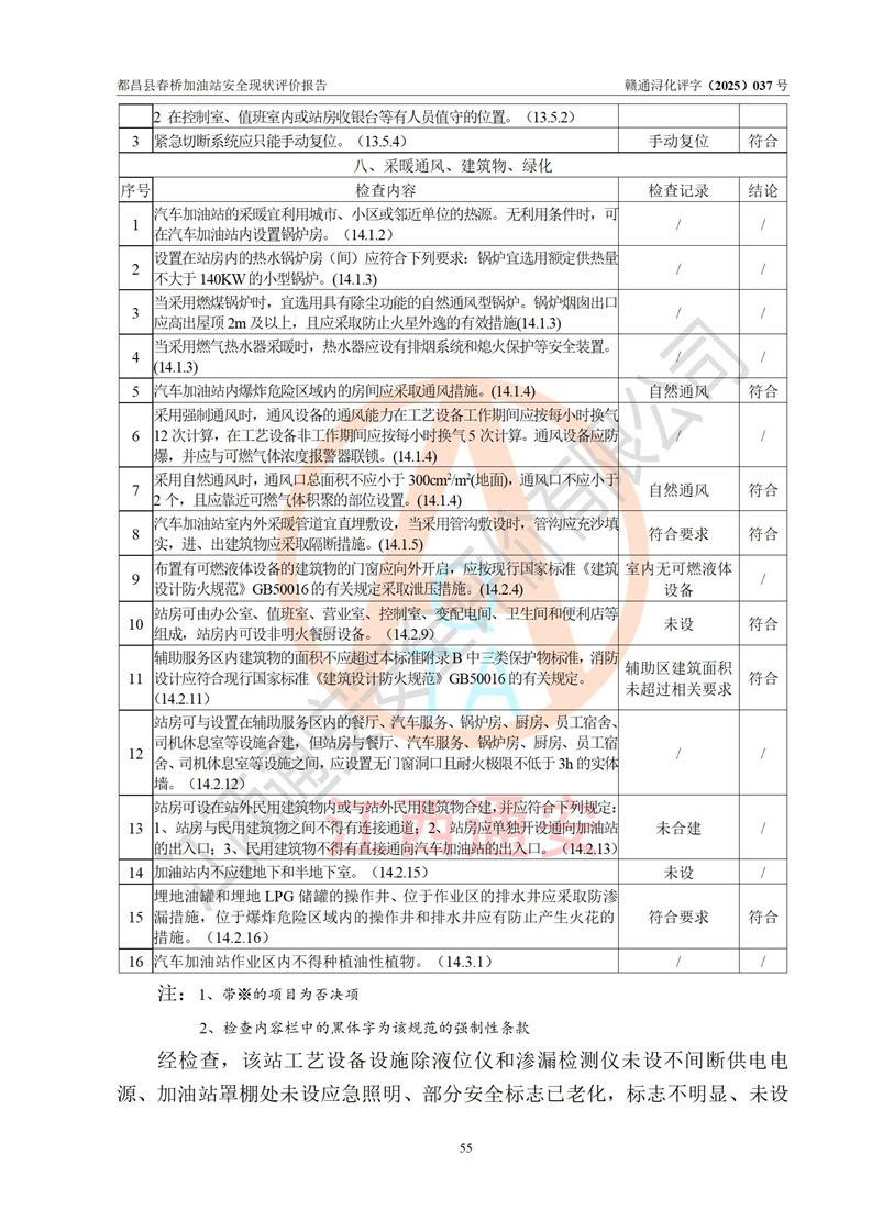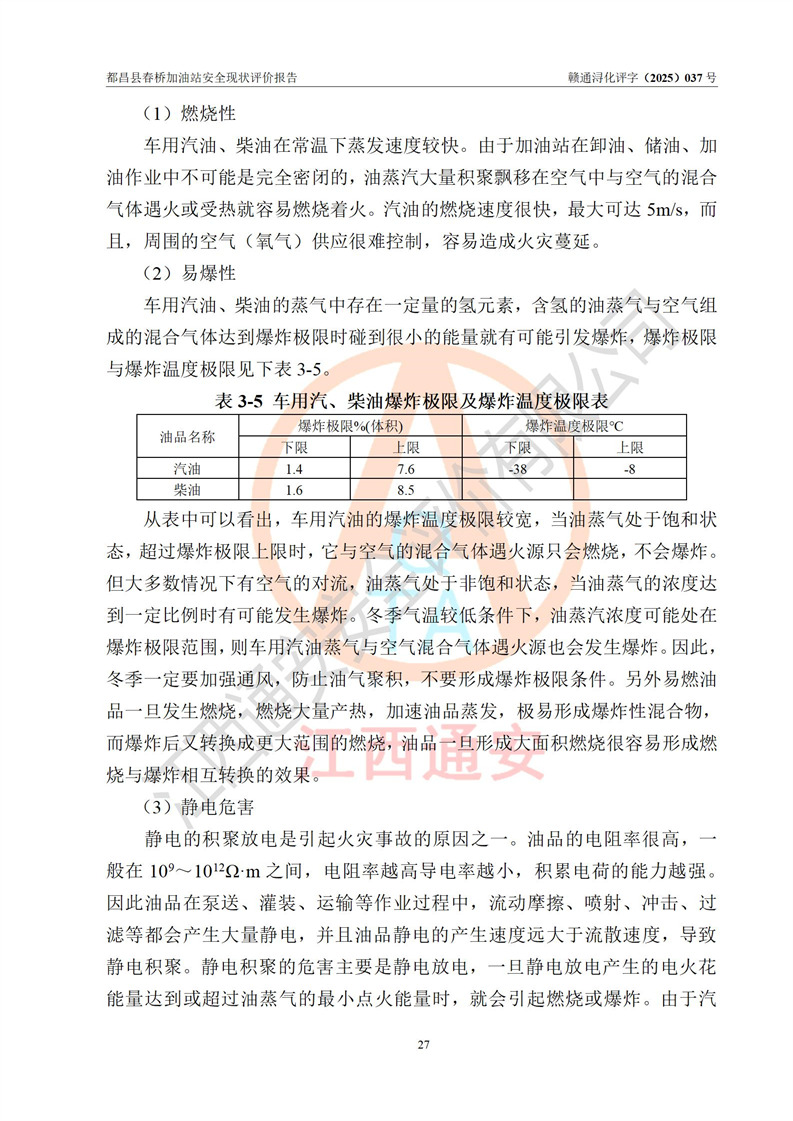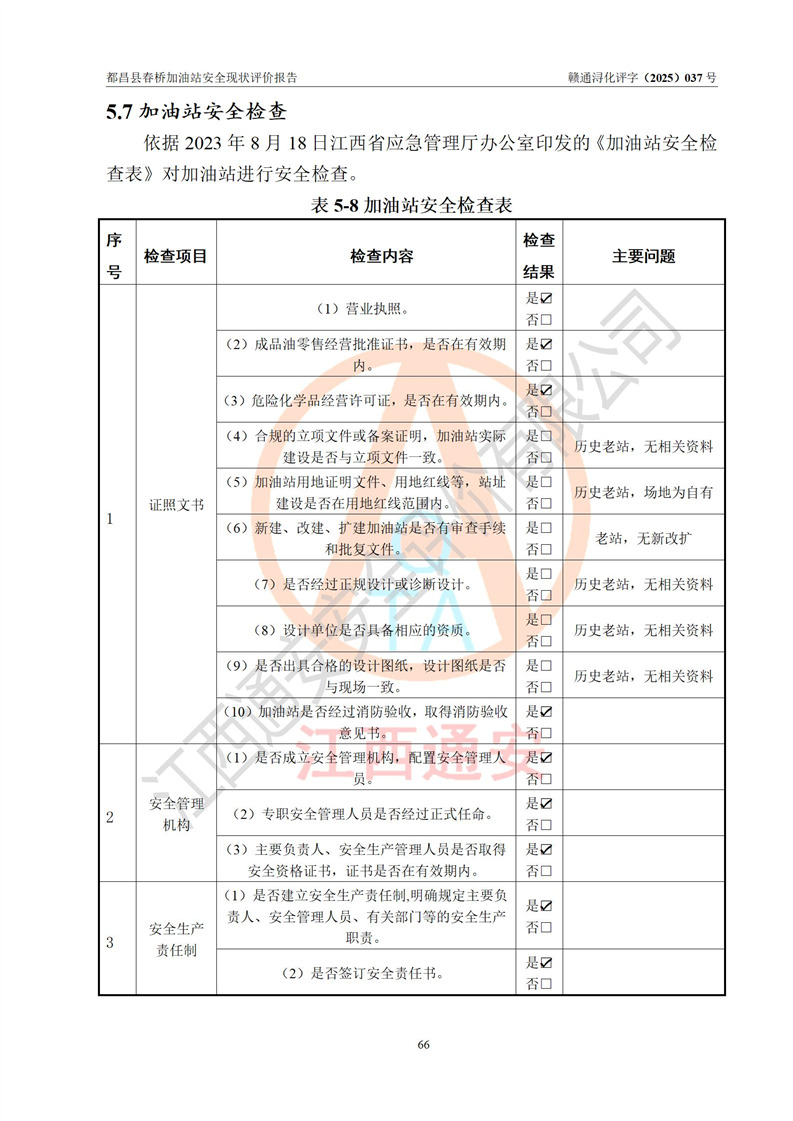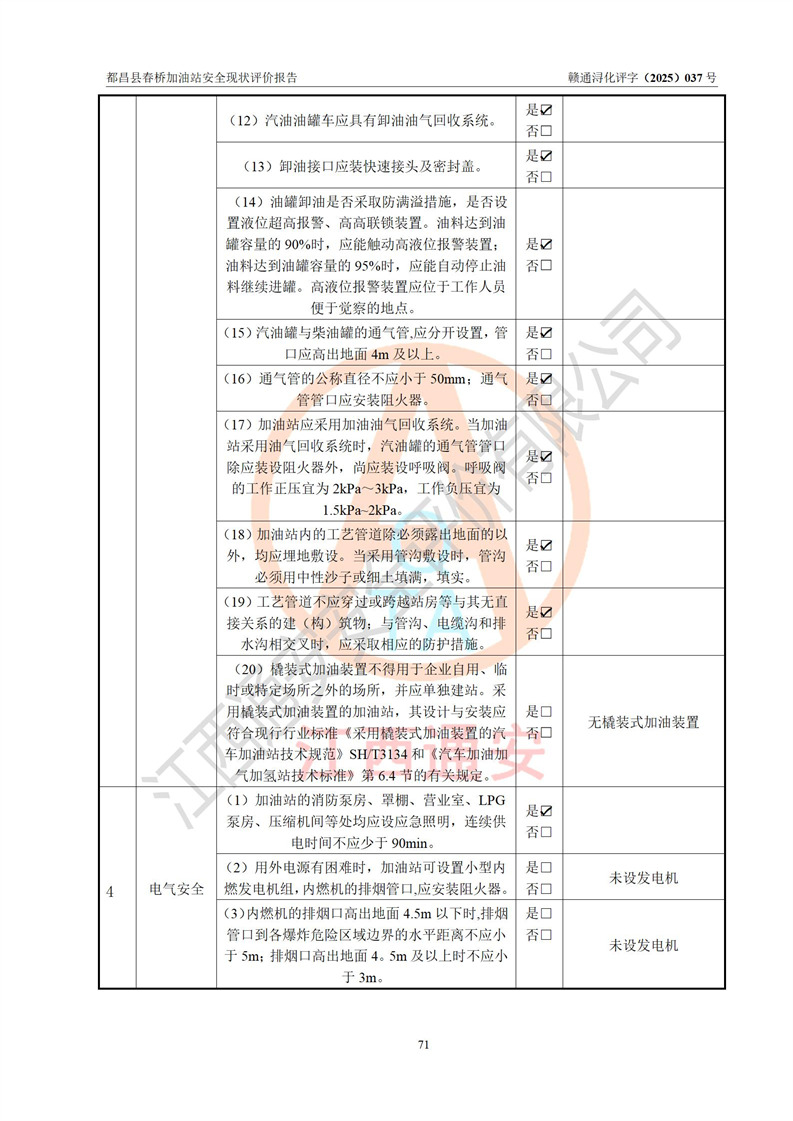 評(píng)價(jià)結(jié)論 | 都昌縣春橋加油站涉及的安全條件、安全經(jīng)營(yíng)條件、安全生產(chǎn)管理符合《危險(xiǎn)化學(xué)品經(jīng)營(yíng)許可證管理辦法》、《汽車加油加氣加氫站技術(shù)標(biāo)準(zhǔn)》等**有關(guān)法規(guī)、標(biāo)準(zhǔn)、規(guī)范要求,能滿足危險(xiǎn)化學(xué)品經(jīng)營(yíng)安全條件。 | |||