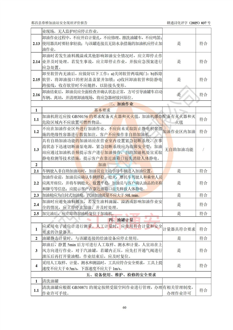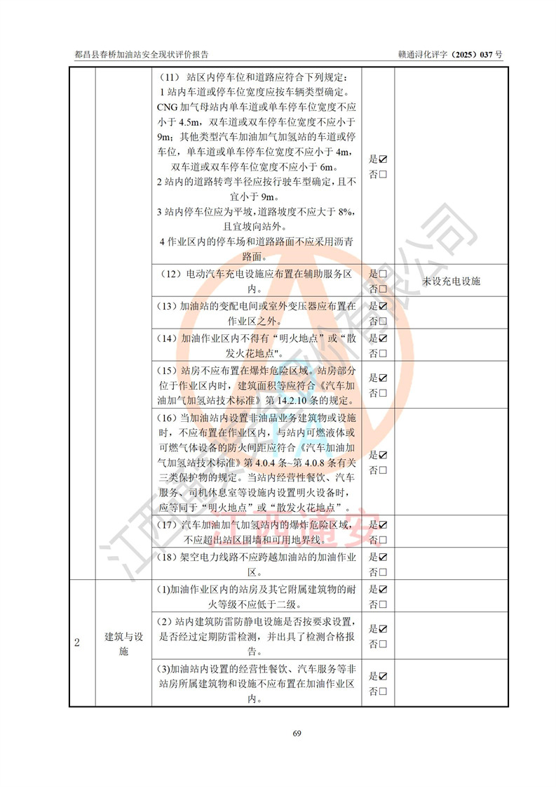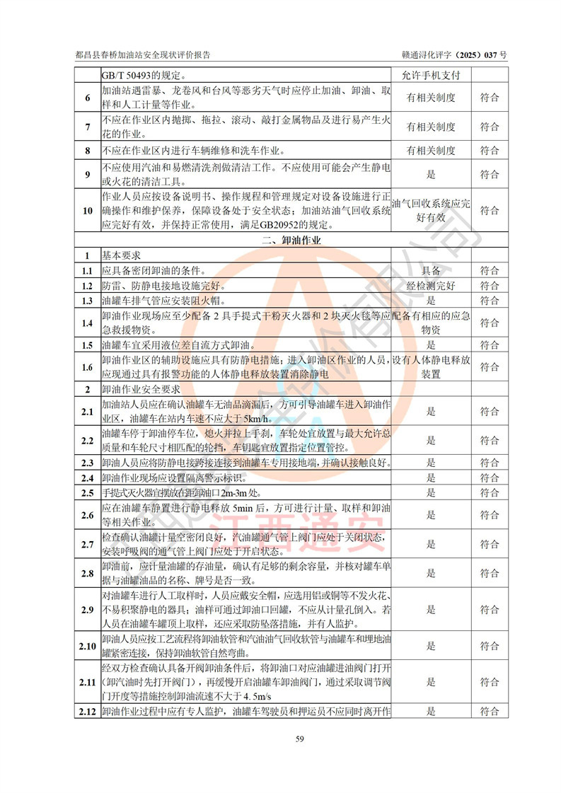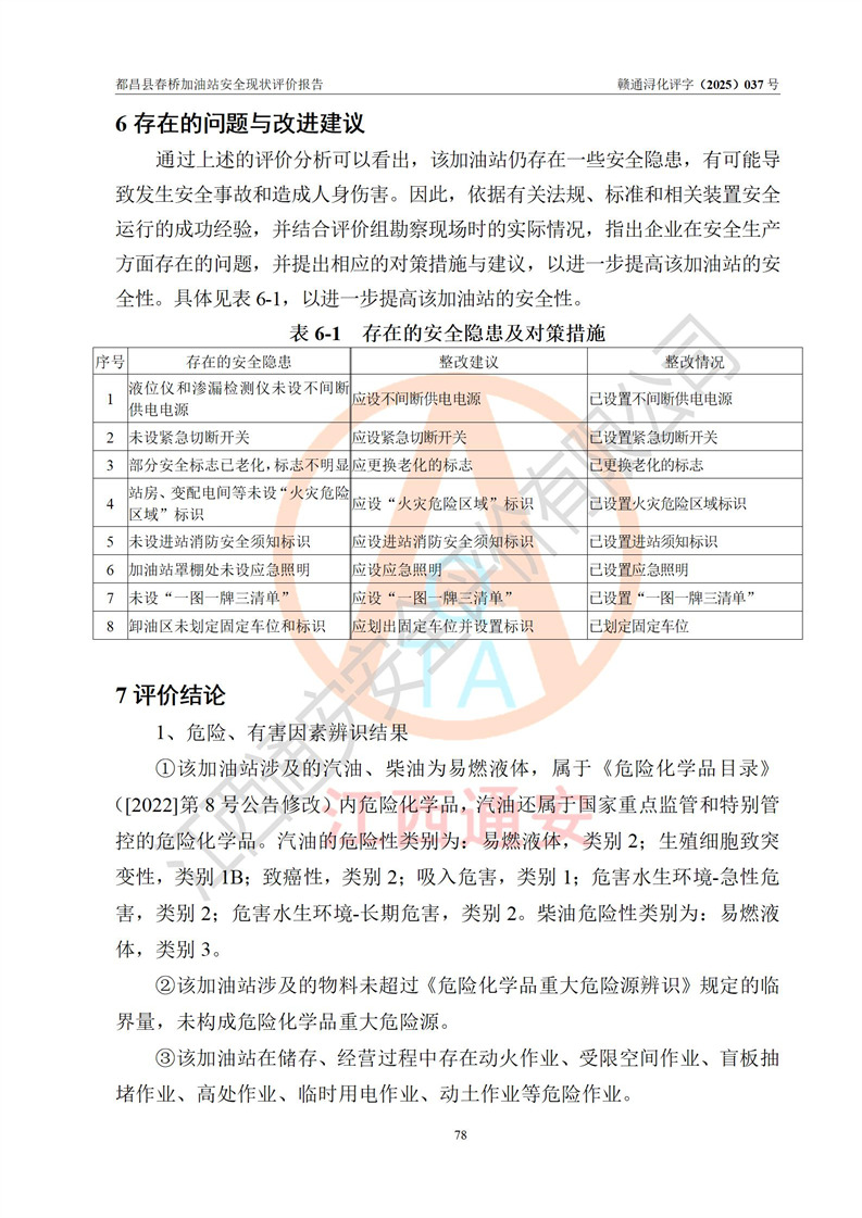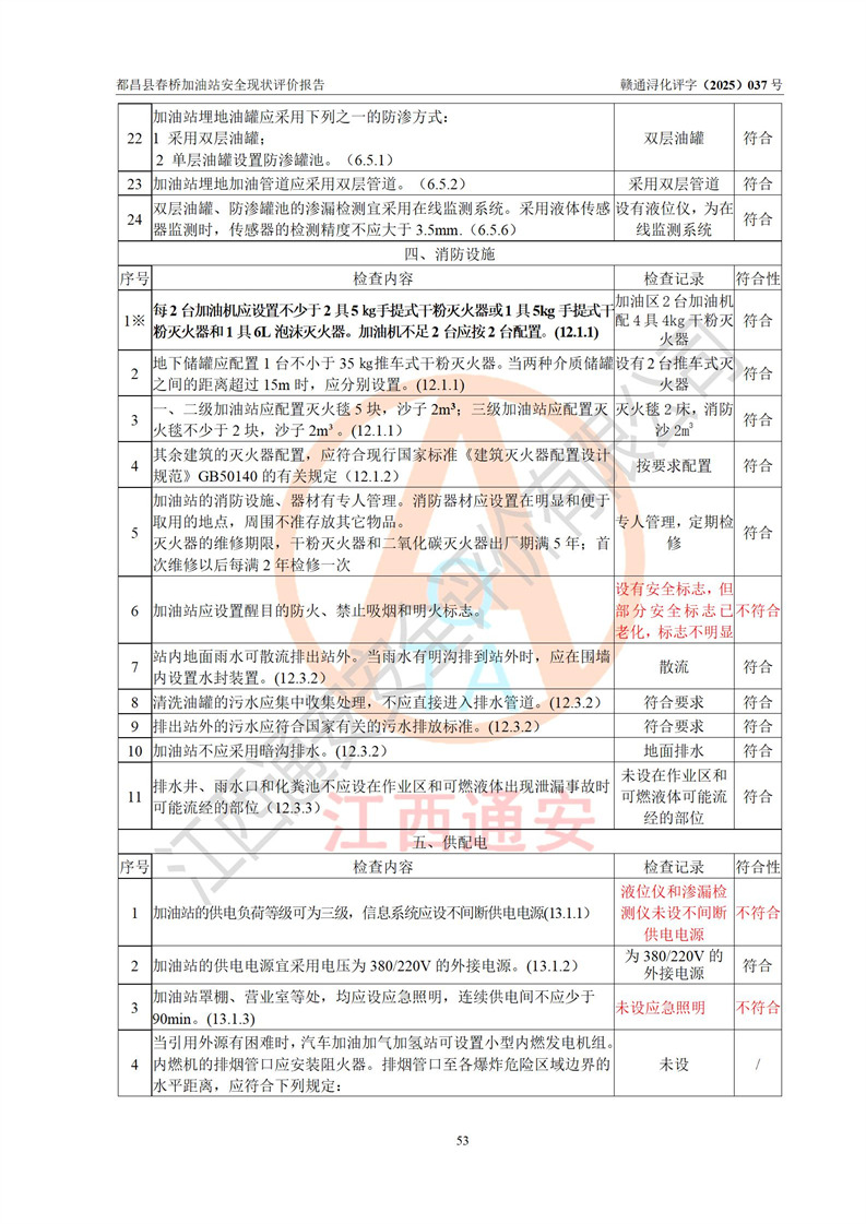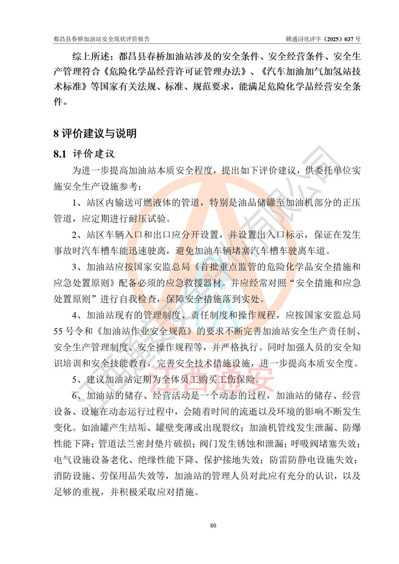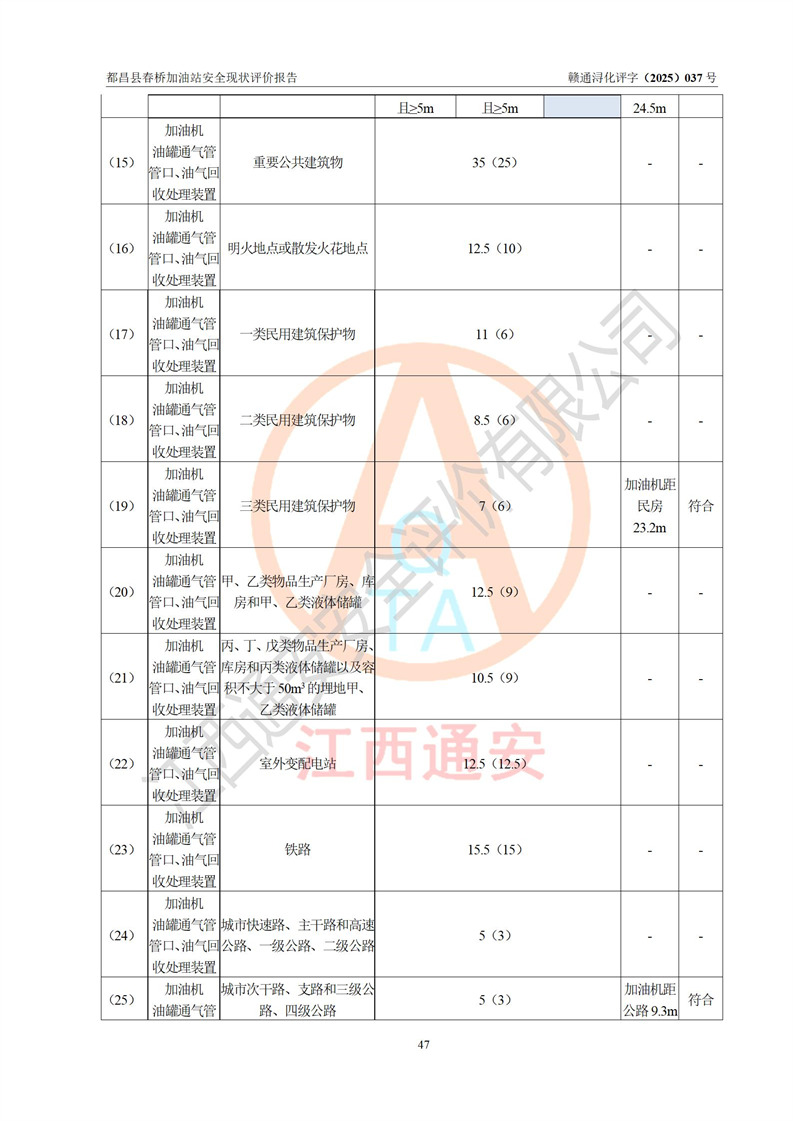 評(píng)價(jià)結(jié)論 | 都昌縣春橋加油站涉及的安全條件、安全經(jīng)營(yíng)條件、安全生產(chǎn)管理符合《危險(xiǎn)化學(xué)品經(jīng)營(yíng)許可證管理辦法》、《汽車加油加氣加氫站技術(shù)標(biāo)準(zhǔn)》等**有關(guān)法規(guī)、標(biāo)準(zhǔn)、規(guī)范要求,能滿足危險(xiǎn)化學(xué)品經(jīng)營(yíng)安全條件。 | |||