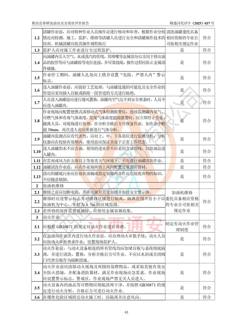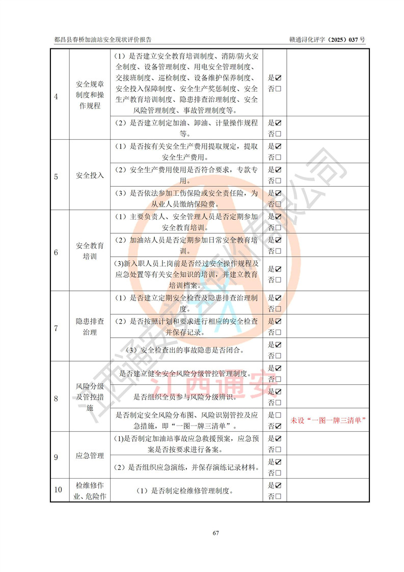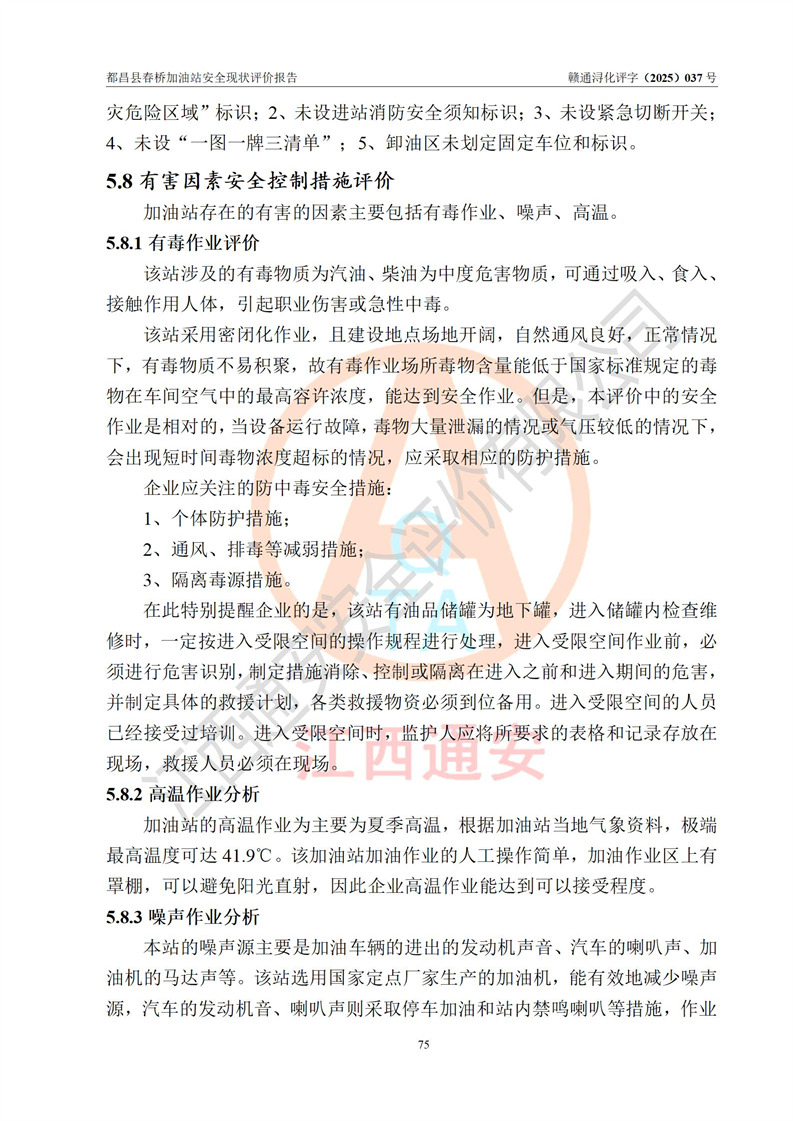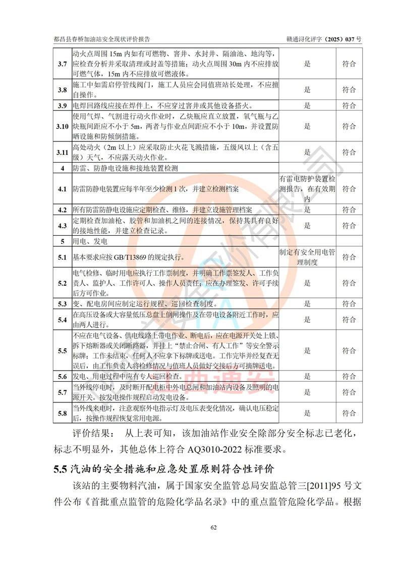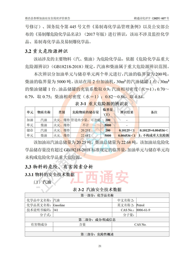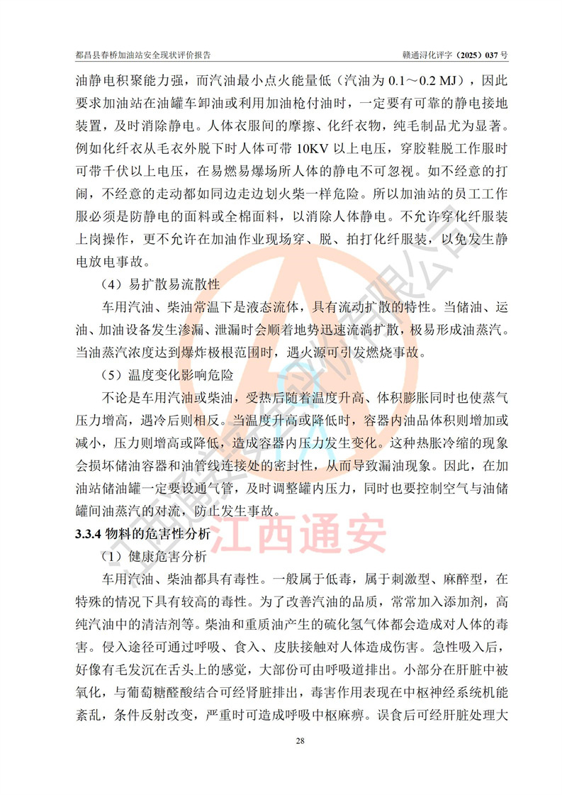 評(píng)價(jià)結(jié)論 | 都昌縣春橋加油站涉及的安全條件、安全經(jīng)營(yíng)條件、安全生產(chǎn)管理符合《危險(xiǎn)化學(xué)品經(jīng)營(yíng)許可證管理辦法》、《汽車加油加氣加氫站技術(shù)標(biāo)準(zhǔn)》等**有關(guān)法規(guī)、標(biāo)準(zhǔn)、規(guī)范要求,能滿足危險(xiǎn)化學(xué)品經(jīng)營(yíng)安全條件。 | |||