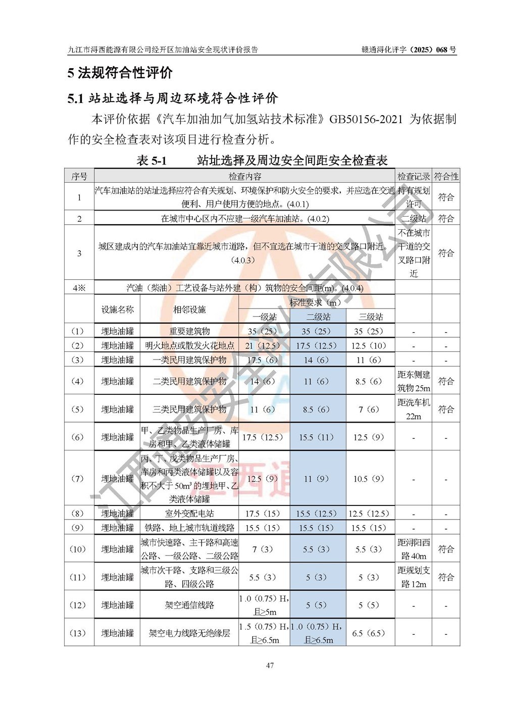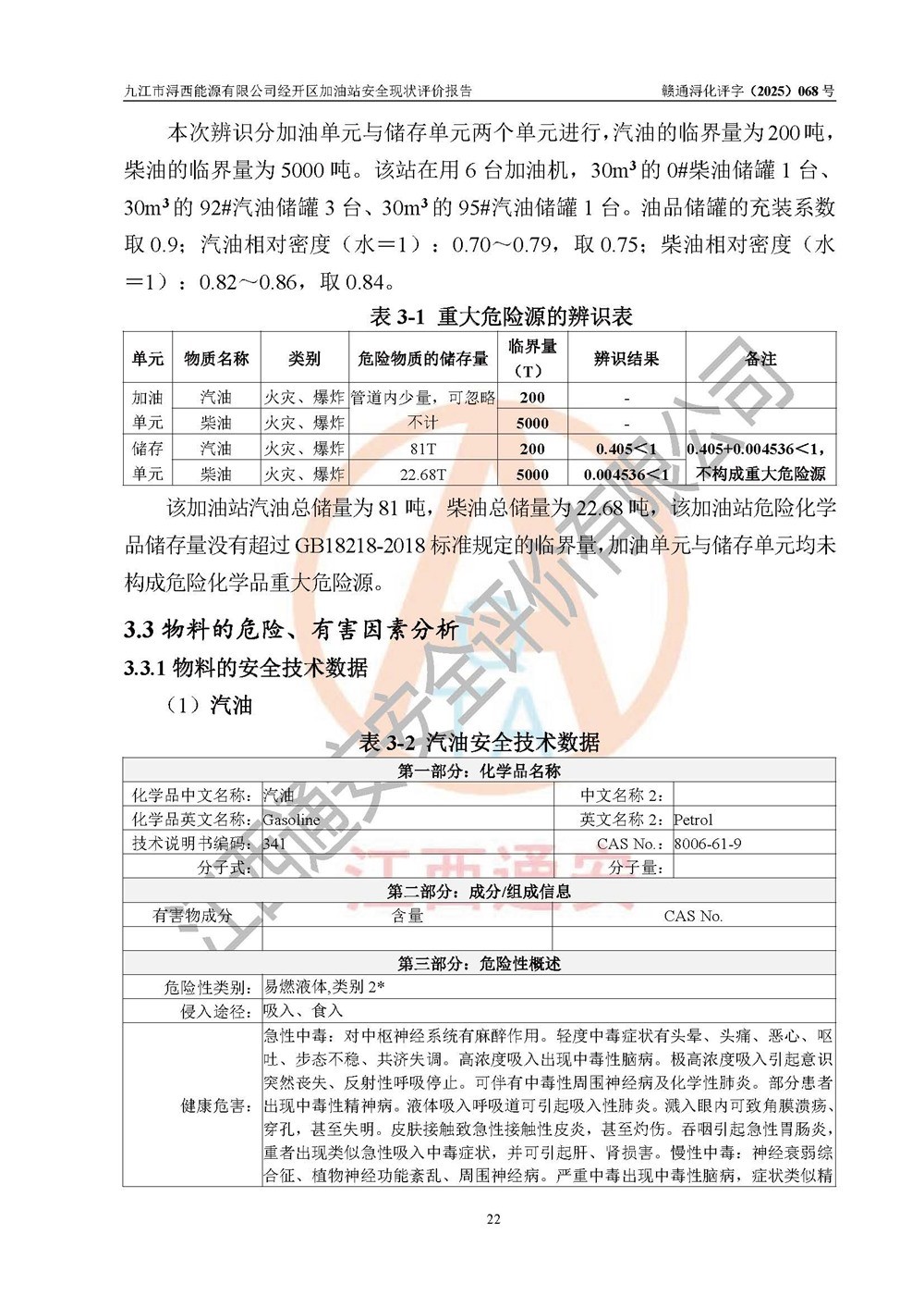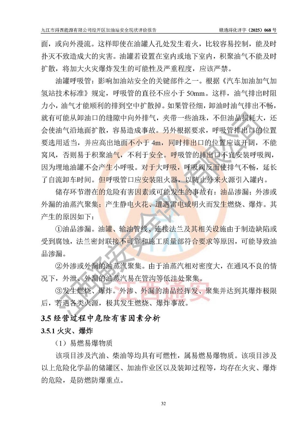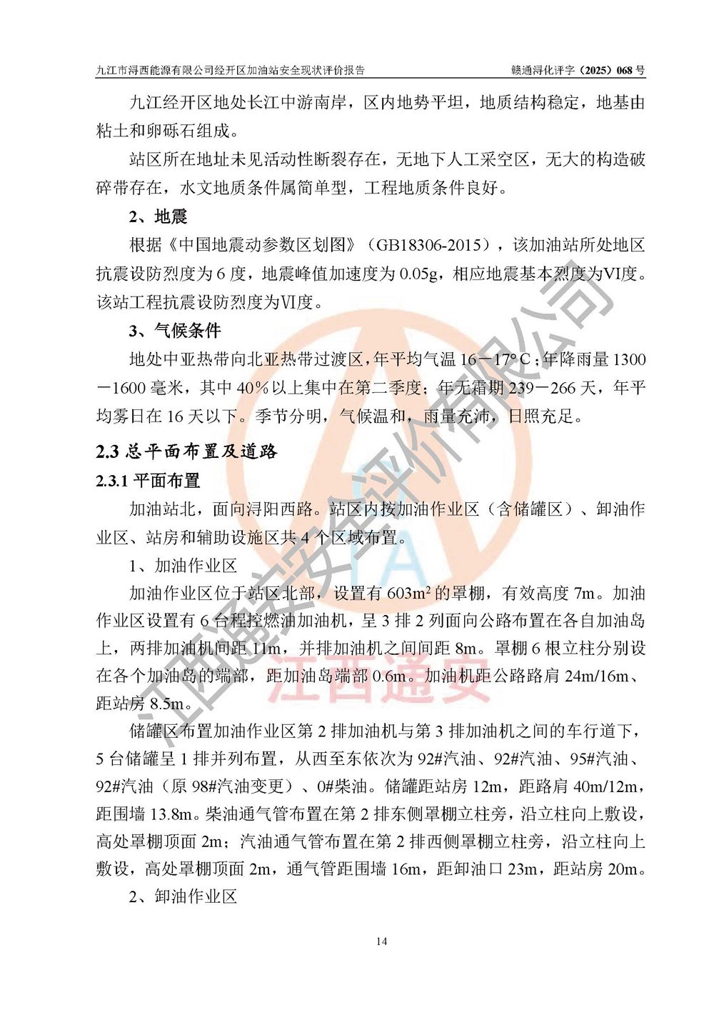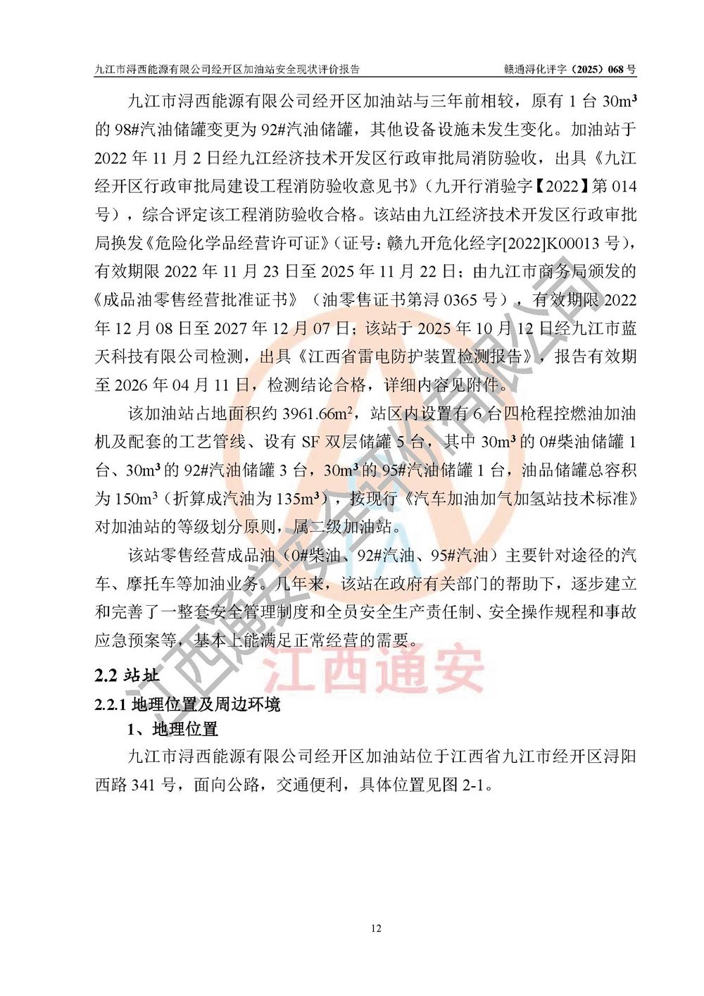 項(xiàng)目簡介 | 九江市潯西能源有限公司經(jīng)開區(qū)加油站是一家專門從事成品油零售經(jīng)營的有限責(zé)任公司分公司(自然人投資或控股),經(jīng)營場所位于江西省九江市經(jīng)開區(qū)潯陽西路341號(hào)。現(xiàn)有從業(yè)人員15名,其中安全管理人員1人,加油站負(fù)責(zé)人黎暉。 該加油站占地面積約3961.66m2,站區(qū)內(nèi)設(shè)置有6臺(tái)四槍程控燃油加油機(jī)及配套的工藝管線、設(shè)有SF雙層儲(chǔ)罐5臺(tái),其中30m3的0#柴油儲(chǔ)罐1臺(tái)、30m3的92#汽油儲(chǔ)罐3臺(tái),30m3的95#汽油儲(chǔ)罐1臺(tái),油品儲(chǔ)罐總?cè)莘e為150m3(折算成汽油為135m3),按現(xiàn)行《汽車加油加氣加氫站技術(shù)標(biāo)準(zhǔn)》對(duì)加油站的等級(jí)劃分原則,屬二級(jí)加油站。 該站由九江經(jīng)濟(jì)技術(shù)開發(fā)區(qū)行政審批局換發(fā)《危險(xiǎn)化學(xué)品經(jīng)營許可證》(證號(hào):贛九開?;?jīng)字[2022]K00013號(hào)),**期限2022年11月23日至2025年11月22日日。 | |||
