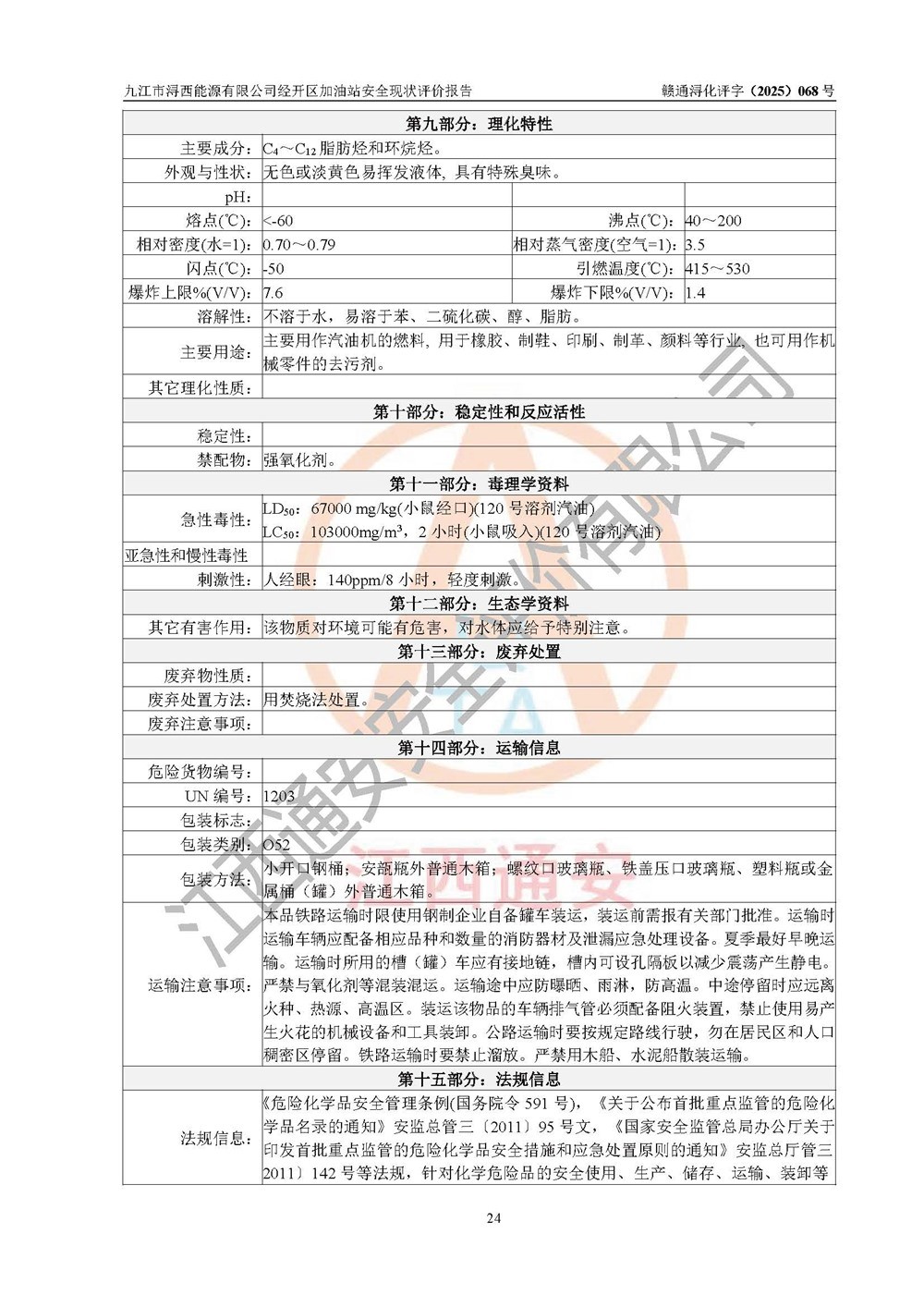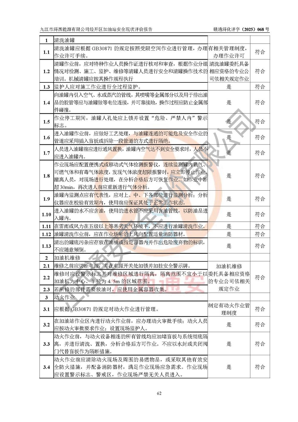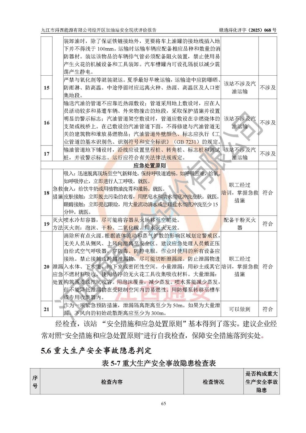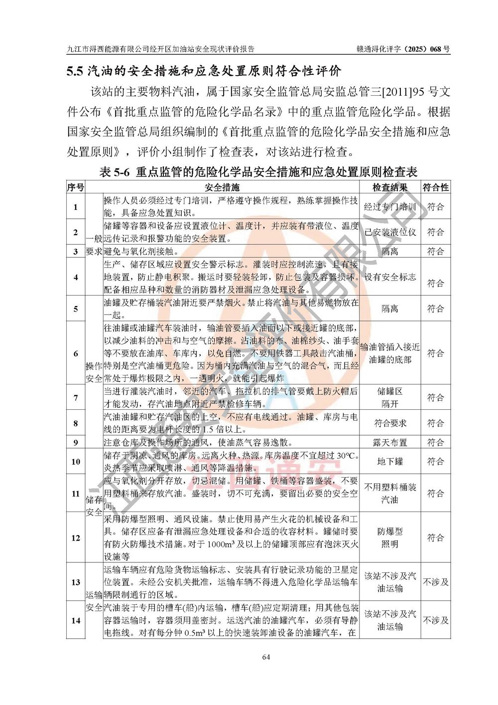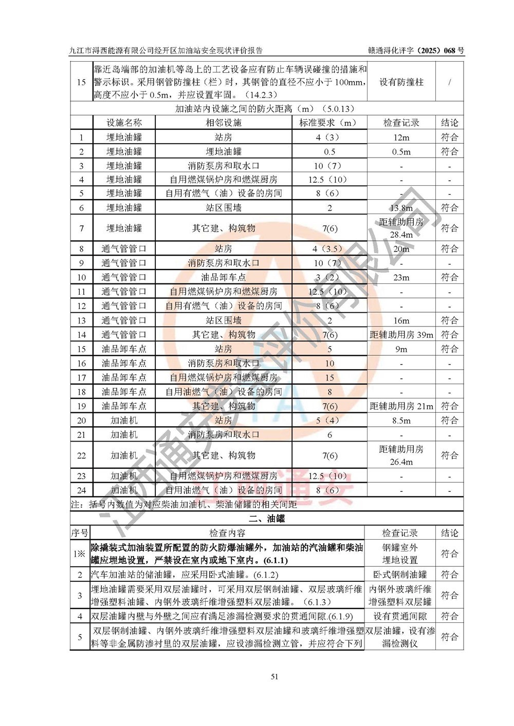 評(píng)價(jià)結(jié)論 | 九江市潯西能源有限公司經(jīng)開區(qū)加油站涉及的安全條件、安全經(jīng)營條件、安全生產(chǎn)管理符合《危險(xiǎn)化學(xué)品經(jīng)營許可證管理辦法》、《汽車加油加氣加氫站技術(shù)標(biāo)準(zhǔn)》等**有關(guān)法規(guī)、標(biāo)準(zhǔn)、規(guī)范要求,能滿足危險(xiǎn)化學(xué)品經(jīng)營安全條件。 | |||