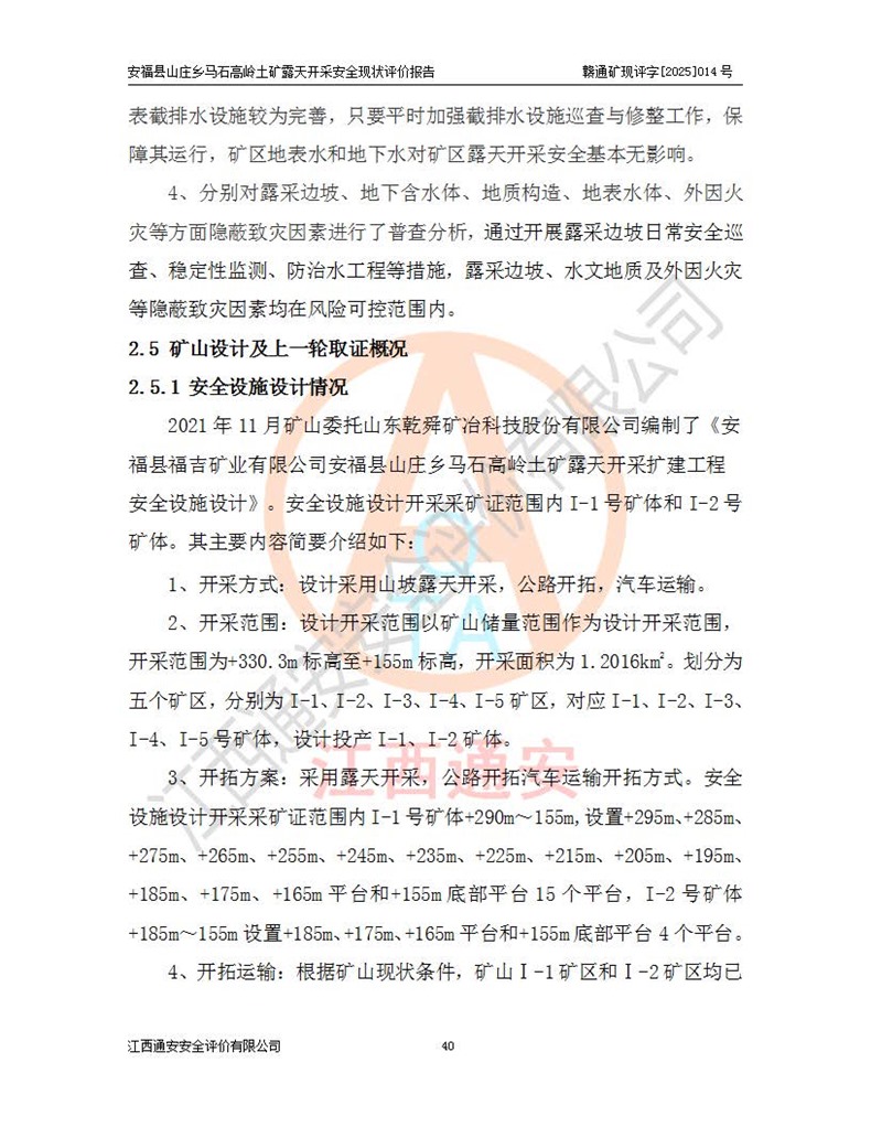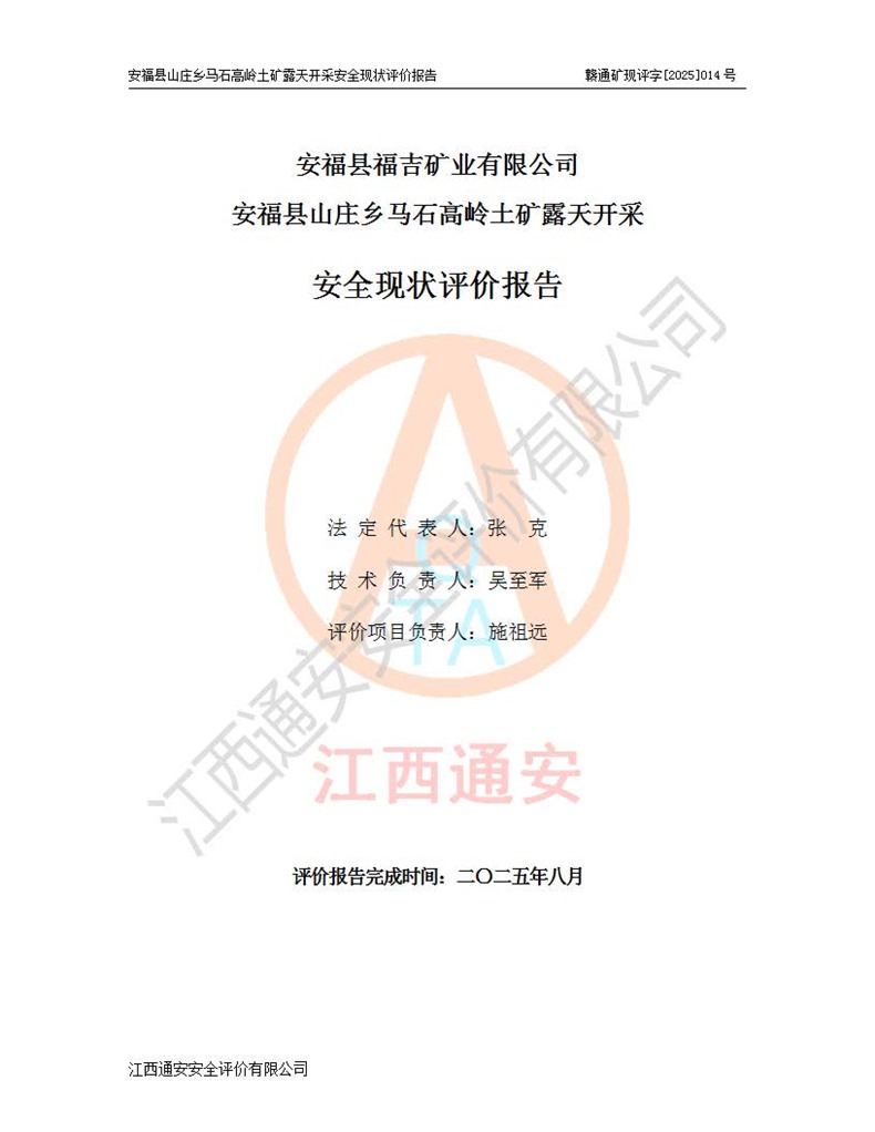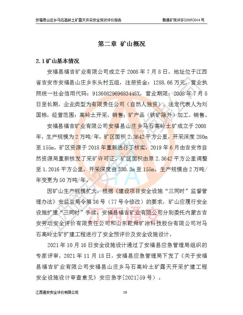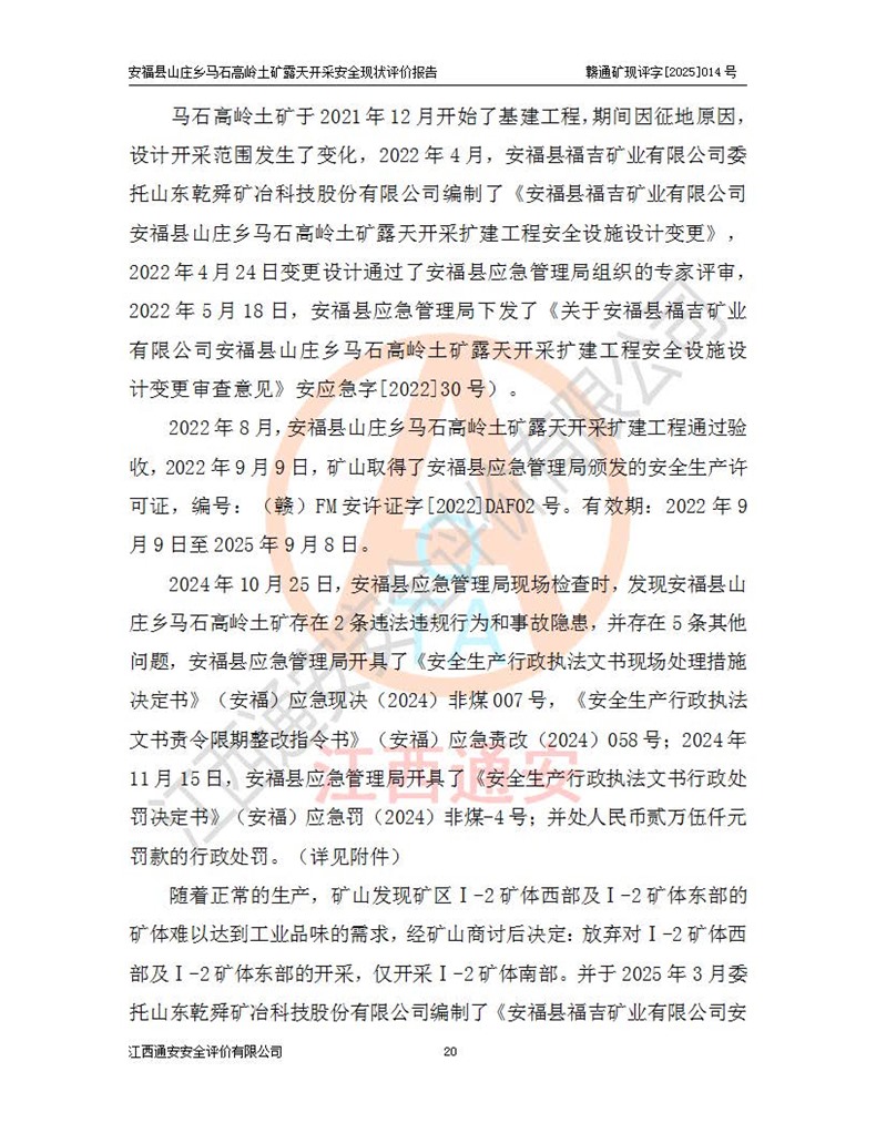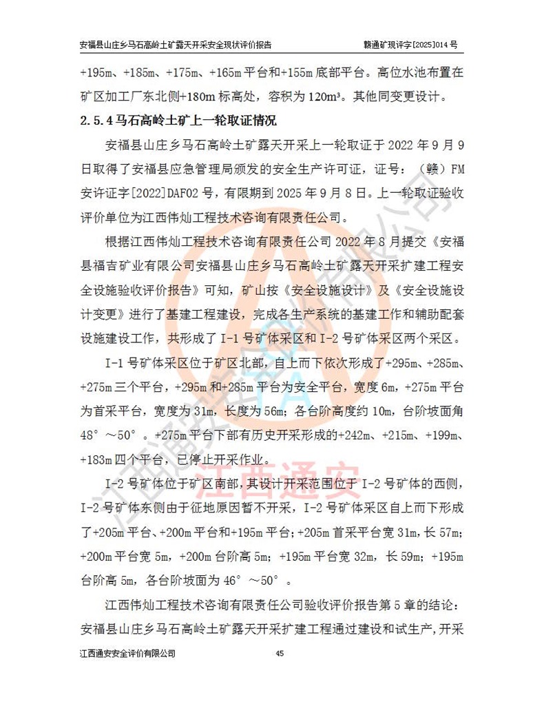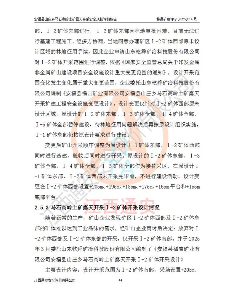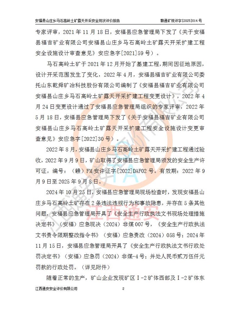 安福縣福吉礦業(yè)有限公司成立于2008年7月8日,地址位于江西省吉安市安??h山莊鄉(xiāng)東頭村五組,注冊資金:1288.66萬元,營業(yè)執(zhí)照統(tǒng)一社會(huì)信用代碼:9136082969683448X,營業(yè)期限:2008年7月8日至長期,企業(yè)類型為有限責(zé)任公司(自然人獨(dú)資),法定**人為劉國棟,經(jīng)營范圍:高嶺土開采、銷售;礦產(chǎn)品(鐵礦除外)加工、銷售。 安??h山莊鄉(xiāng)馬石高嶺土礦為安福縣福吉礦業(yè)有限公司下屬露天礦山,礦區(qū)位于安福縣城北北東,直距縣城12°方位約15km,行政區(qū)劃屬安??h山莊鄉(xiāng)管轄,礦區(qū)地理坐標(biāo)(2000坐標(biāo)系):東經(jīng)114°37′12″~114°38′32″,北緯27°30′37″~27°32′05″。礦區(qū)中心地理坐標(biāo):東經(jīng)114°37′52″,北緯 27°31′14″。礦區(qū)有3km水泥公路通往山莊鄉(xiāng),并與安福-分宜公路相連,距安福縣城18km。 馬石高嶺土礦成立于2008年,生產(chǎn)規(guī)模為2萬噸/年,礦區(qū)面積2.3642平方**,開采深度280m至155m,礦區(qū)資源于2018年重新進(jìn)行了核實(shí),2019年6月由吉安市自然資源局重新核發(fā)了采礦許可證,礦區(qū)面積由原2.3642平方**調(diào)整至1.2016平方**,開采深度由330.3m至155m,生產(chǎn)規(guī)模由2萬噸/年變更為50萬噸/年。 因礦山生產(chǎn)規(guī)模擴(kuò)大,根據(jù)《建設(shè)項(xiàng)目安全設(shè)施“三同時(shí)”監(jiān)督管理辦法》安監(jiān)總局令第36號(hào)(77號(hào)令修改)的要求,礦山應(yīng)履行安全設(shè)施擴(kuò)建“三同時(shí)”手續(xù),安??h福吉礦業(yè)有限公司分別委托內(nèi)蒙古吉安勞動(dòng)安全評(píng)價(jià)有限責(zé)任公司和山東乾舜礦冶科技股份有限公司對(duì)馬石高嶺土礦擴(kuò)建工程進(jìn)行了安全預(yù)評(píng)價(jià)及安全設(shè)施設(shè)計(jì)。 2021年10月16日安全設(shè)施設(shè)計(jì)通過了安??h應(yīng)急管理局組織的專家評(píng)審,2021年11月18日,安??h應(yīng)急管理局下發(fā)了《關(guān)于安福縣福吉礦業(yè)有限公司安??h山莊鄉(xiāng)馬石高嶺土礦露天開采擴(kuò)建工程安全設(shè)施設(shè)計(jì)審查意見》安應(yīng)急字[2021]59號(hào))。 馬石高嶺土礦于2021年12月開始了基建工程,期間因征地原因,設(shè)計(jì)開采范圍發(fā)生了變化,2022年4月,安福縣福吉礦業(yè)有限公司委托山東乾舜礦冶科技股份有限公司編制了《安??h福吉礦業(yè)有限公司安福縣山莊鄉(xiāng)馬石高嶺土礦露天開采擴(kuò)建工程變更設(shè)計(jì)》,2022年4月24日變更設(shè)計(jì)通過了安??h應(yīng)急管理局組織的專家評(píng)審,2022年5月18日,安??h應(yīng)急管理局下發(fā)了《關(guān)于安福縣福吉礦業(yè)有限公司安??h山莊鄉(xiāng)馬石高嶺土礦露天開采擴(kuò)建工程安全設(shè)施設(shè)計(jì)變更審查意見》安應(yīng)急字[2022]30號(hào))。 2022年8月,安福縣山莊鄉(xiāng)馬石高嶺土礦露天開采擴(kuò)建工程通過驗(yàn)收,2022年9月9日,礦山取得了安??h應(yīng)急管理局頒發(fā)的安全生產(chǎn)許可證,編號(hào):(贛)FM安許證字[2022]DAF02號(hào)。**期:2022年9月9日至2025年9月8日。 2024年10月25日,安福縣應(yīng)急管理局現(xiàn)場檢查時(shí),發(fā)現(xiàn)安福縣山莊鄉(xiāng)馬石高嶺土礦存在2條違法違規(guī)行為和事故隱患,并存在5條其他問題,安??h應(yīng)急管理局開具了《安全生產(chǎn)行政執(zhí)法文書現(xiàn)場處理措施決定書》(安福)應(yīng)急現(xiàn)決(2024)非煤007號(hào),《安全生產(chǎn)行政執(zhí)法文書責(zé)令限期整改指令書》(安福)應(yīng)急責(zé)改(2024)058號(hào);2024年11月15日,安??h應(yīng)急管理局開具了《安全生產(chǎn)行政執(zhí)法文書行政處罰決定書》(安福)應(yīng)急罰(2024)非煤-4號(hào);并處人民幣貳萬伍仟元罰款的行政處罰。 隨著正常的生產(chǎn),礦山企業(yè)發(fā)現(xiàn)礦區(qū)Ⅰ-2礦體西部及Ⅰ-2礦體東部的礦體難以達(dá)到工業(yè)品味的需求,經(jīng)礦山企業(yè)商討后決定:放棄對(duì)Ⅰ-2礦體西部及Ⅰ-2礦體東部的開采,僅開采Ⅰ-2礦體南部,并于2025年3月委托山東乾舜礦冶科技股份有限公司編制了《安??h福吉礦業(yè)有限公司安??h山莊鄉(xiāng)馬石高嶺土礦露天開采Ⅰ-2礦體開采設(shè)計(jì)》。 依照《非煤礦礦山企業(yè)安全生產(chǎn)許可證延期換證工作》的通知,根據(jù)***《安全生產(chǎn)許可證條例》、《江西省安全生產(chǎn)條例》、《非煤礦山安全生產(chǎn)許可證實(shí)施辦法》、《江西省非煤礦礦山企業(yè)安全生產(chǎn)許可證辦法》規(guī)定及非煤礦山安全評(píng)價(jià)導(dǎo)則的要求,受安??h福吉礦業(yè)有限公司的委托,我公司承擔(dān)安福縣山莊鄉(xiāng)馬石高嶺土礦露天開采延期換證的安全現(xiàn)狀評(píng)價(jià)工作。 |