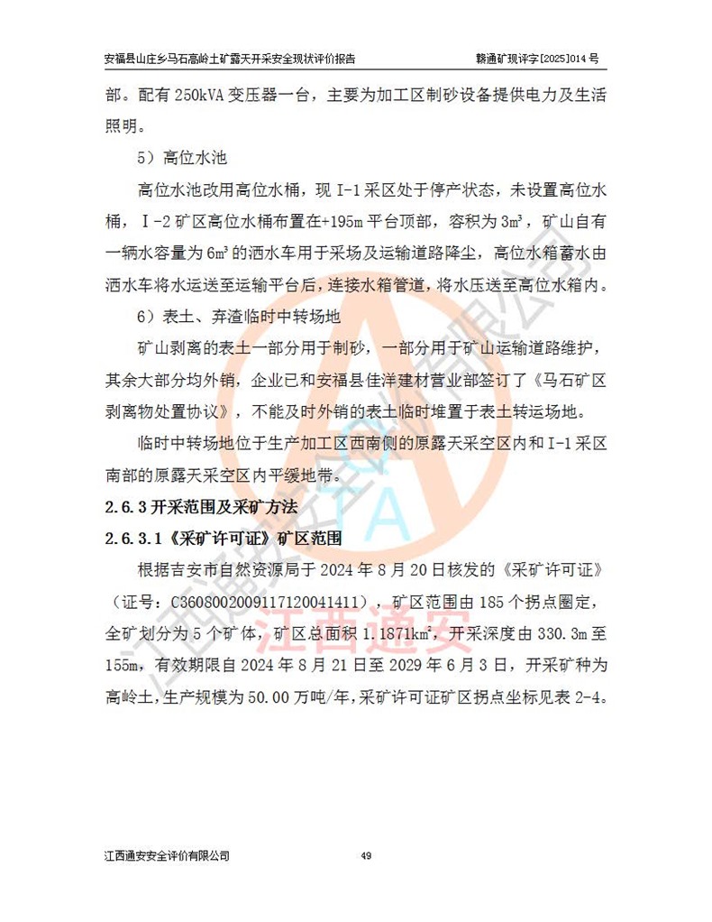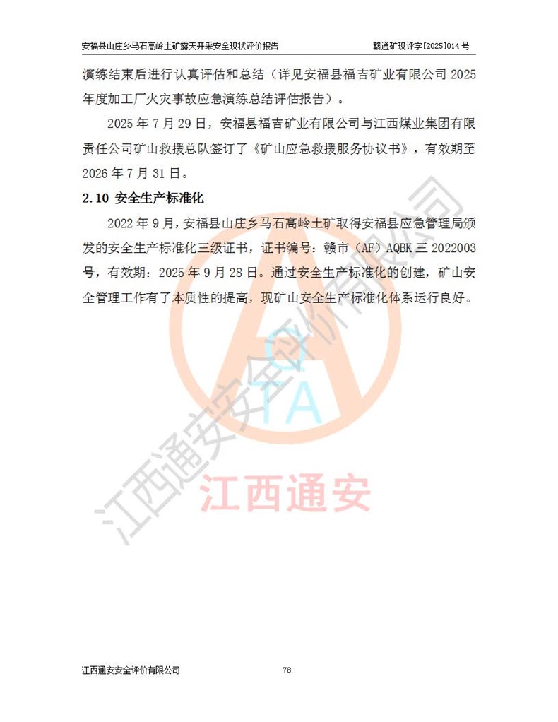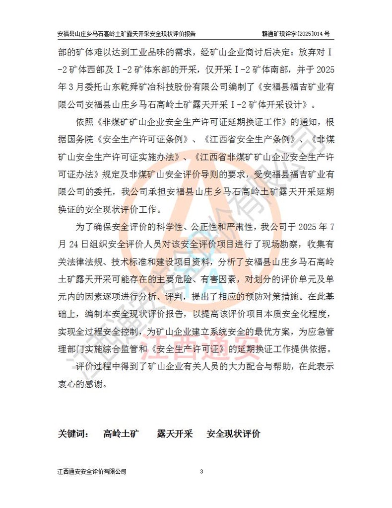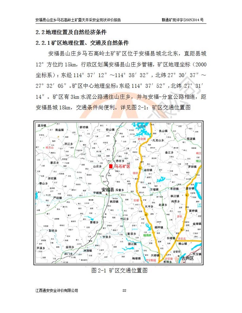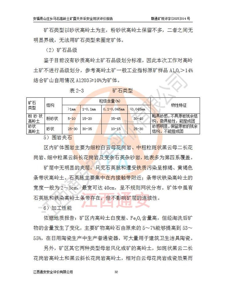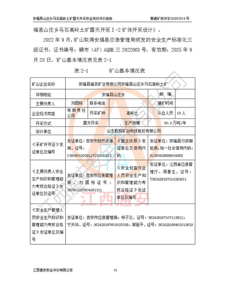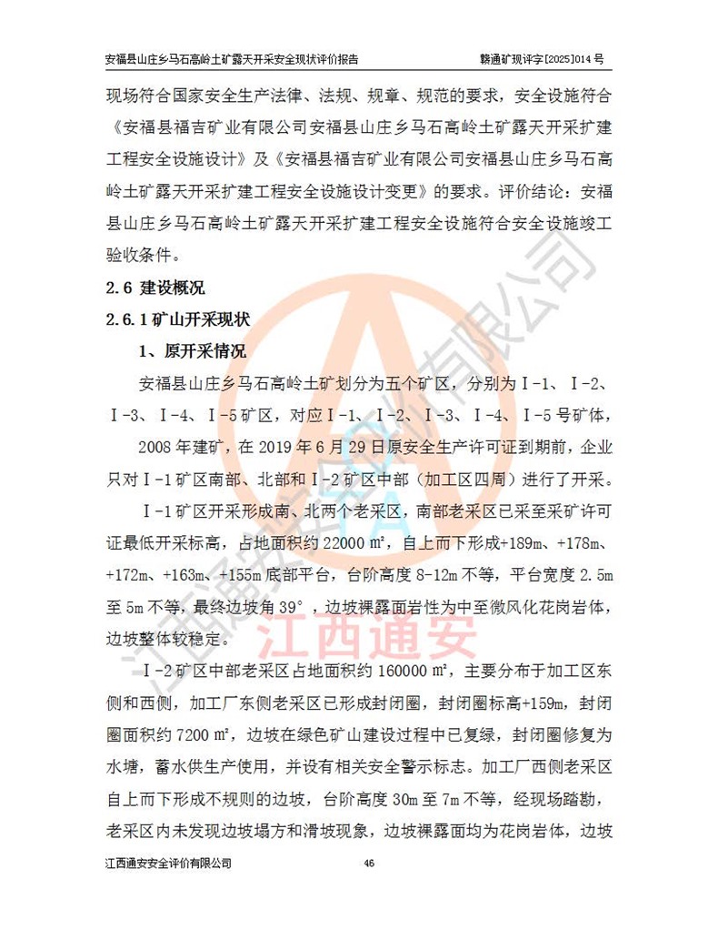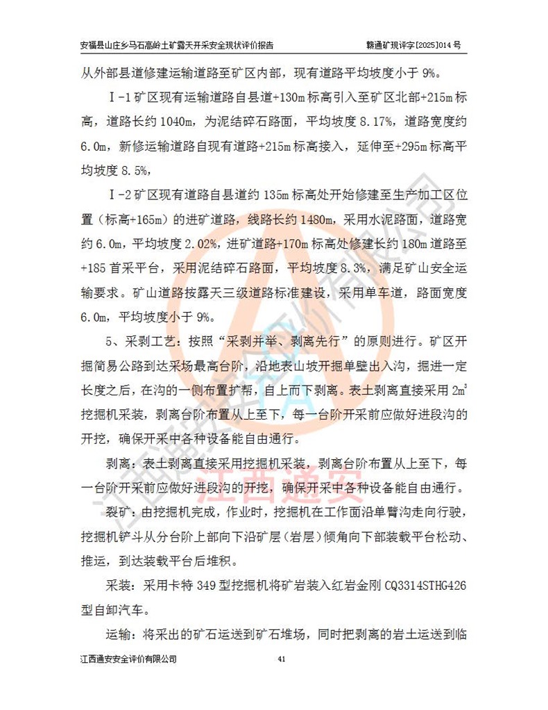 安福縣福吉礦業(yè)有限公司成立于2008年7月8日,地址位于江西省吉安市安??h山莊鄉(xiāng)東頭村五組,注冊資金:1288.66萬元,營業(yè)執(zhí)照統(tǒng)一社會(huì)信用代碼:9136082969683448X,營業(yè)期限:2008年7月8日至長期,企業(yè)類型為有限責(zé)任公司(自然人獨(dú)資),法定**人為劉國棟,經(jīng)營范圍:高嶺土開采、銷售;礦產(chǎn)品(鐵礦除外)加工、銷售。 安??h山莊鄉(xiāng)馬石高嶺土礦為安福縣福吉礦業(yè)有限公司下屬露天礦山,礦區(qū)位于安福縣城北北東,直距縣城12°方位約15km,行政區(qū)劃屬安??h山莊鄉(xiāng)管轄,礦區(qū)地理坐標(biāo)(2000坐標(biāo)系):東經(jīng)114°37′12″~114°38′32″,北緯27°30′37″~27°32′05″。礦區(qū)中心地理坐標(biāo):東經(jīng)114°37′52″,北緯 27°31′14″。礦區(qū)有3km水泥公路通往山莊鄉(xiāng),并與安福-分宜公路相連,距安福縣城18km。 馬石高嶺土礦成立于2008年,生產(chǎn)規(guī)模為2萬噸/年,礦區(qū)面積2.3642平方**,開采深度280m至155m,礦區(qū)資源于2018年重新進(jìn)行了核實(shí),2019年6月由吉安市自然資源局重新核發(fā)了采礦許可證,礦區(qū)面積由原2.3642平方**調(diào)整至1.2016平方**,開采深度由330.3m至155m,生產(chǎn)規(guī)模由2萬噸/年變更為50萬噸/年。 因礦山生產(chǎn)規(guī)模擴(kuò)大,根據(jù)《建設(shè)項(xiàng)目安全設(shè)施“三同時(shí)”監(jiān)督管理辦法》安監(jiān)總局令第36號(hào)(77號(hào)令修改)的要求,礦山應(yīng)履行安全設(shè)施擴(kuò)建“三同時(shí)”手續(xù),安??h福吉礦業(yè)有限公司分別委托內(nèi)蒙古吉安勞動(dòng)安全評(píng)價(jià)有限責(zé)任公司和山東乾舜礦冶科技股份有限公司對(duì)馬石高嶺土礦擴(kuò)建工程進(jìn)行了安全預(yù)評(píng)價(jià)及安全設(shè)施設(shè)計(jì)。 2021年10月16日安全設(shè)施設(shè)計(jì)通過了安??h應(yīng)急管理局組織的專家評(píng)審,2021年11月18日,安??h應(yīng)急管理局下發(fā)了《關(guān)于安福縣福吉礦業(yè)有限公司安??h山莊鄉(xiāng)馬石高嶺土礦露天開采擴(kuò)建工程安全設(shè)施設(shè)計(jì)審查意見》安應(yīng)急字[2021]59號(hào))。 馬石高嶺土礦于2021年12月開始了基建工程,期間因征地原因,設(shè)計(jì)開采范圍發(fā)生了變化,2022年4月,安福縣福吉礦業(yè)有限公司委托山東乾舜礦冶科技股份有限公司編制了《安??h福吉礦業(yè)有限公司安福縣山莊鄉(xiāng)馬石高嶺土礦露天開采擴(kuò)建工程變更設(shè)計(jì)》,2022年4月24日變更設(shè)計(jì)通過了安??h應(yīng)急管理局組織的專家評(píng)審,2022年5月18日,安??h應(yīng)急管理局下發(fā)了《關(guān)于安福縣福吉礦業(yè)有限公司安??h山莊鄉(xiāng)馬石高嶺土礦露天開采擴(kuò)建工程安全設(shè)施設(shè)計(jì)變更審查意見》安應(yīng)急字[2022]30號(hào))。 2022年8月,安福縣山莊鄉(xiāng)馬石高嶺土礦露天開采擴(kuò)建工程通過驗(yàn)收,2022年9月9日,礦山取得了安??h應(yīng)急管理局頒發(fā)的安全生產(chǎn)許可證,編號(hào):(贛)FM安許證字[2022]DAF02號(hào)。**期:2022年9月9日至2025年9月8日。 2024年10月25日,安福縣應(yīng)急管理局現(xiàn)場檢查時(shí),發(fā)現(xiàn)安福縣山莊鄉(xiāng)馬石高嶺土礦存在2條違法違規(guī)行為和事故隱患,并存在5條其他問題,安??h應(yīng)急管理局開具了《安全生產(chǎn)行政執(zhí)法文書現(xiàn)場處理措施決定書》(安福)應(yīng)急現(xiàn)決(2024)非煤007號(hào),《安全生產(chǎn)行政執(zhí)法文書責(zé)令限期整改指令書》(安福)應(yīng)急責(zé)改(2024)058號(hào);2024年11月15日,安??h應(yīng)急管理局開具了《安全生產(chǎn)行政執(zhí)法文書行政處罰決定書》(安福)應(yīng)急罰(2024)非煤-4號(hào);并處人民幣貳萬伍仟元罰款的行政處罰。 隨著正常的生產(chǎn),礦山企業(yè)發(fā)現(xiàn)礦區(qū)Ⅰ-2礦體西部及Ⅰ-2礦體東部的礦體難以達(dá)到工業(yè)品味的需求,經(jīng)礦山企業(yè)商討后決定:放棄對(duì)Ⅰ-2礦體西部及Ⅰ-2礦體東部的開采,僅開采Ⅰ-2礦體南部,并于2025年3月委托山東乾舜礦冶科技股份有限公司編制了《安??h福吉礦業(yè)有限公司安??h山莊鄉(xiāng)馬石高嶺土礦露天開采Ⅰ-2礦體開采設(shè)計(jì)》。 依照《非煤礦礦山企業(yè)安全生產(chǎn)許可證延期換證工作》的通知,根據(jù)***《安全生產(chǎn)許可證條例》、《江西省安全生產(chǎn)條例》、《非煤礦山安全生產(chǎn)許可證實(shí)施辦法》、《江西省非煤礦礦山企業(yè)安全生產(chǎn)許可證辦法》規(guī)定及非煤礦山安全評(píng)價(jià)導(dǎo)則的要求,受安??h福吉礦業(yè)有限公司的委托,我公司承擔(dān)安福縣山莊鄉(xiāng)馬石高嶺土礦露天開采延期換證的安全現(xiàn)狀評(píng)價(jià)工作。 |