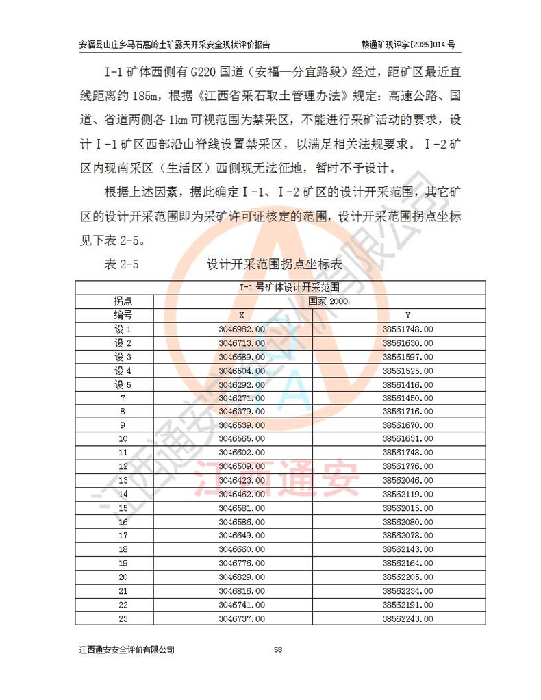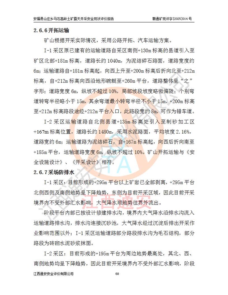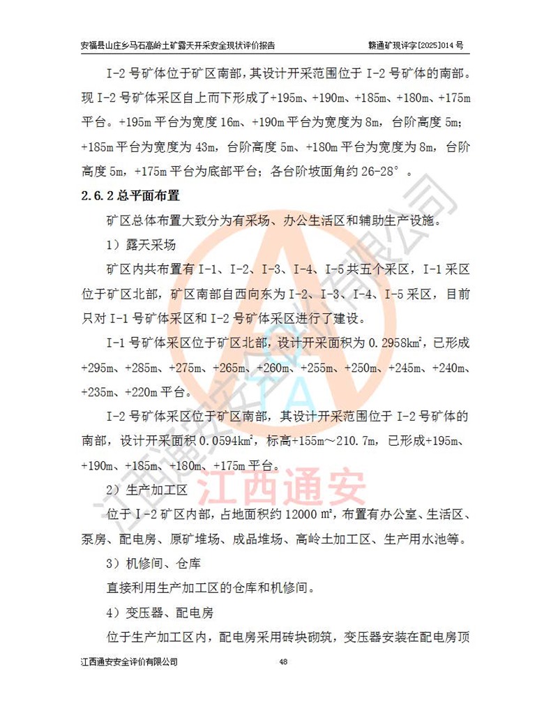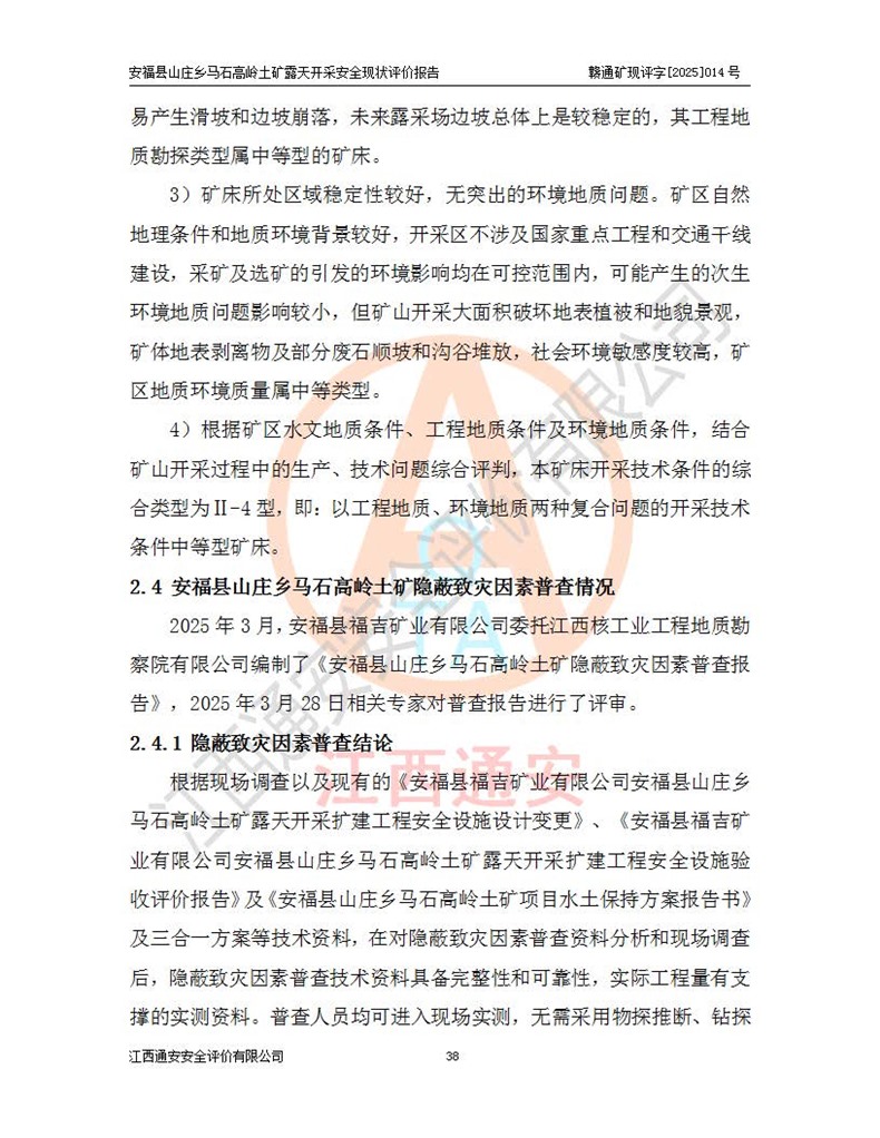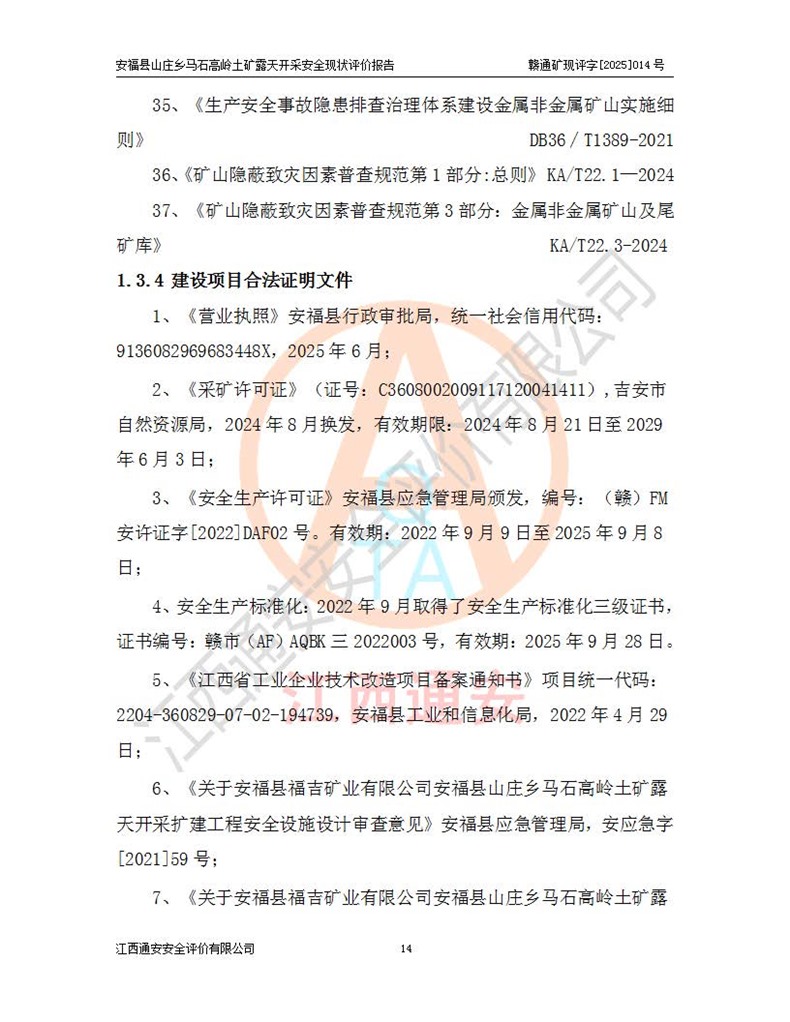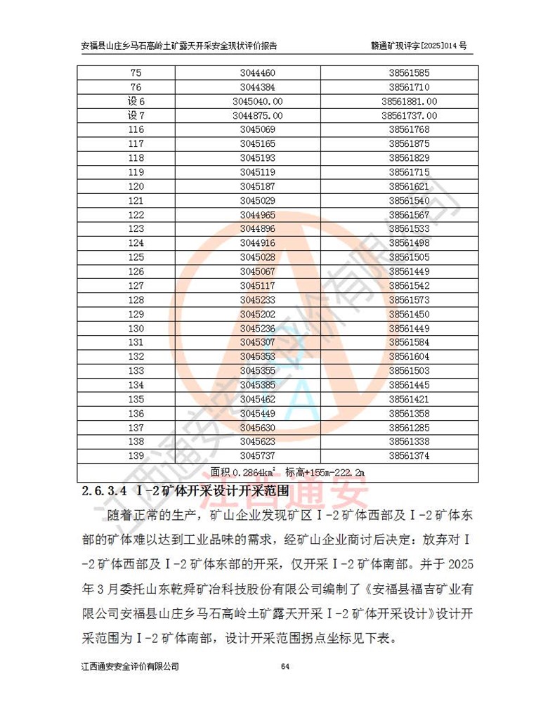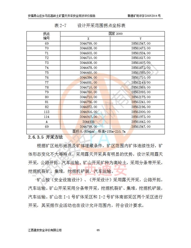 安福縣福吉礦業(yè)有限公司成立于2008年7月8日,地址位于江西省吉安市安??h山莊鄉(xiāng)東頭村五組,注冊資金:1288.66萬元,營業(yè)執(zhí)照統(tǒng)一社會(huì)信用代碼:9136082969683448X,營業(yè)期限:2008年7月8日至長期,企業(yè)類型為有限責(zé)任公司(自然人獨(dú)資),法定**人為劉國棟,經(jīng)營范圍:高嶺土開采、銷售;礦產(chǎn)品(鐵礦除外)加工、銷售。 安??h山莊鄉(xiāng)馬石高嶺土礦為安福縣福吉礦業(yè)有限公司下屬露天礦山,礦區(qū)位于安福縣城北北東,直距縣城12°方位約15km,行政區(qū)劃屬安??h山莊鄉(xiāng)管轄,礦區(qū)地理坐標(biāo)(2000坐標(biāo)系):東經(jīng)114°37′12″~114°38′32″,北緯27°30′37″~27°32′05″。礦區(qū)中心地理坐標(biāo):東經(jīng)114°37′52″,北緯 27°31′14″。礦區(qū)有3km水泥公路通往山莊鄉(xiāng),并與安福-分宜公路相連,距安福縣城18km。 馬石高嶺土礦成立于2008年,生產(chǎn)規(guī)模為2萬噸/年,礦區(qū)面積2.3642平方**,開采深度280m至155m,礦區(qū)資源于2018年重新進(jìn)行了核實(shí),2019年6月由吉安市自然資源局重新核發(fā)了采礦許可證,礦區(qū)面積由原2.3642平方**調(diào)整至1.2016平方**,開采深度由330.3m至155m,生產(chǎn)規(guī)模由2萬噸/年變更為50萬噸/年。 因礦山生產(chǎn)規(guī)模擴(kuò)大,根據(jù)《建設(shè)項(xiàng)目安全設(shè)施“三同時(shí)”監(jiān)督管理辦法》安監(jiān)總局令第36號(hào)(77號(hào)令修改)的要求,礦山應(yīng)履行安全設(shè)施擴(kuò)建“三同時(shí)”手續(xù),安??h福吉礦業(yè)有限公司分別委托內(nèi)蒙古吉安勞動(dòng)安全評(píng)價(jià)有限責(zé)任公司和山東乾舜礦冶科技股份有限公司對(duì)馬石高嶺土礦擴(kuò)建工程進(jìn)行了安全預(yù)評(píng)價(jià)及安全設(shè)施設(shè)計(jì)。 2021年10月16日安全設(shè)施設(shè)計(jì)通過了安??h應(yīng)急管理局組織的專家評(píng)審,2021年11月18日,安??h應(yīng)急管理局下發(fā)了《關(guān)于安福縣福吉礦業(yè)有限公司安??h山莊鄉(xiāng)馬石高嶺土礦露天開采擴(kuò)建工程安全設(shè)施設(shè)計(jì)審查意見》安應(yīng)急字[2021]59號(hào))。 馬石高嶺土礦于2021年12月開始了基建工程,期間因征地原因,設(shè)計(jì)開采范圍發(fā)生了變化,2022年4月,安福縣福吉礦業(yè)有限公司委托山東乾舜礦冶科技股份有限公司編制了《安??h福吉礦業(yè)有限公司安福縣山莊鄉(xiāng)馬石高嶺土礦露天開采擴(kuò)建工程變更設(shè)計(jì)》,2022年4月24日變更設(shè)計(jì)通過了安??h應(yīng)急管理局組織的專家評(píng)審,2022年5月18日,安??h應(yīng)急管理局下發(fā)了《關(guān)于安福縣福吉礦業(yè)有限公司安??h山莊鄉(xiāng)馬石高嶺土礦露天開采擴(kuò)建工程安全設(shè)施設(shè)計(jì)變更審查意見》安應(yīng)急字[2022]30號(hào))。 2022年8月,安福縣山莊鄉(xiāng)馬石高嶺土礦露天開采擴(kuò)建工程通過驗(yàn)收,2022年9月9日,礦山取得了安??h應(yīng)急管理局頒發(fā)的安全生產(chǎn)許可證,編號(hào):(贛)FM安許證字[2022]DAF02號(hào)。**期:2022年9月9日至2025年9月8日。 2024年10月25日,安福縣應(yīng)急管理局現(xiàn)場檢查時(shí),發(fā)現(xiàn)安福縣山莊鄉(xiāng)馬石高嶺土礦存在2條違法違規(guī)行為和事故隱患,并存在5條其他問題,安??h應(yīng)急管理局開具了《安全生產(chǎn)行政執(zhí)法文書現(xiàn)場處理措施決定書》(安福)應(yīng)急現(xiàn)決(2024)非煤007號(hào),《安全生產(chǎn)行政執(zhí)法文書責(zé)令限期整改指令書》(安福)應(yīng)急責(zé)改(2024)058號(hào);2024年11月15日,安??h應(yīng)急管理局開具了《安全生產(chǎn)行政執(zhí)法文書行政處罰決定書》(安福)應(yīng)急罰(2024)非煤-4號(hào);并處人民幣貳萬伍仟元罰款的行政處罰。 隨著正常的生產(chǎn),礦山企業(yè)發(fā)現(xiàn)礦區(qū)Ⅰ-2礦體西部及Ⅰ-2礦體東部的礦體難以達(dá)到工業(yè)品味的需求,經(jīng)礦山企業(yè)商討后決定:放棄對(duì)Ⅰ-2礦體西部及Ⅰ-2礦體東部的開采,僅開采Ⅰ-2礦體南部,并于2025年3月委托山東乾舜礦冶科技股份有限公司編制了《安??h福吉礦業(yè)有限公司安??h山莊鄉(xiāng)馬石高嶺土礦露天開采Ⅰ-2礦體開采設(shè)計(jì)》。 依照《非煤礦礦山企業(yè)安全生產(chǎn)許可證延期換證工作》的通知,根據(jù)***《安全生產(chǎn)許可證條例》、《江西省安全生產(chǎn)條例》、《非煤礦山安全生產(chǎn)許可證實(shí)施辦法》、《江西省非煤礦礦山企業(yè)安全生產(chǎn)許可證辦法》規(guī)定及非煤礦山安全評(píng)價(jià)導(dǎo)則的要求,受安??h福吉礦業(yè)有限公司的委托,我公司承擔(dān)安福縣山莊鄉(xiāng)馬石高嶺土礦露天開采延期換證的安全現(xiàn)狀評(píng)價(jià)工作。 |